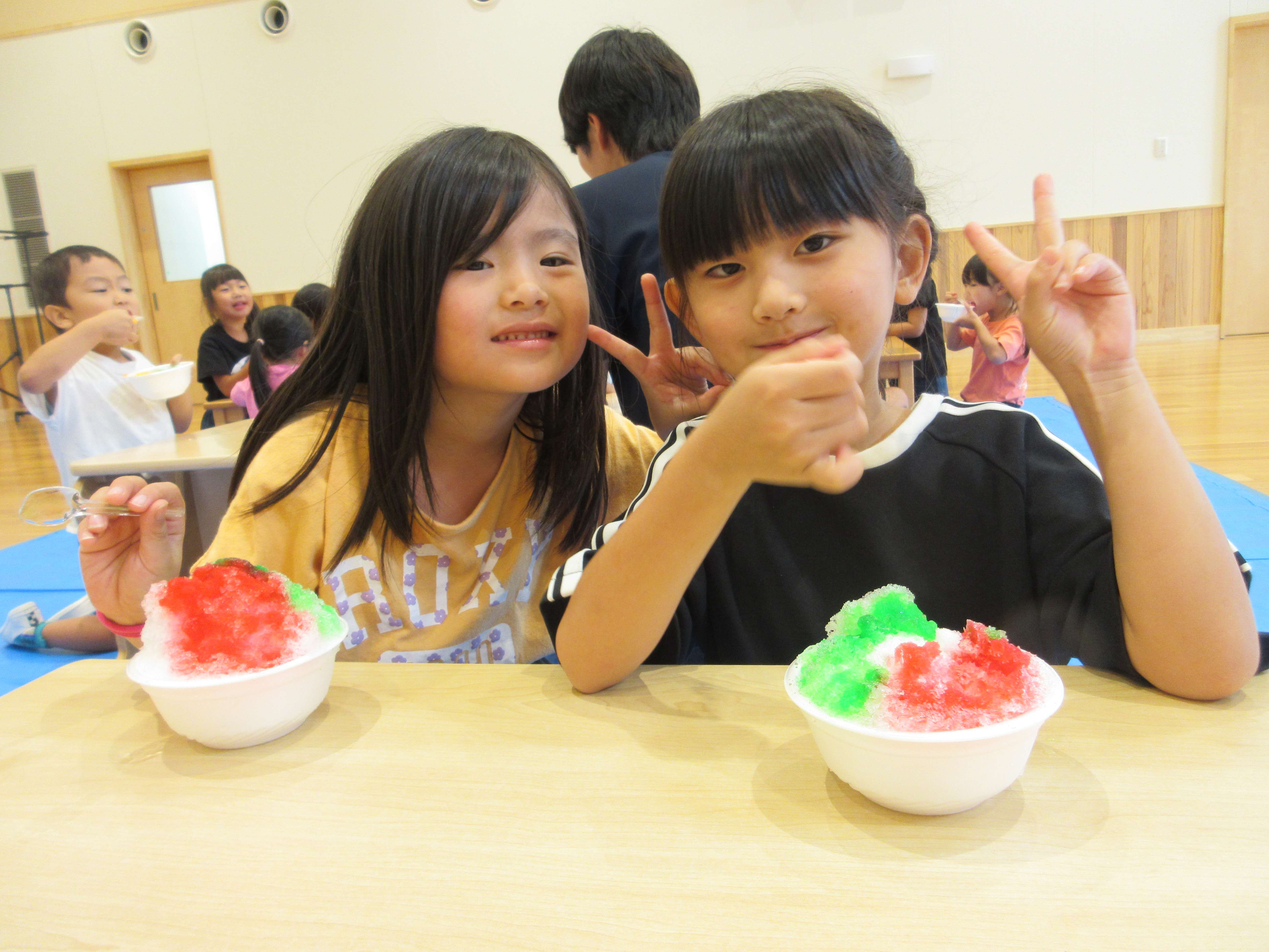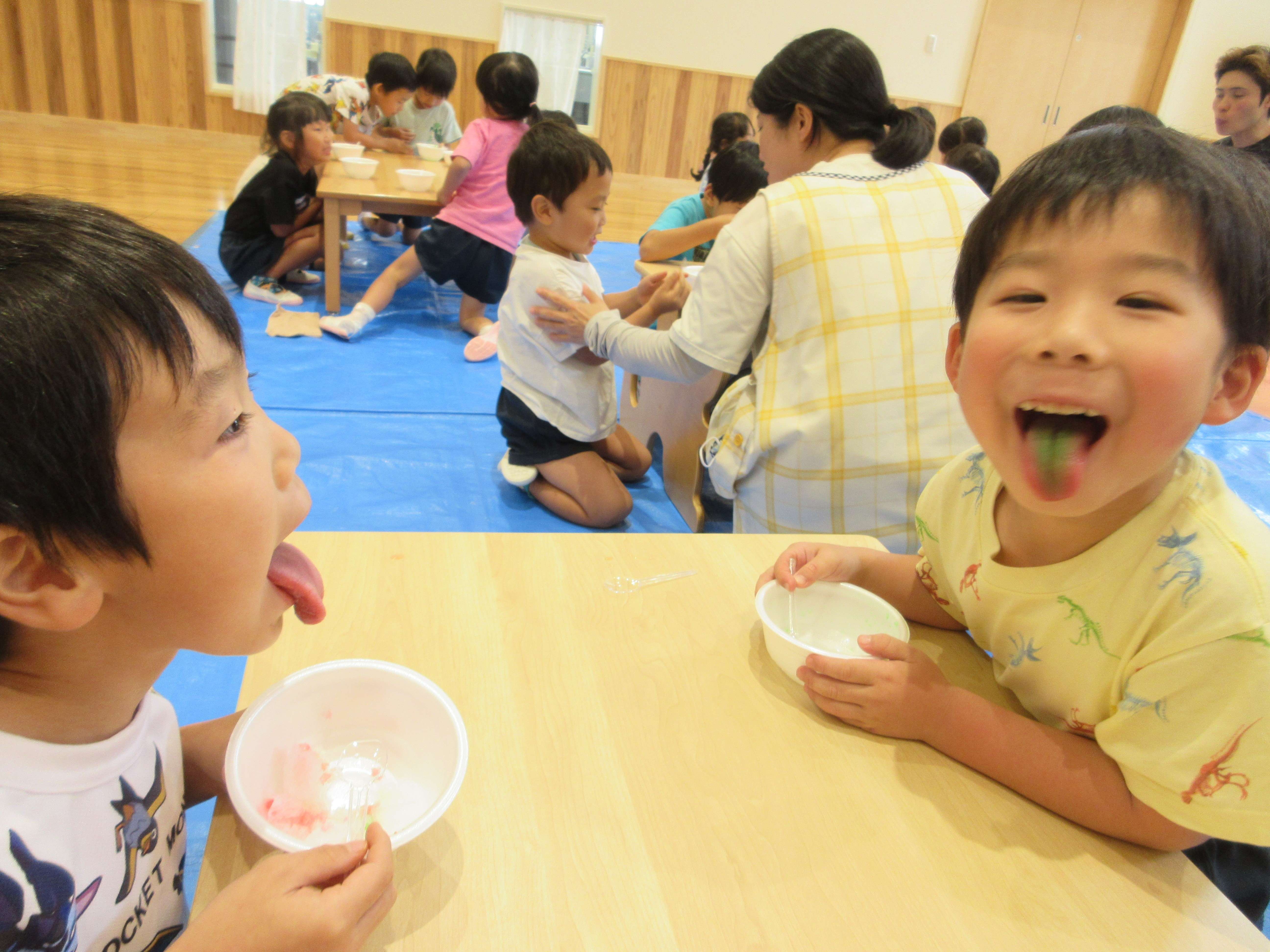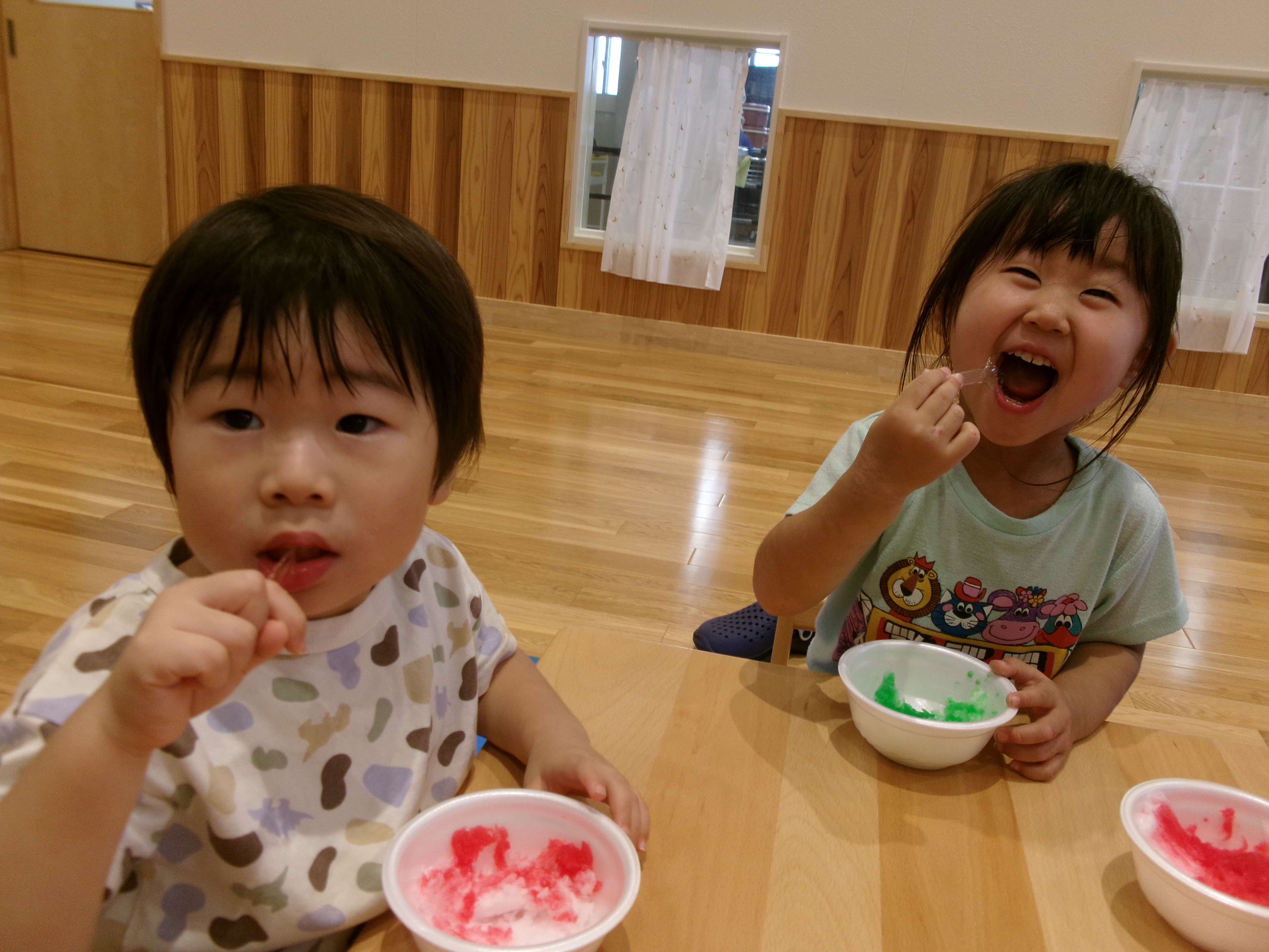 毎年恒例のかき氷パーティーです♪自分で好きな味を選んで注文しました。冷たくておいしいね!