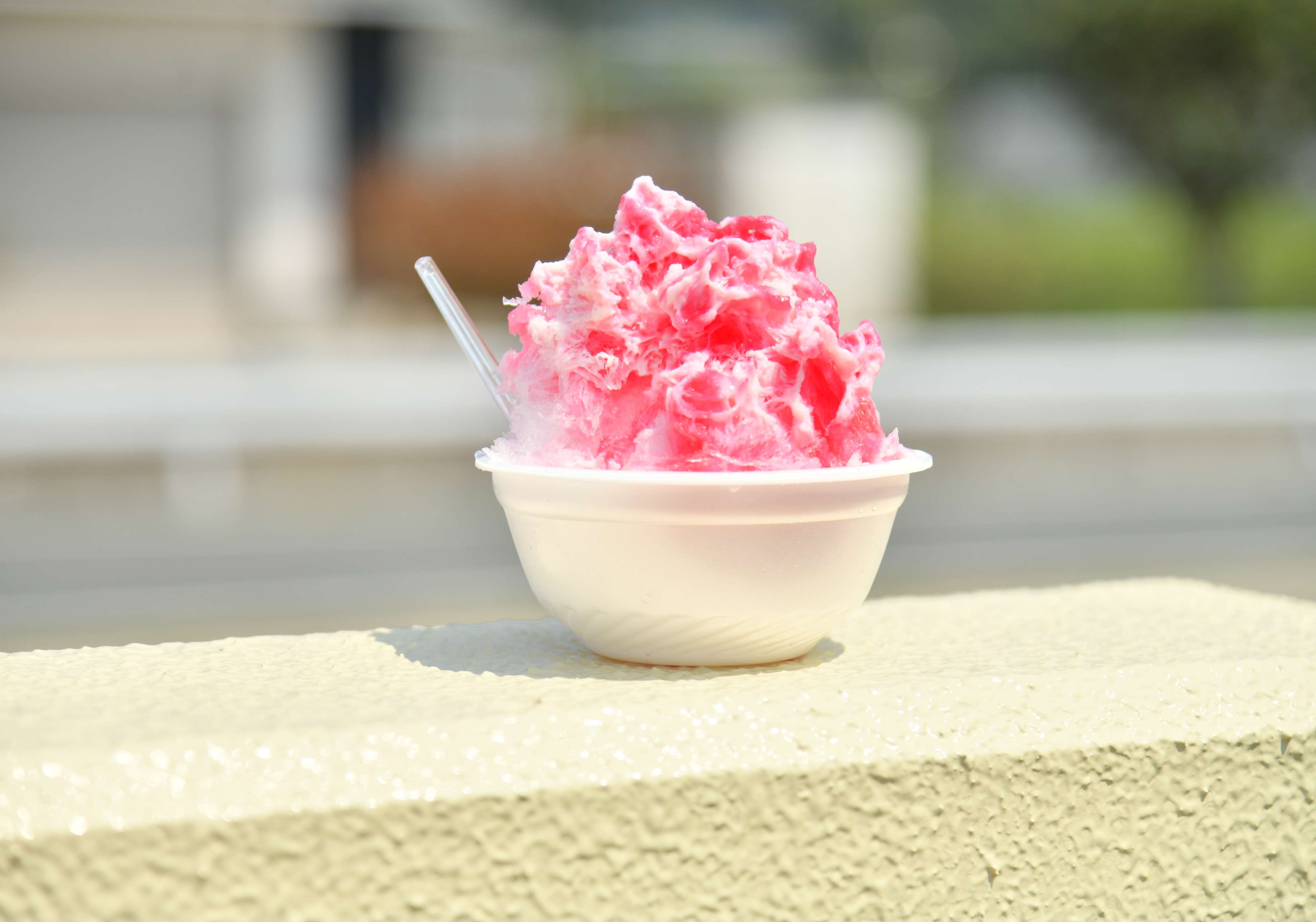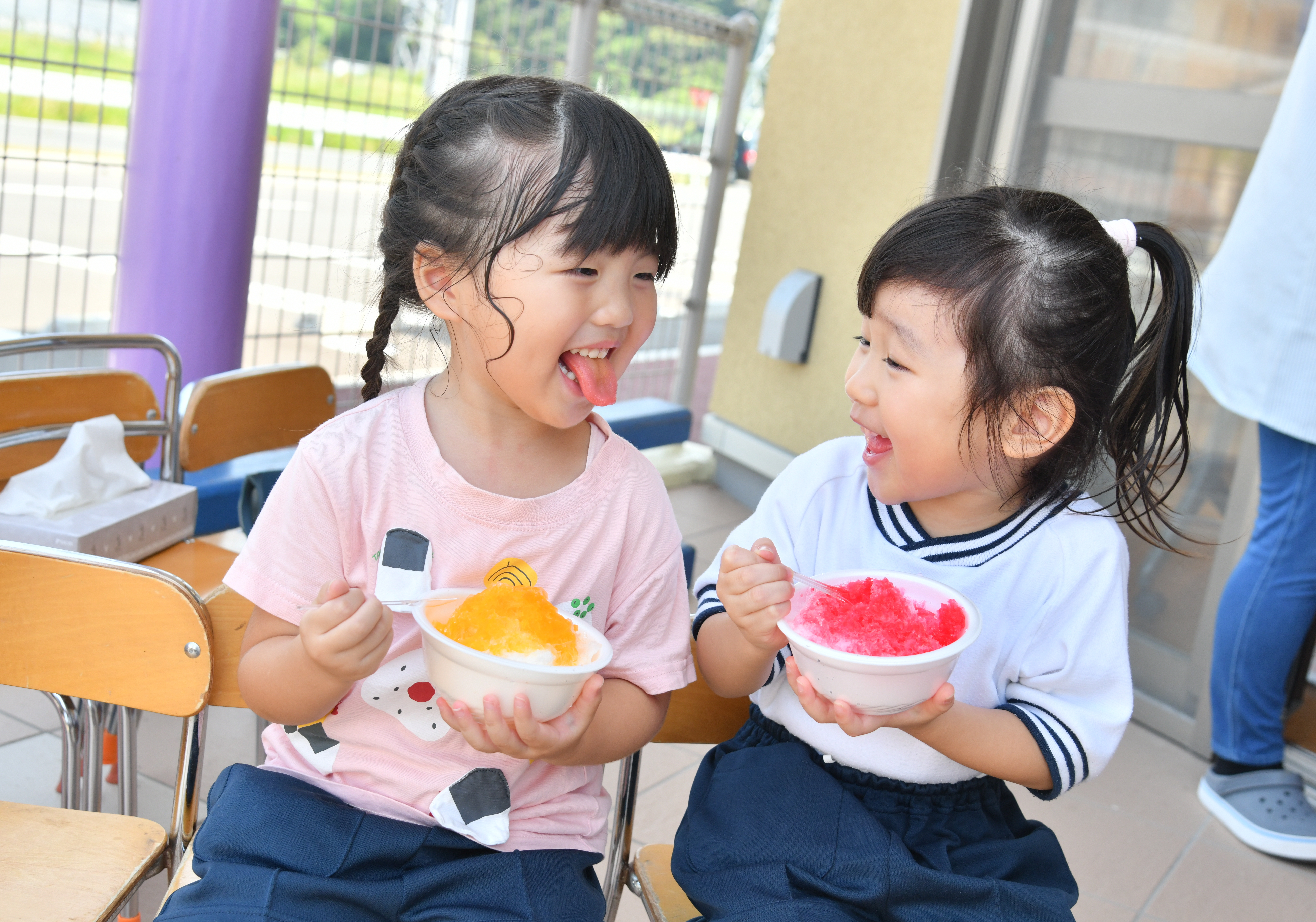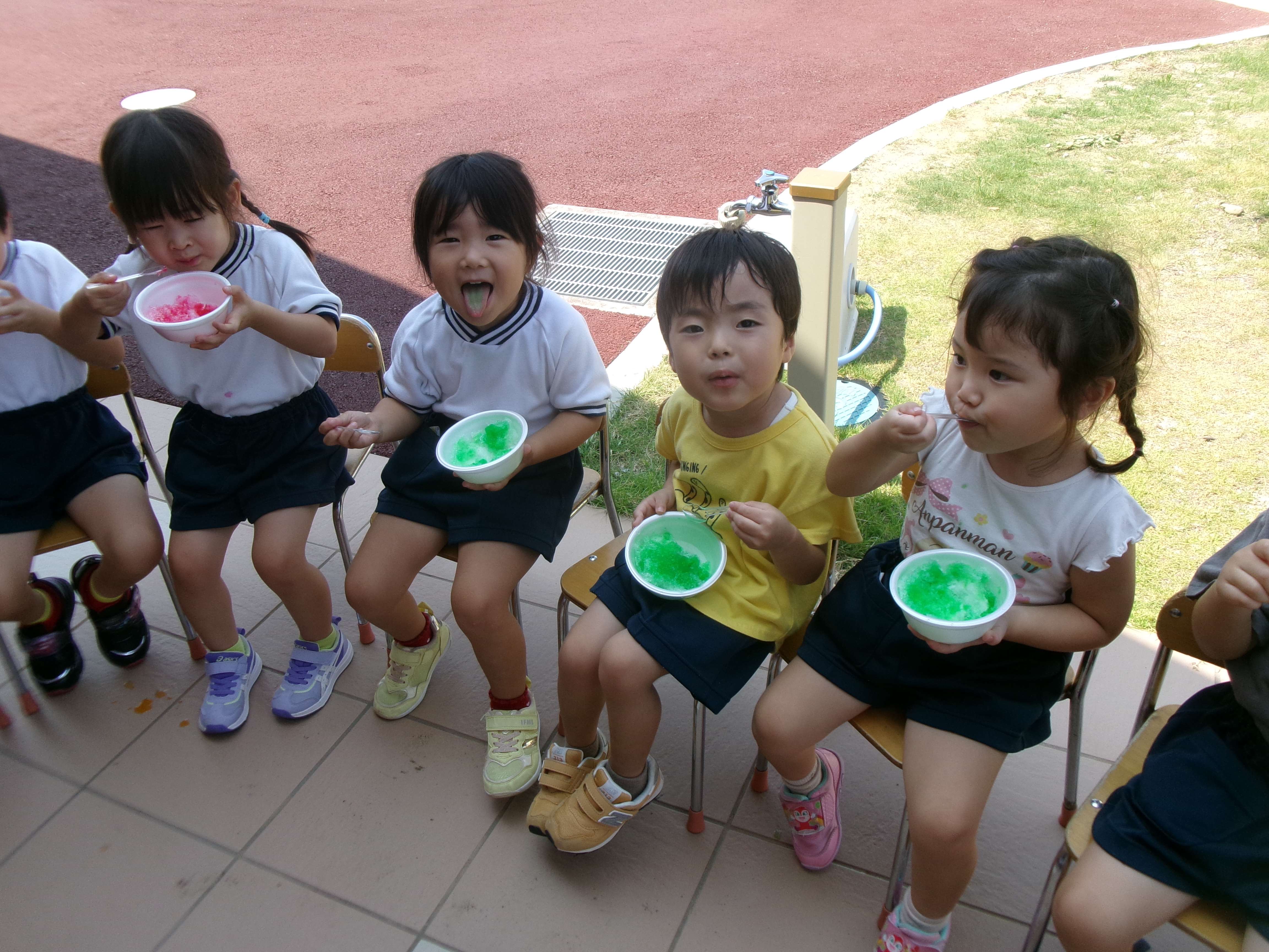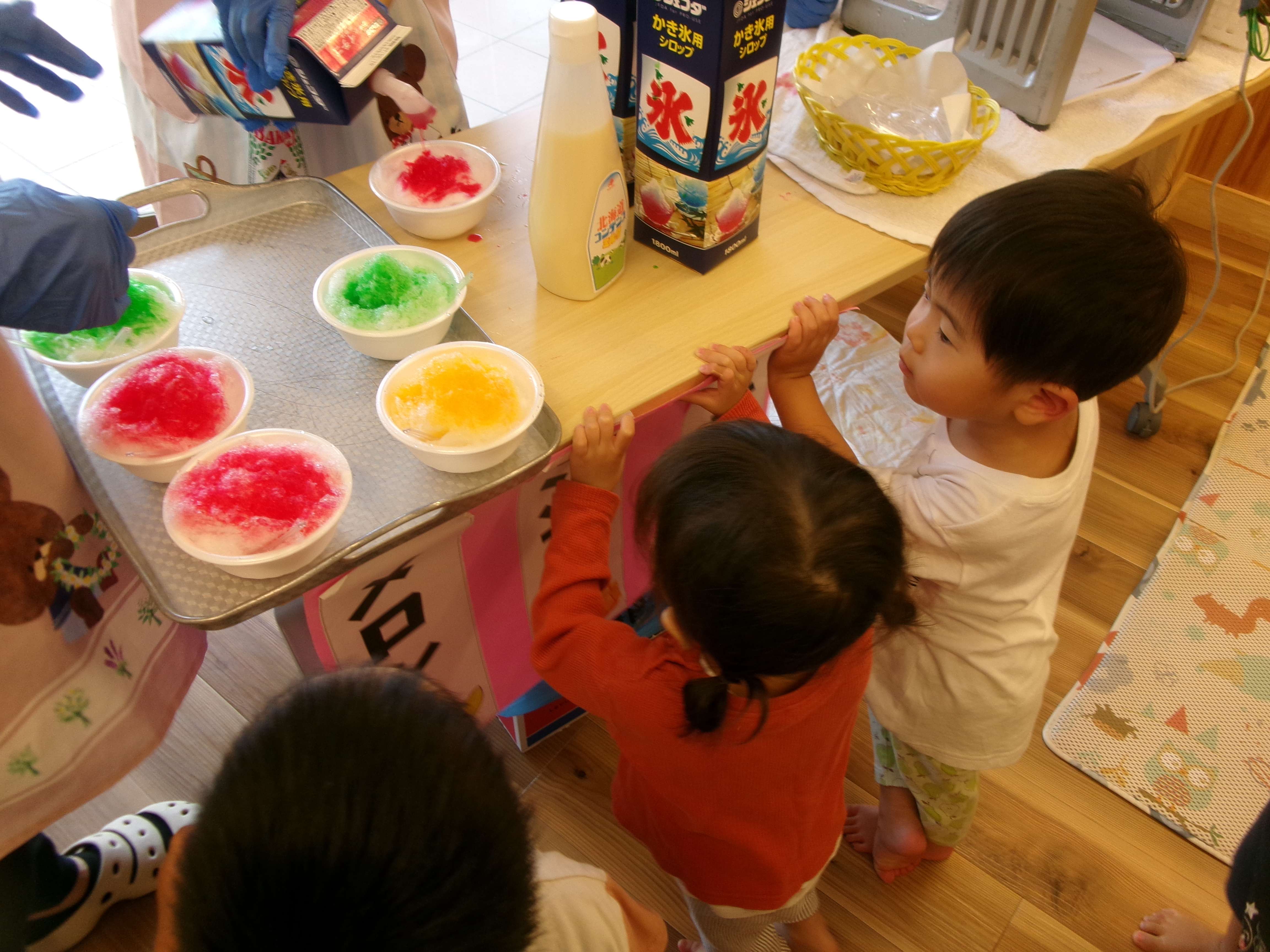 毎年恒例のかき氷パーティーです♪自分で好きな味を選んで注文しました。冷たくておいしいね!