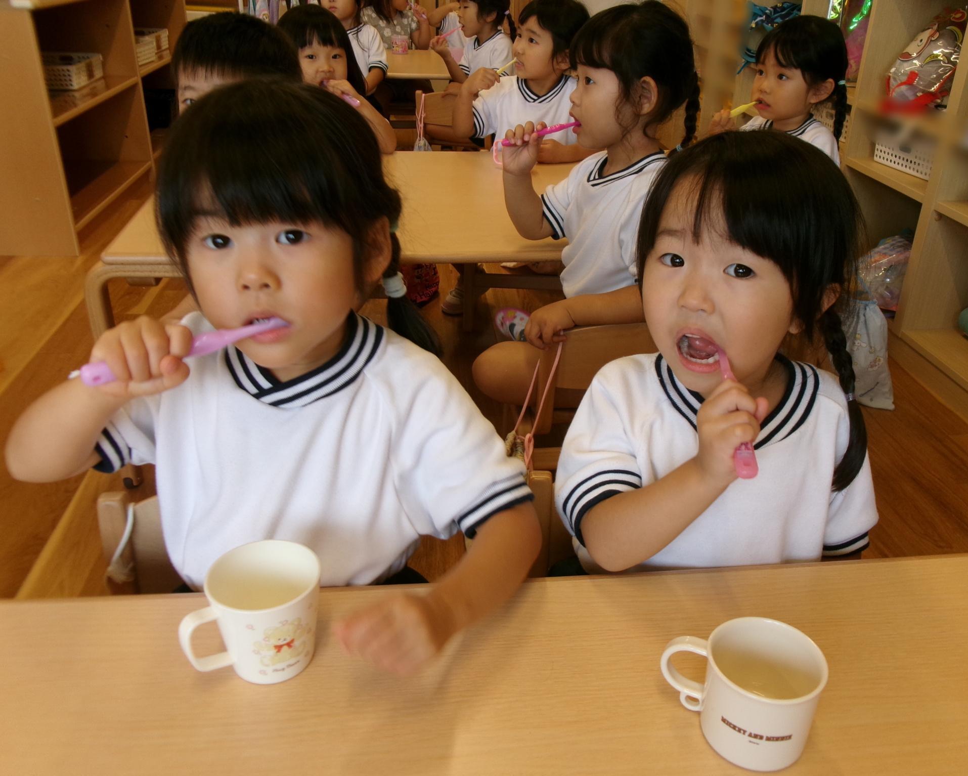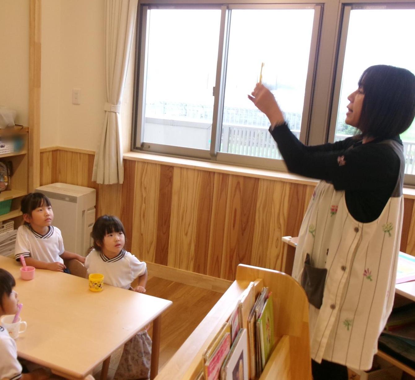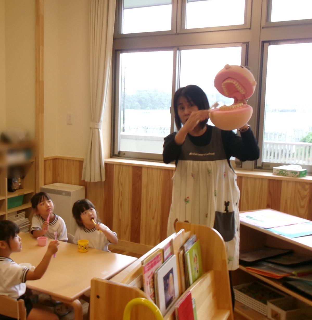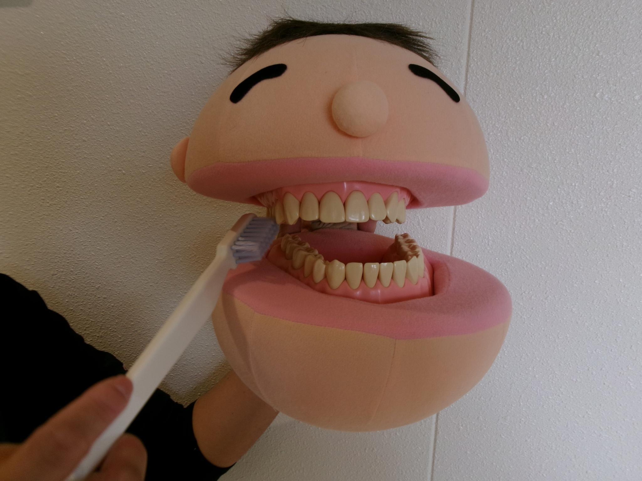リーザくん(歯の顎模型)とゆう子先生と一緒に歯ブラシの持ち方、歯磨きの仕方を確認しました。丁寧に歯を磨いて目指せ!虫歯ゼロ!!