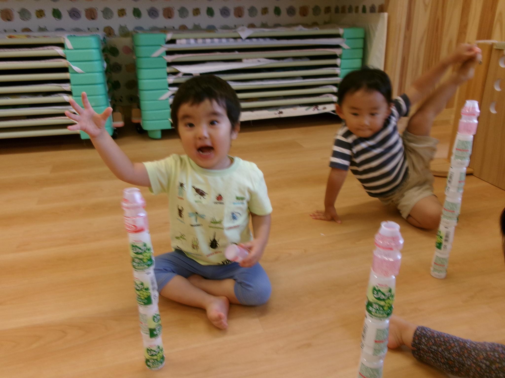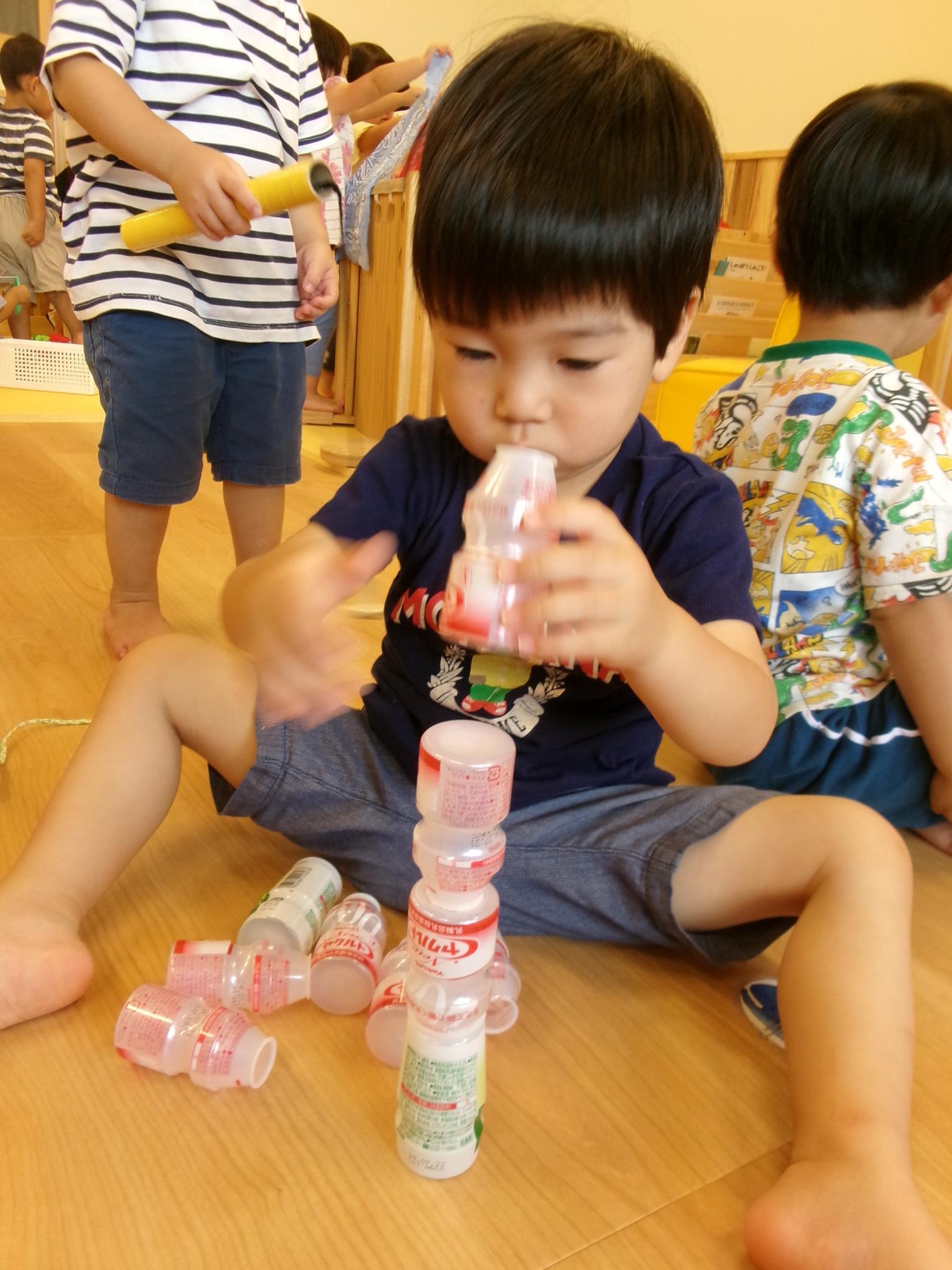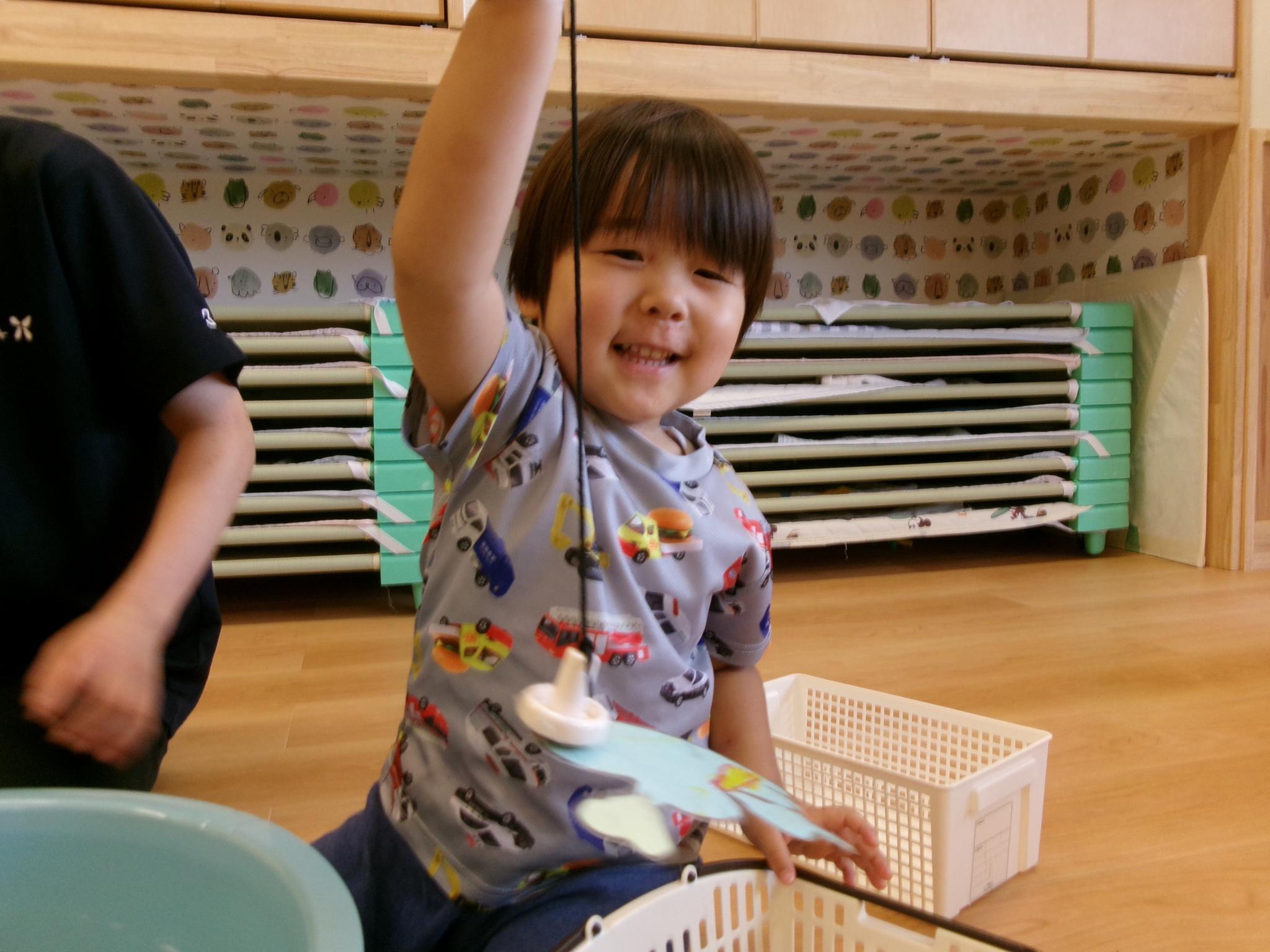 今日は室内遊びをしました。おままごとコーナーや魚釣りコーナー、ブロック、積木、ジョア・ヤクルトの空容器積みなどして遊びました。ジョア・ヤクルト容器を一つずつゆっくり積み上げ、真剣な子どもたち。積み上がり、倒れると「あ~!!」と倒れるのも楽しんでいました♪