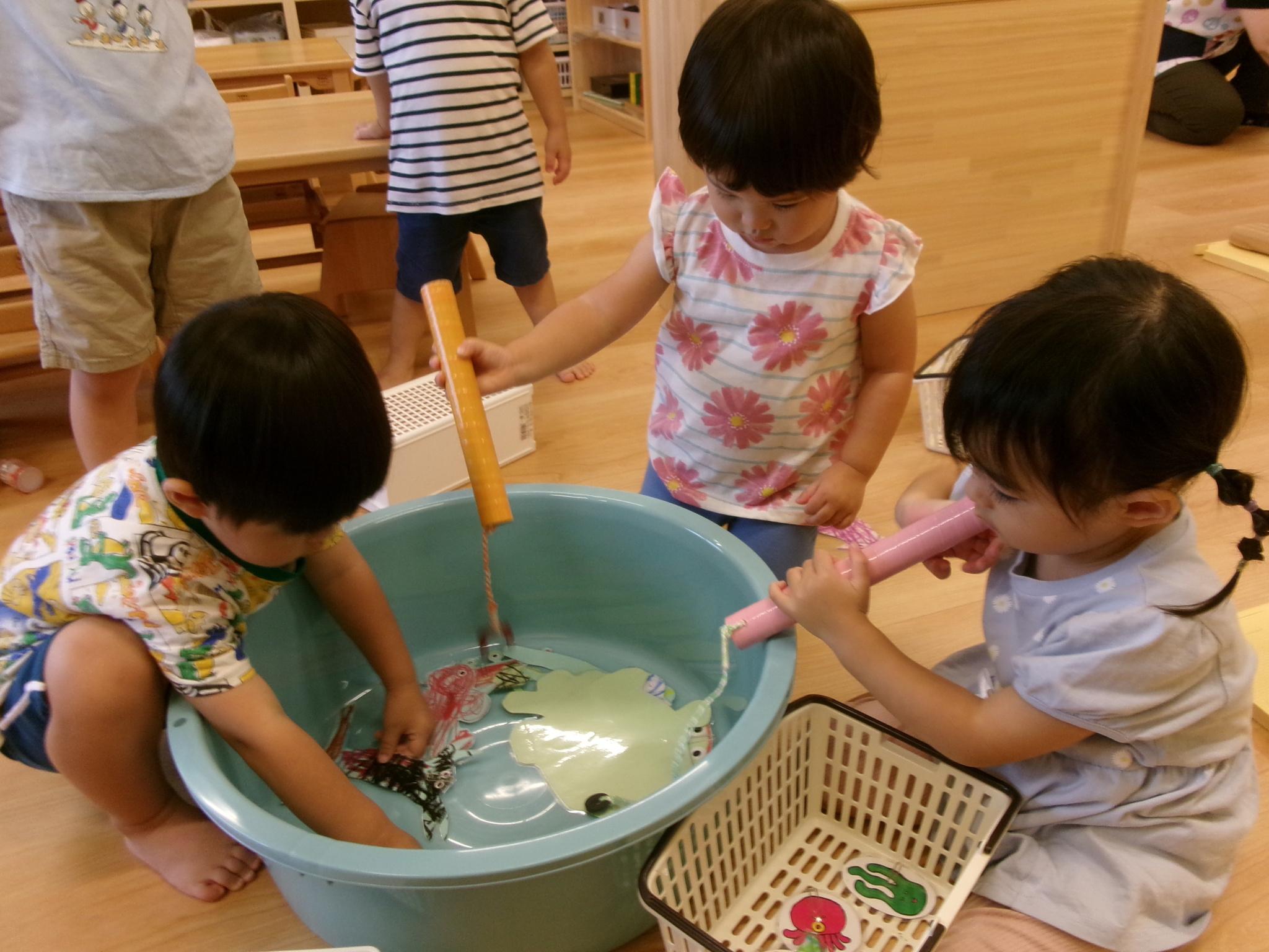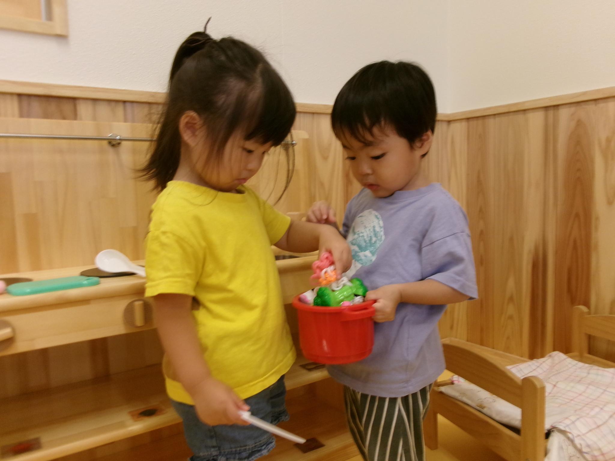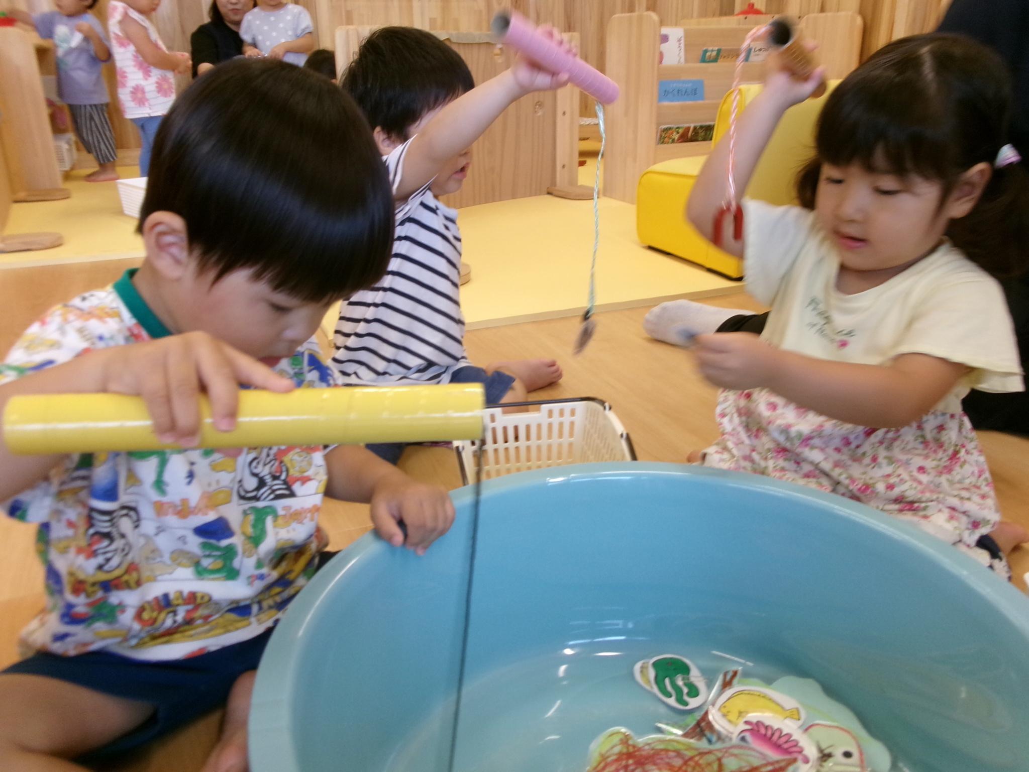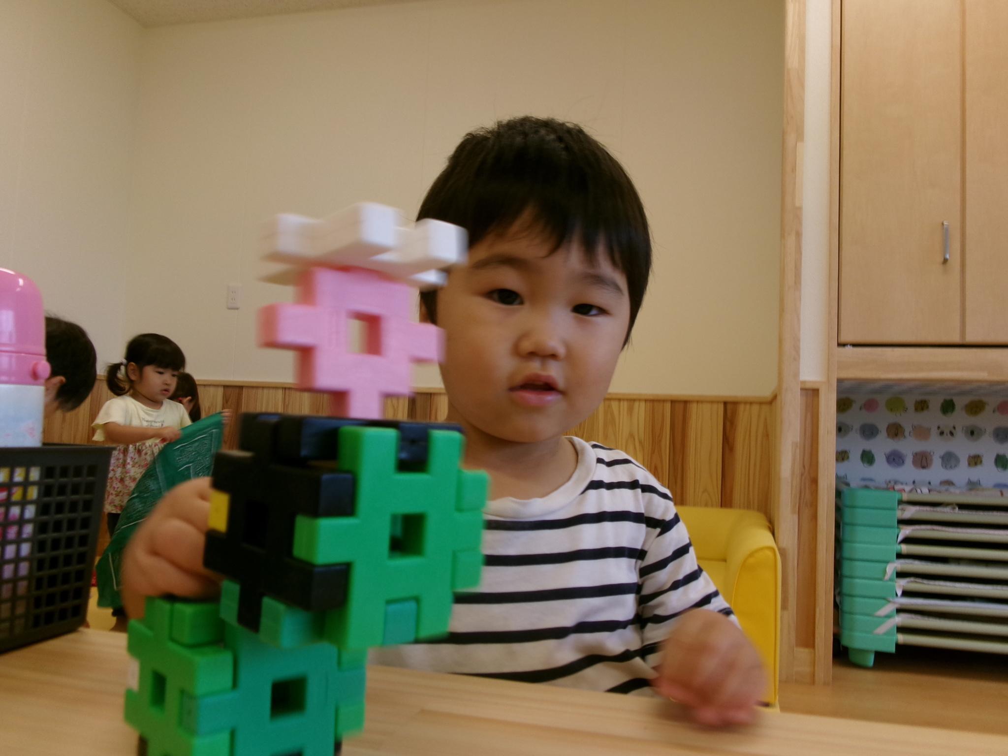 今日は室内遊びをしました。おままごとコーナーや魚釣りコーナー、ブロック、積木、ジョア・ヤクルトの空容器積みなどして遊びました。ジョア・ヤクルト容器を一つずつゆっくり積み上げ、真剣な子どもたち。積み上がり、倒れると「あ~!!」と倒れるのも楽しんでいました♪