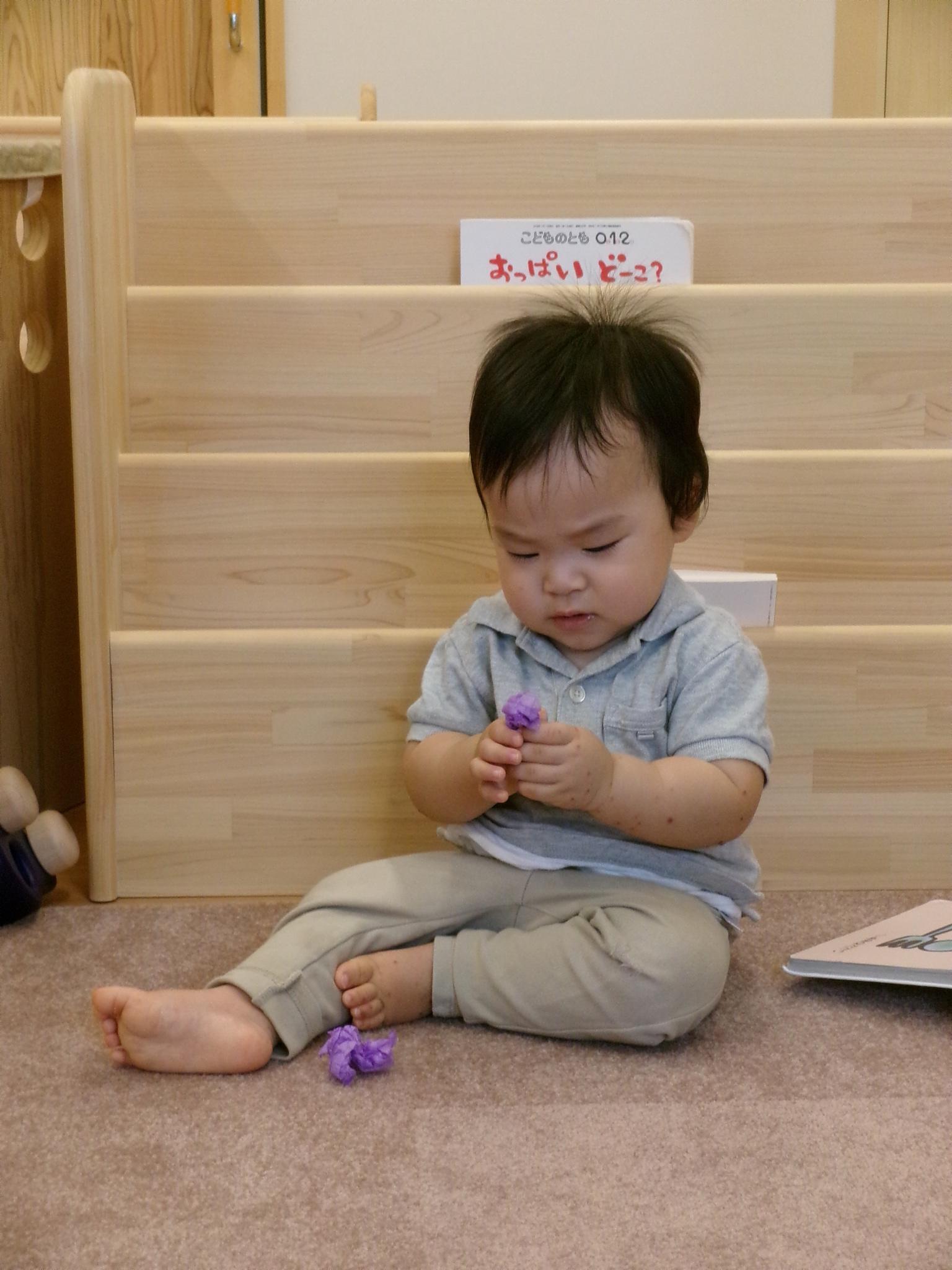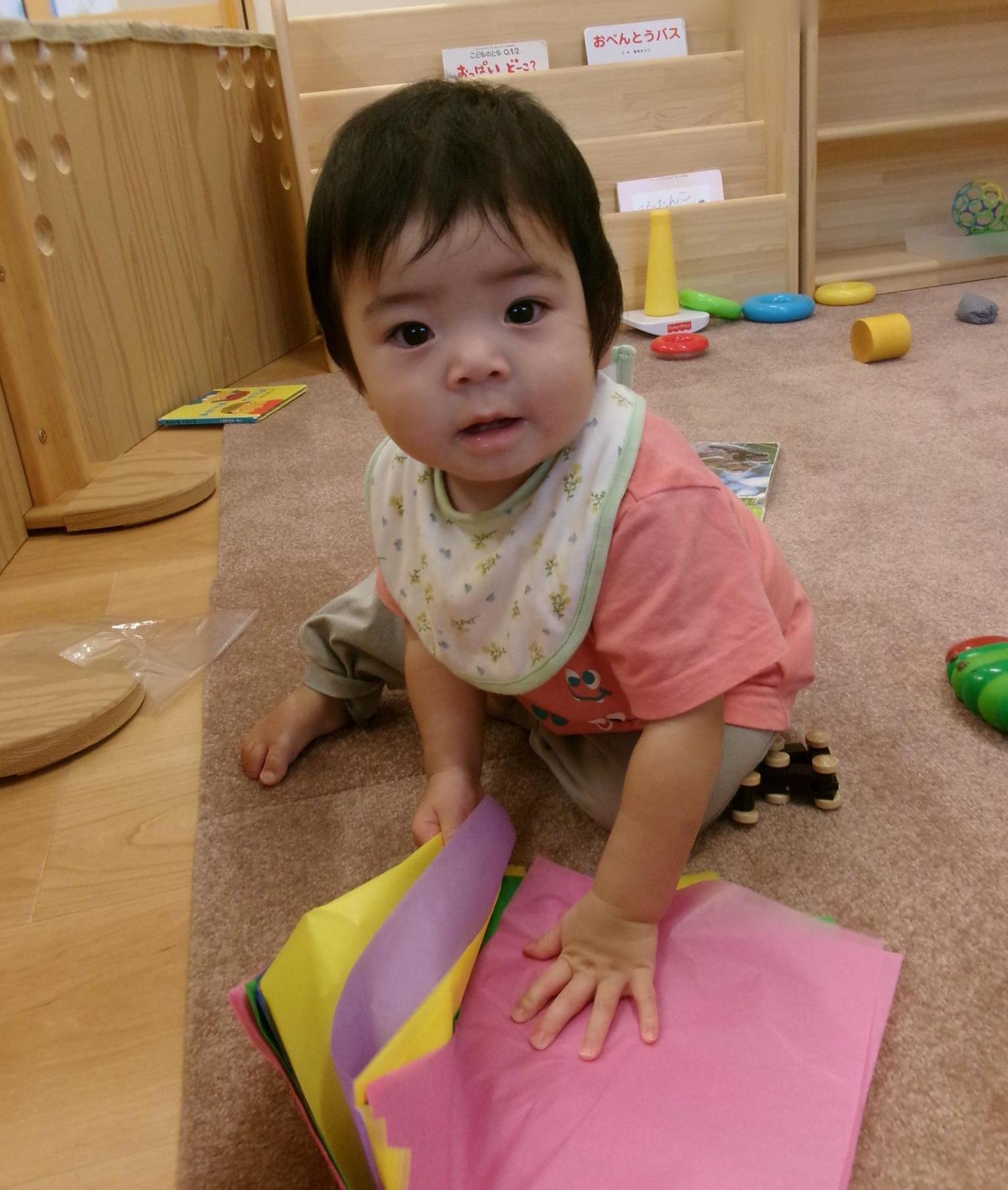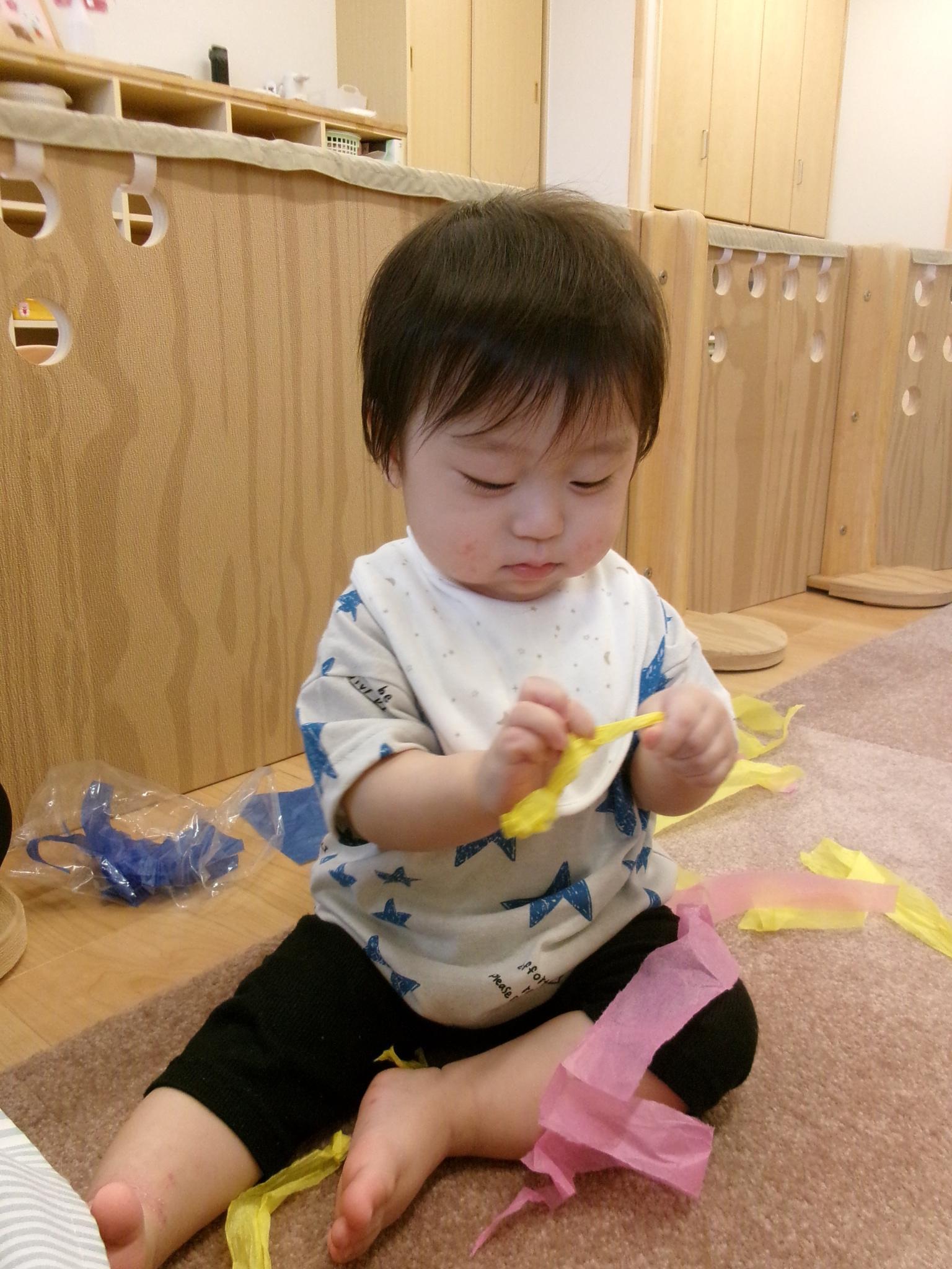 お花紙を触って遊びました。手を伸ばしたり、指先でひっぱり、ちぎってみたりと、ふわふわな感触を楽しみました!ちぎったものを袋に入れ、もみもみと握って遊んでみました