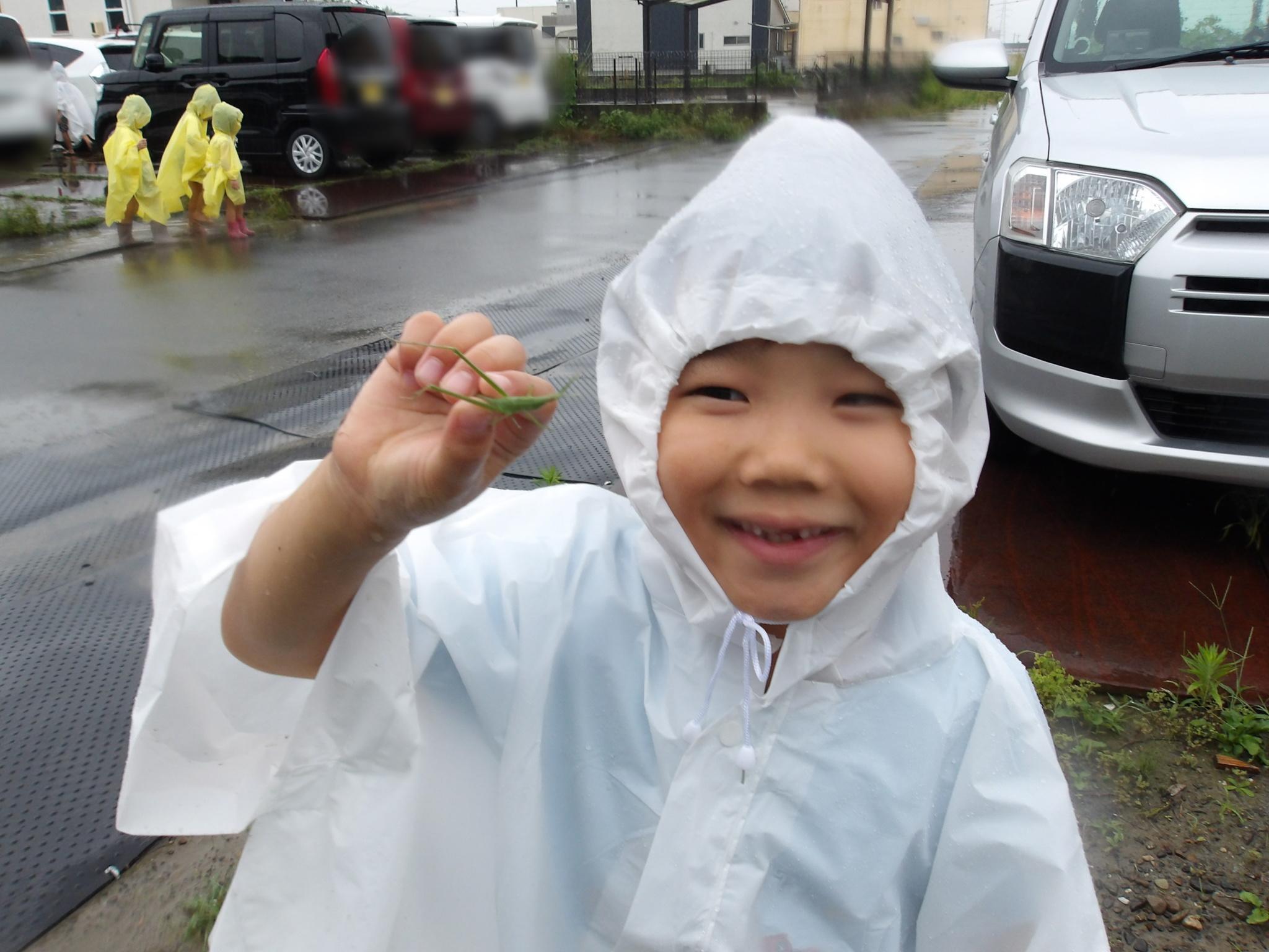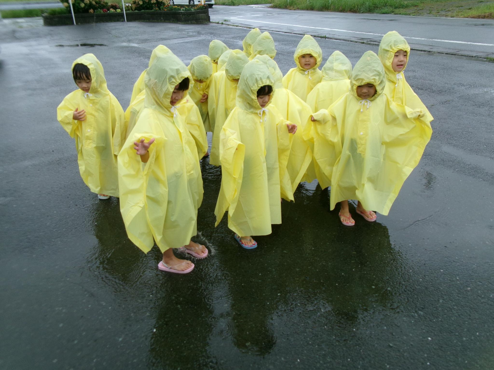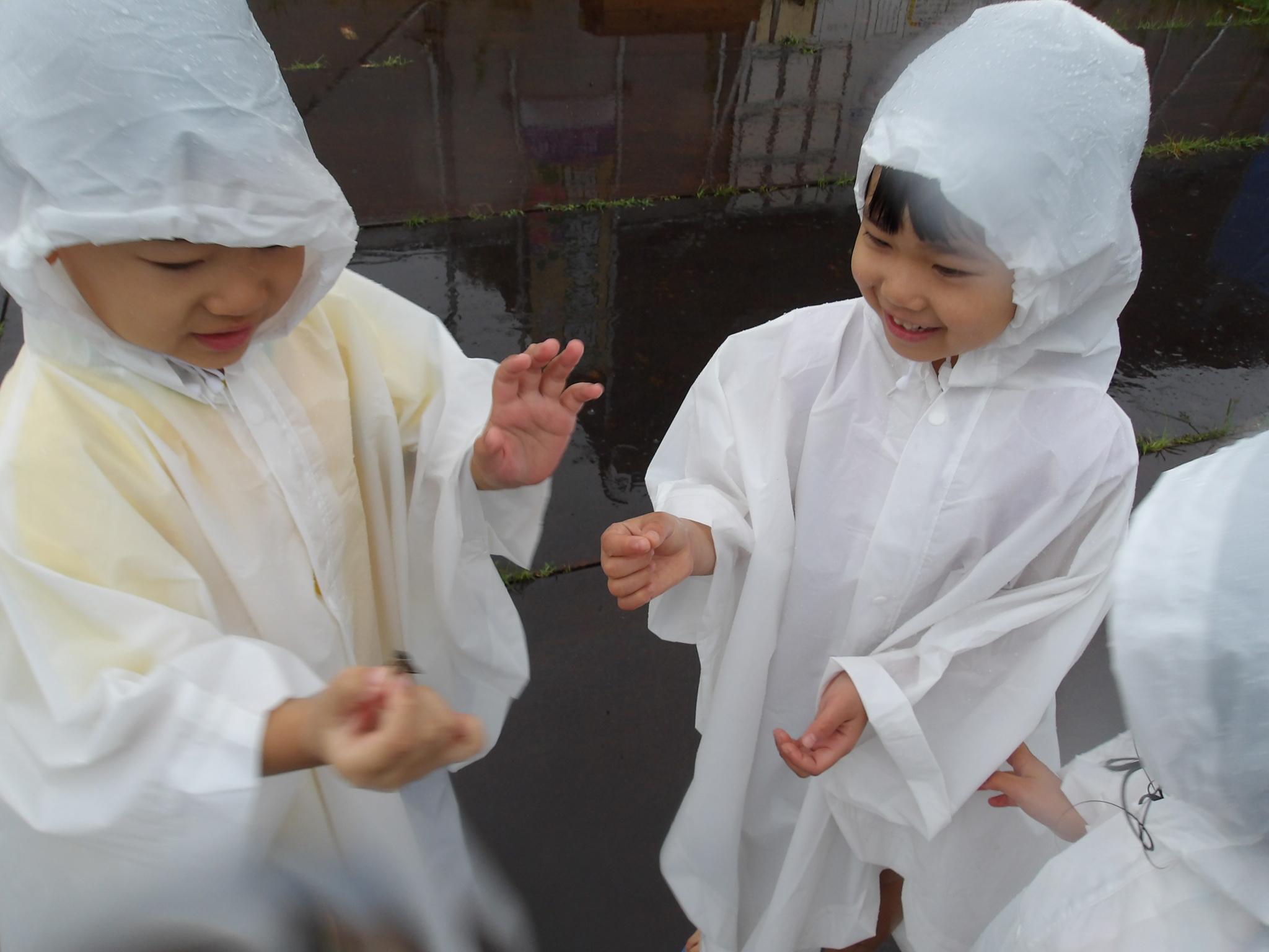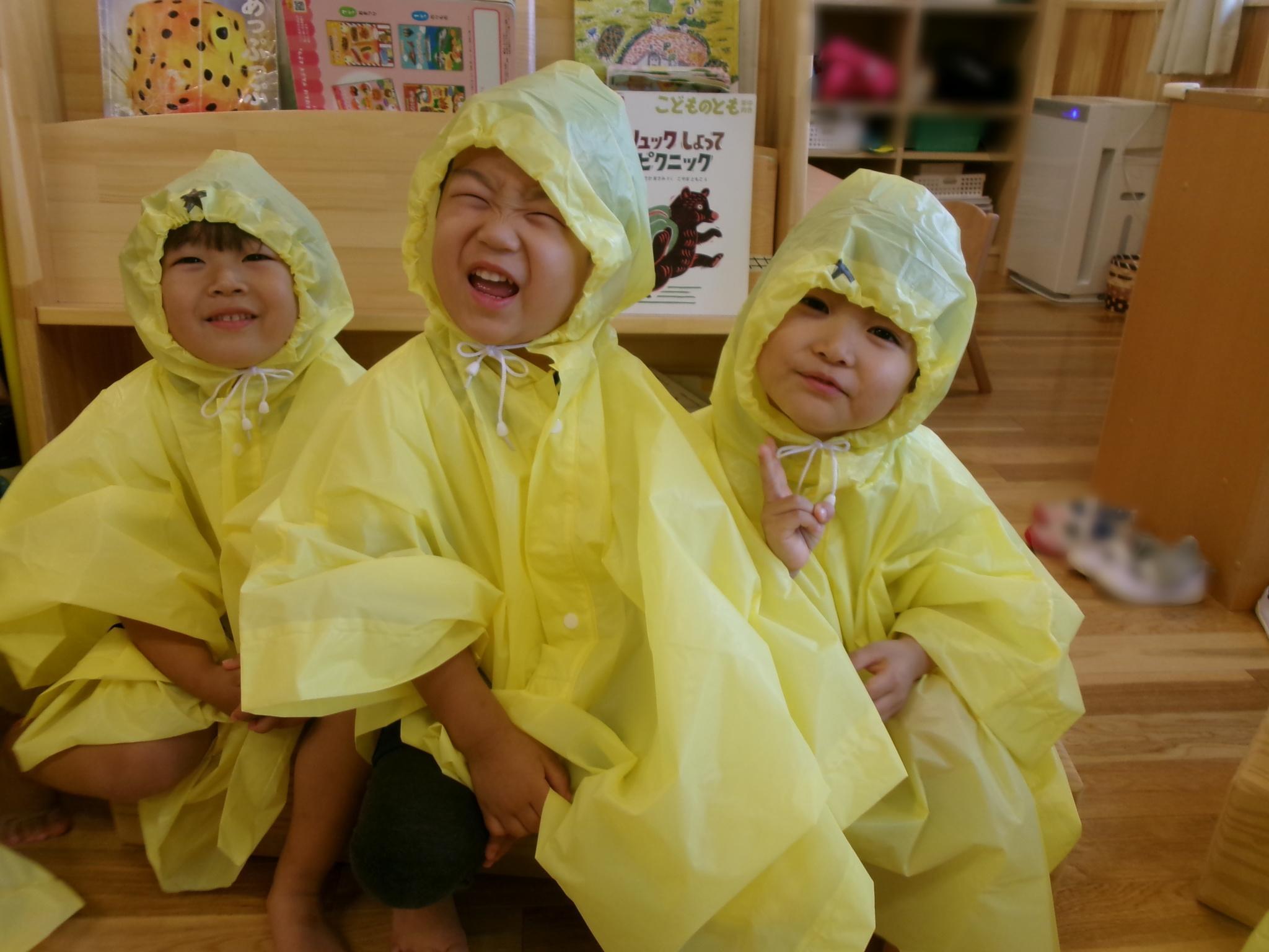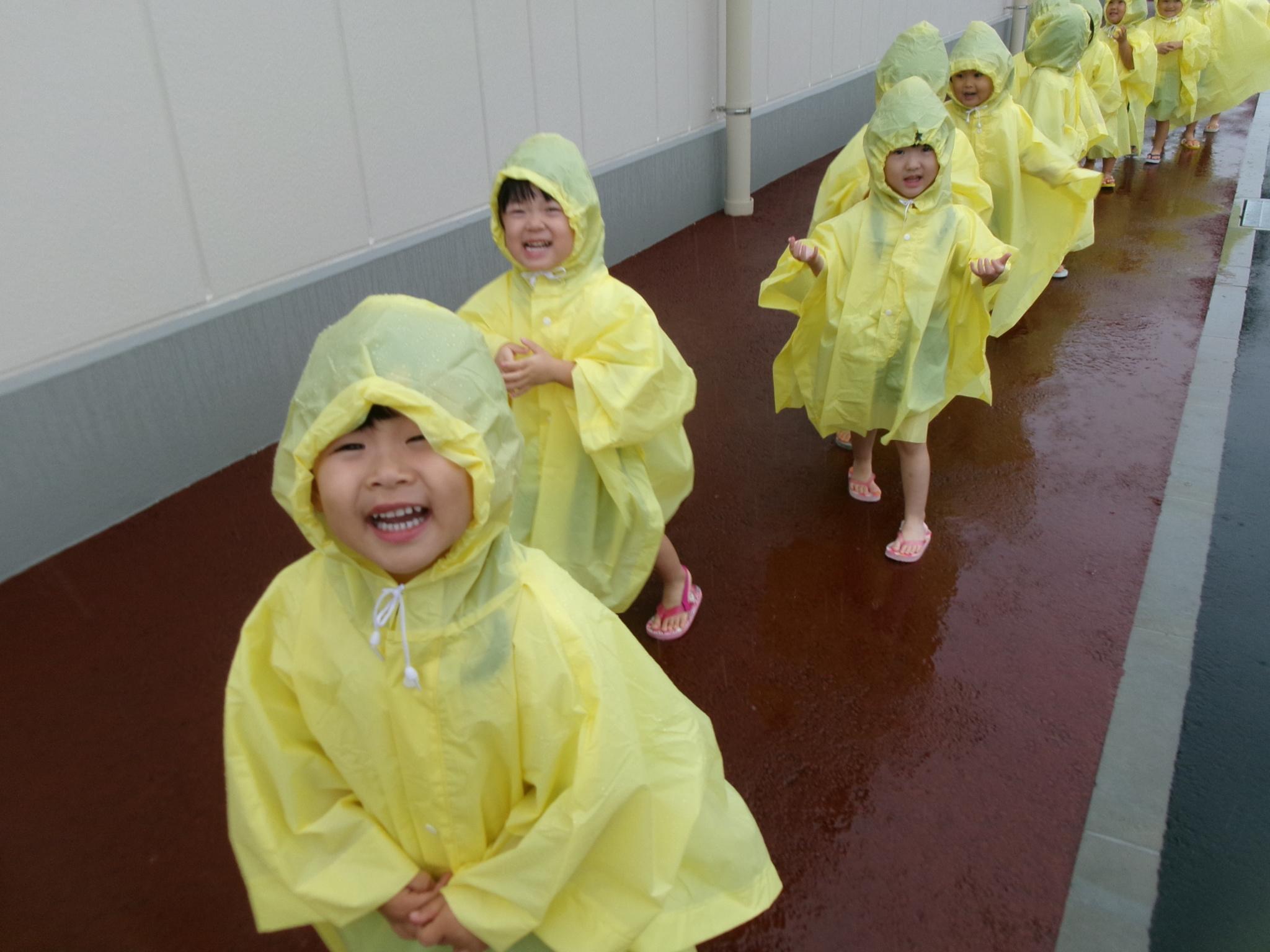 みんなでポンチョ型のかっぱを着て雨降り散歩へ!!大きな水たまりへ思いきりジャンプ!!手のひらを差し出し「雨をためるの!」と言い「最高だ~!!」大喜びのみんなでした
