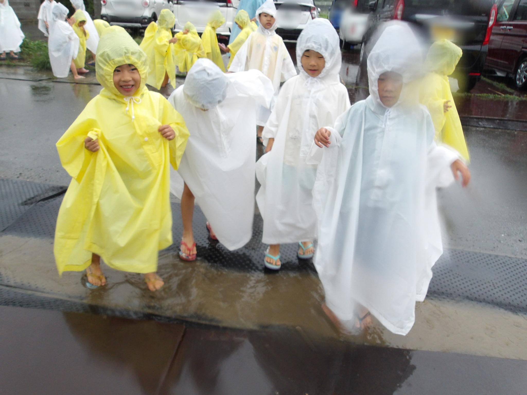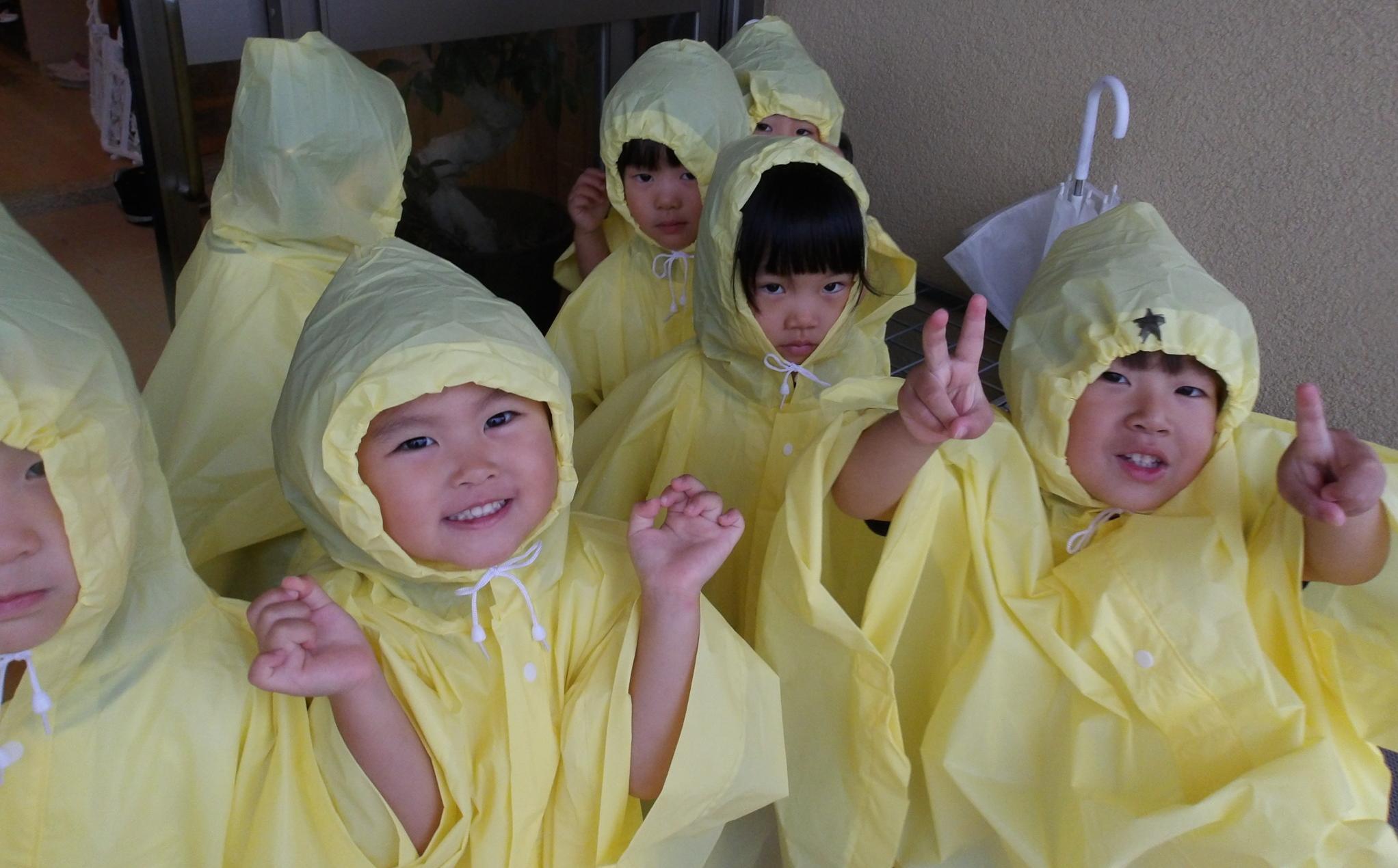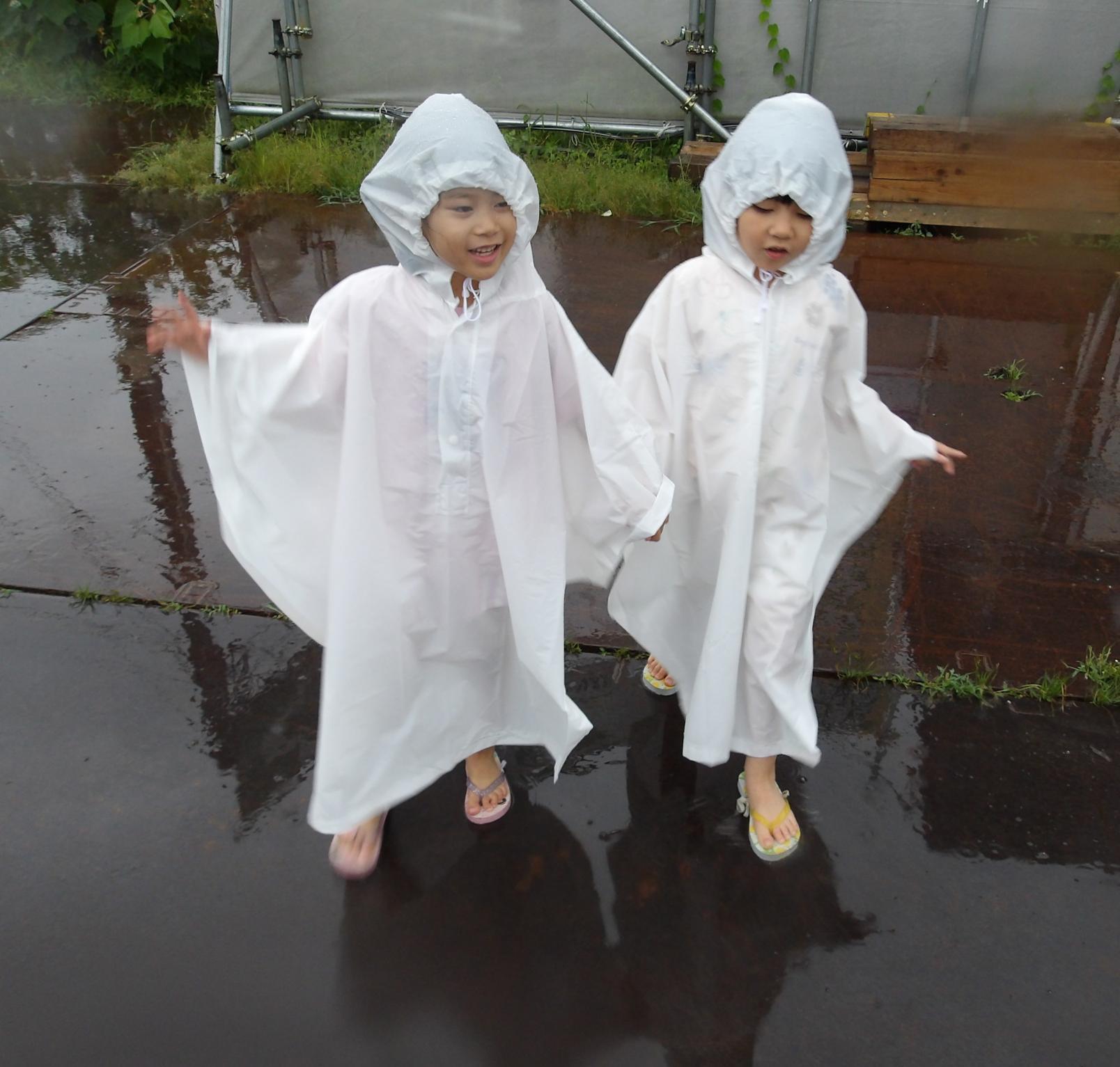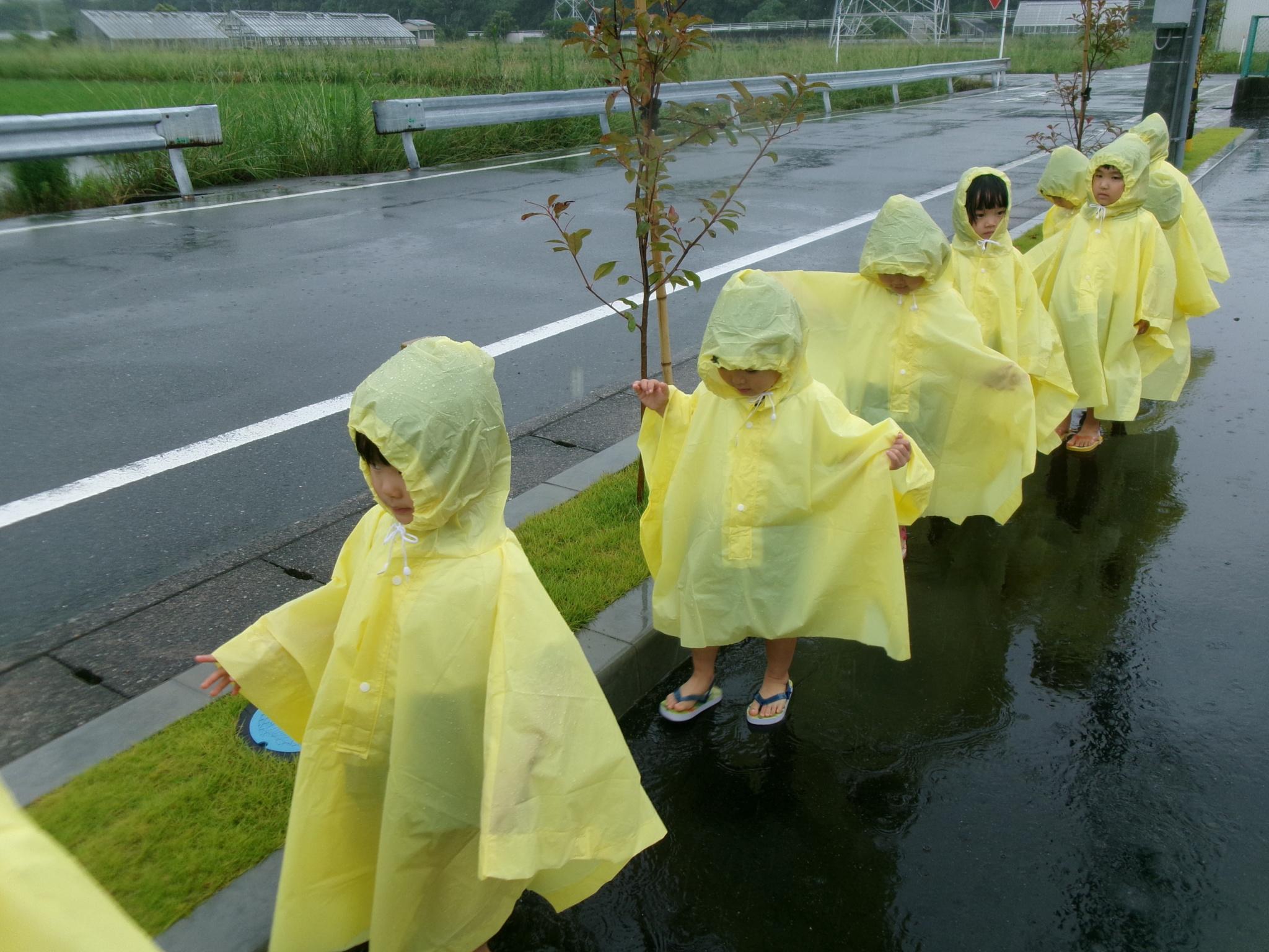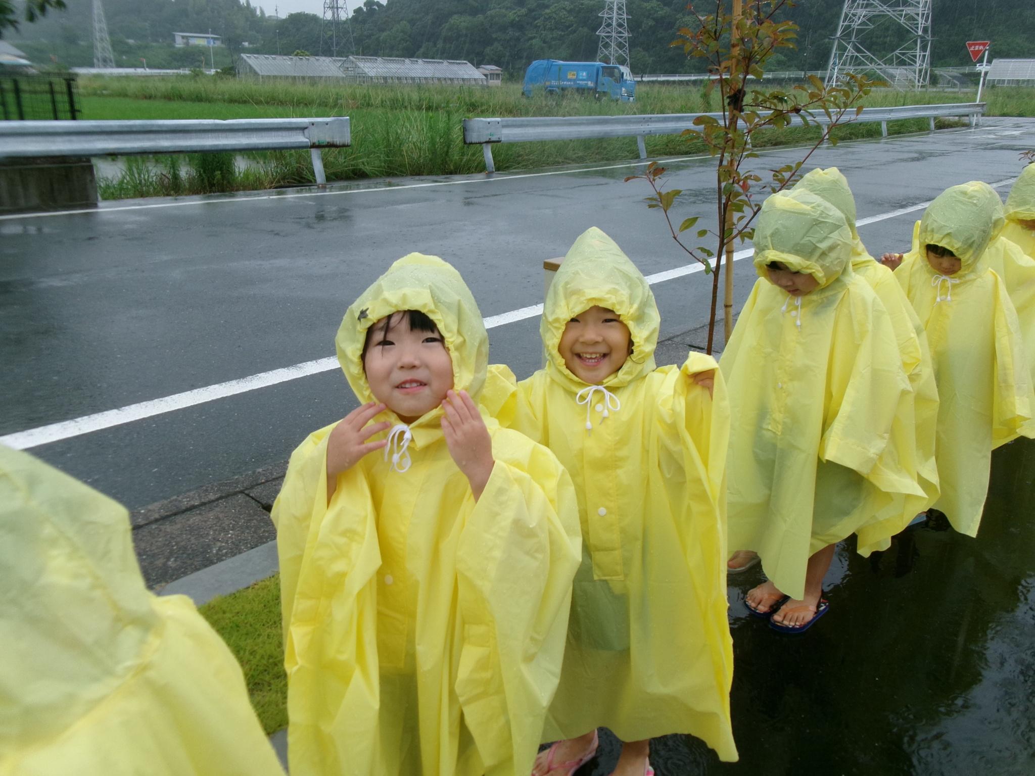 みんなでポンチョ型のかっぱを着て雨降り散歩へ!!大きな水たまりへ思いきりジャンプ!!手のひらを差し出し「雨をためるの!」と言い「最高だ~!!」大喜びのみんなでした