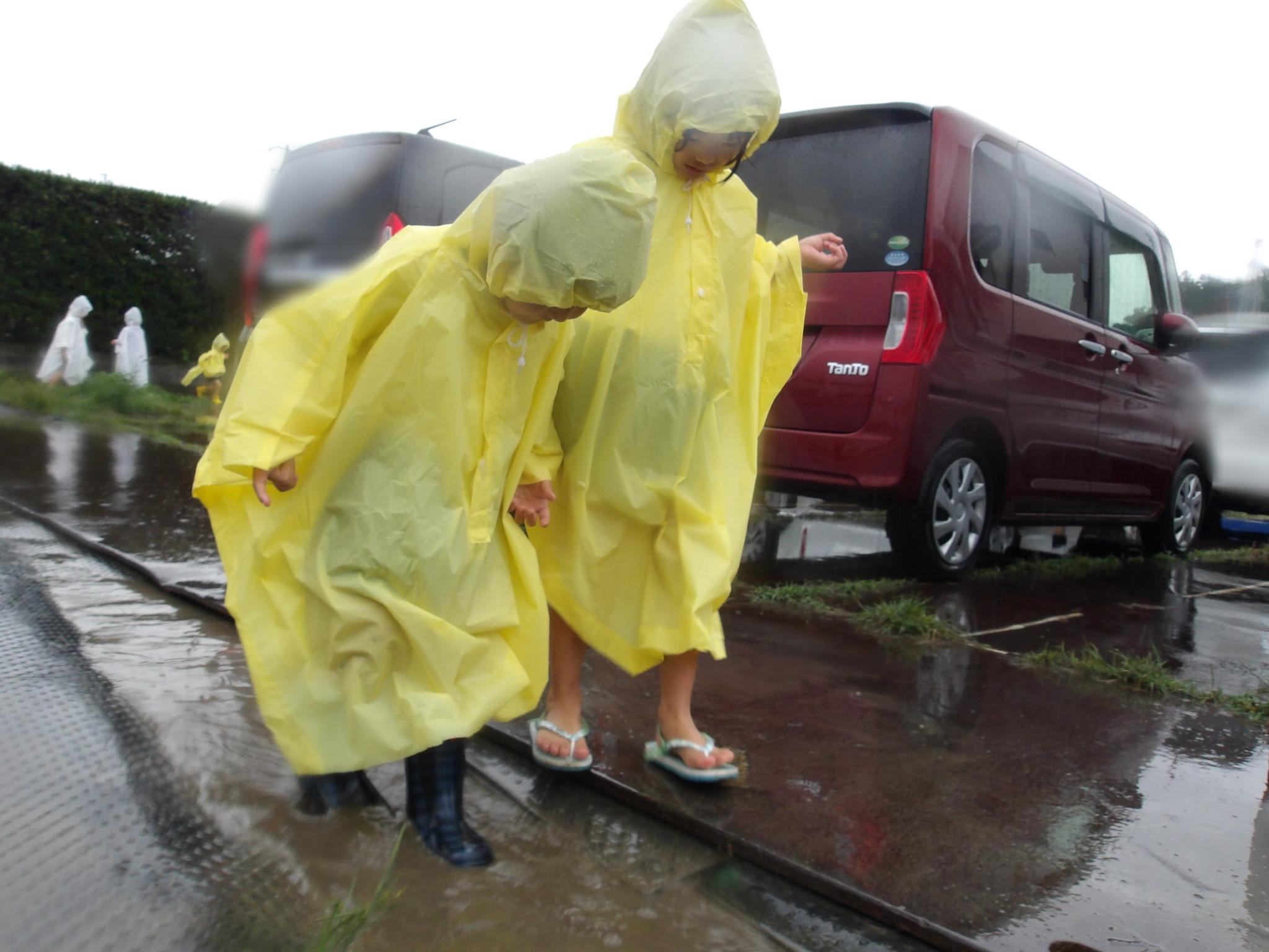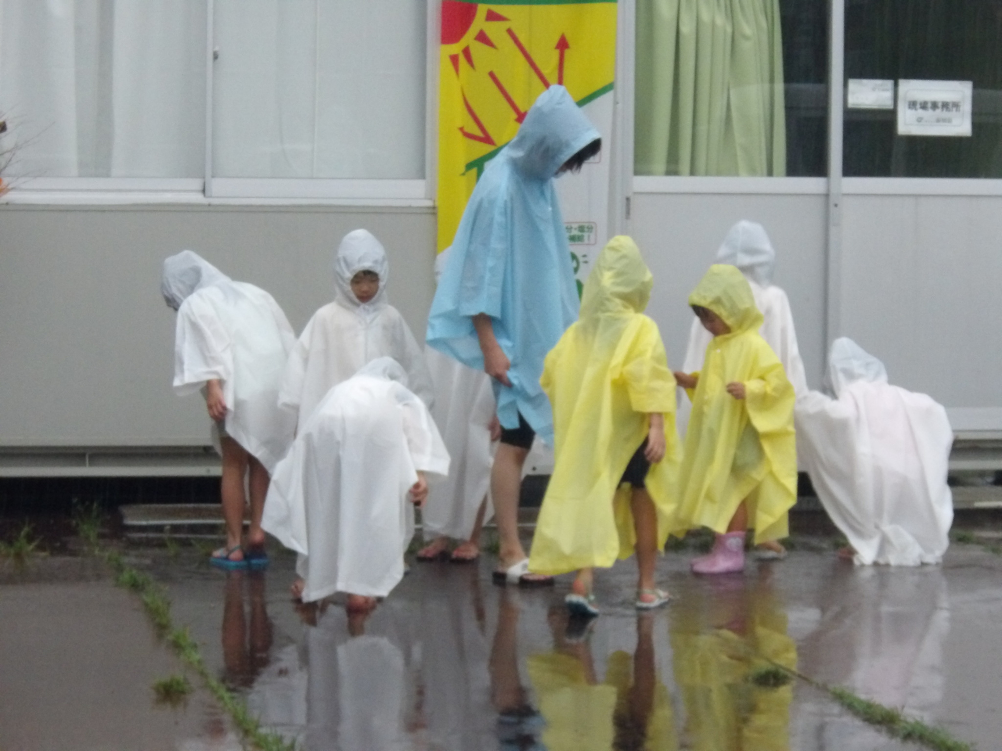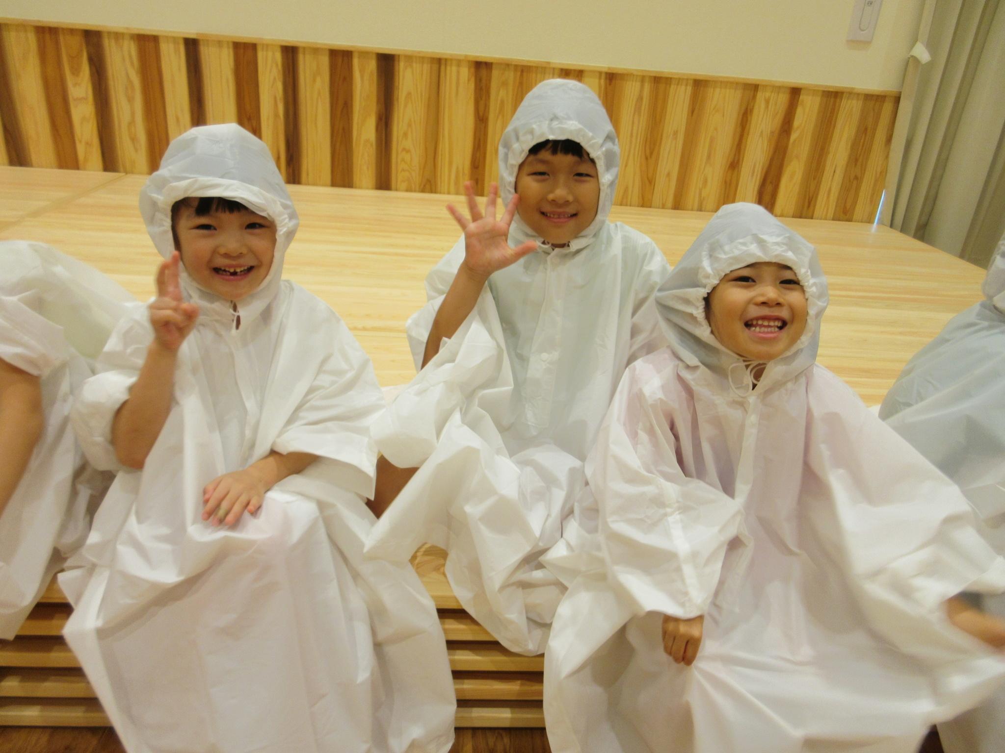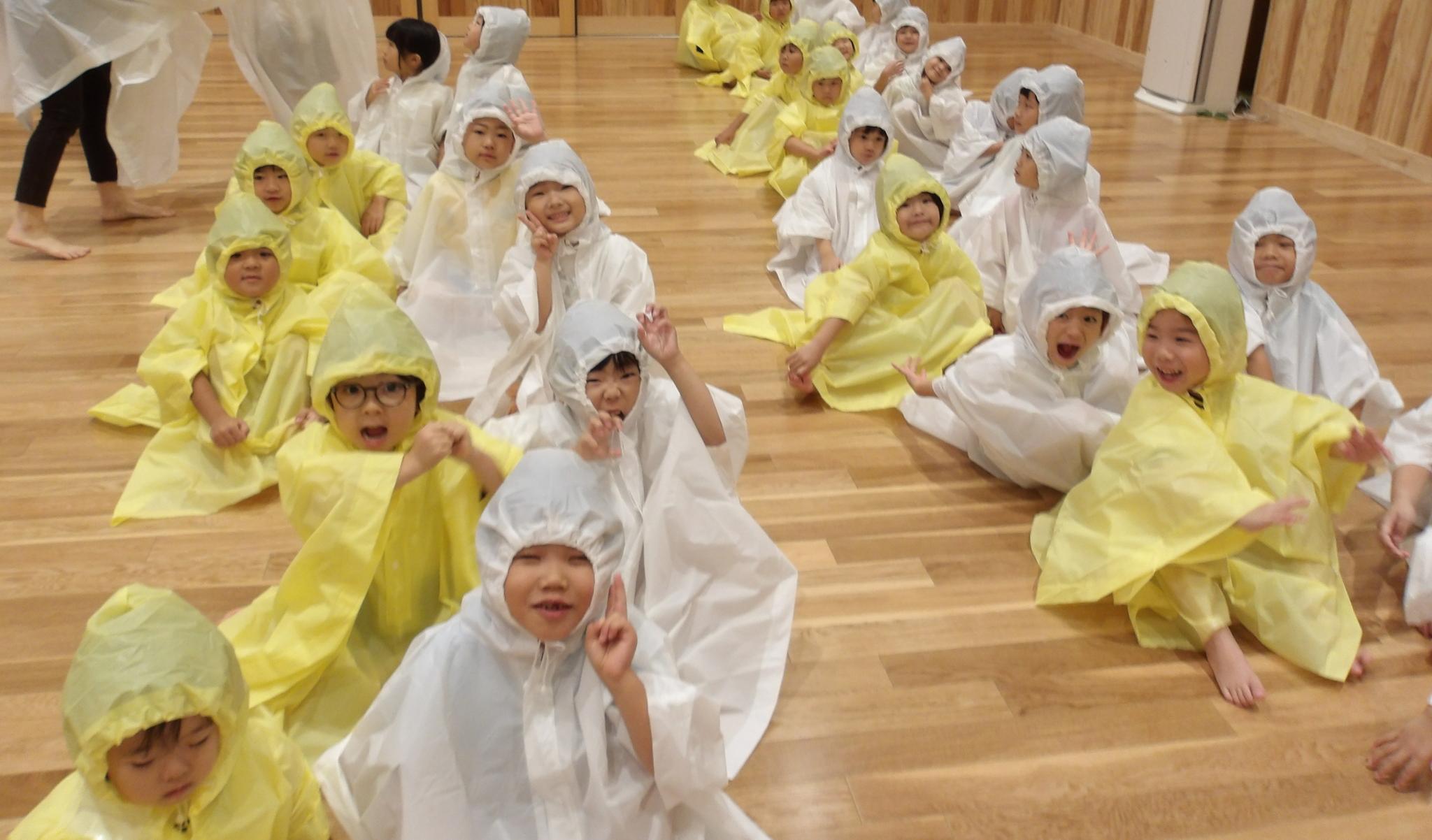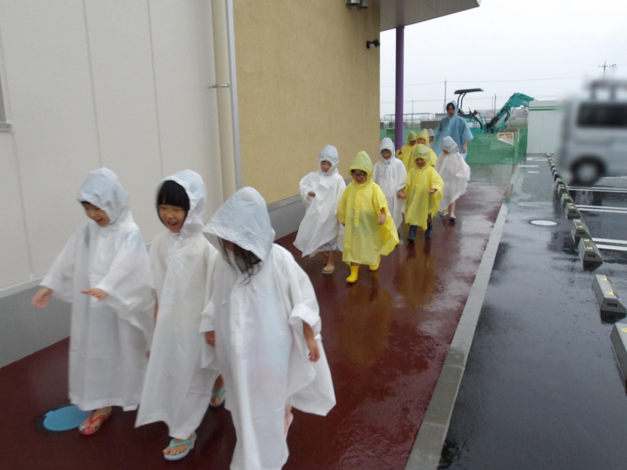 みんなでポンチョ型のかっぱを着て雨降り散歩へ!!大きな水たまりへ思いきりジャンプ!!手のひらを差し出し「雨をためるの!」と言い「最高だ~!!」大喜びのみんなでした