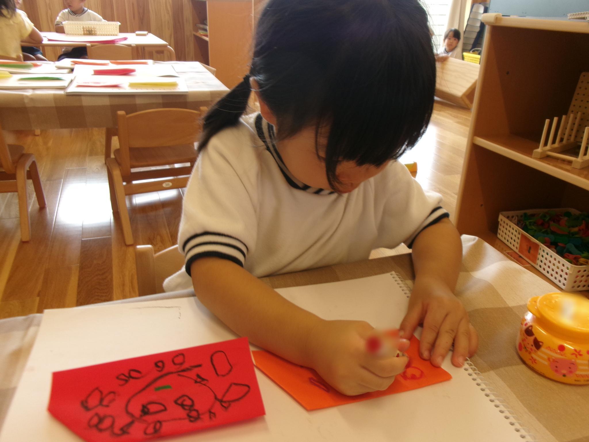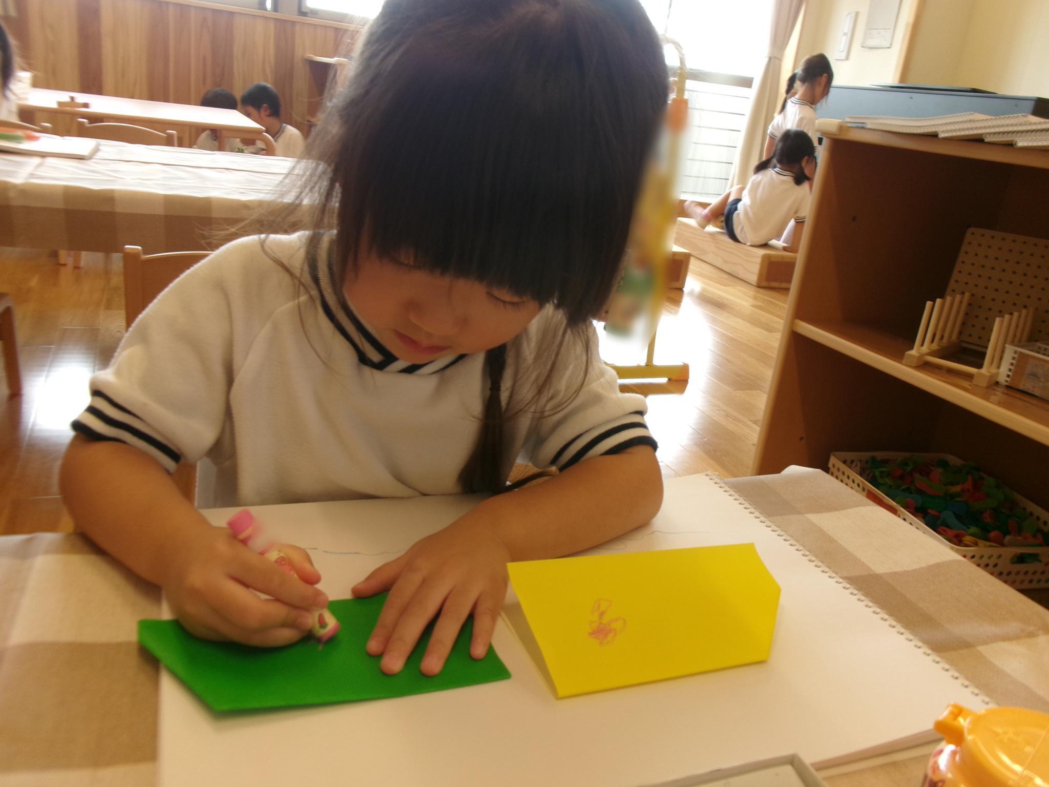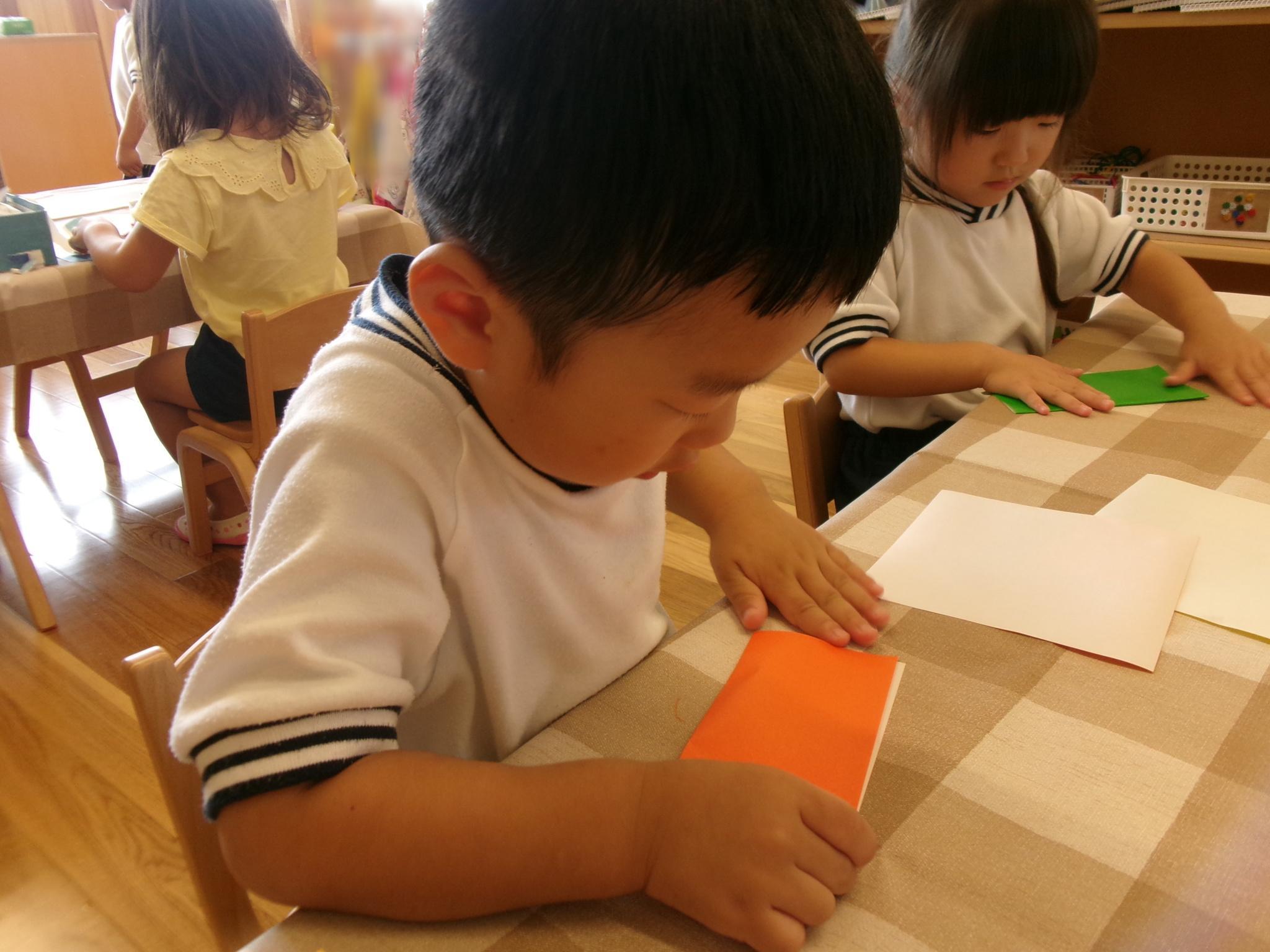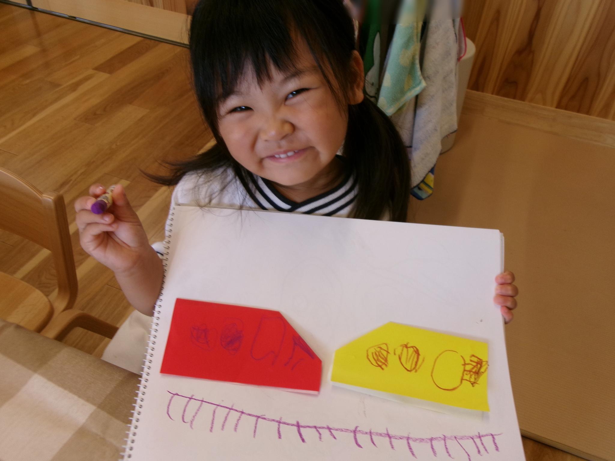 今月の折り紙は『電車』‼「れんけつ~」「ガタンゴトン」などと言いながら上手に折ることができました。