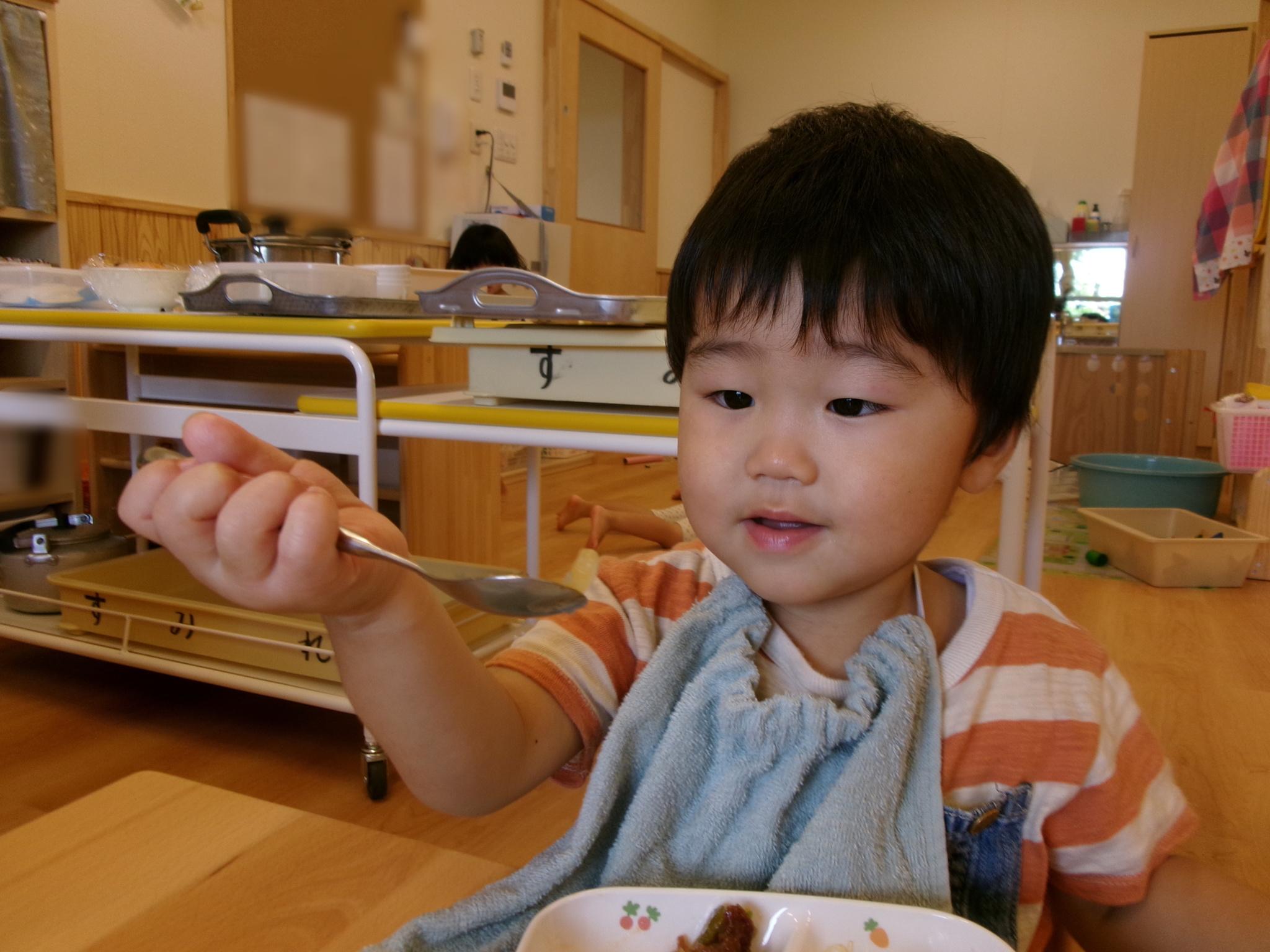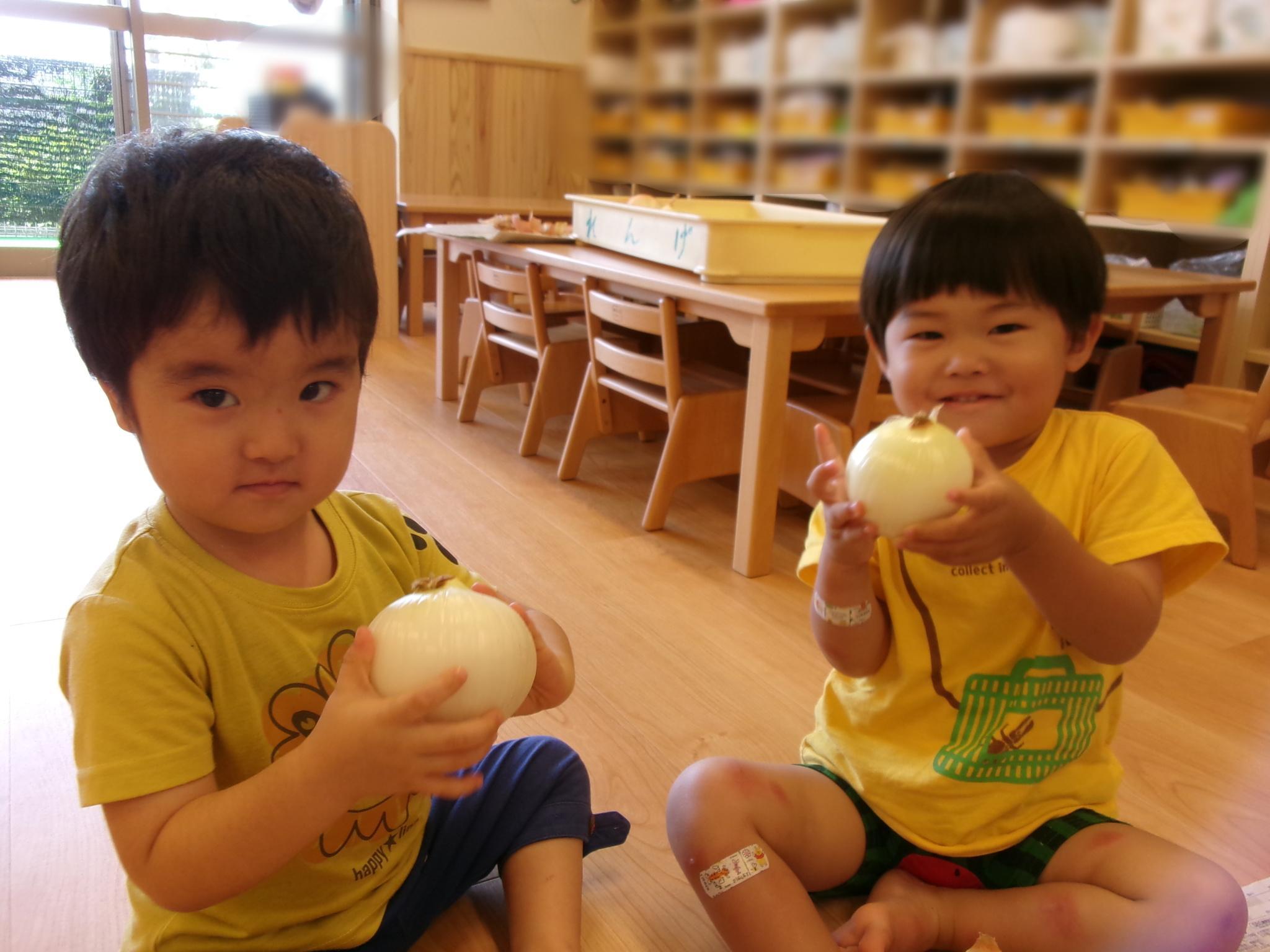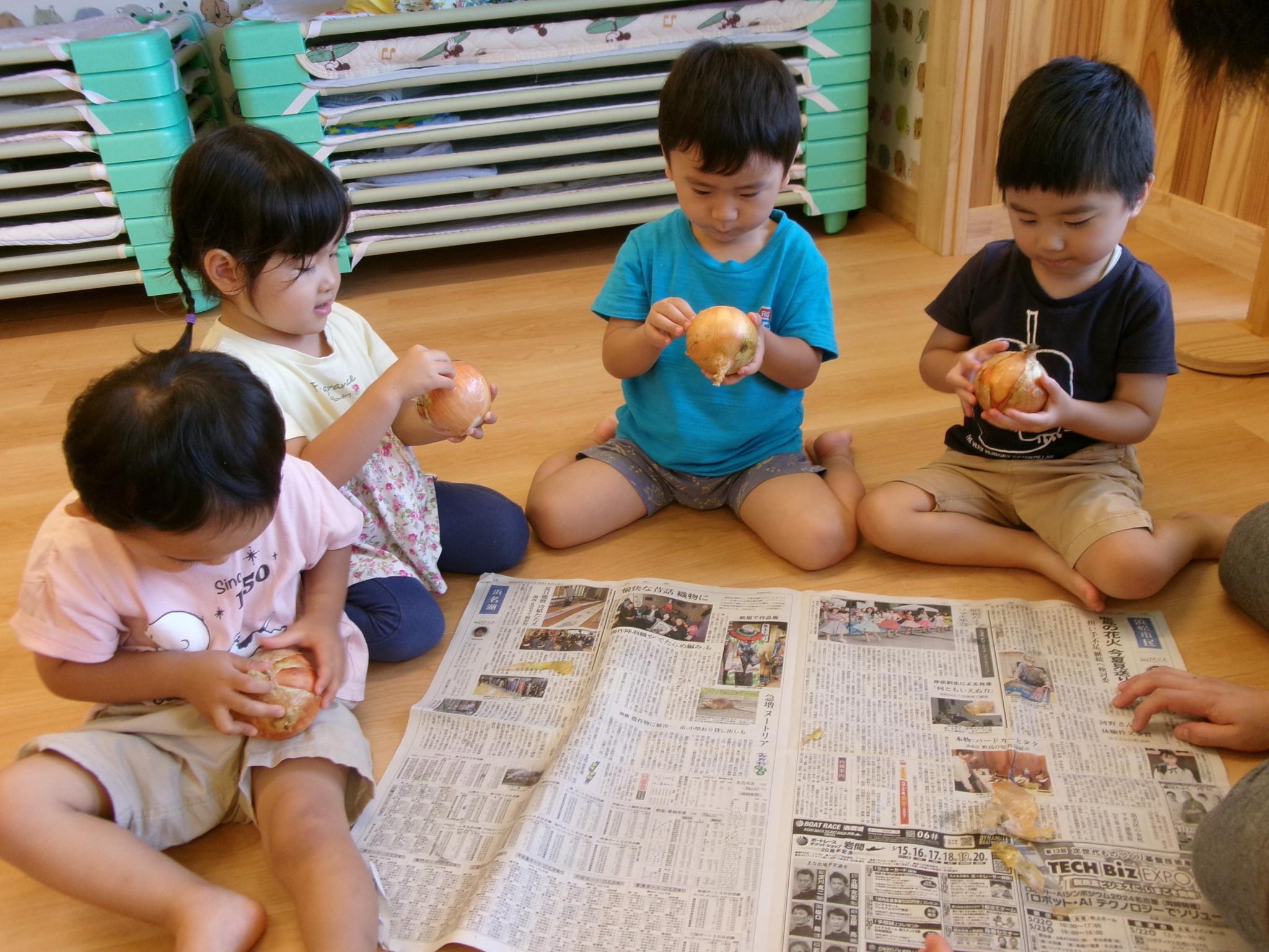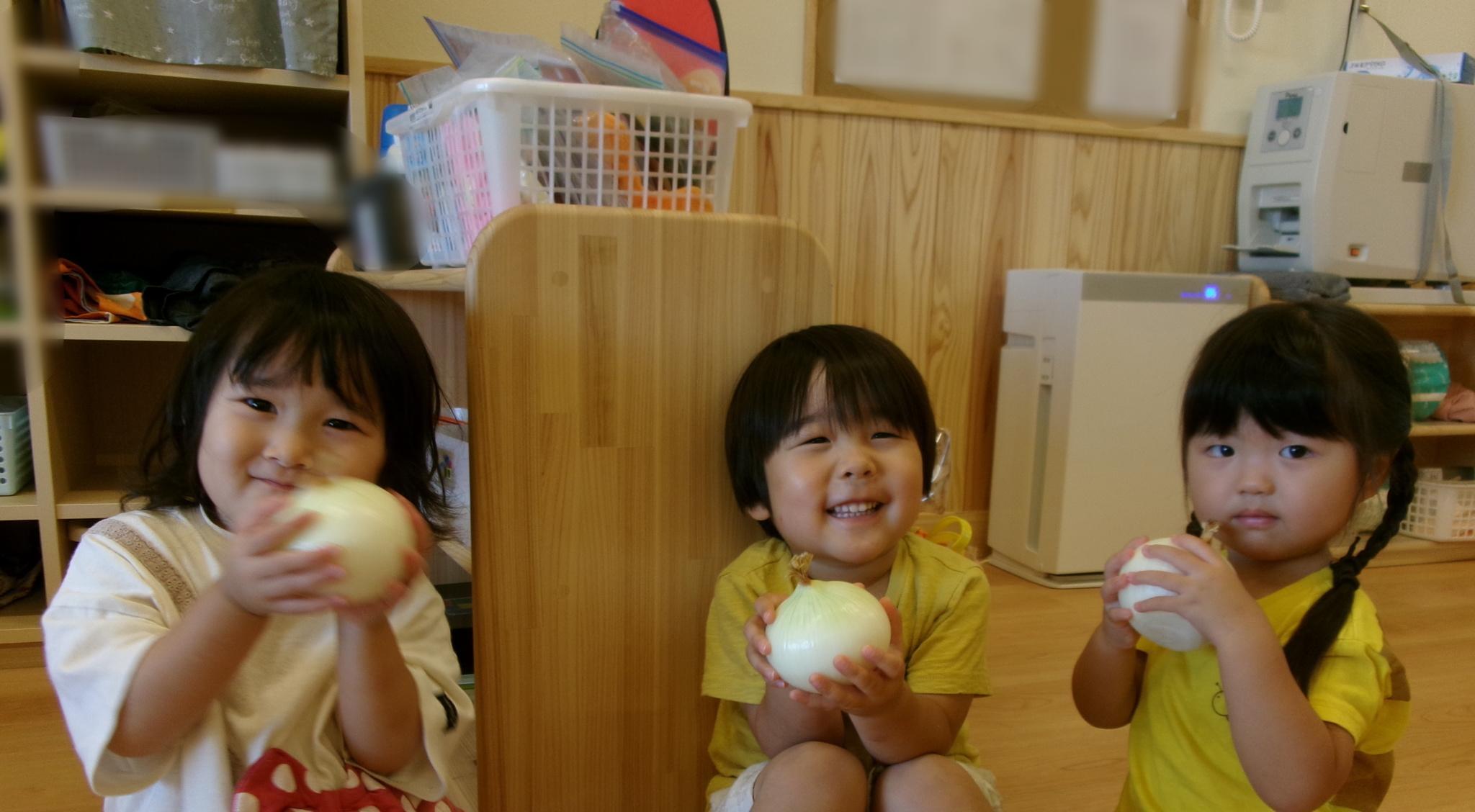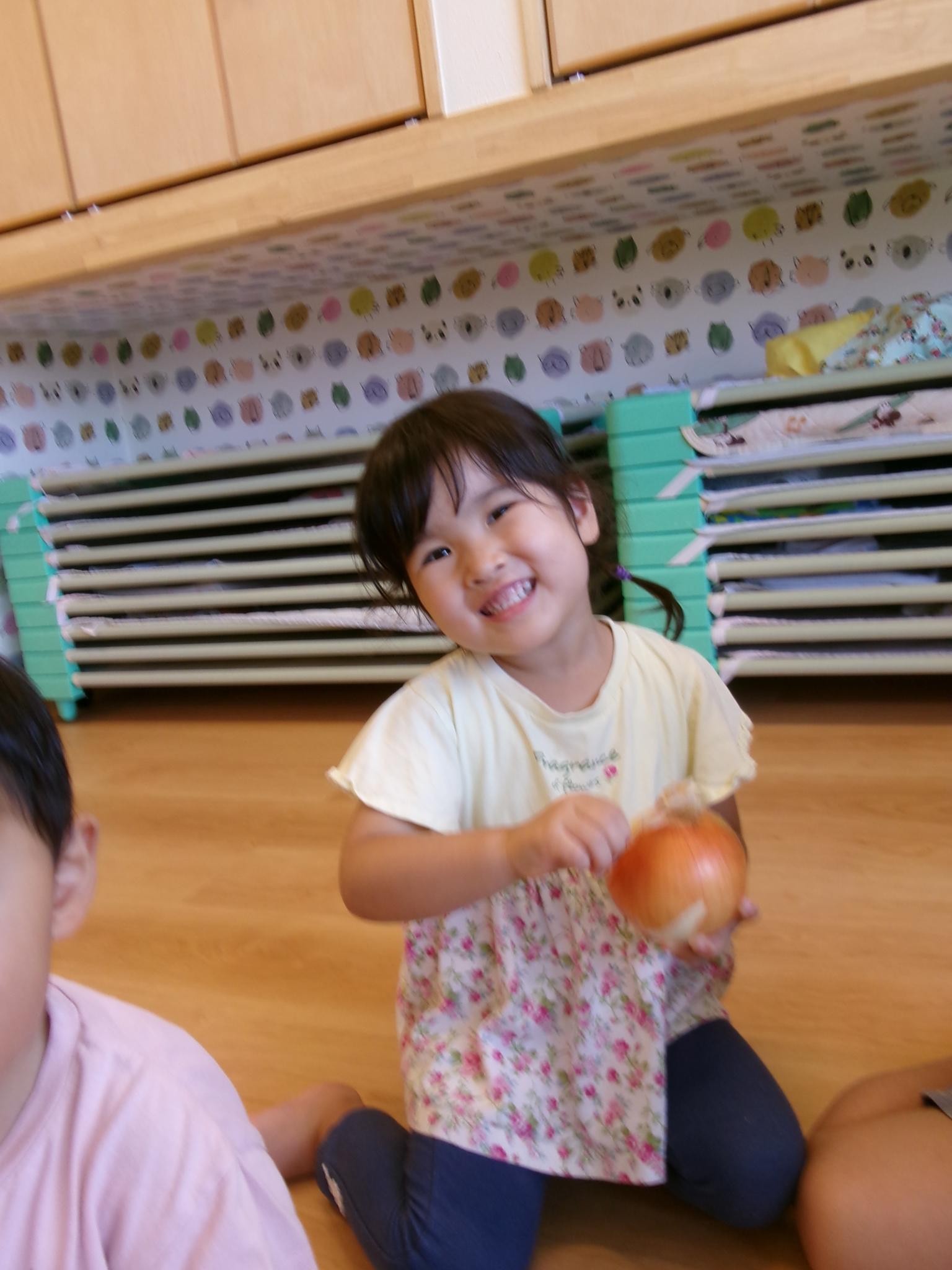 一人ずつ玉ねぎの皮をむきました。「皮をむいて、皮むいて~♪」と歌いながら皮をむきました。皮をむいたら「白いよ~」と皮がむけると嬉しそうな子どもたちでした。今日の給食の酢豚の中に玉ねぎ発見!!「〇〇ちゃんのむいた玉ねぎあった」と喜んで食べていました。