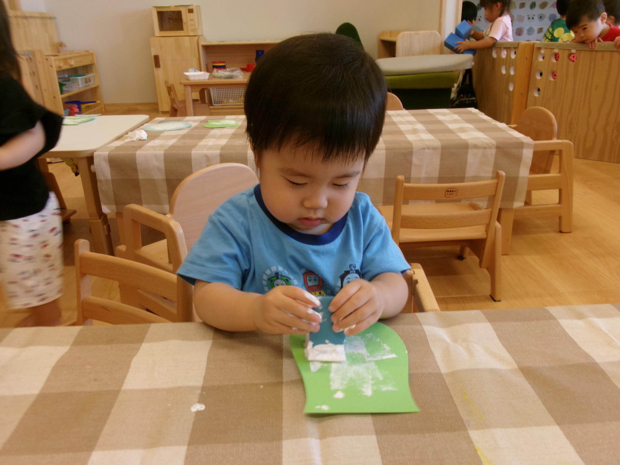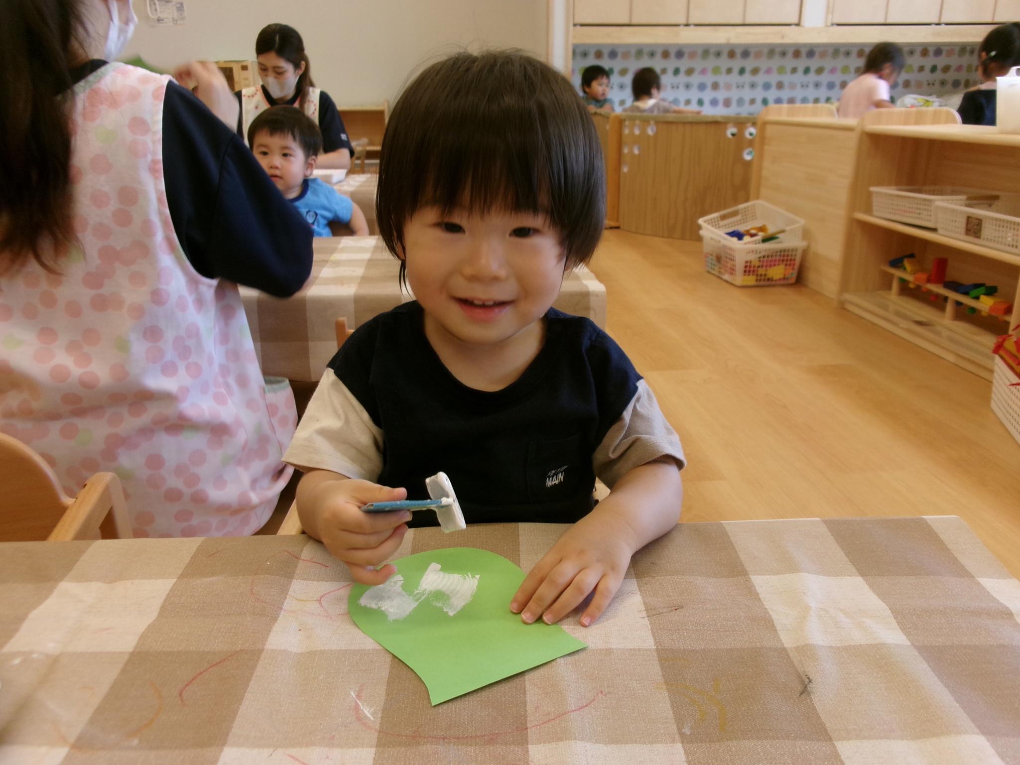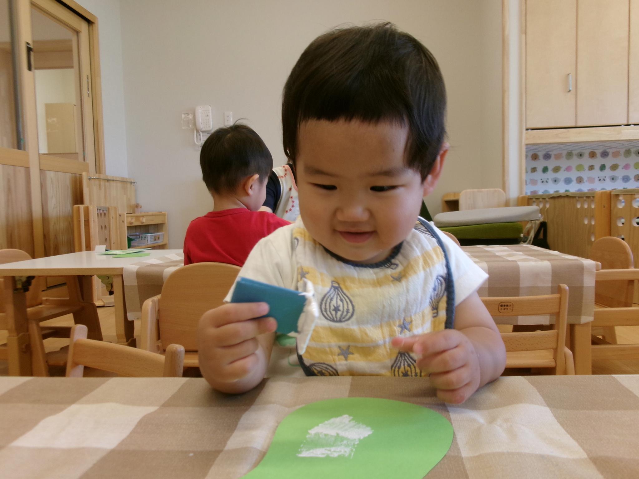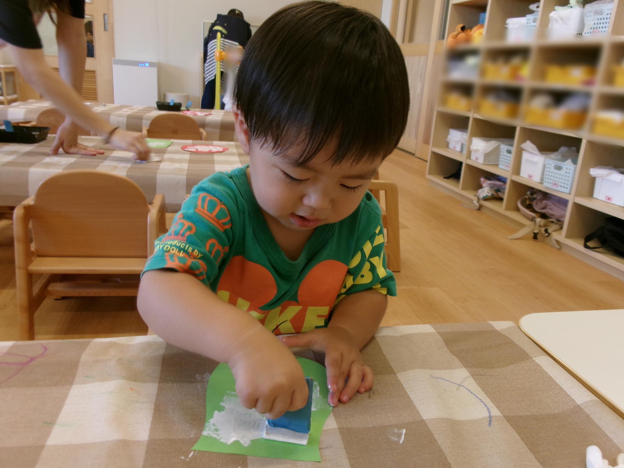 絵の具を使ってペタペタ、スタンプあそびをしました。絵の具を触ってみたり、スタンプをのぞいてみたり…興味いっぱいの様子でした!
