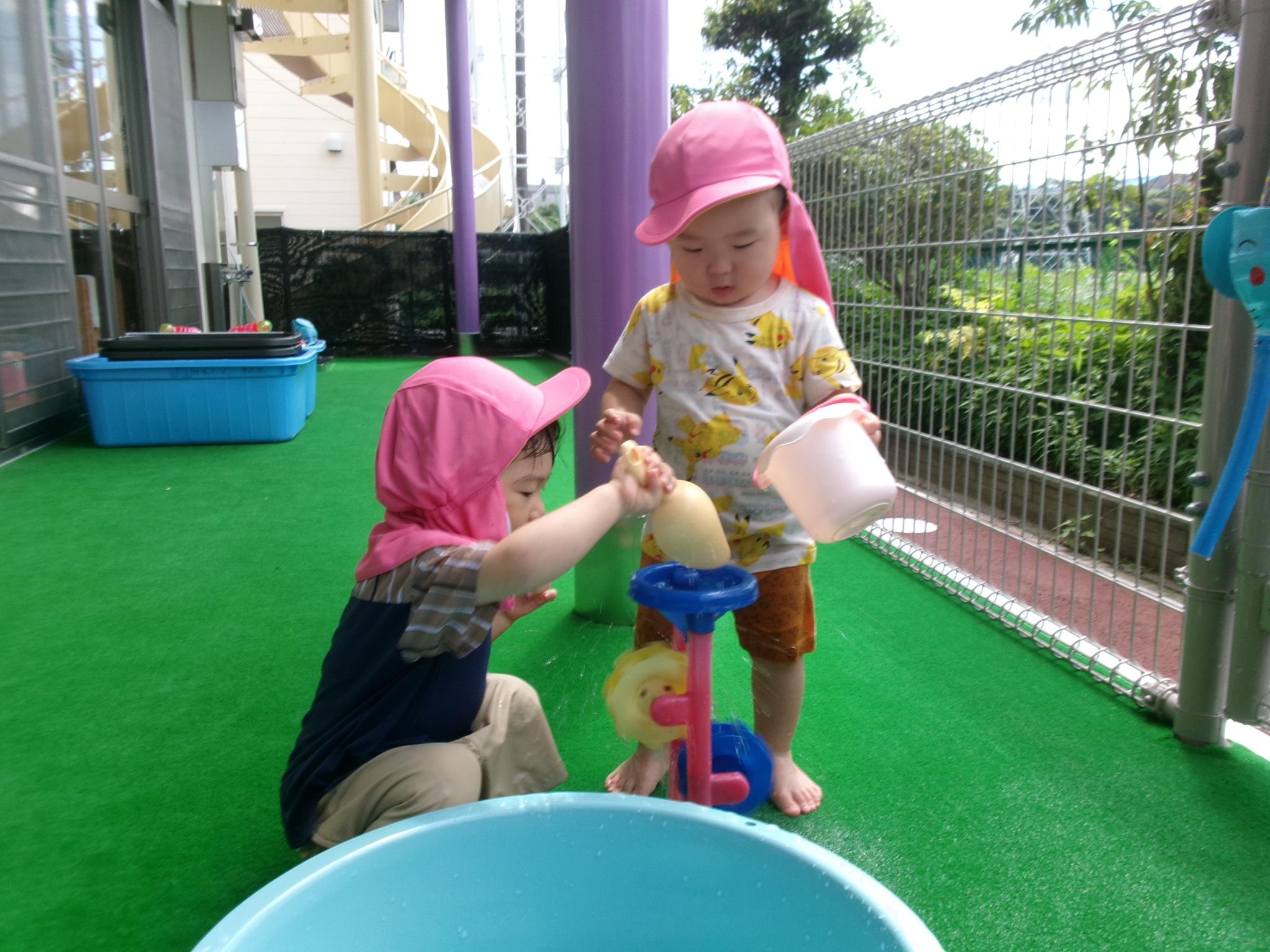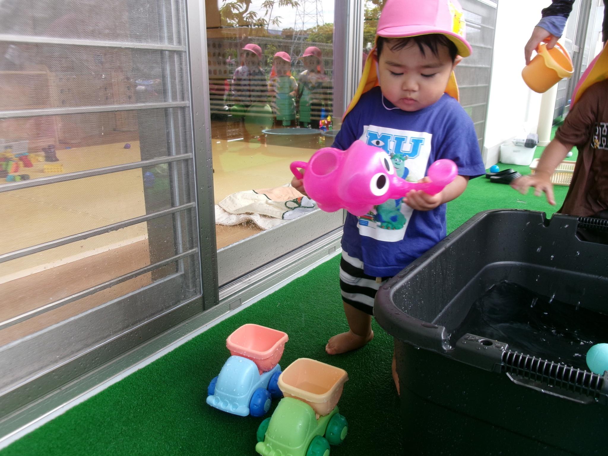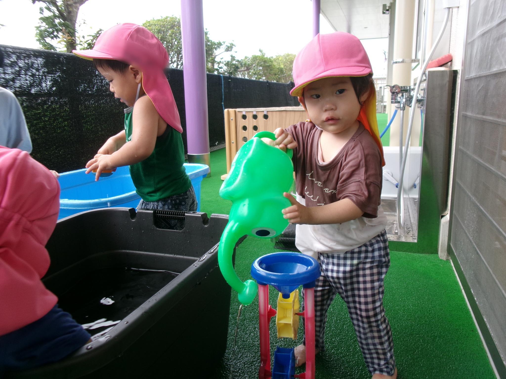 お水をすくったり、流したり…!水の感触に慣れ、とっても気持ちよさそうに遊んでいます。