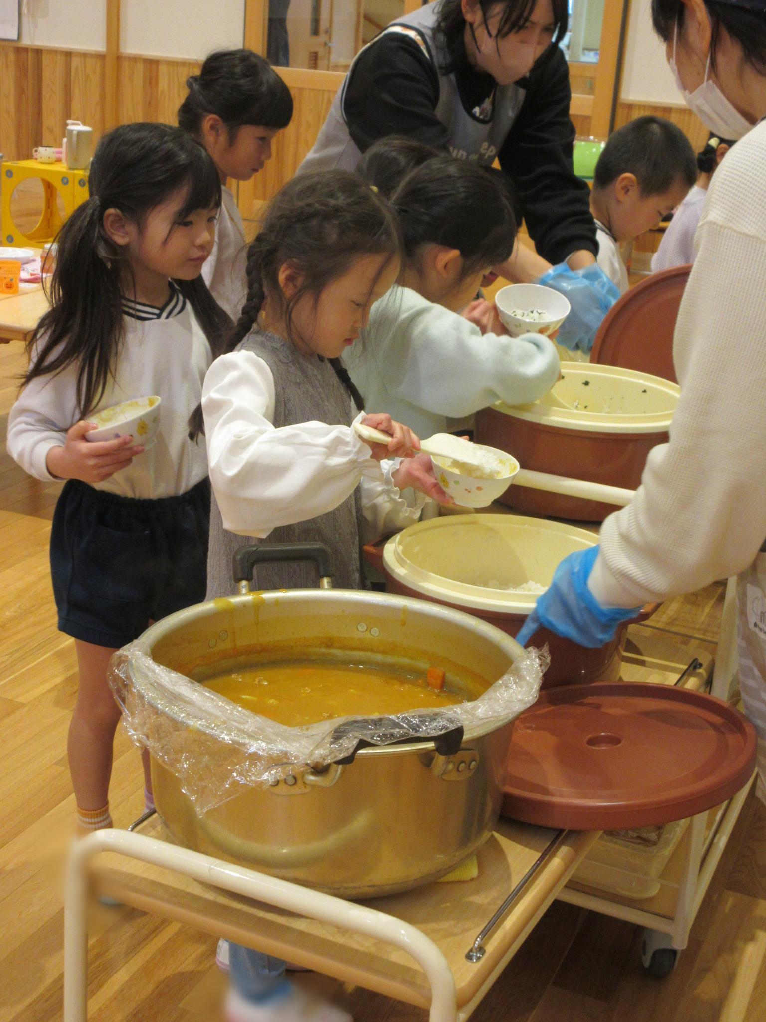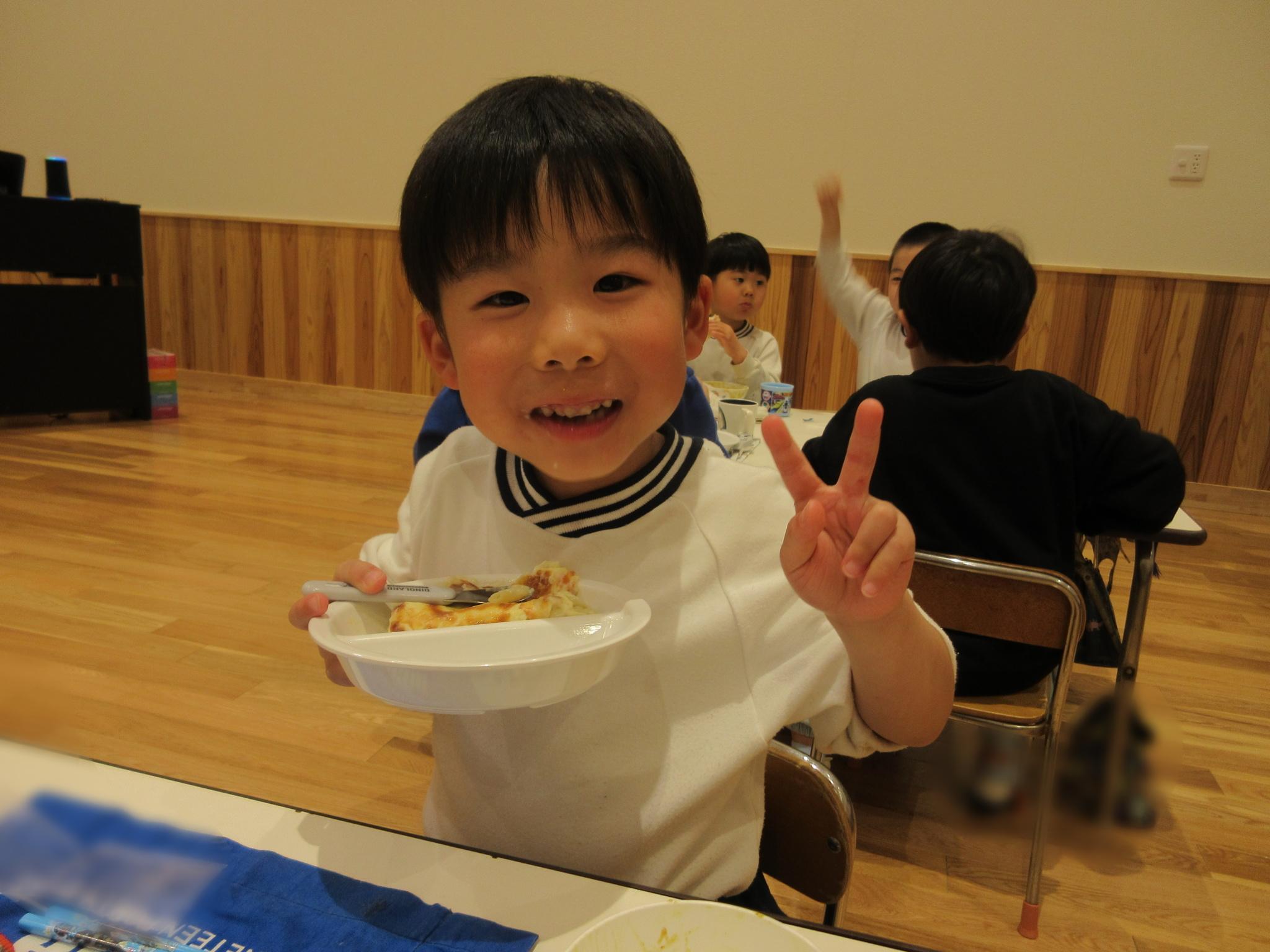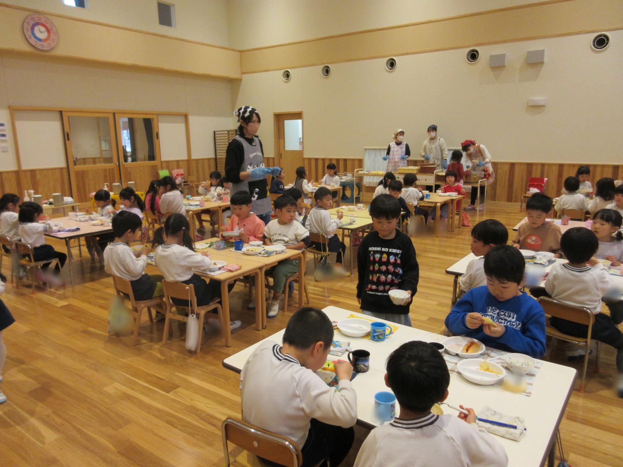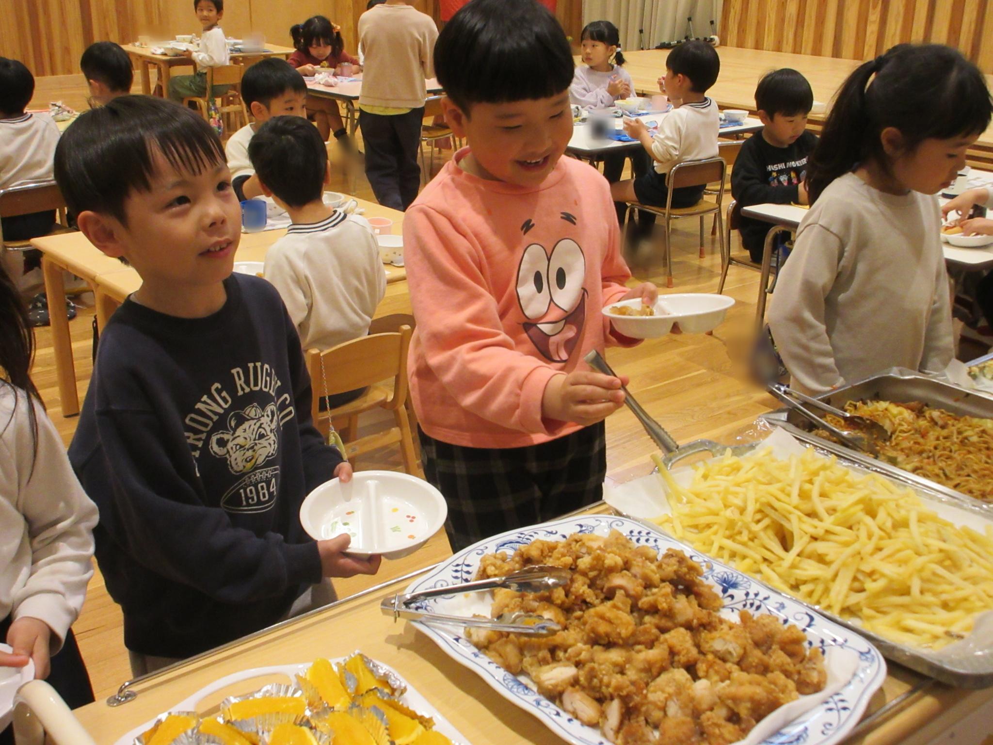 ホールでお別れバイキングをして楽しく食事をしました。「何回でもおかわりいいの?」と目をキラキラさせてたくさん食べていました!ごちそうさまでした