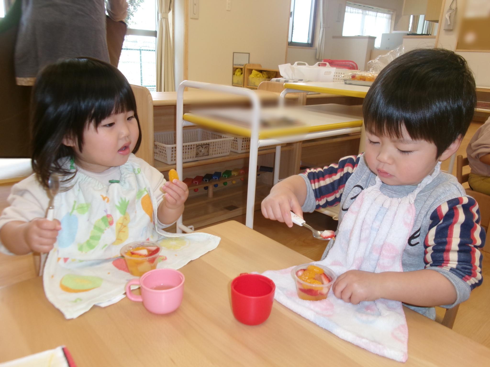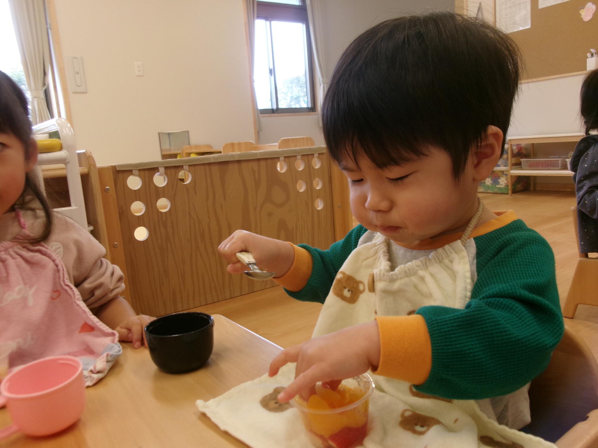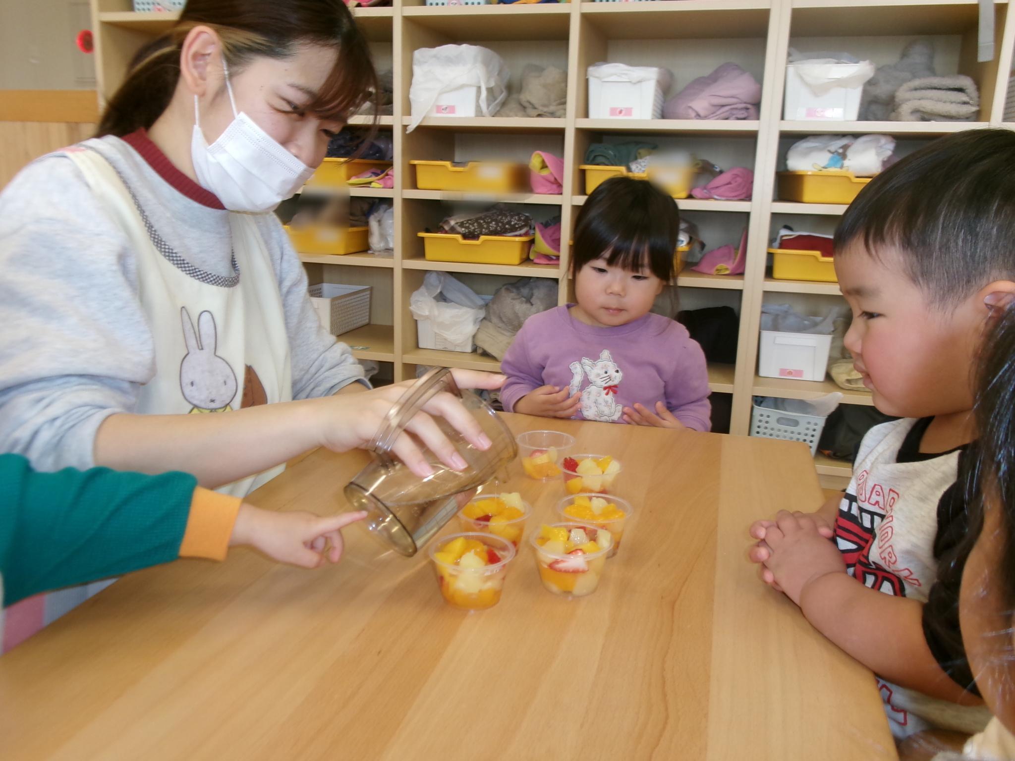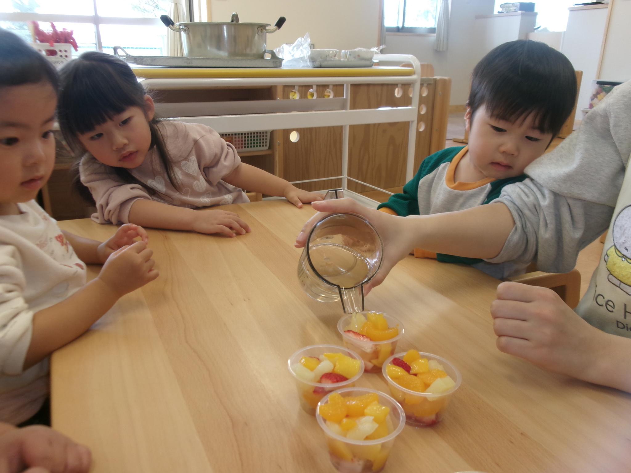 美味しそうなフルーツを見て、嬉しそうな子どもたち。好きなフルーツをスプーンを使って上手にカップに入れていきました。『魔法の水』をいれ午後のおやつを楽しみに待ち、できたゼリーを「おいしい!」と満面の笑みで食べました♪