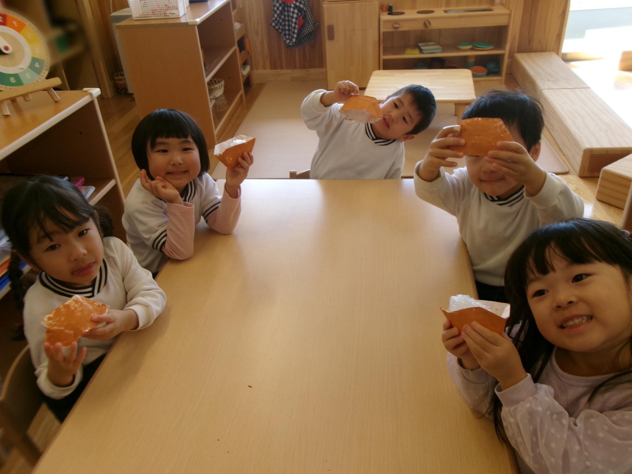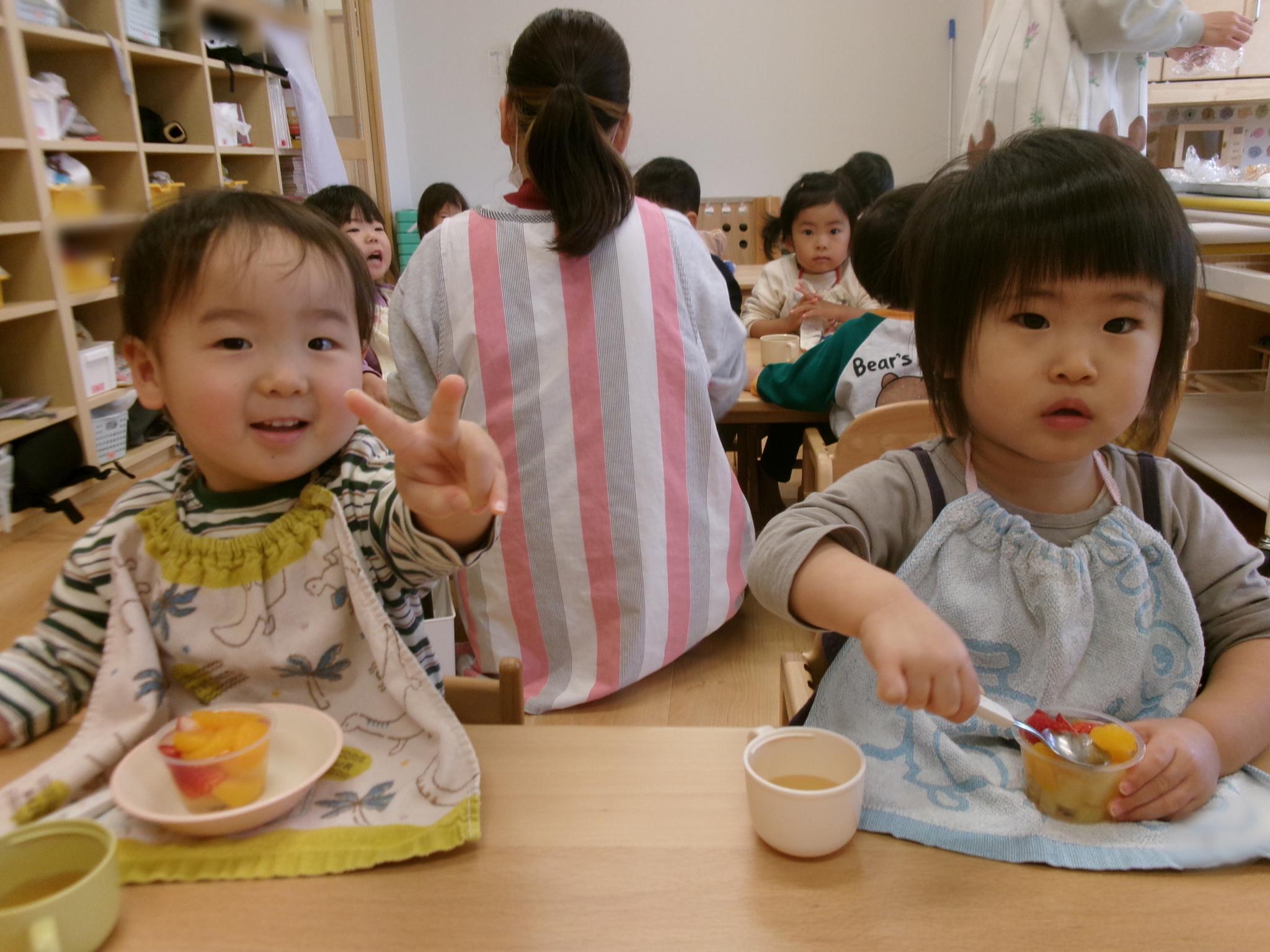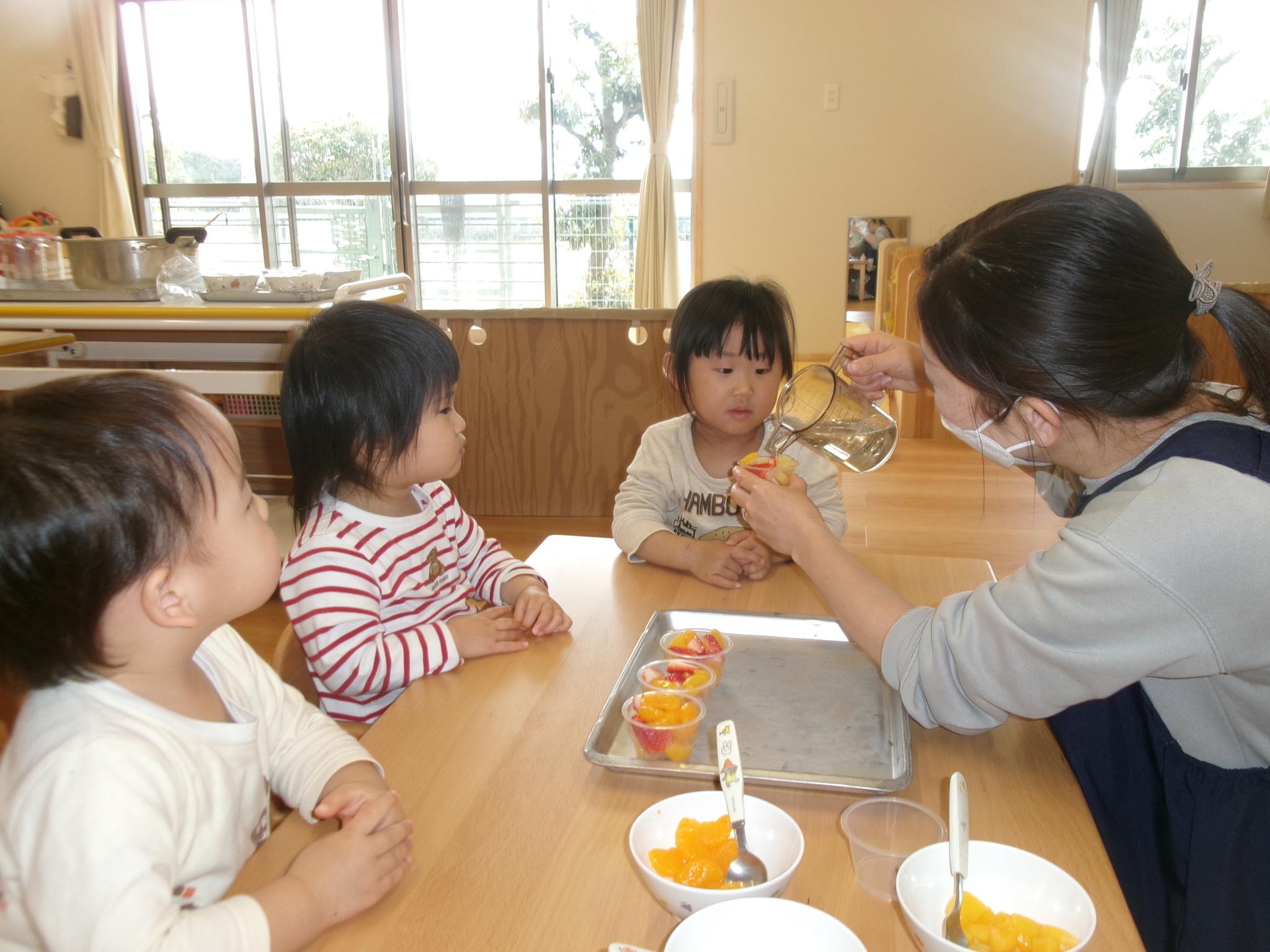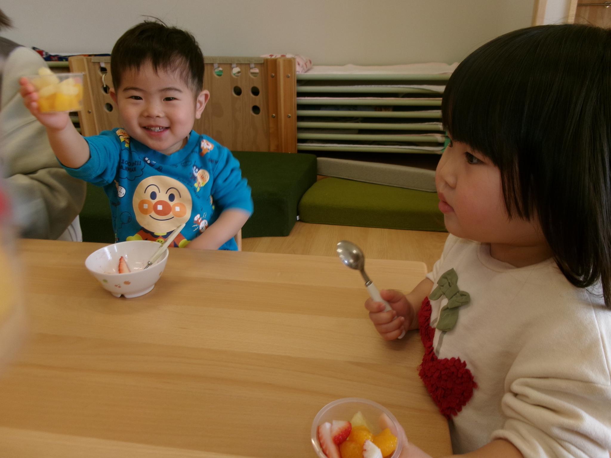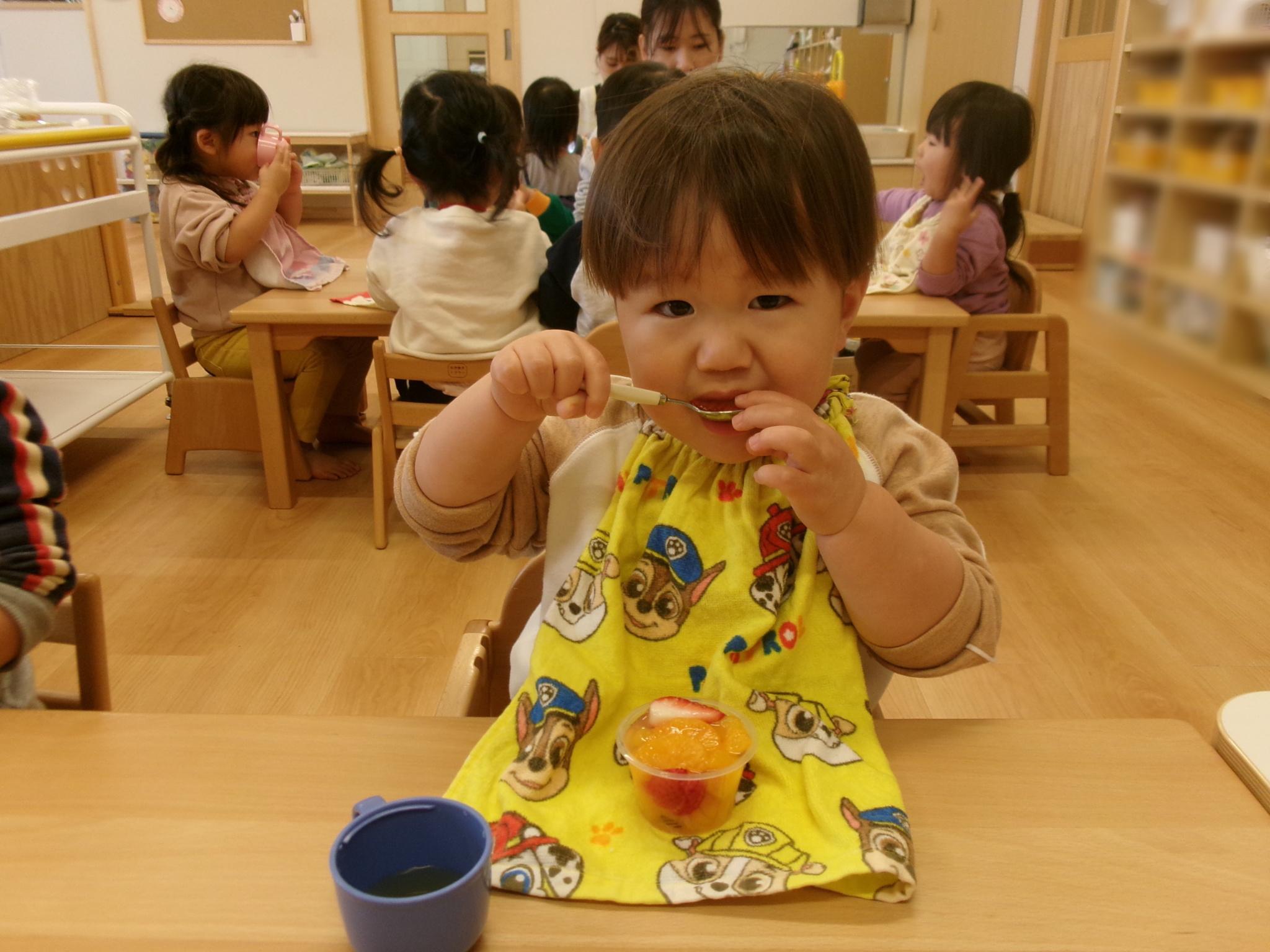 美味しそうなフルーツを見て、嬉しそうな子どもたち。好きなフルーツをスプーンを使って上手にカップに入れていきました。『魔法の水』をいれ午後のおやつを楽しみに待ち、できたゼリーを「おいしい!」と満面の笑みで食べました♪