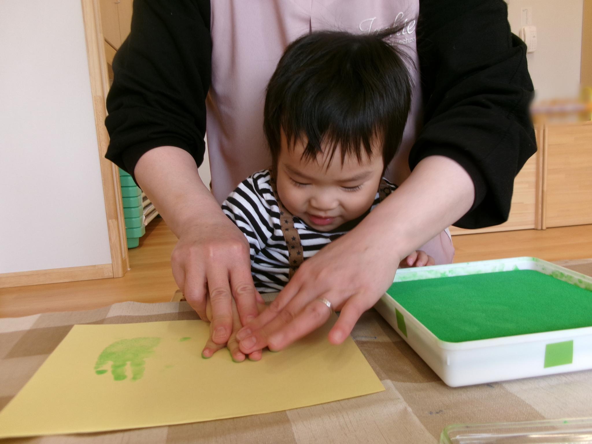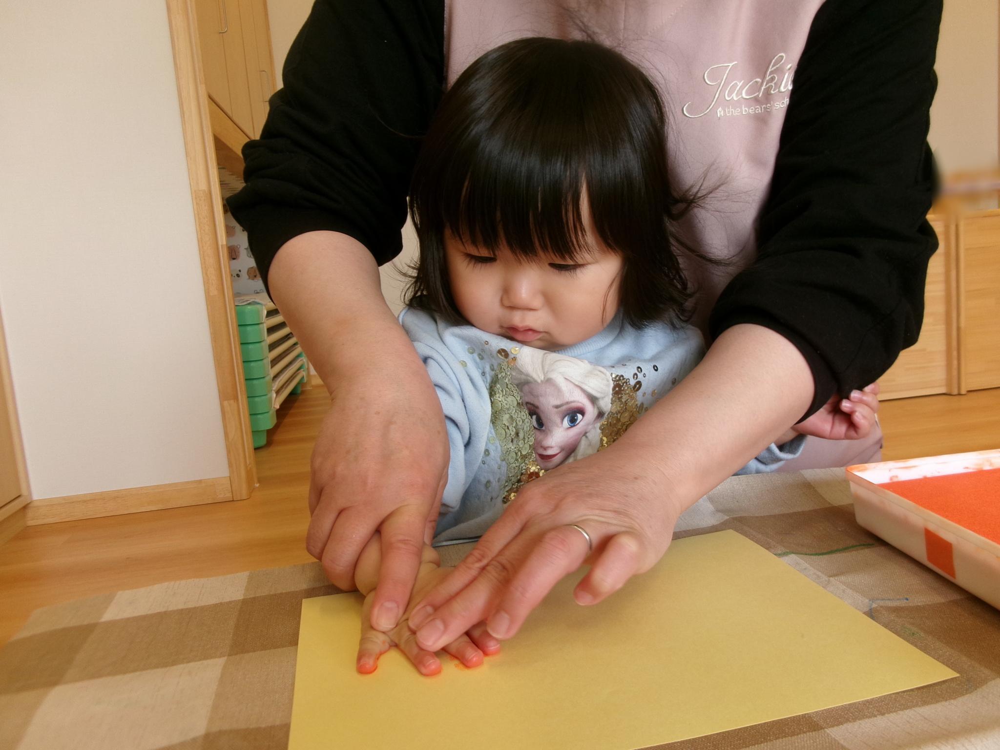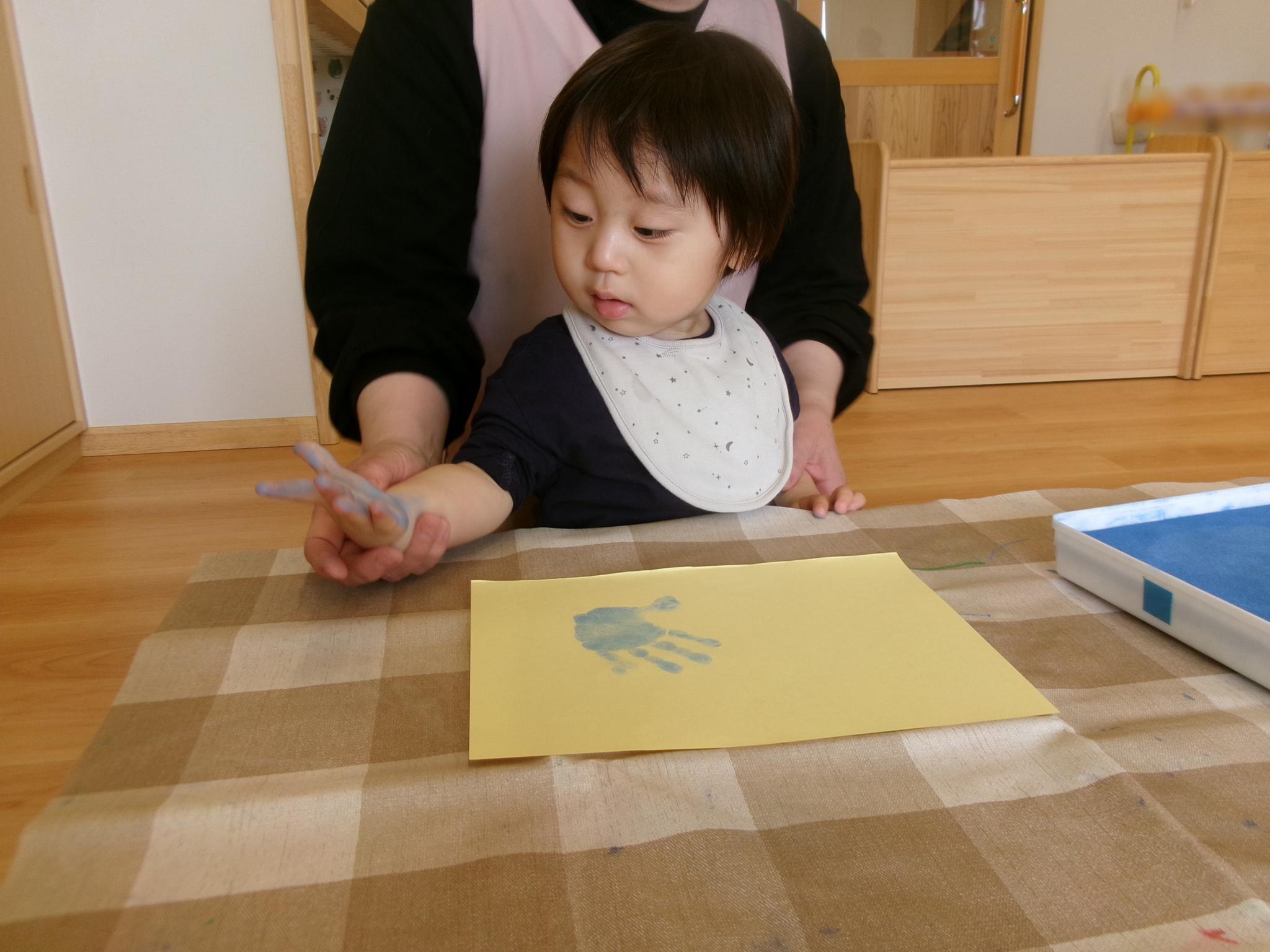 スタンプ台の感触に少し戸惑っていた子どもたちでしたが、手形が付くと目を丸くしびっくりしていました!
