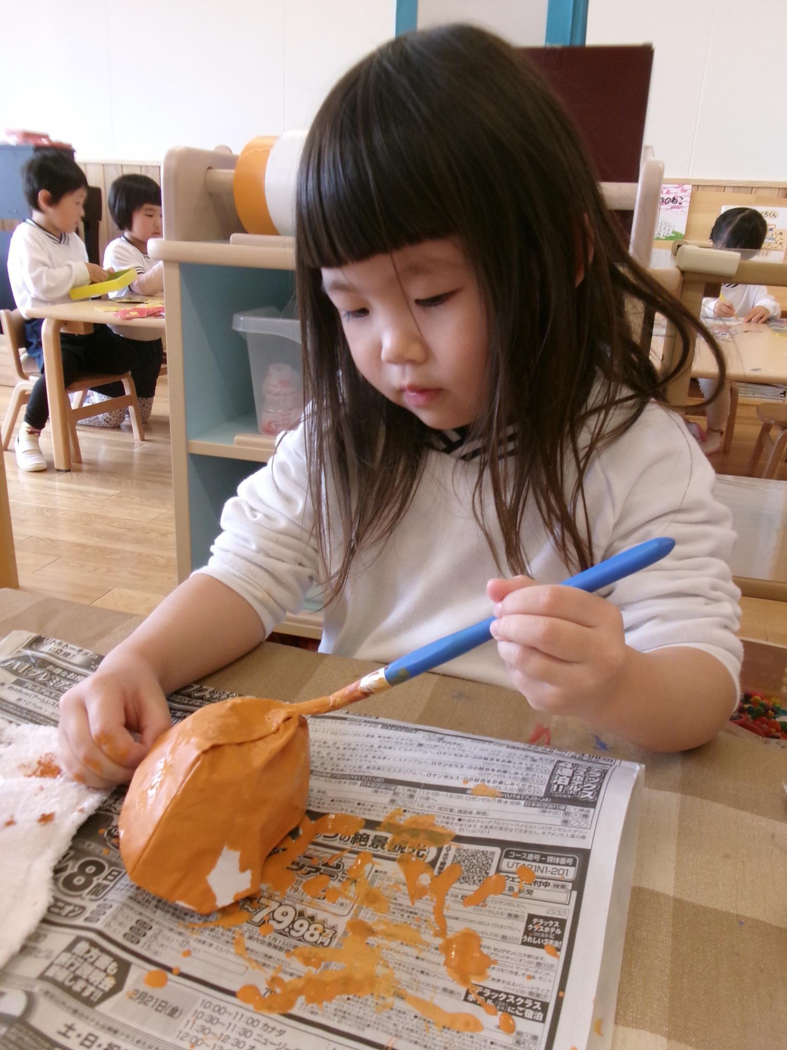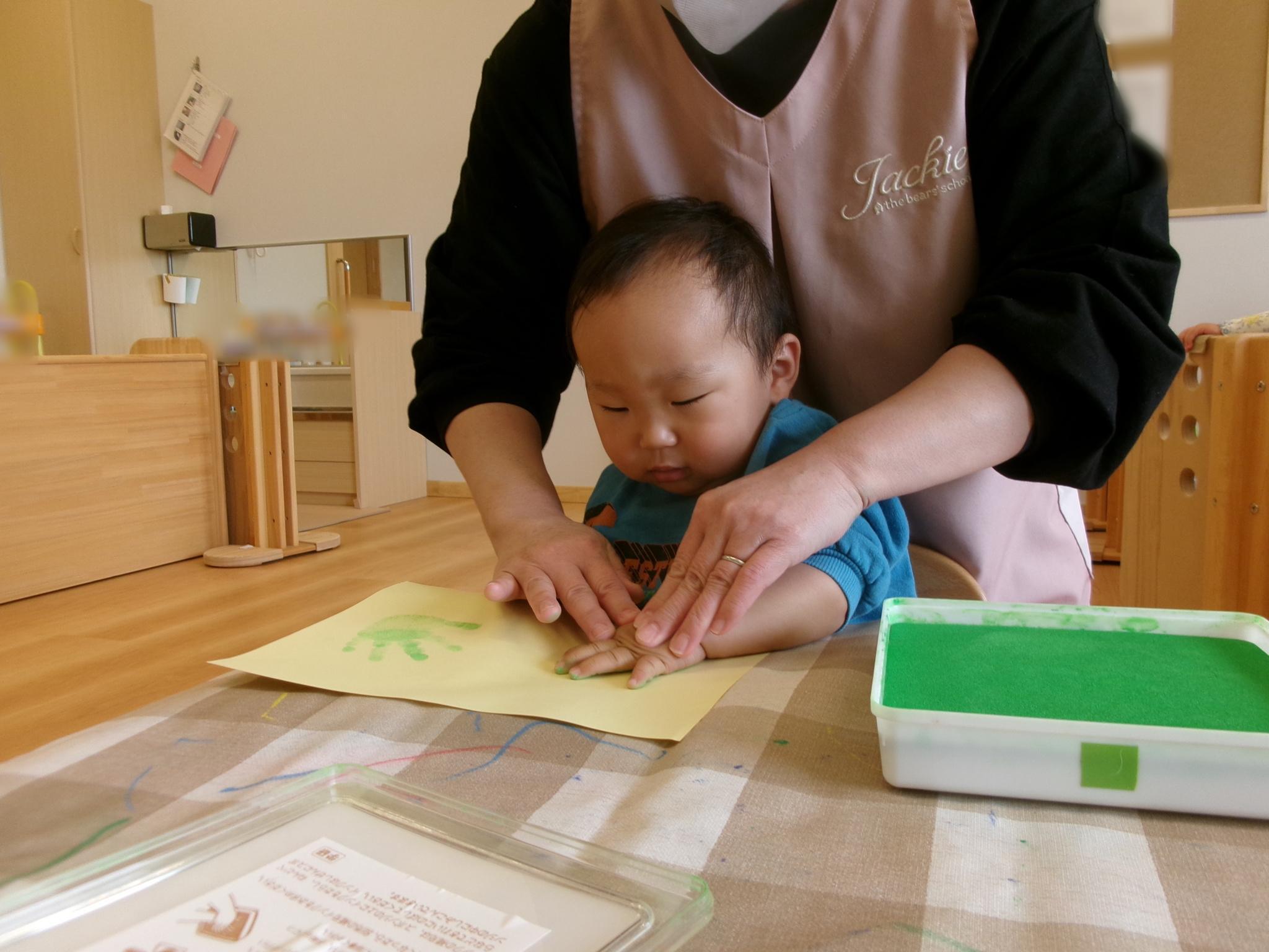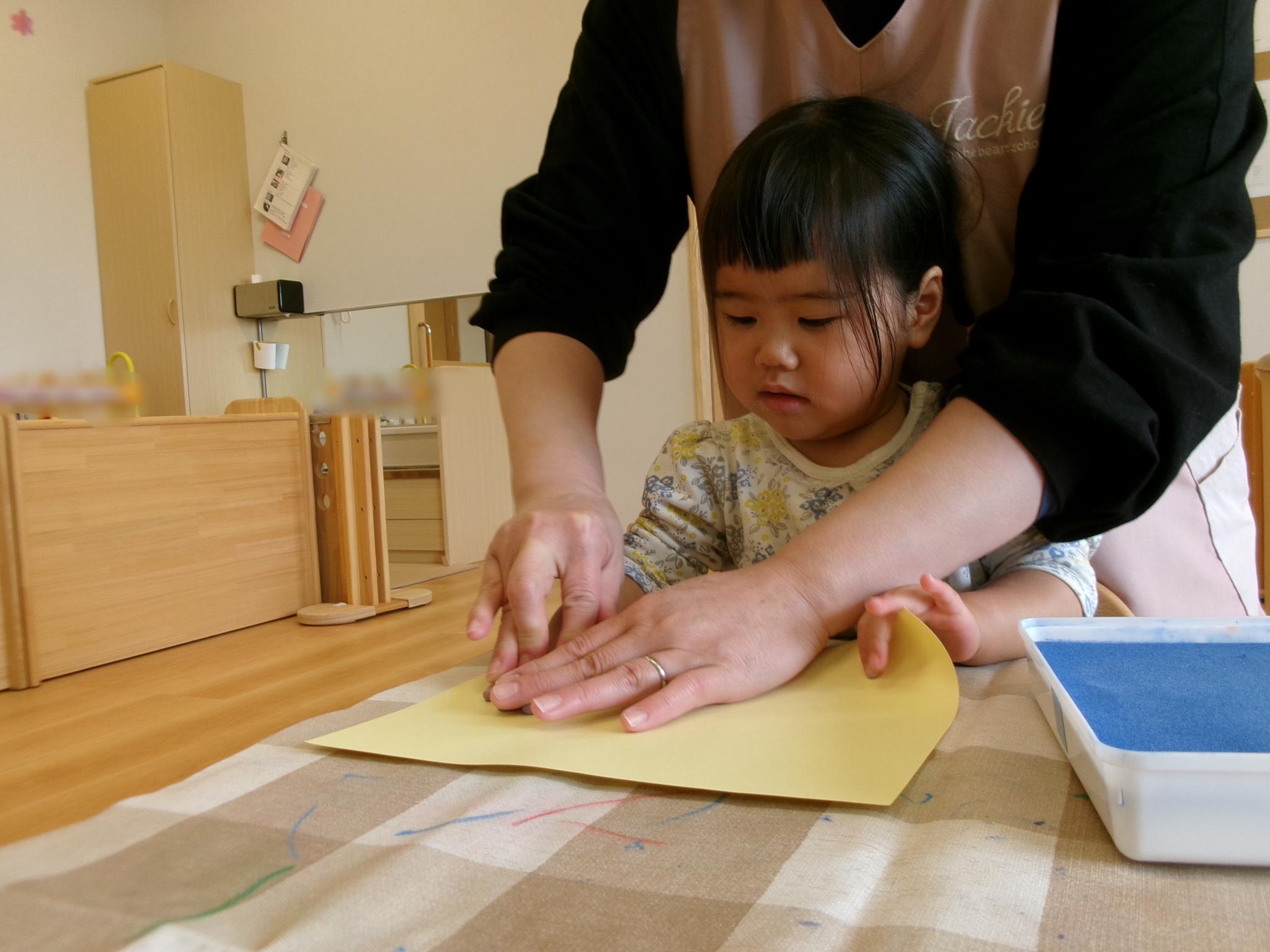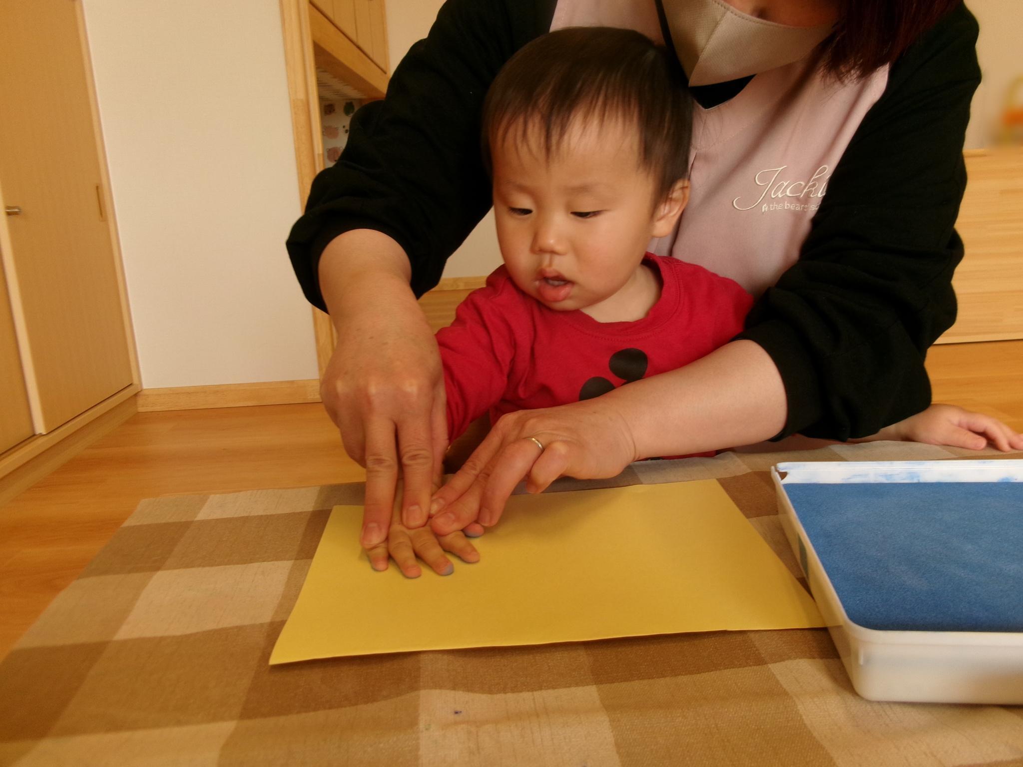 スタンプ台の感触に少し戸惑っていた子どもたちでしたが、手形が付くと目を丸くしびっくりしていました!