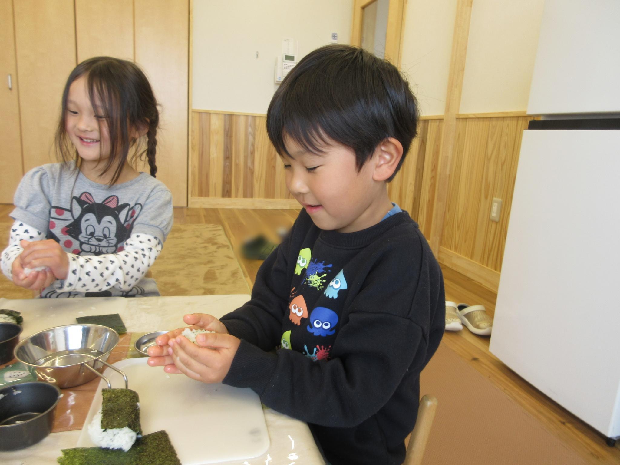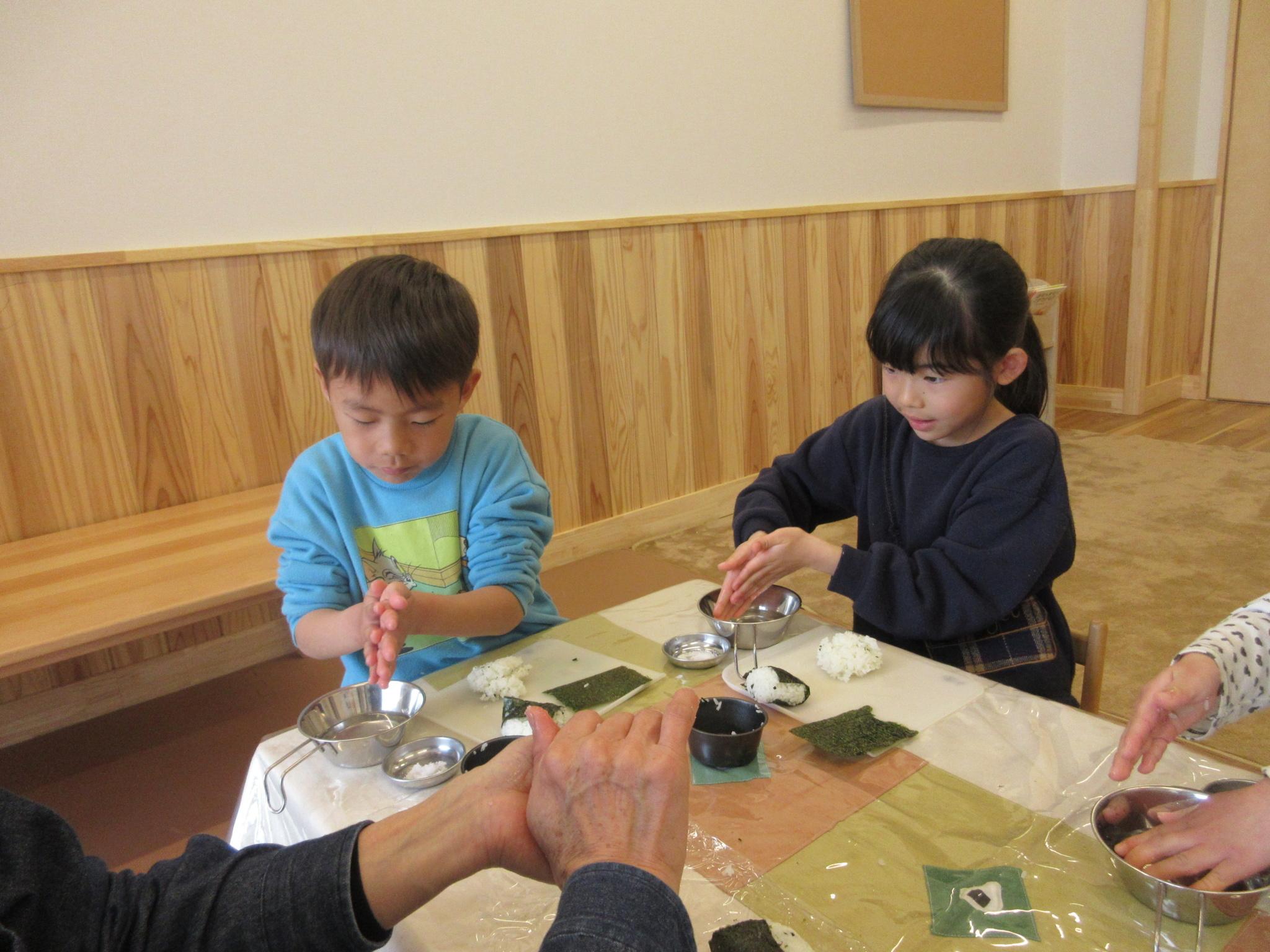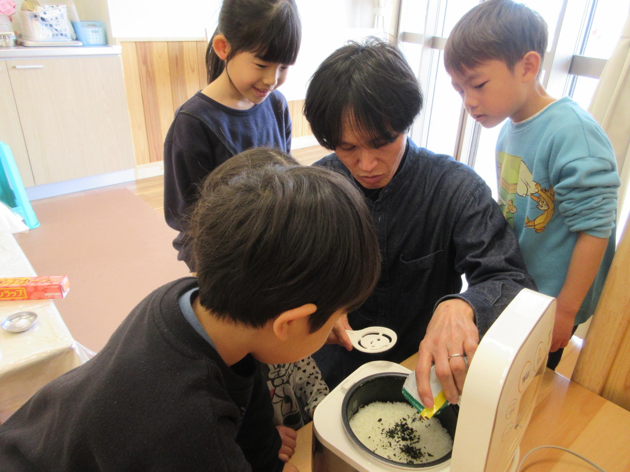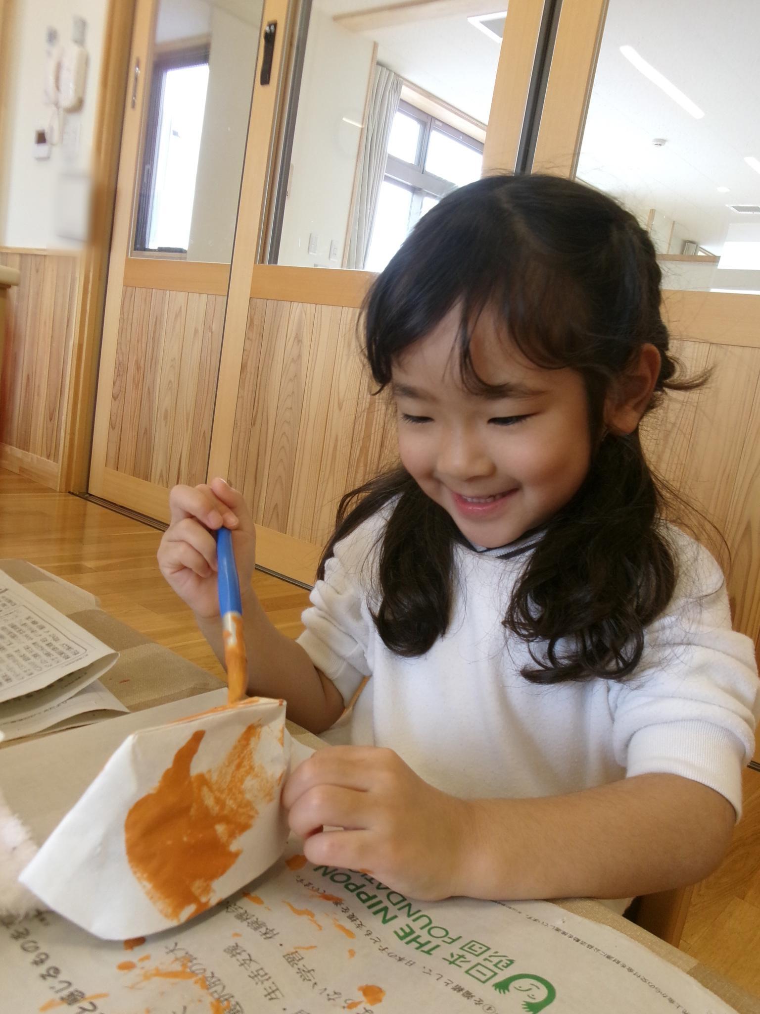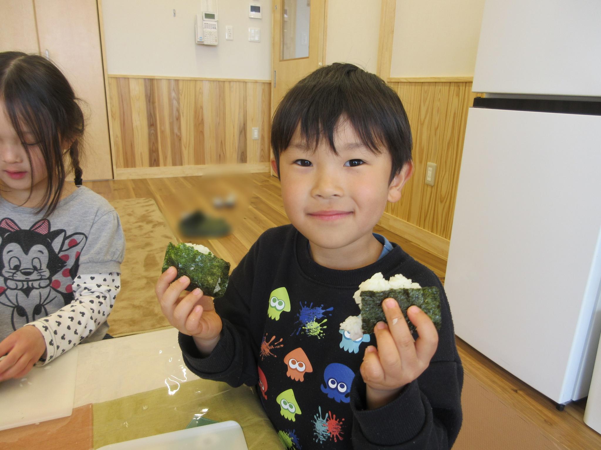 油揚げ(コーヒーフィルター)にごはん(お花紙)をつめたら完成!!「おいしそう」と大喜びの子どもたちでした。