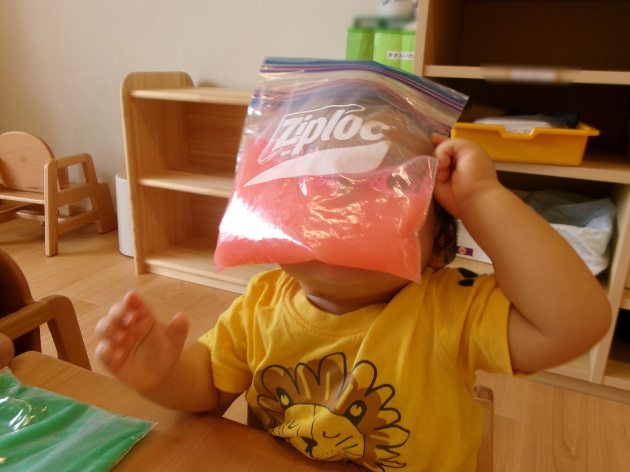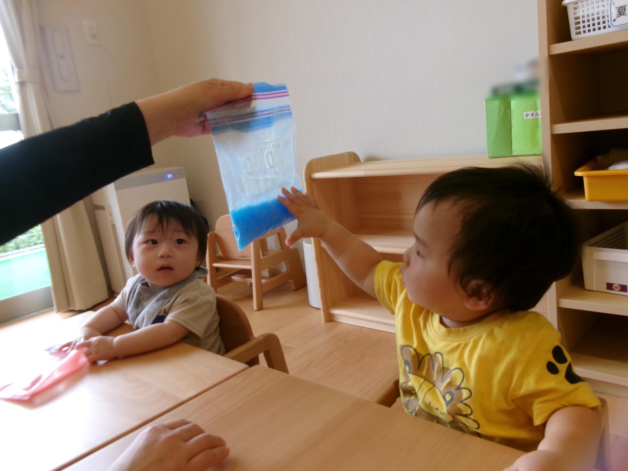 ジップロックに入った色水を触って遊びました。顔を近づけたり、袋に入った水の不思議な感触を楽しみました!ひんやり冷たくて気持ちよさそうでした。