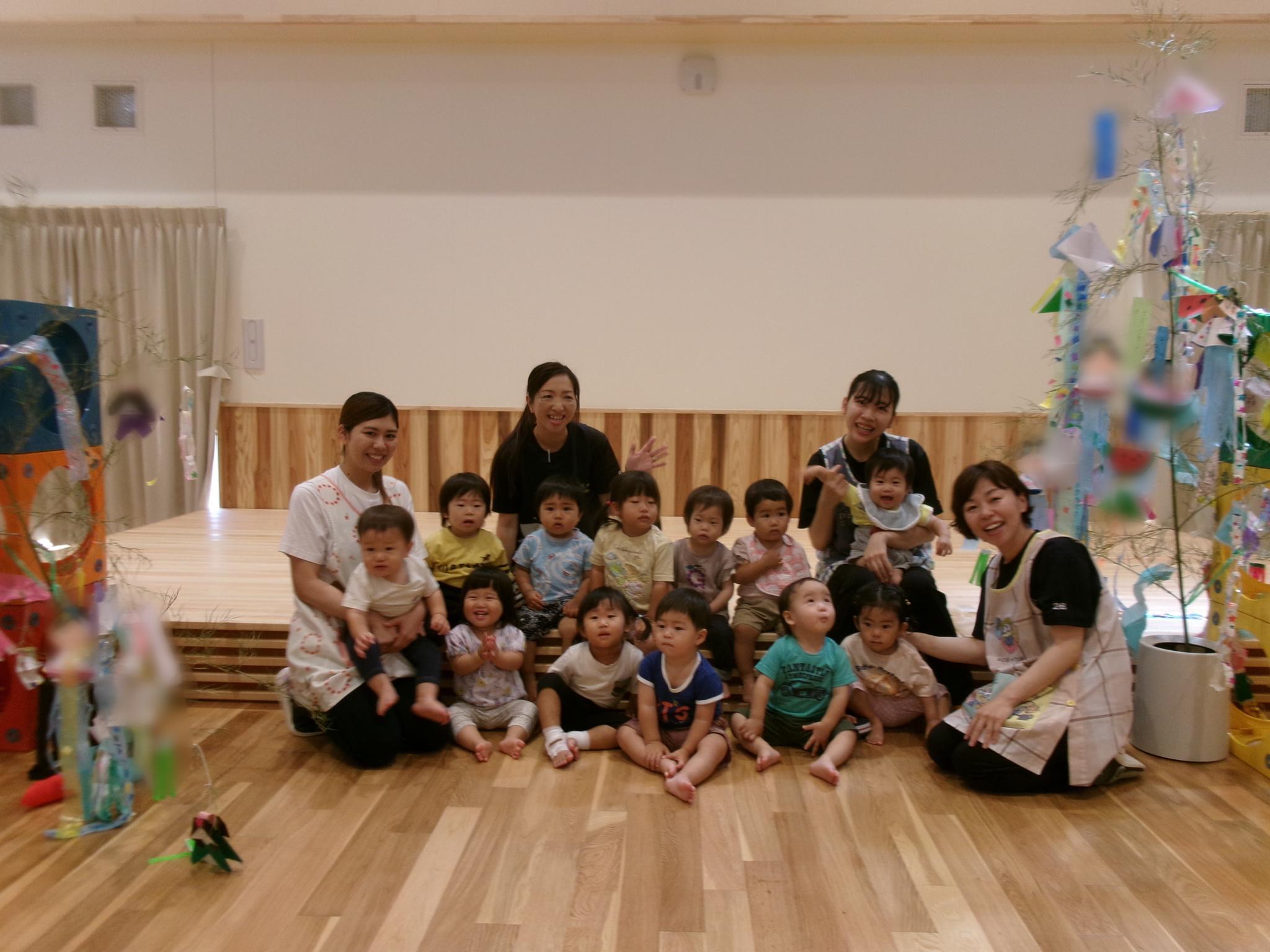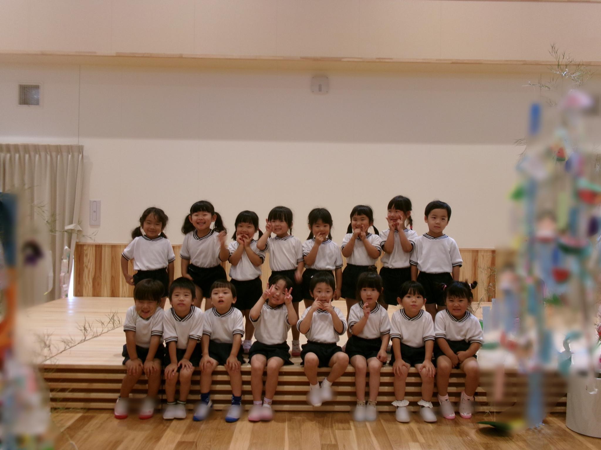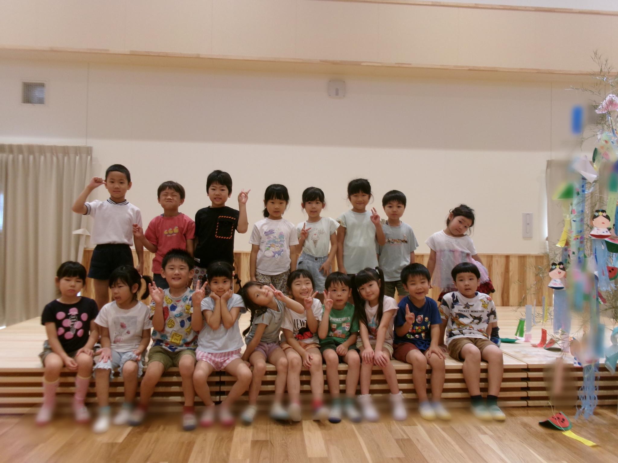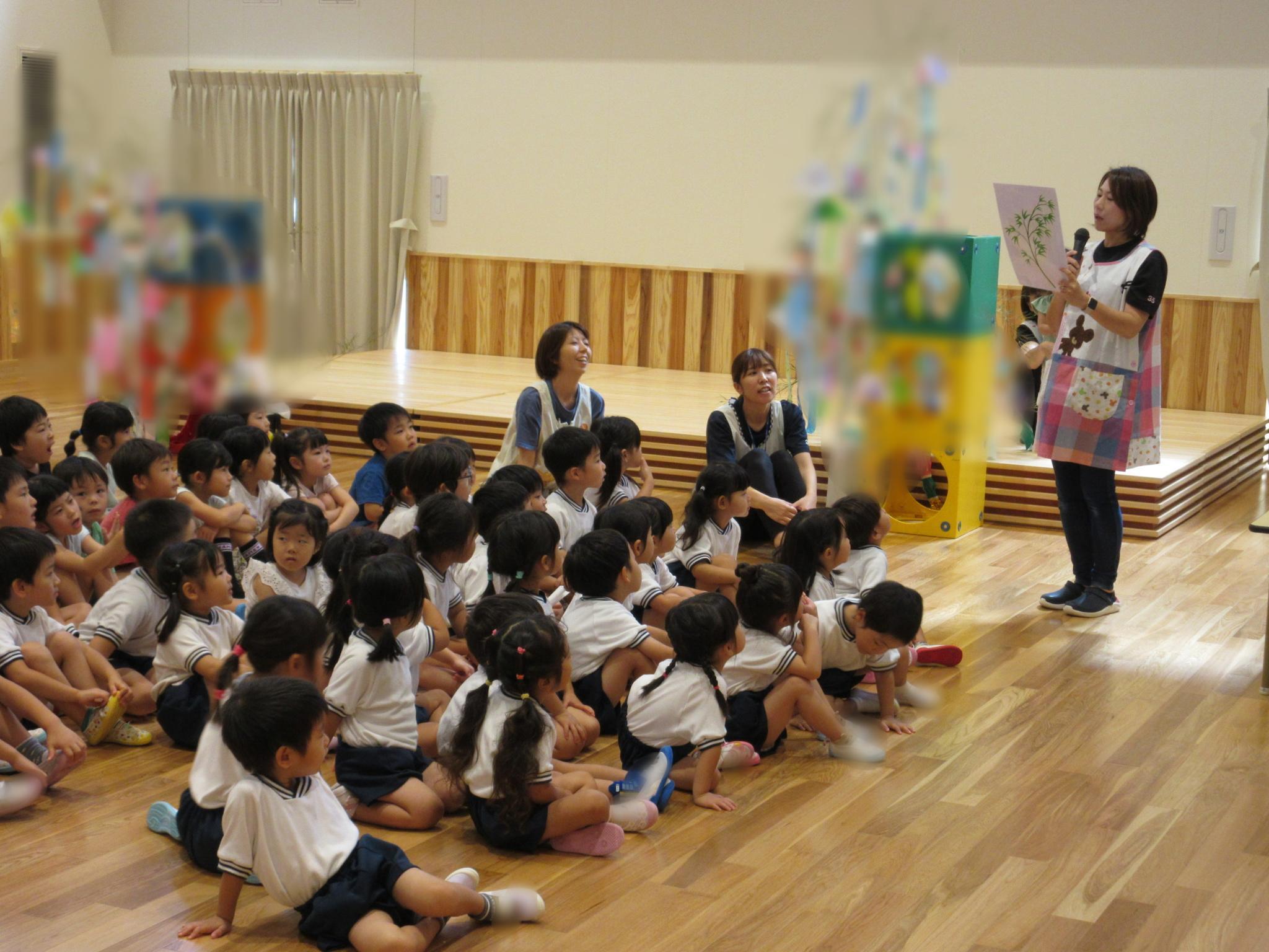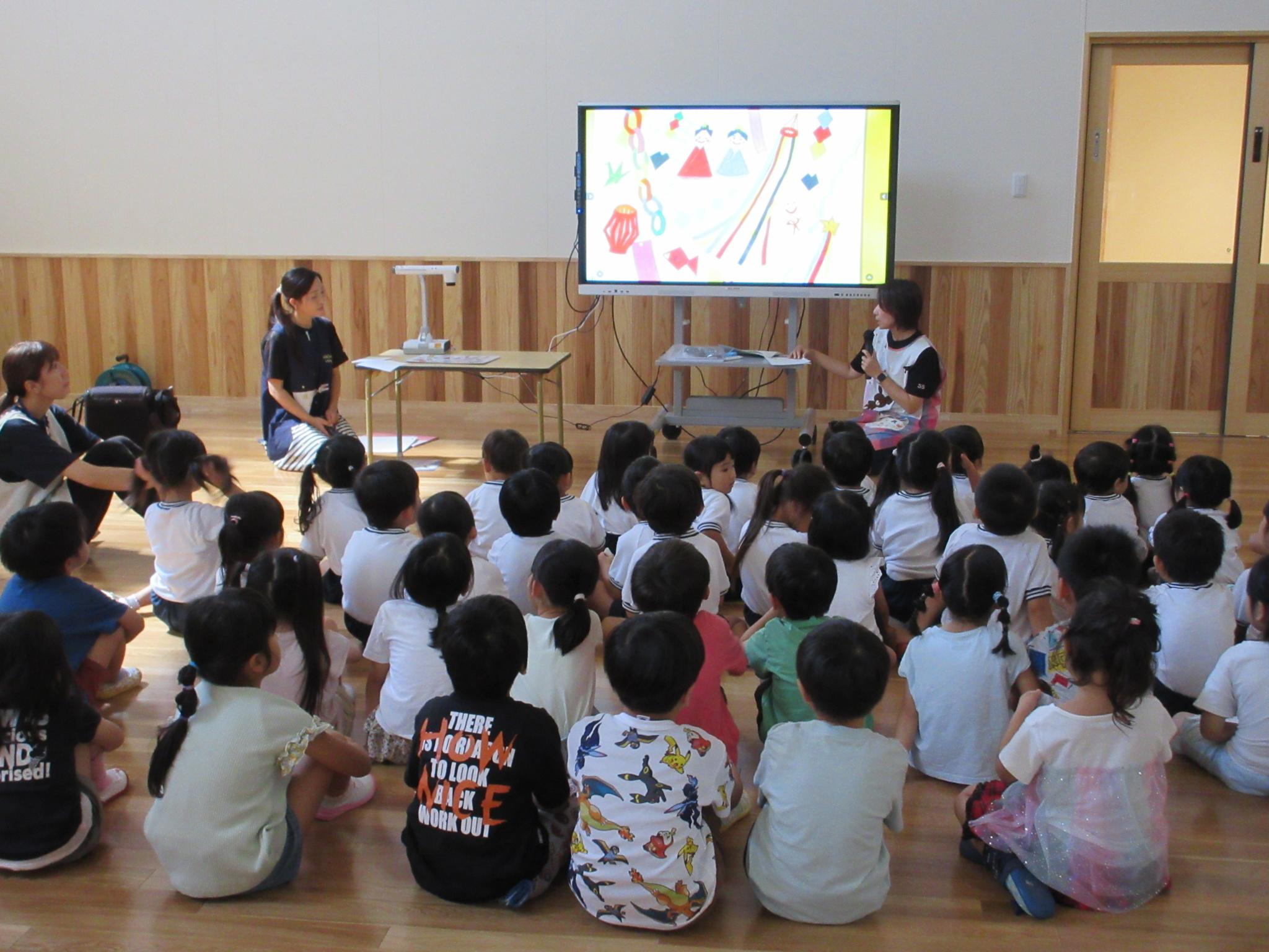 ホールに集まって七夕会をしました。みんなで歌を歌ったり、クイズをしたり、大きな画面で紙芝居を見たり・・・!楽しい会になりました