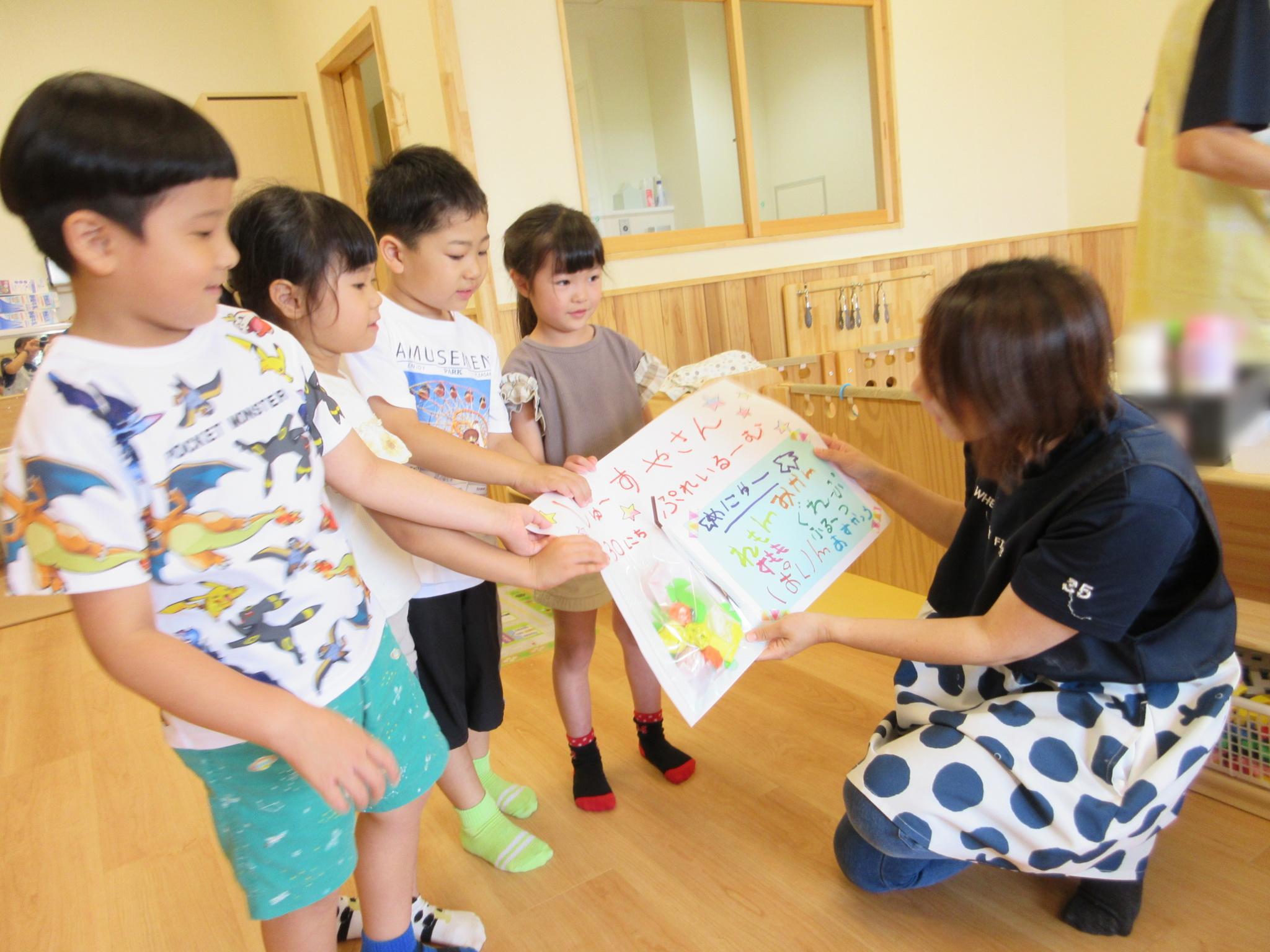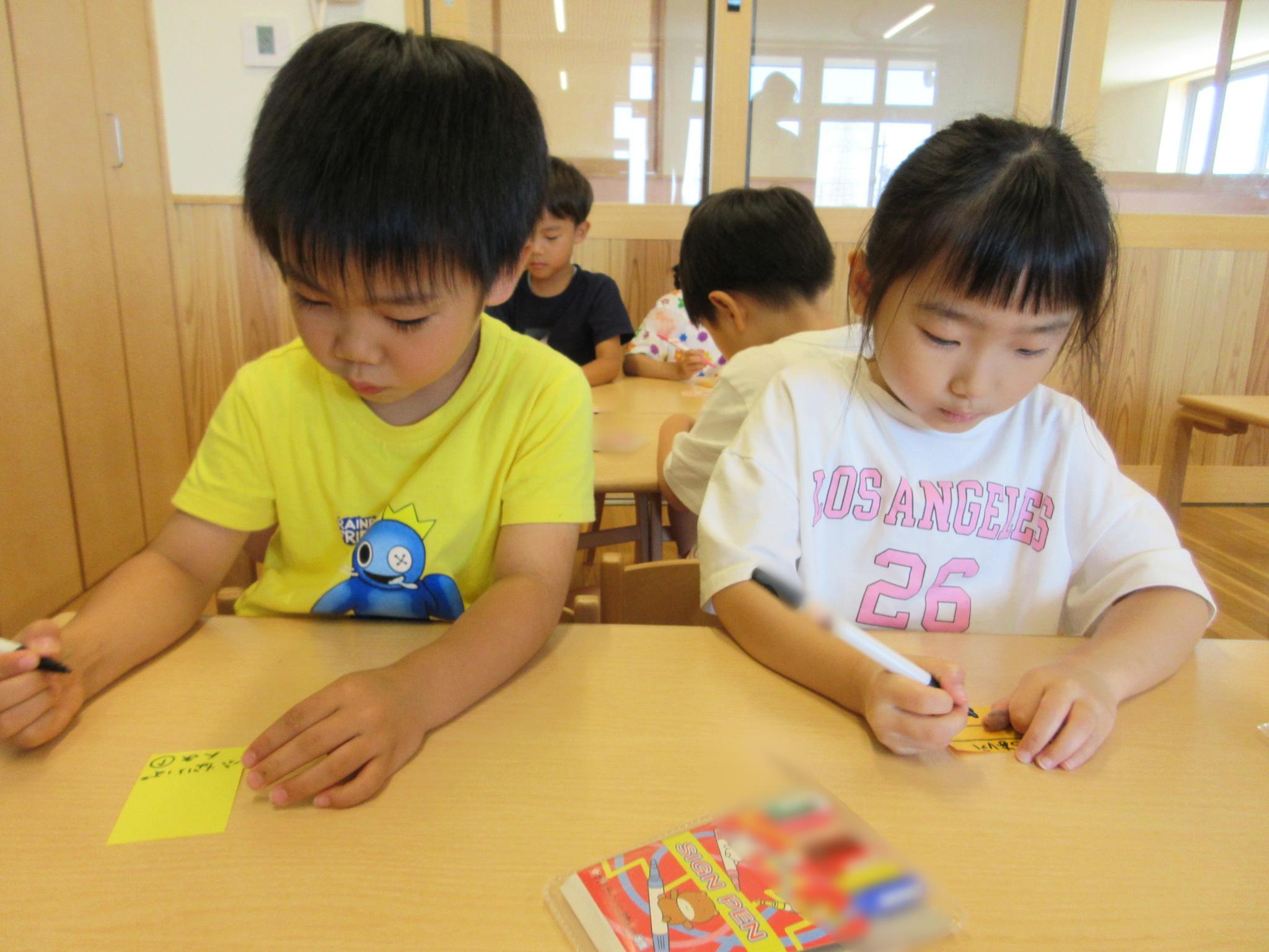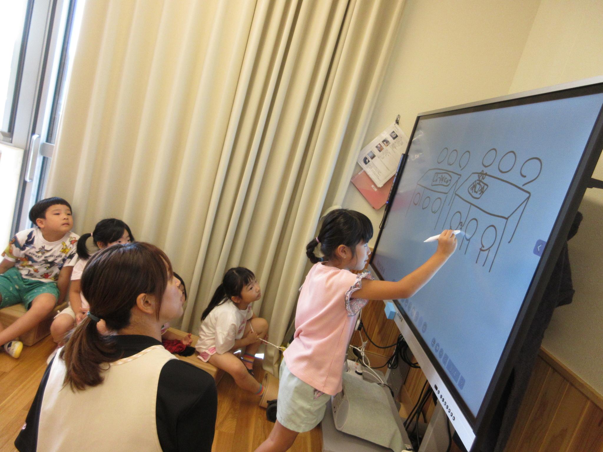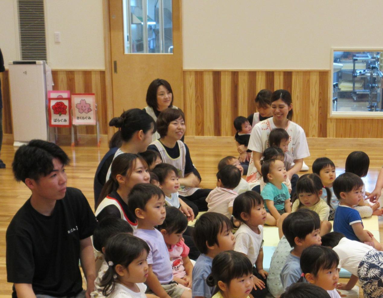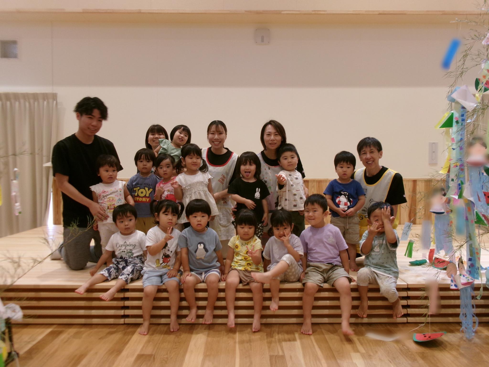 ホールに集まって七夕会をしました。みんなで歌を歌ったり、クイズをしたり、大きな画面で紙芝居を見たり・・・!楽しい会になりました