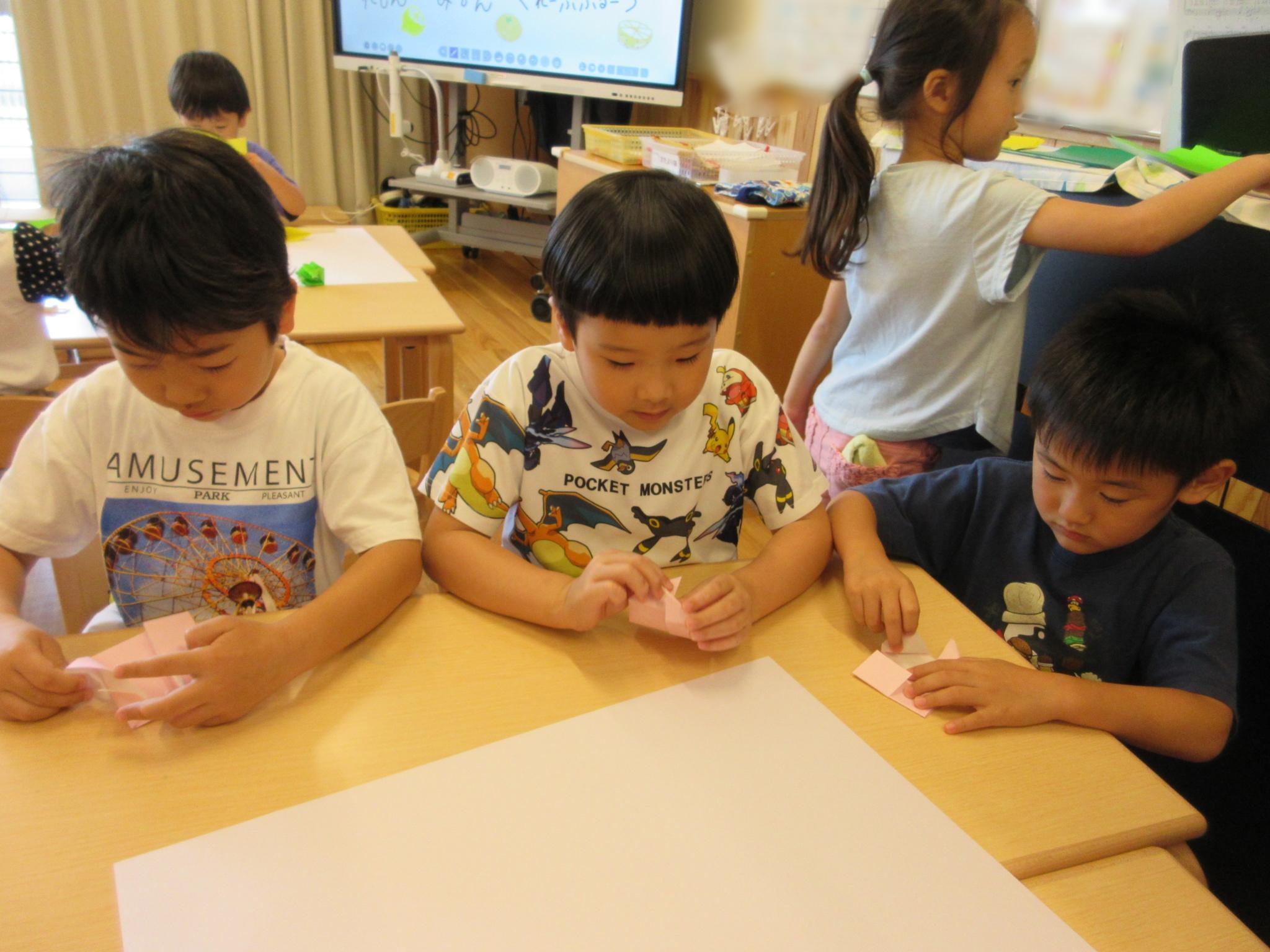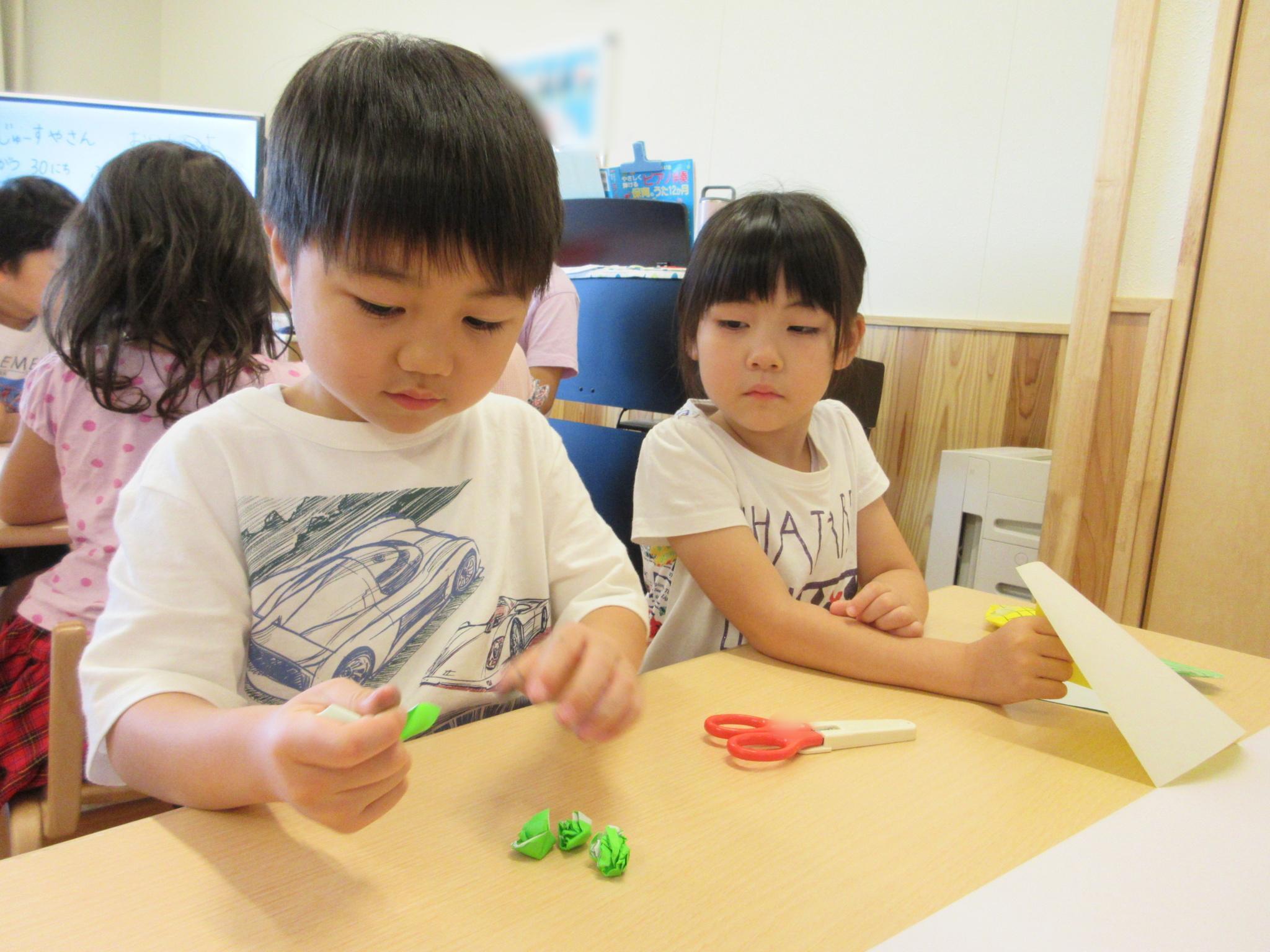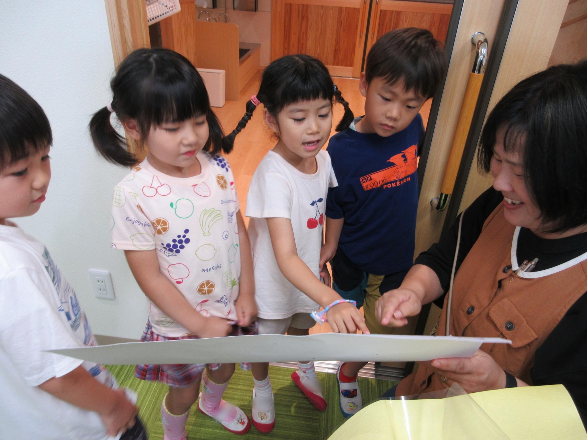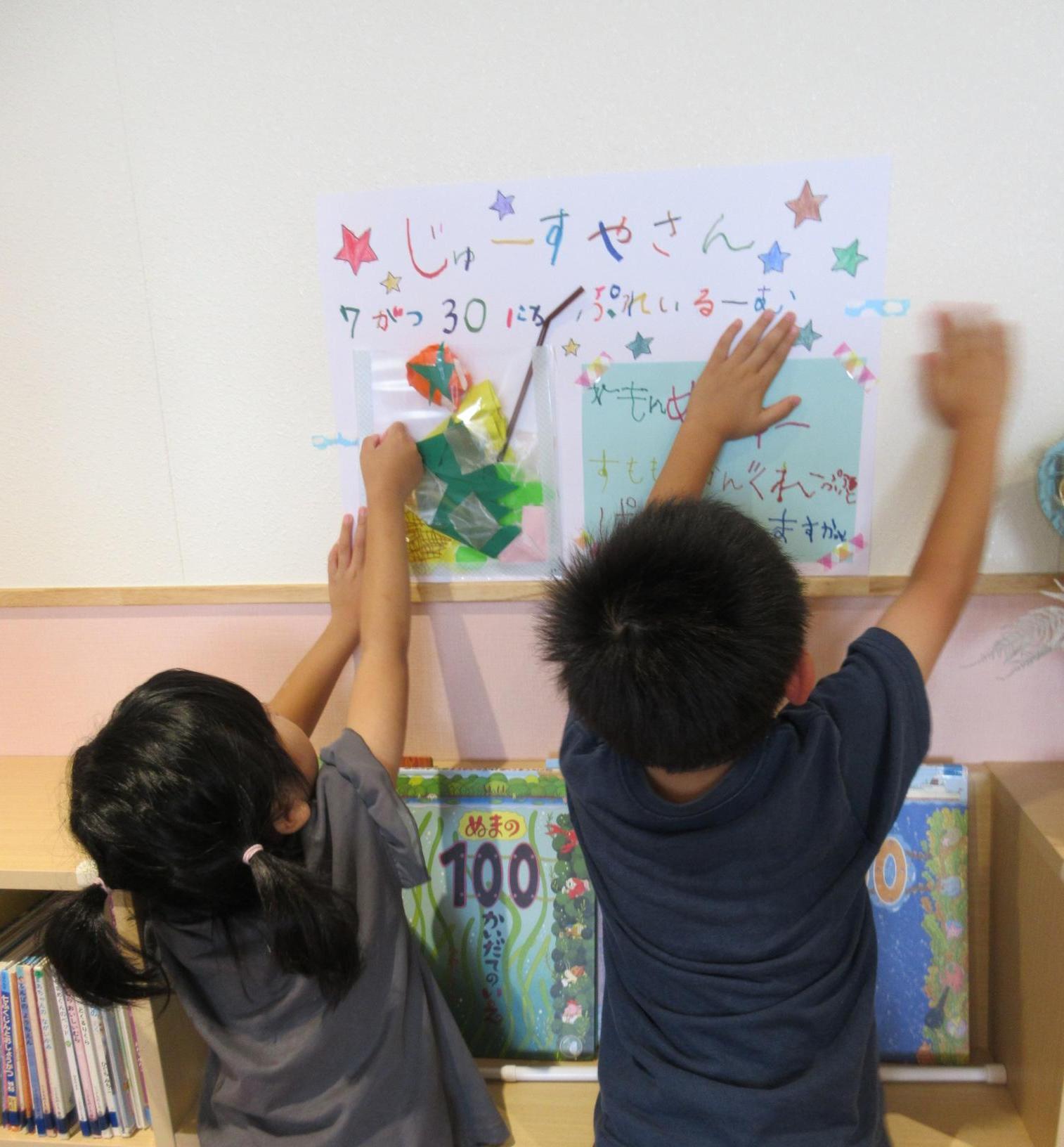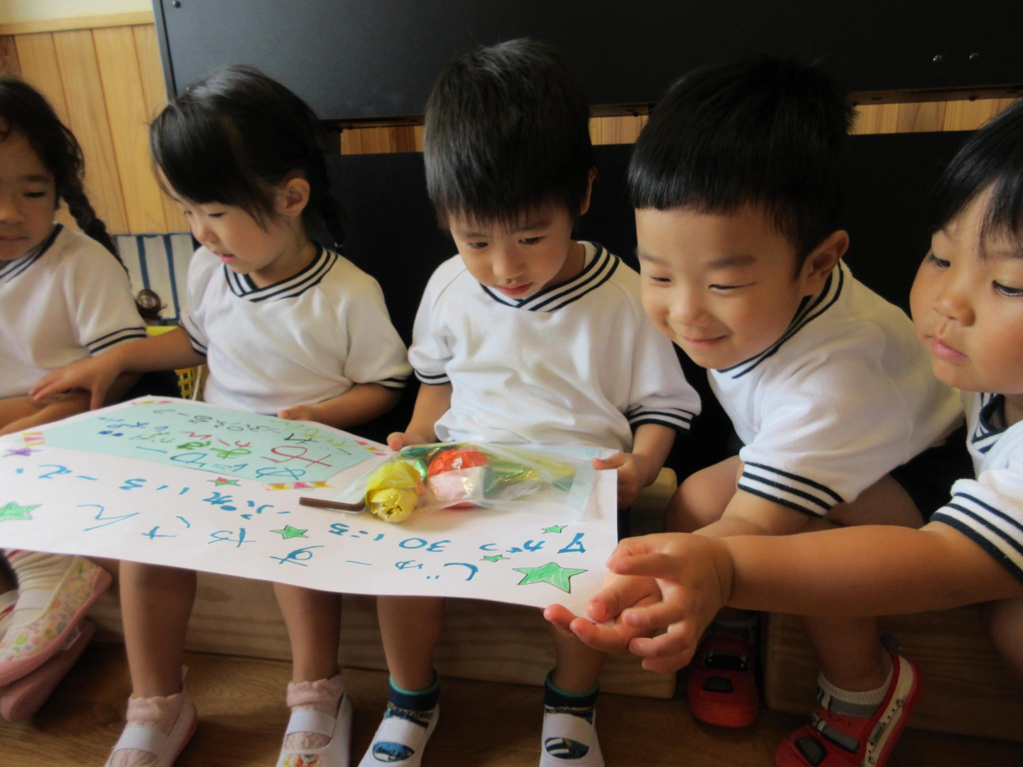 ホールに集まって七夕会をしました。みんなで歌を歌ったり、クイズをしたり、大きな画面で紙芝居を見たり・・・!楽しい会になりました