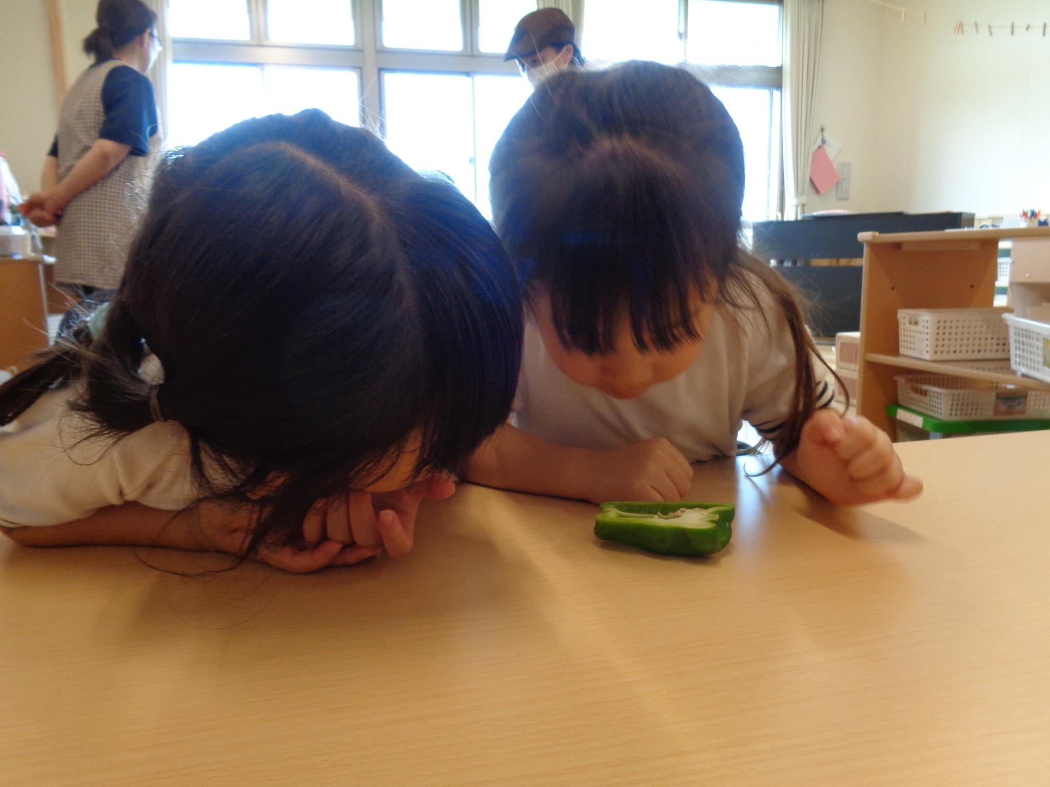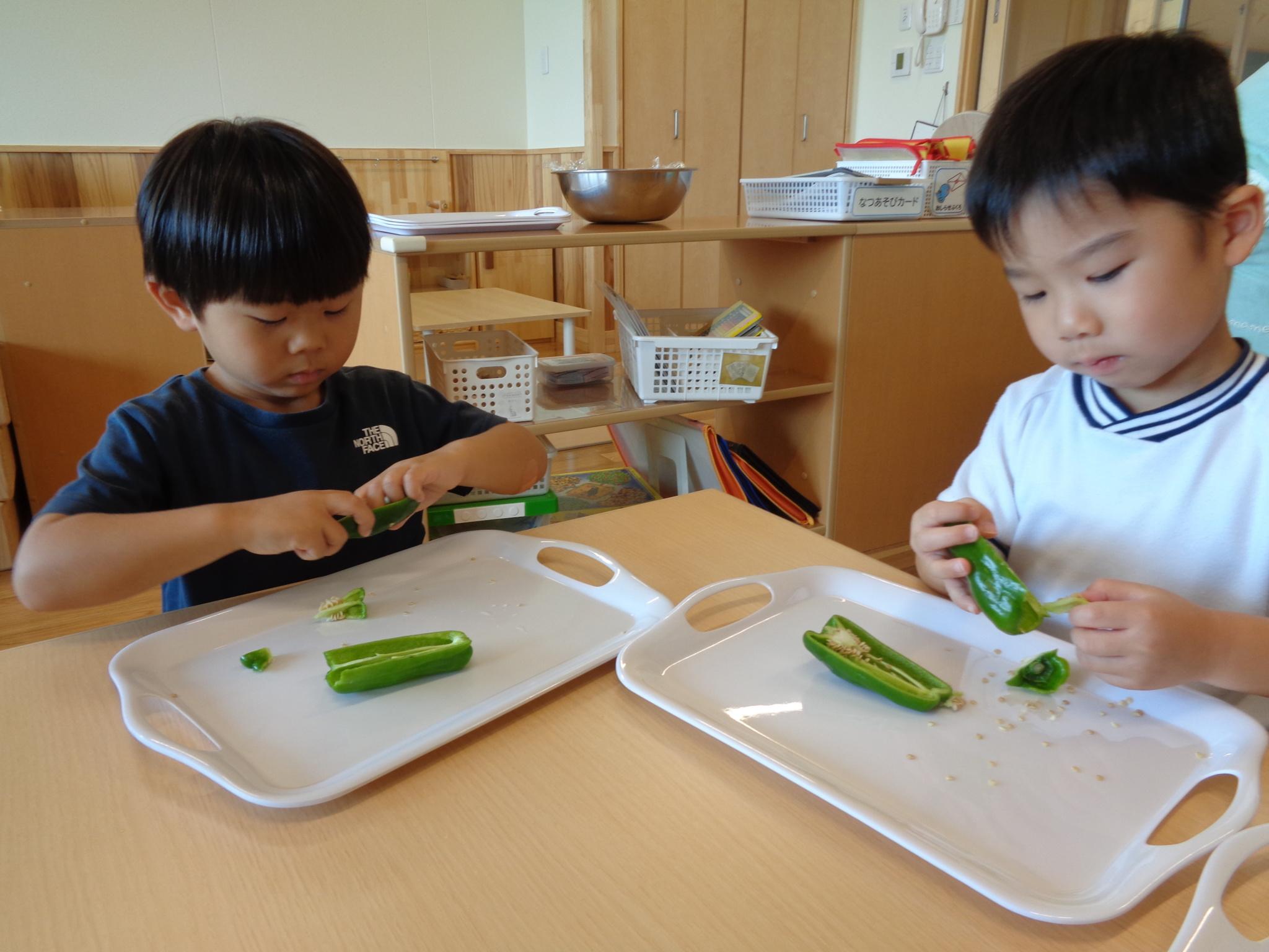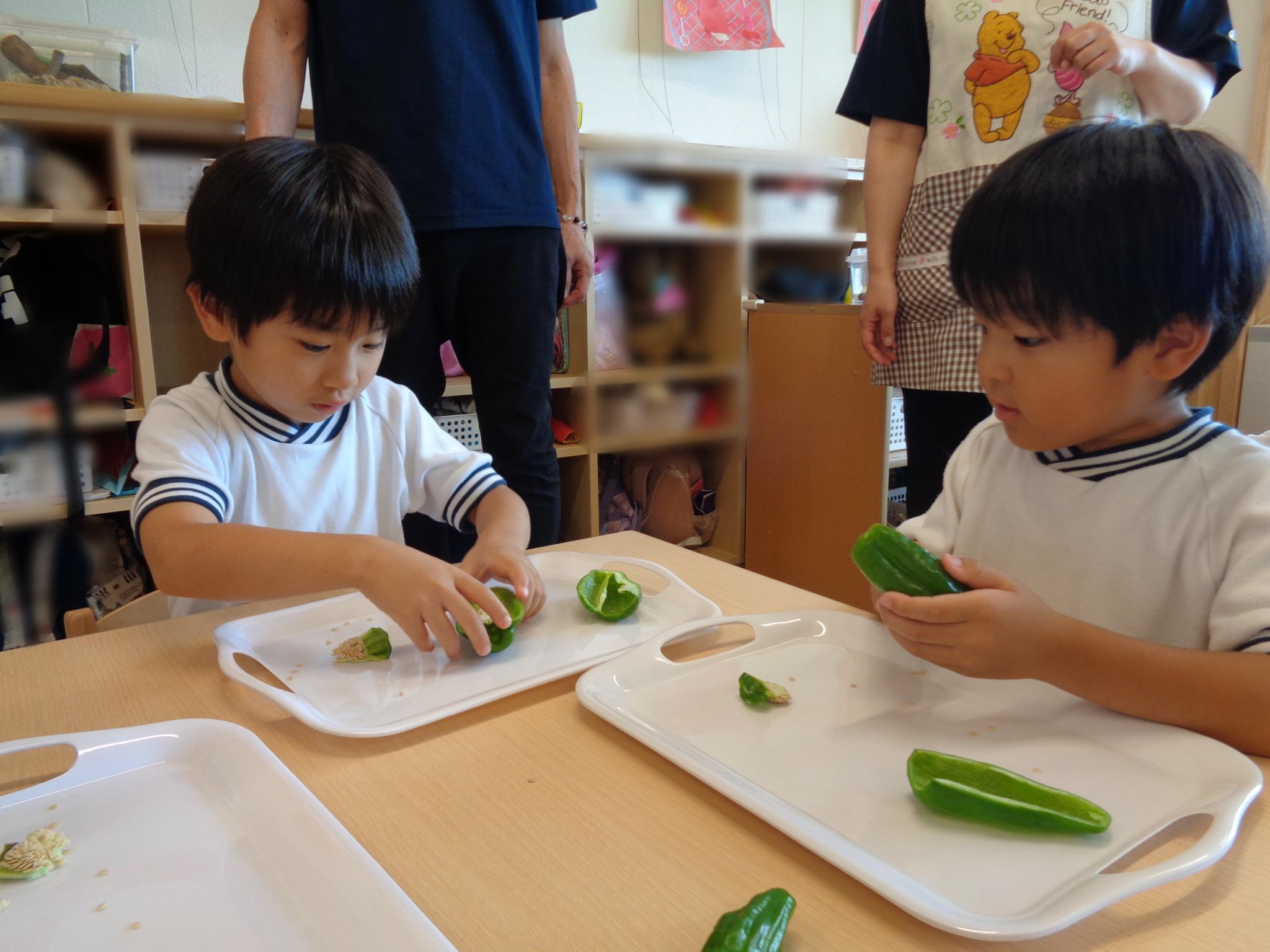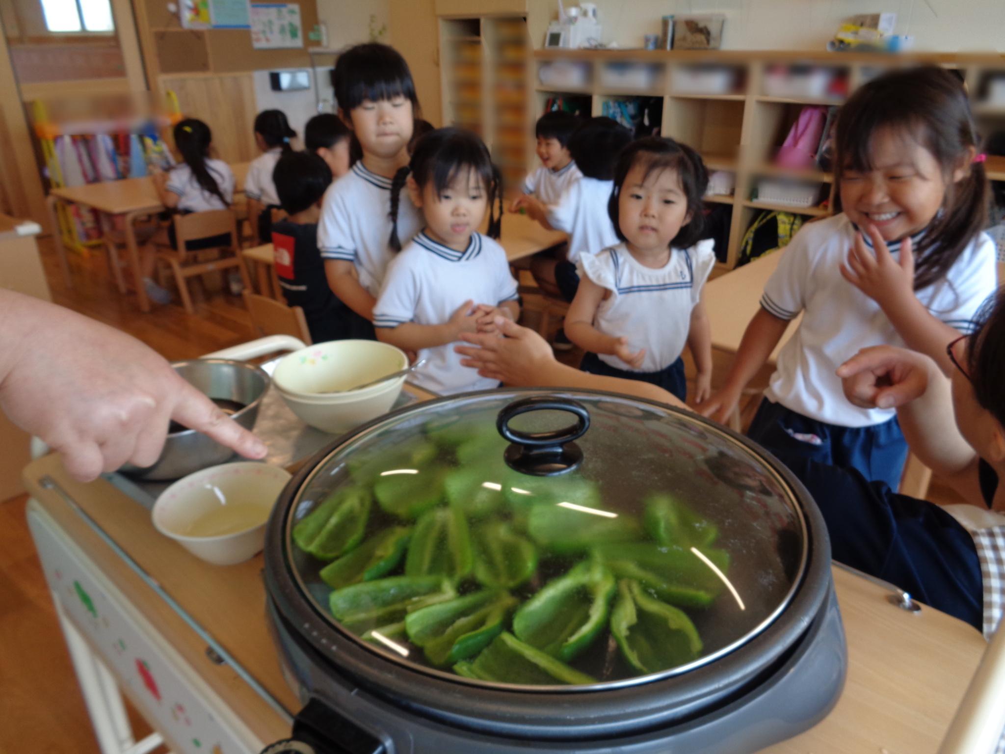 今日はピーマンの食育をしました。半分に切ったピーマンのお腹を見たり匂いを嗅いだり…。種とへたを指を使って外し、洗ってもらって調理スタート!ホットプレートの上にのせて、焼ける音を耳を澄ませて聞いていました。給食に出してもらうと一番に食べ嬉しそうな子どもたちでした♪