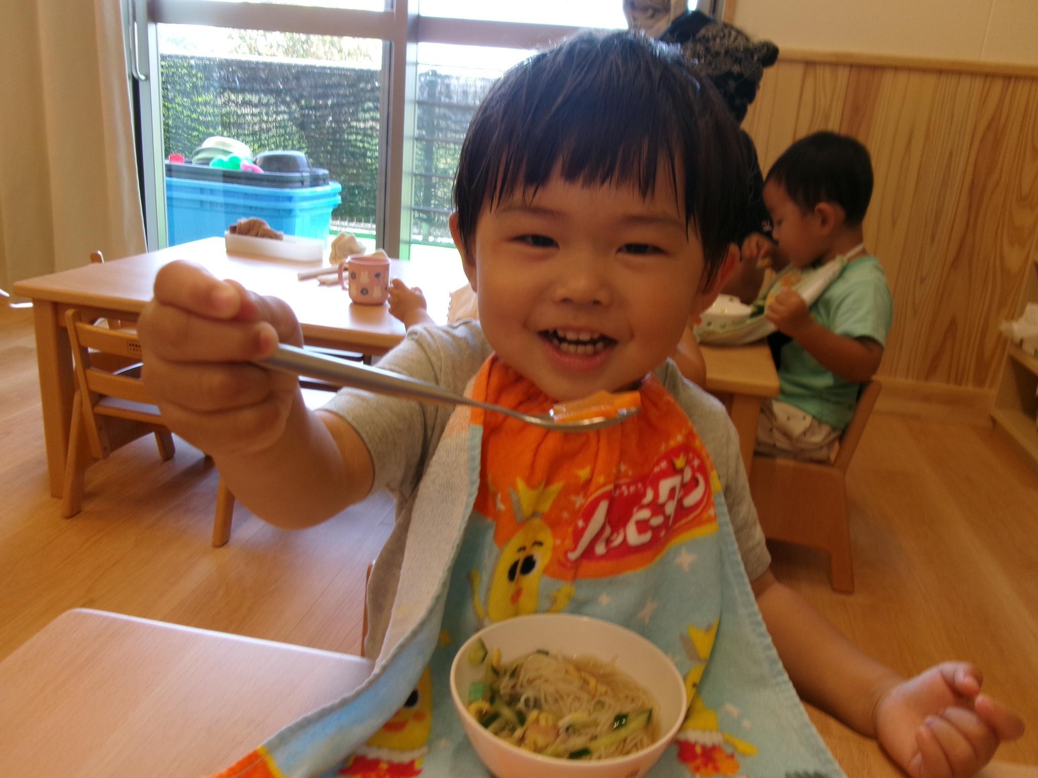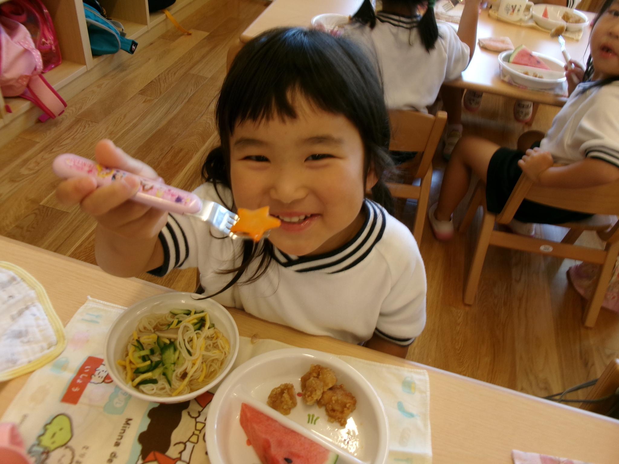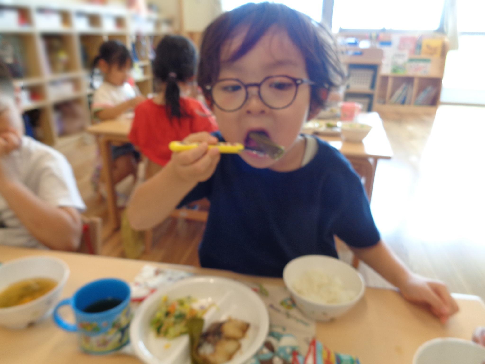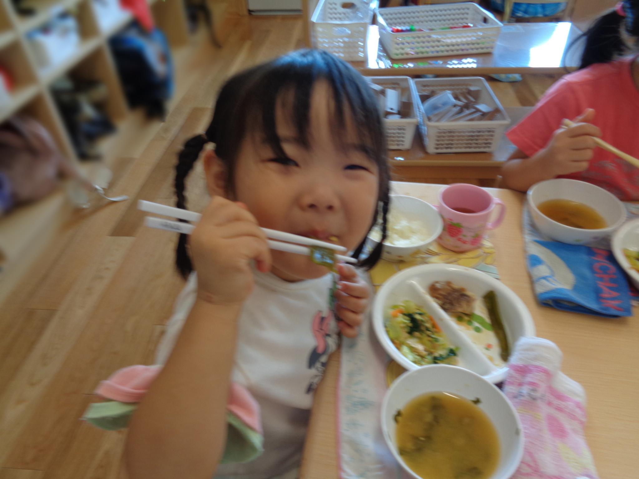 今日はピーマンの食育をしました。半分に切ったピーマンのお腹を見たり匂いを嗅いだり…。種とへたを指を使って外し、洗ってもらって調理スタート!ホットプレートの上にのせて、焼ける音を耳を澄ませて聞いていました。給食に出してもらうと一番に食べ嬉しそうな子どもたちでした♪