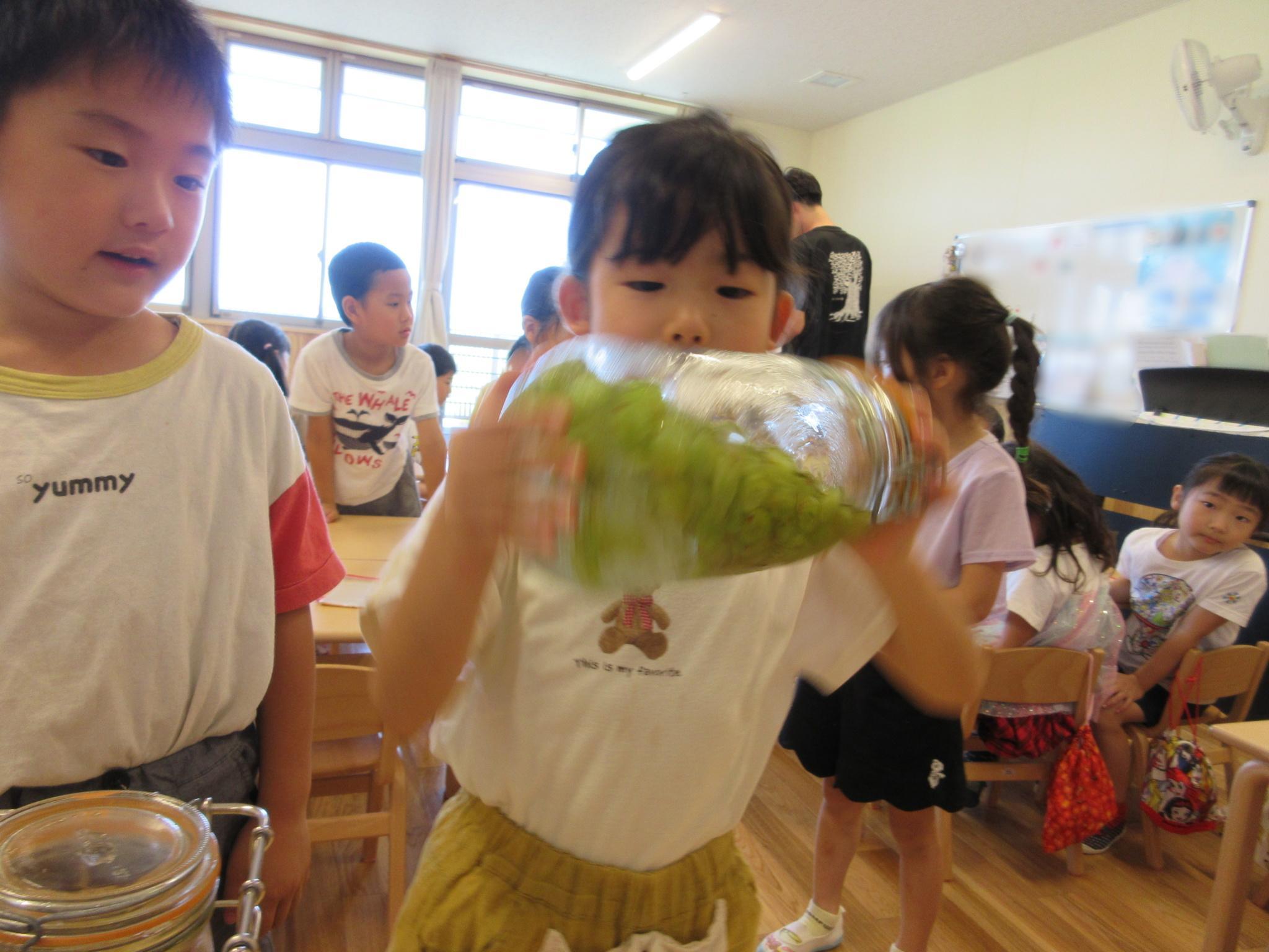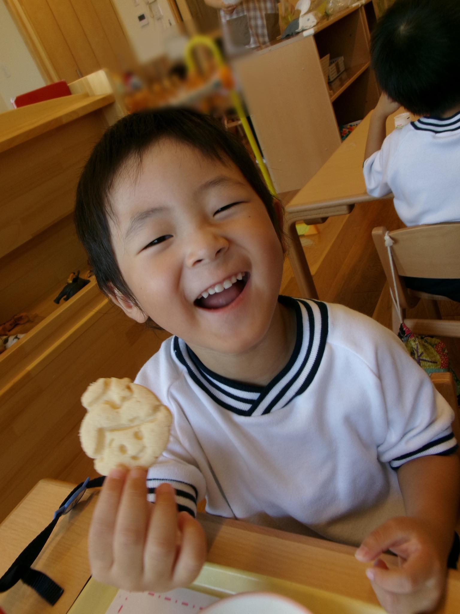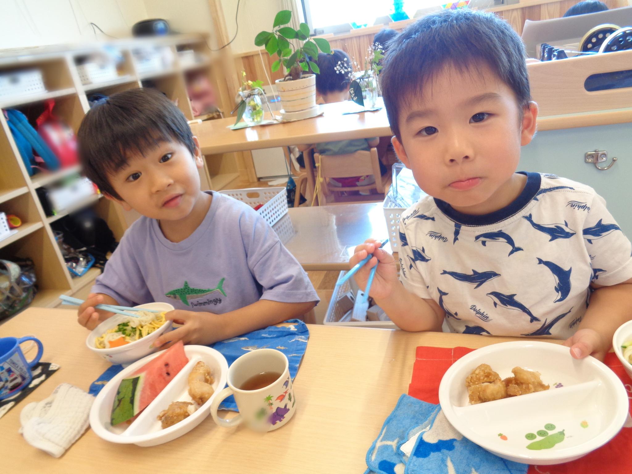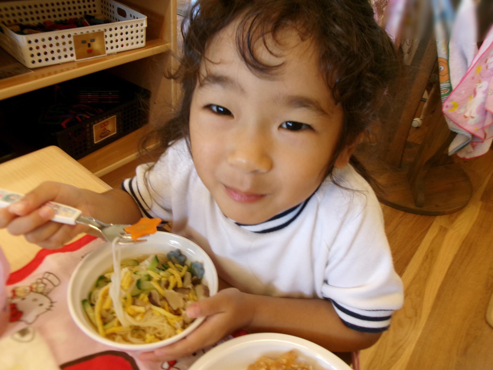 今日はピーマンの食育をしました。半分に切ったピーマンのお腹を見たり匂いを嗅いだり…。種とへたを指を使って外し、洗ってもらって調理スタート!ホットプレートの上にのせて、焼ける音を耳を澄ませて聞いていました。給食に出してもらうと一番に食べ嬉しそうな子どもたちでした♪