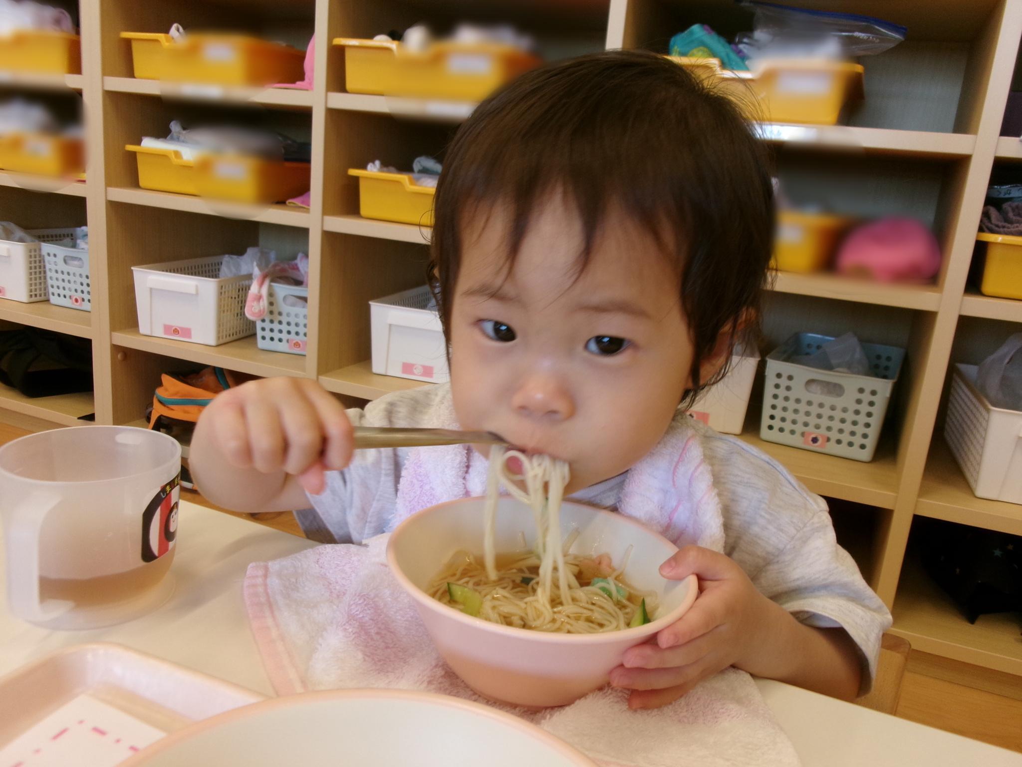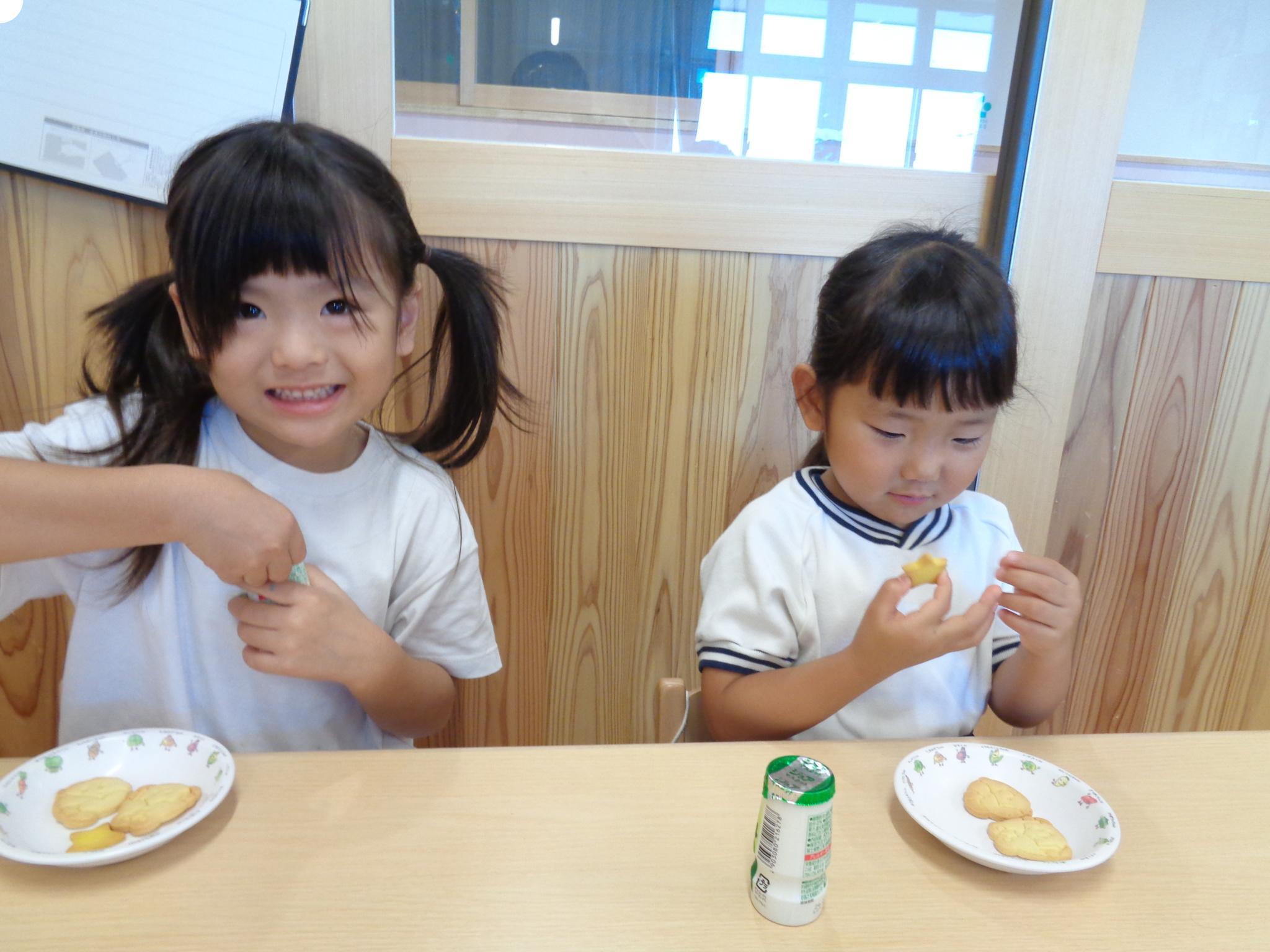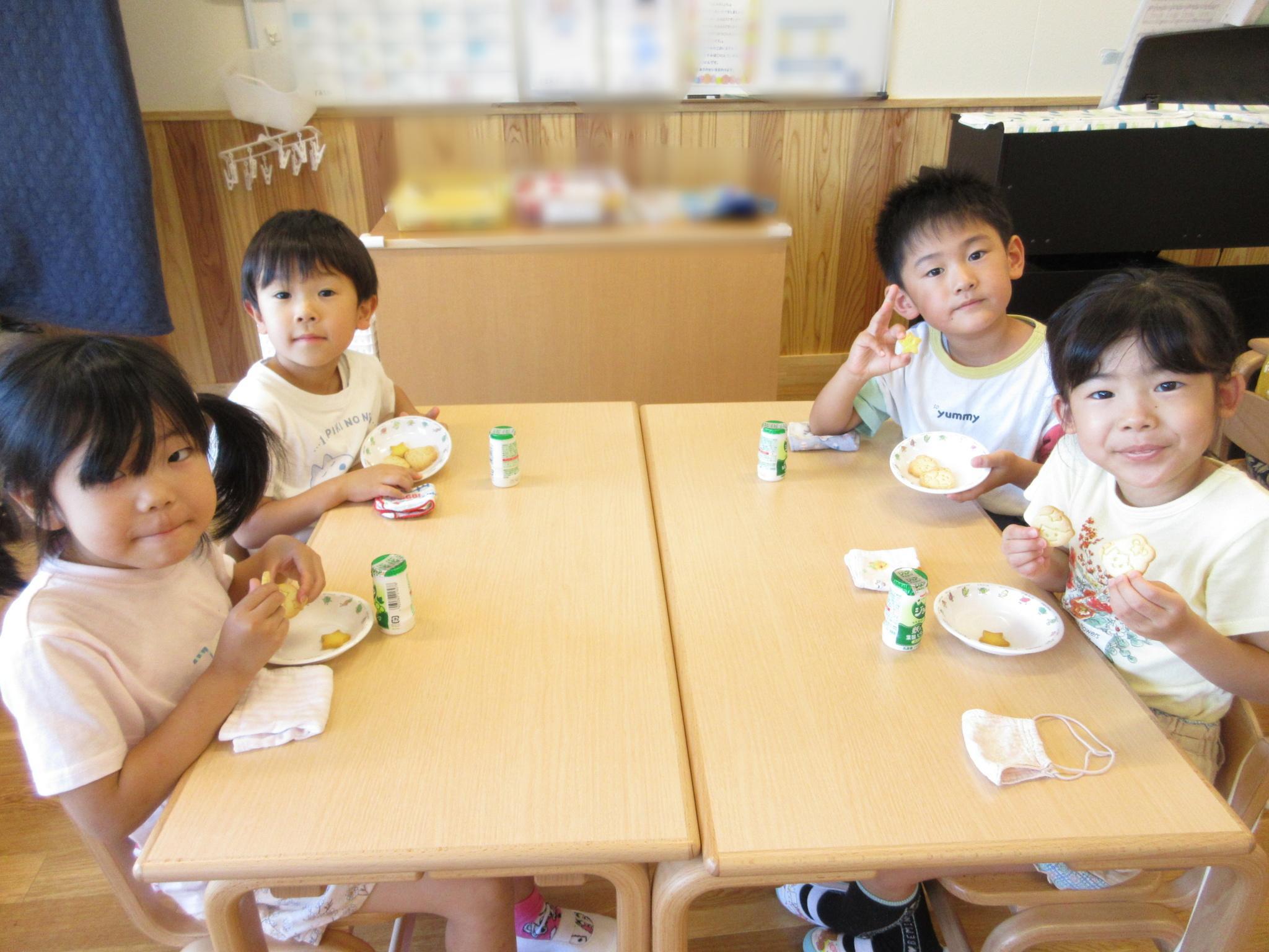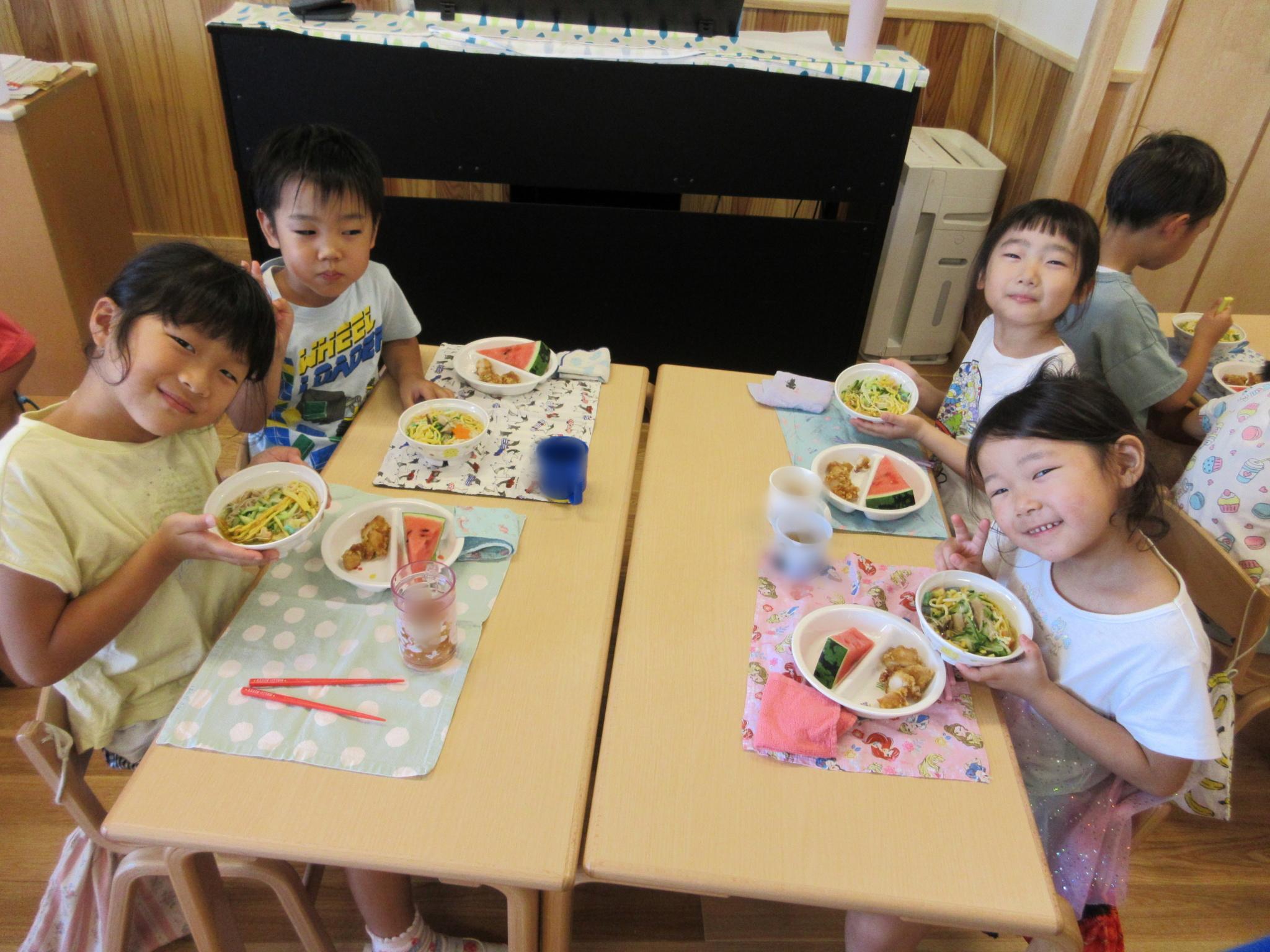 今日はピーマンの食育をしました。半分に切ったピーマンのお腹を見たり匂いを嗅いだり…。種とへたを指を使って外し、洗ってもらって調理スタート!ホットプレートの上にのせて、焼ける音を耳を澄ませて聞いていました。給食に出してもらうと一番に食べ嬉しそうな子どもたちでした♪