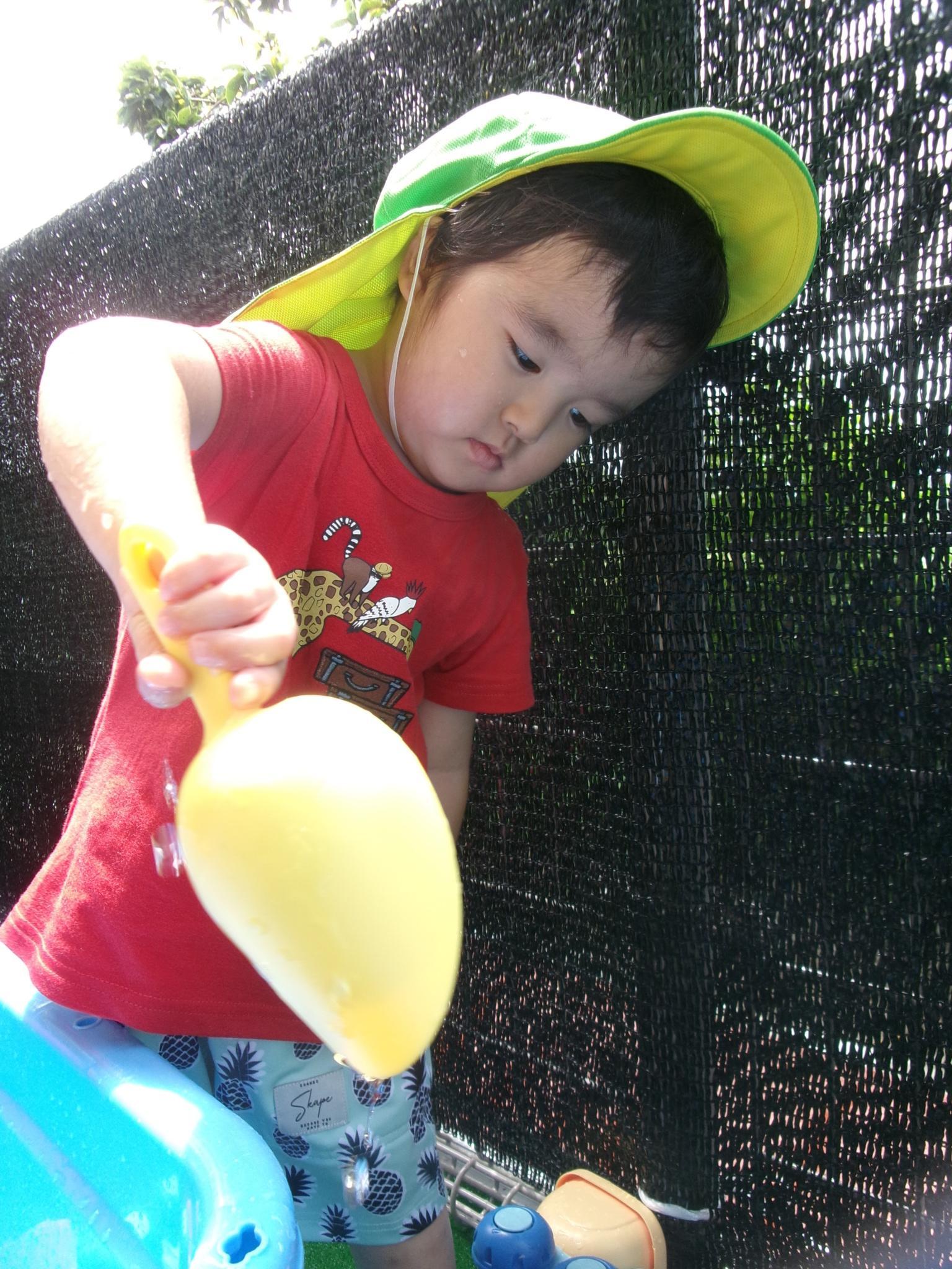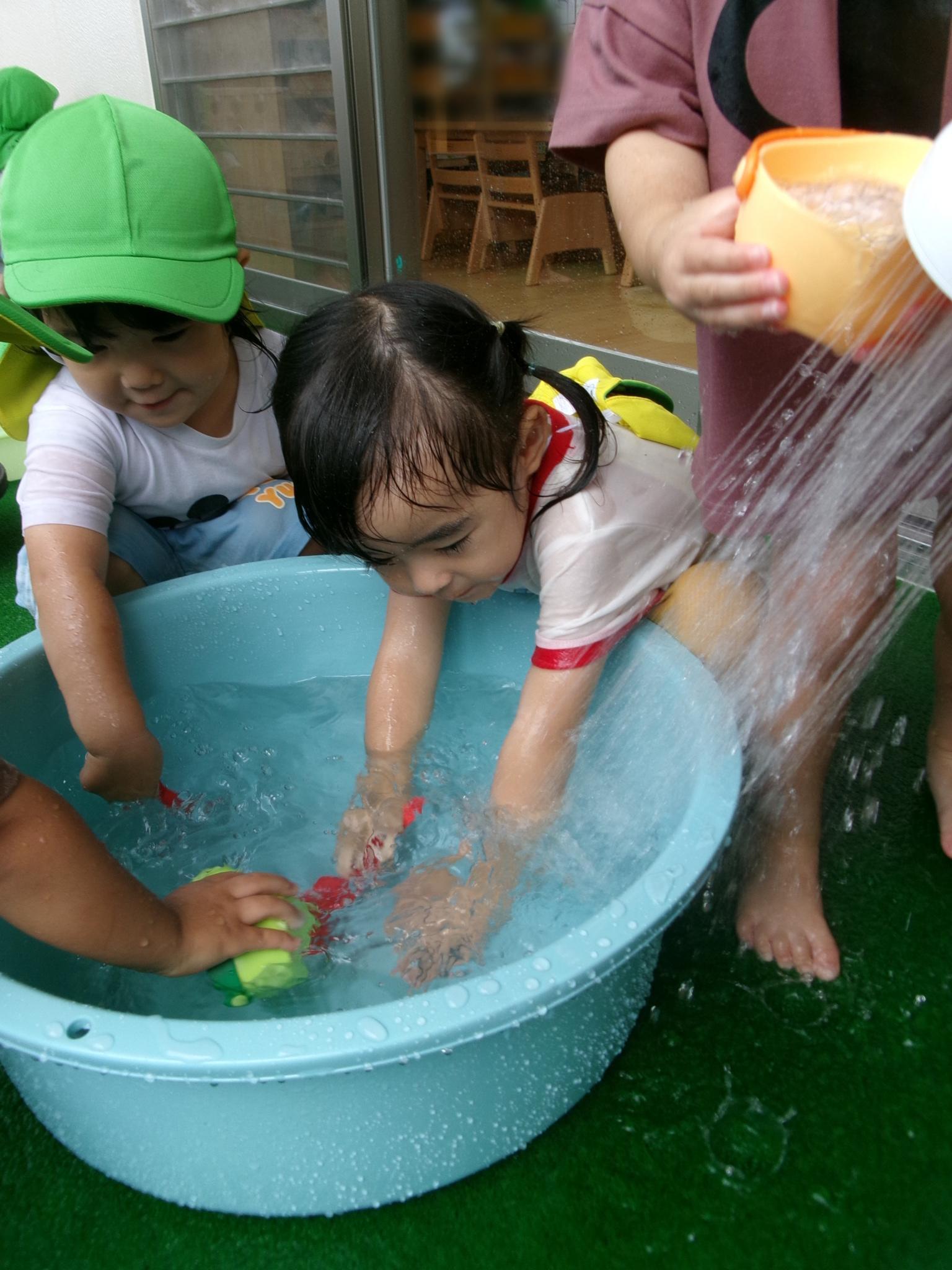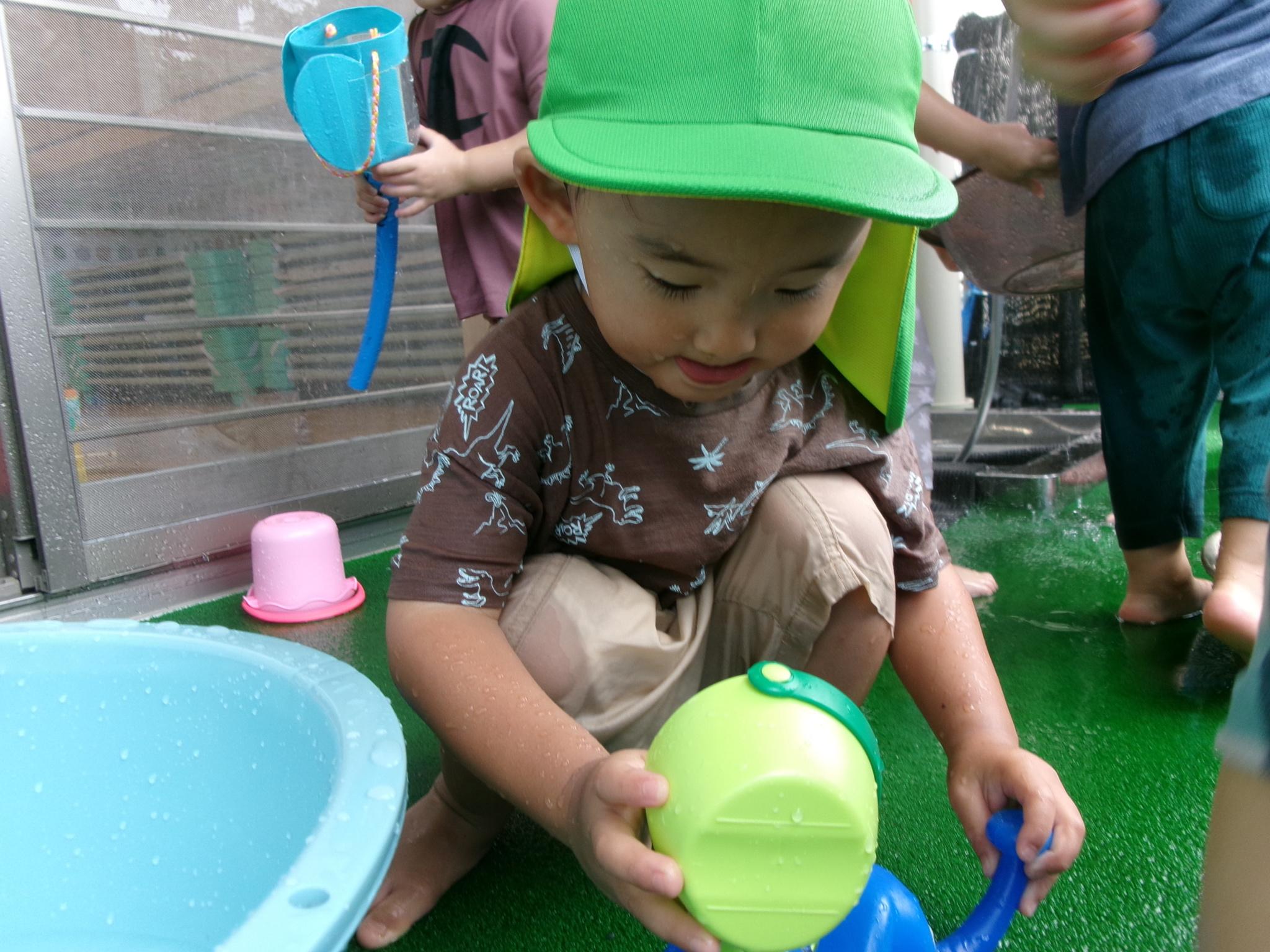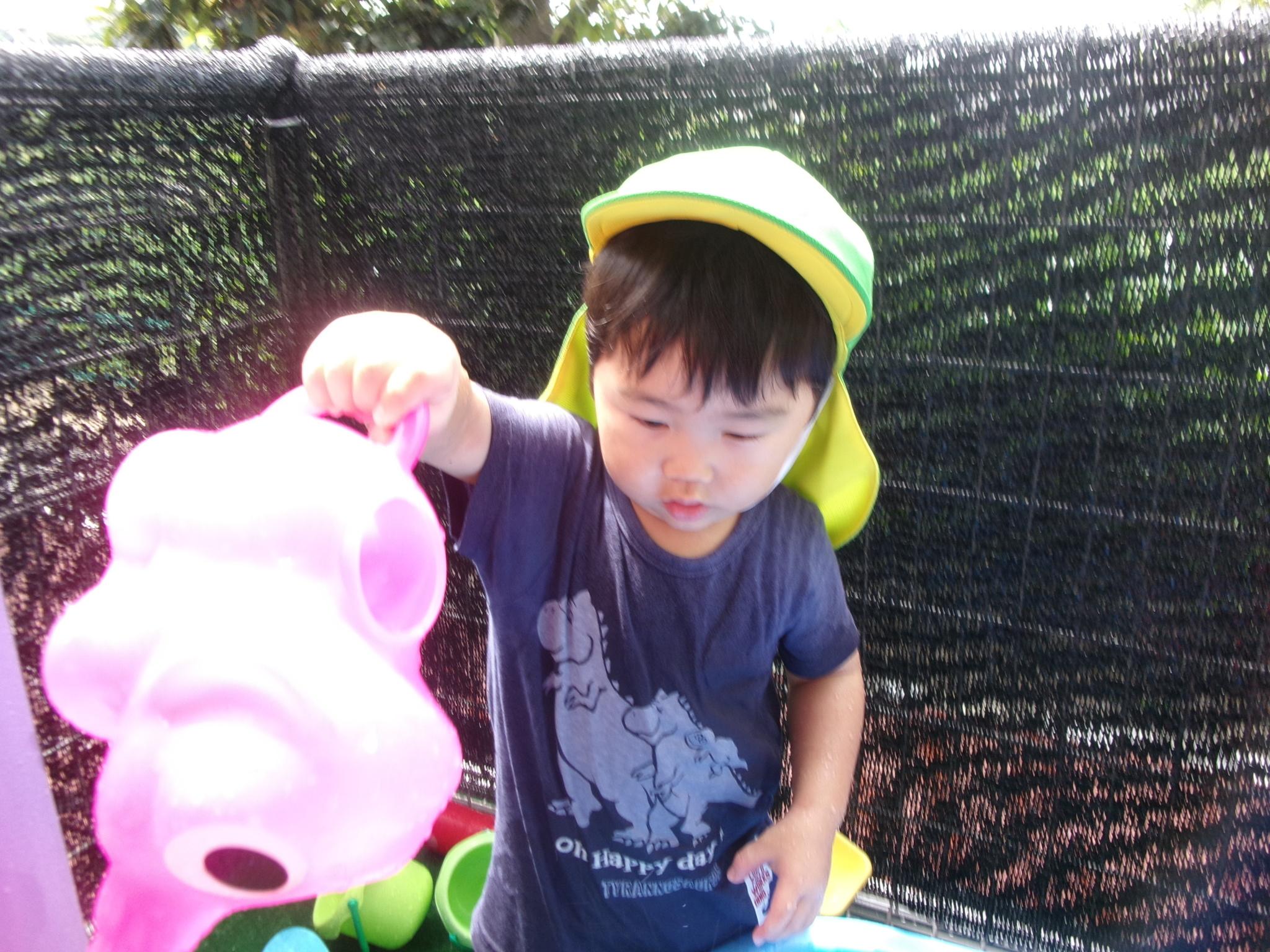 楽しみにしている水遊びができました。ぞうさんのじょうろやたこ・いかの手作り玩具、トラックにお水をたくさんすくっては流し…。お友達と一緒に楽しんでいっぱいの笑顔が見られました。明日もできるといいですね♪