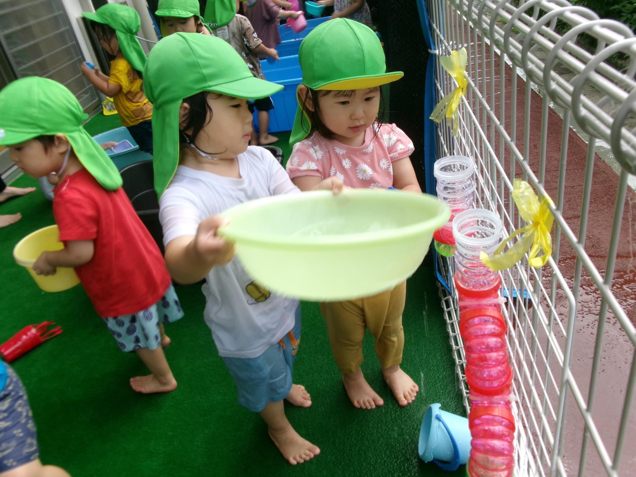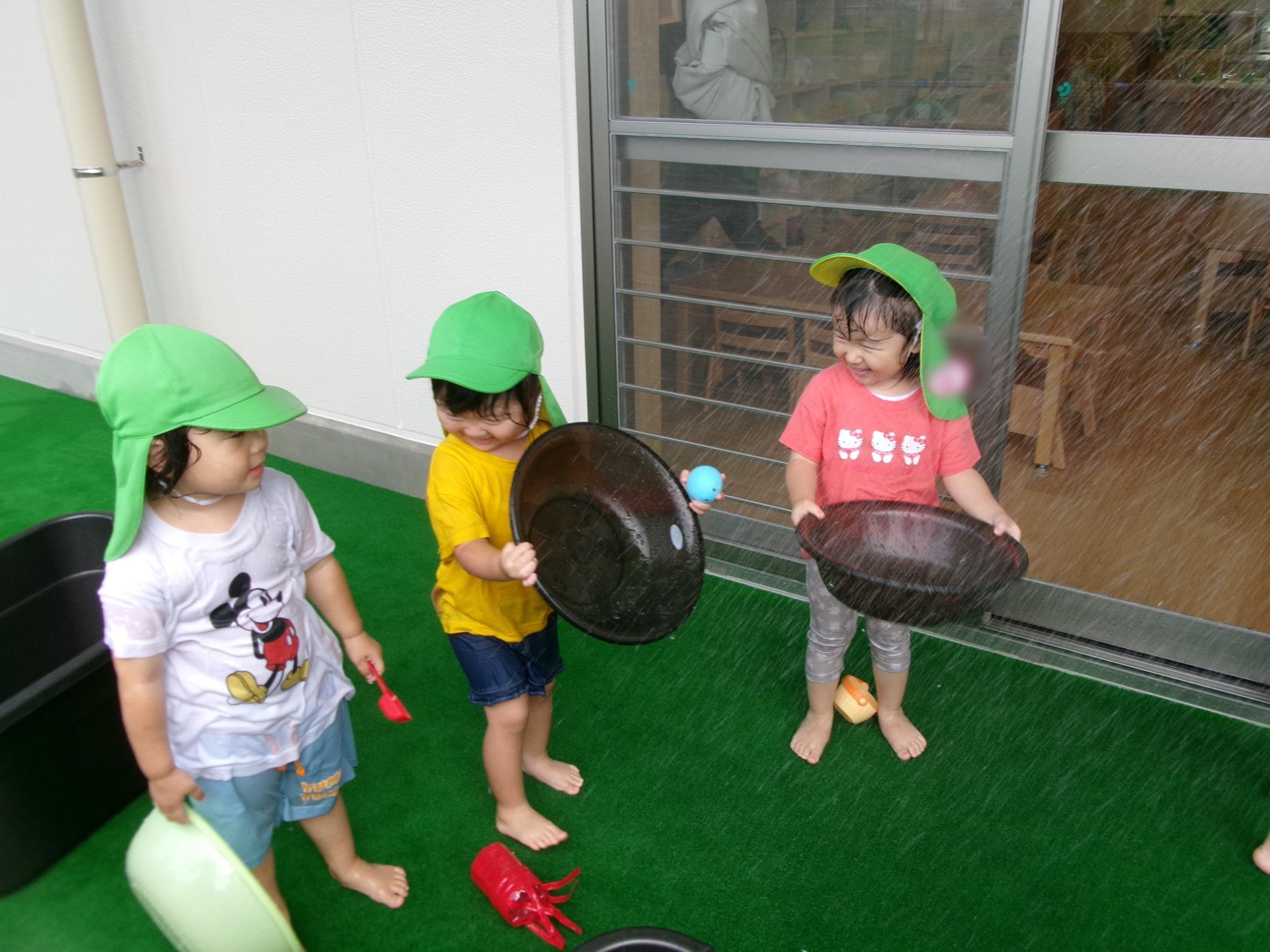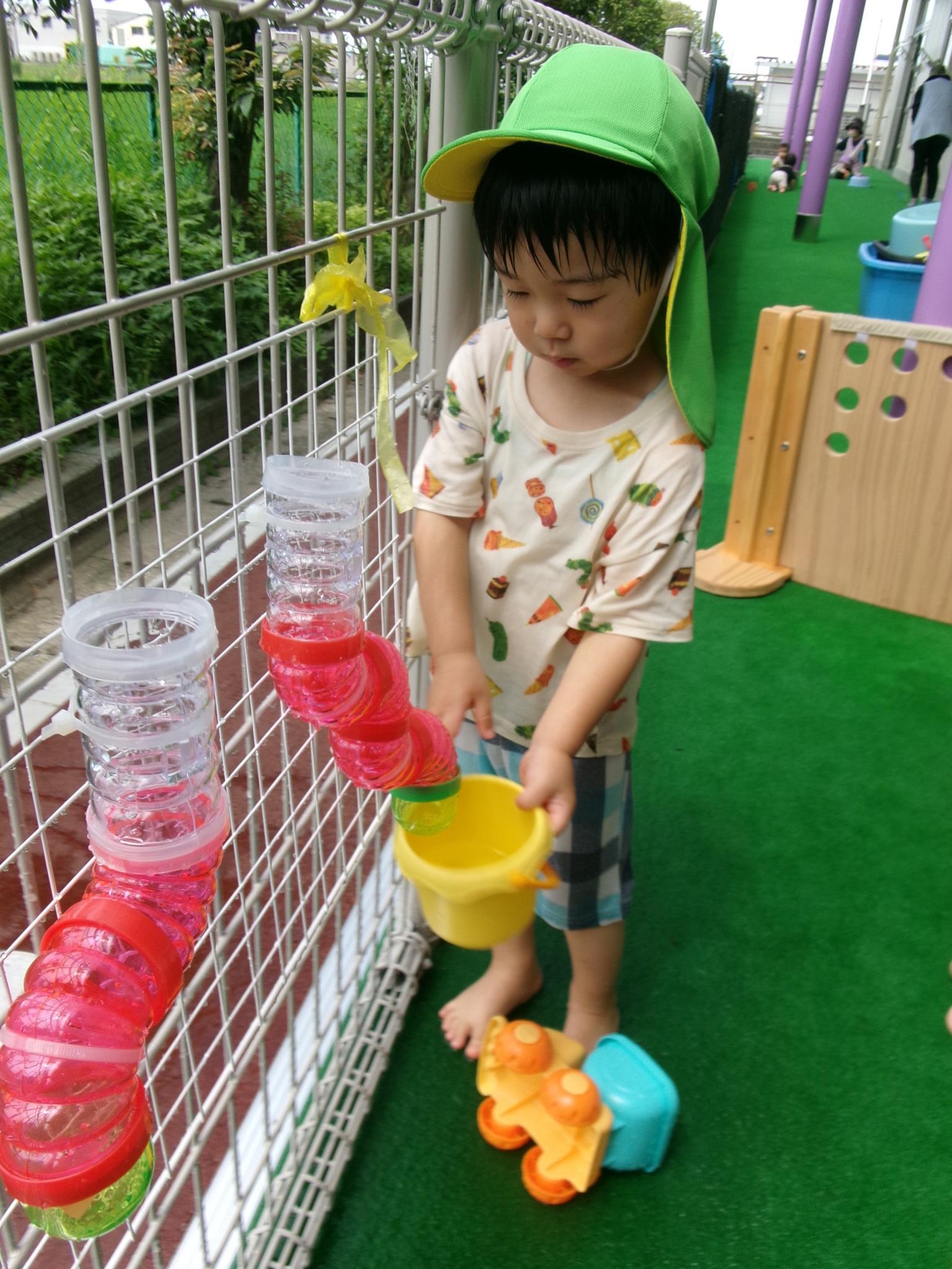 楽しみにしている水遊びができました。ぞうさんのじょうろやたこ・いかの手作り玩具、トラックにお水をたくさんすくっては流し…。お友達と一緒に楽しんでいっぱいの笑顔が見られました。明日もできるといいですね♪