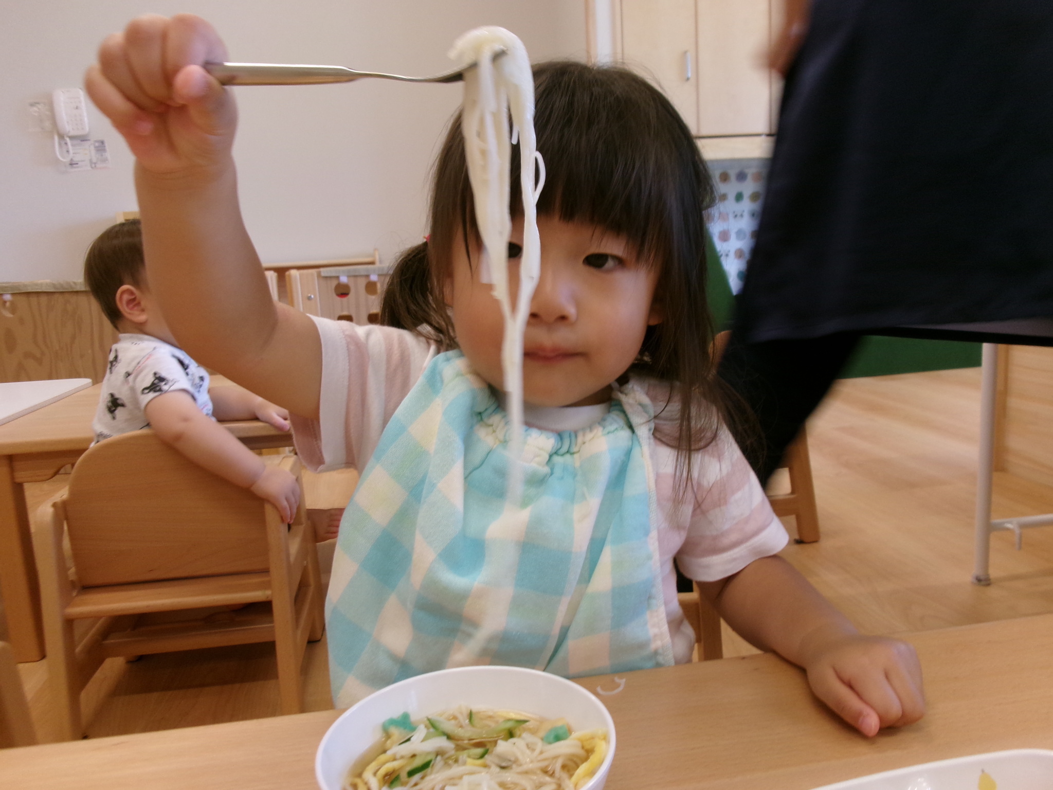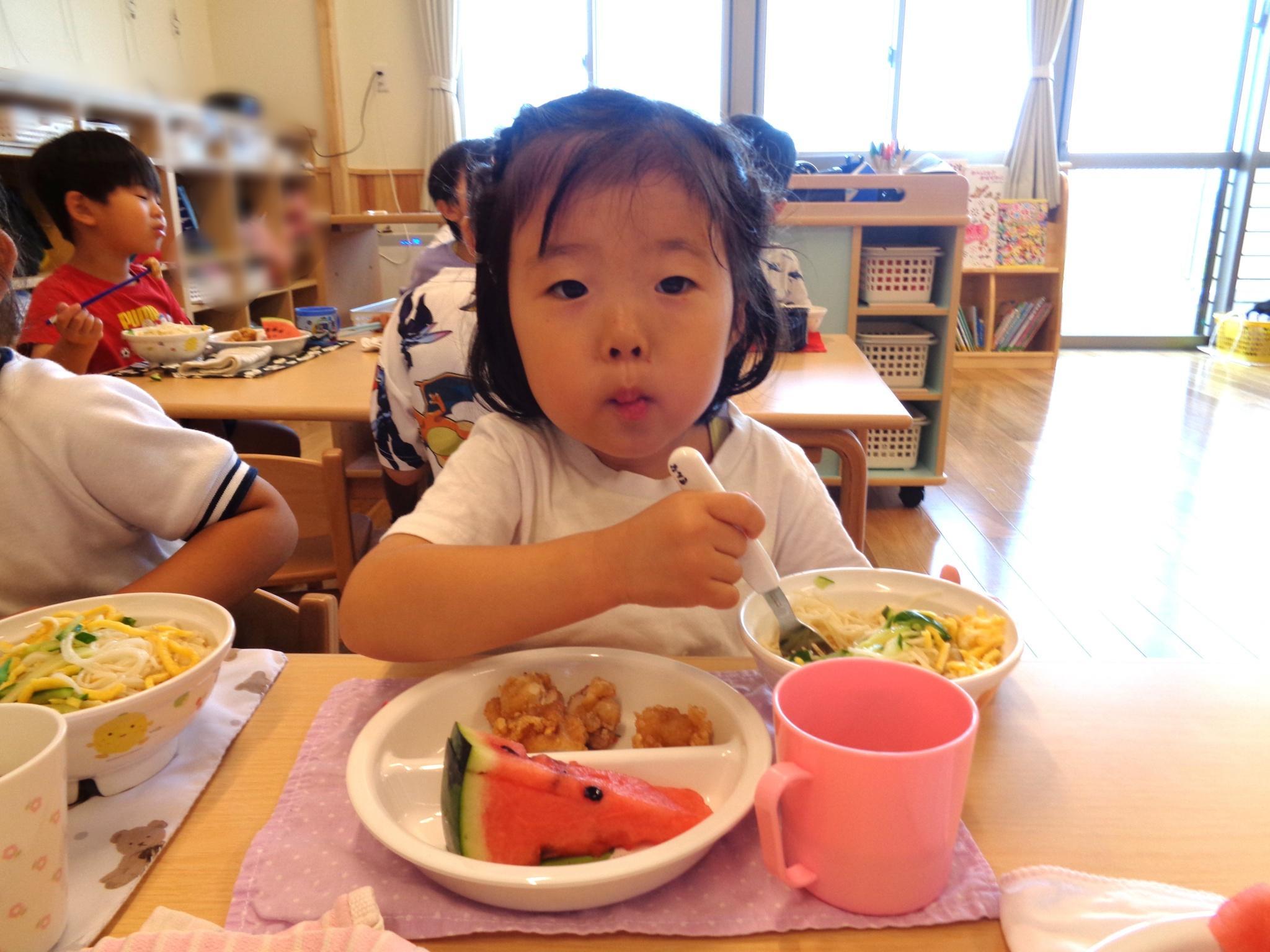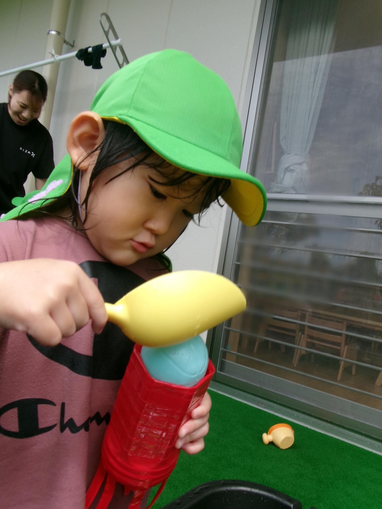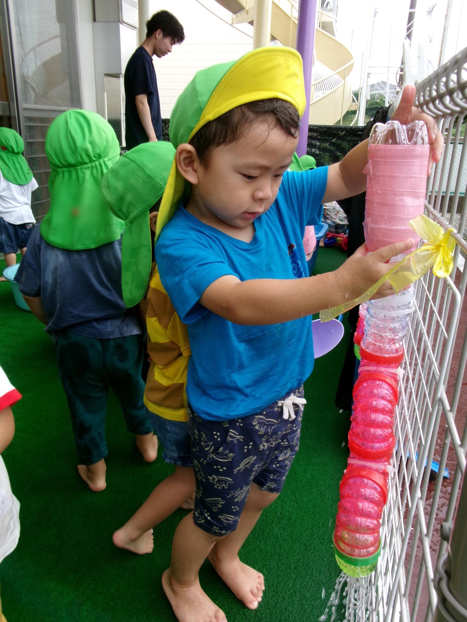 楽しみにしている水遊びができました。ぞうさんのじょうろやたこ・いかの手作り玩具、トラックにお水をたくさんすくっては流し…。お友達と一緒に楽しんでいっぱいの笑顔が見られました。明日もできるといいですね♪