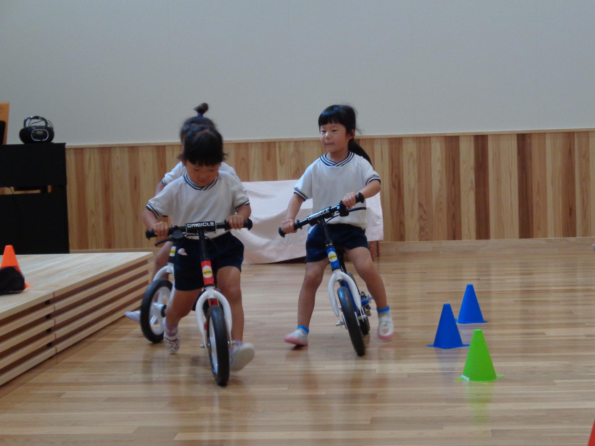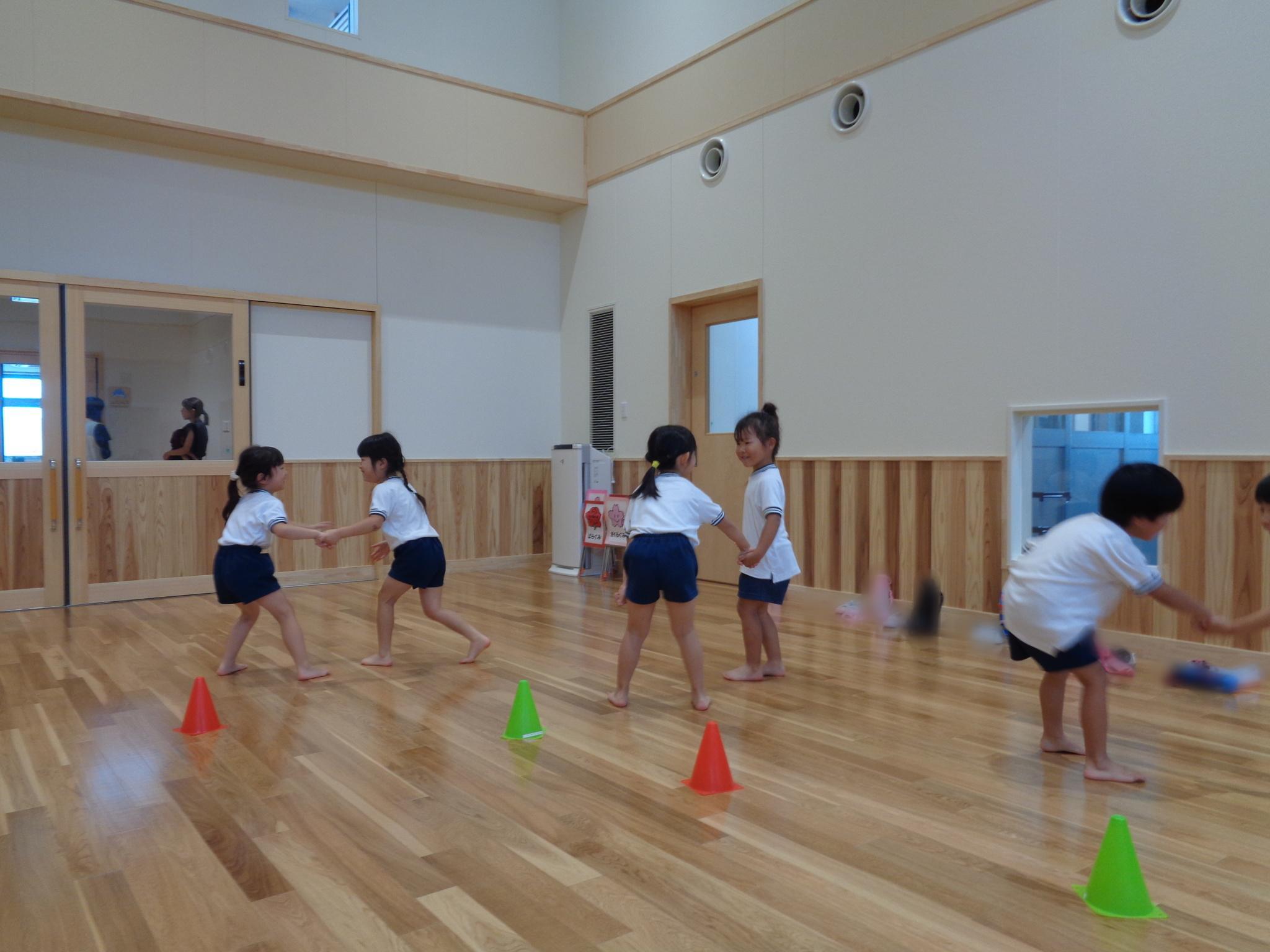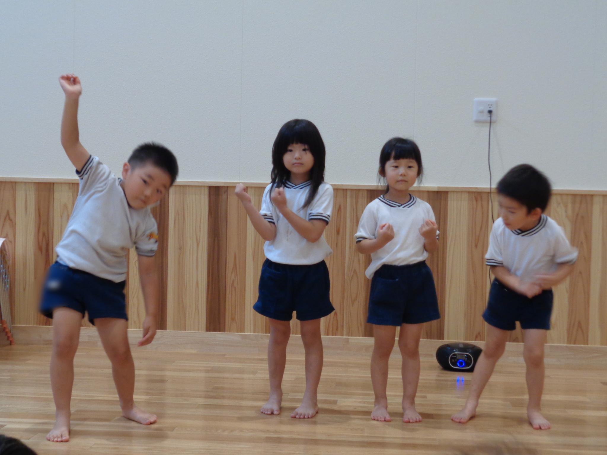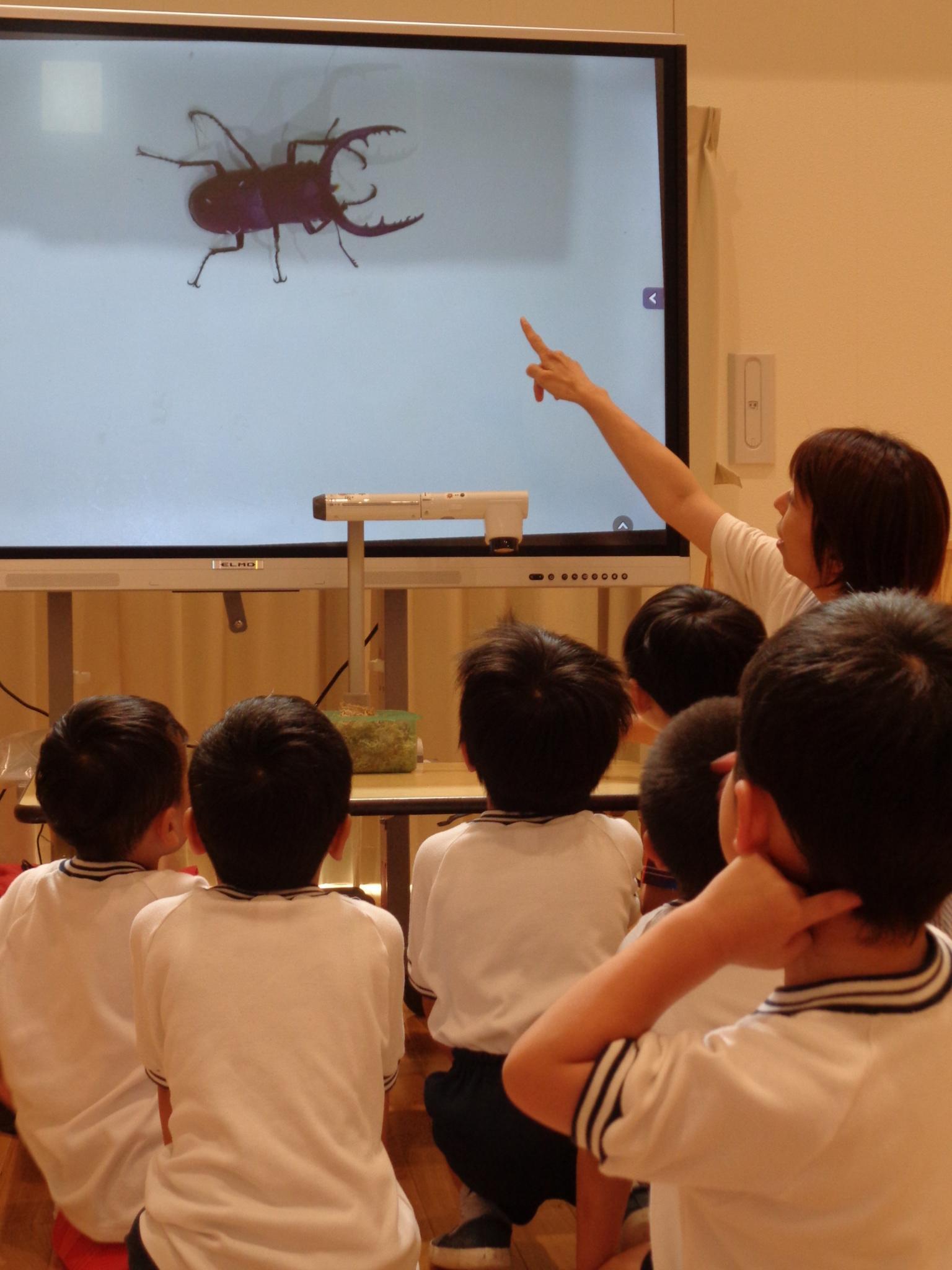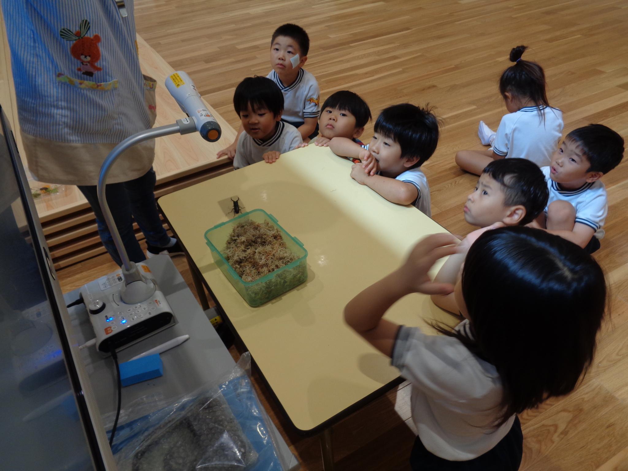 ホールの大きなモニターで虫の観察をしました。クワガタ、カミキリムシを大きく映し「目があったよ」「足はギザギザしてる」よく見ていました。その後はゴーライダーやリズム遊びをして楽しみました!
