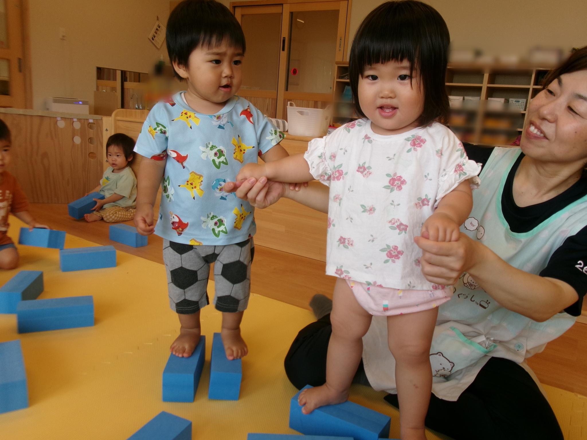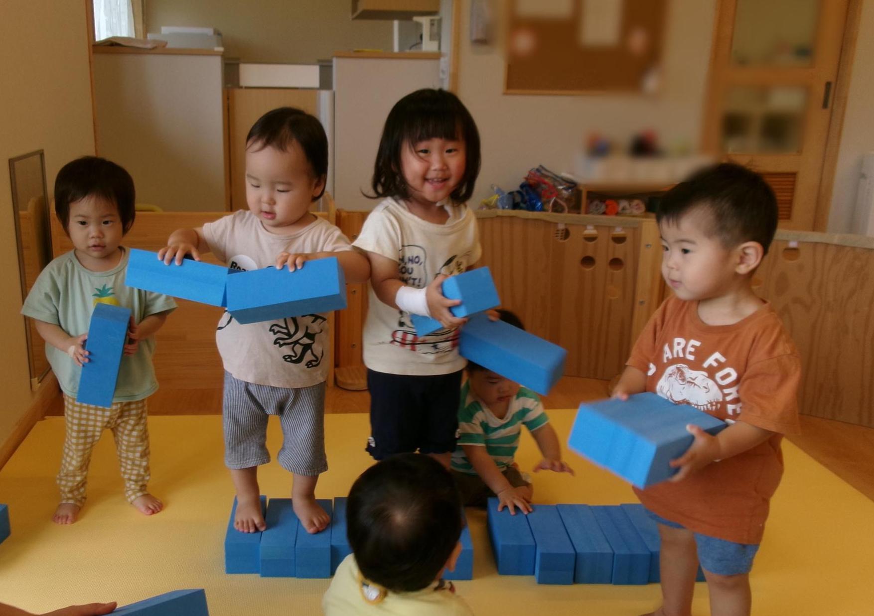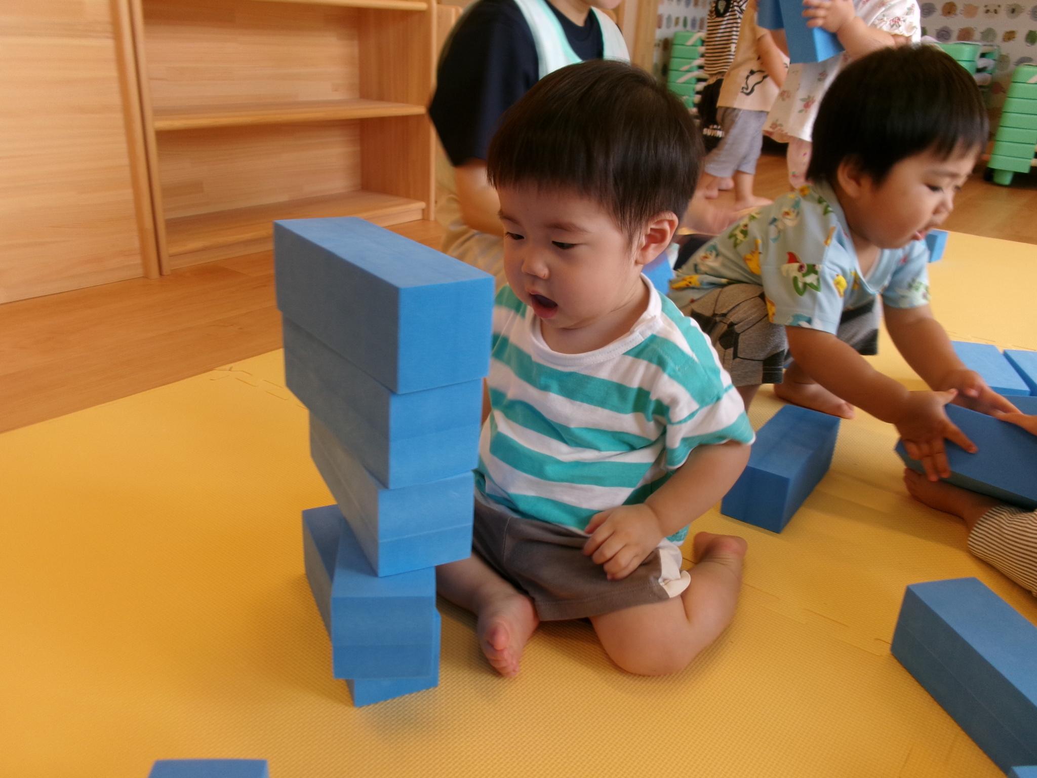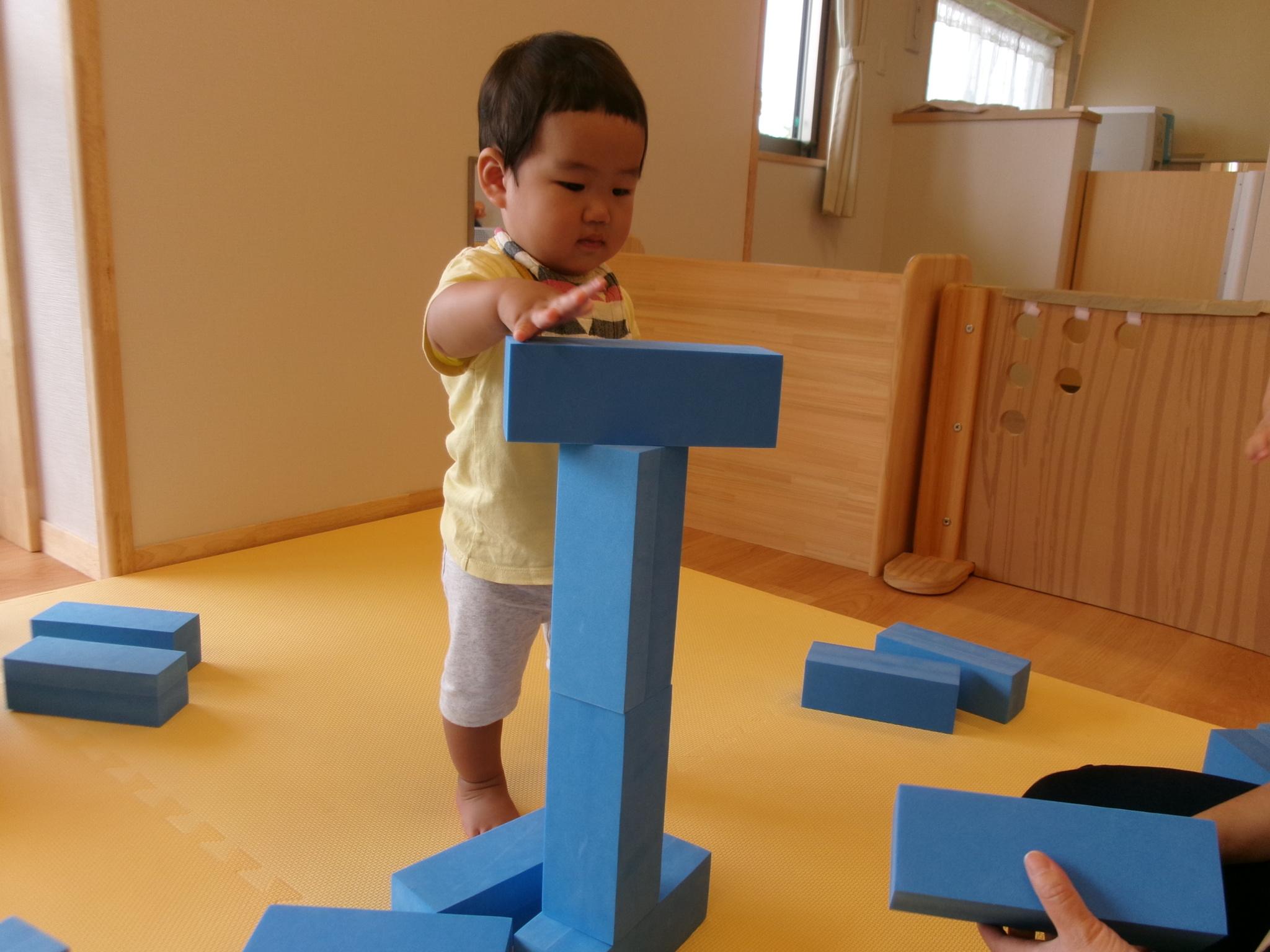 ソフトブロックを縦や横向きにして積み重ねたり、上に乗ってバランスをとってみたりし遊びました。柔らかくて気持ち良い素材を感じながら楽しみました。