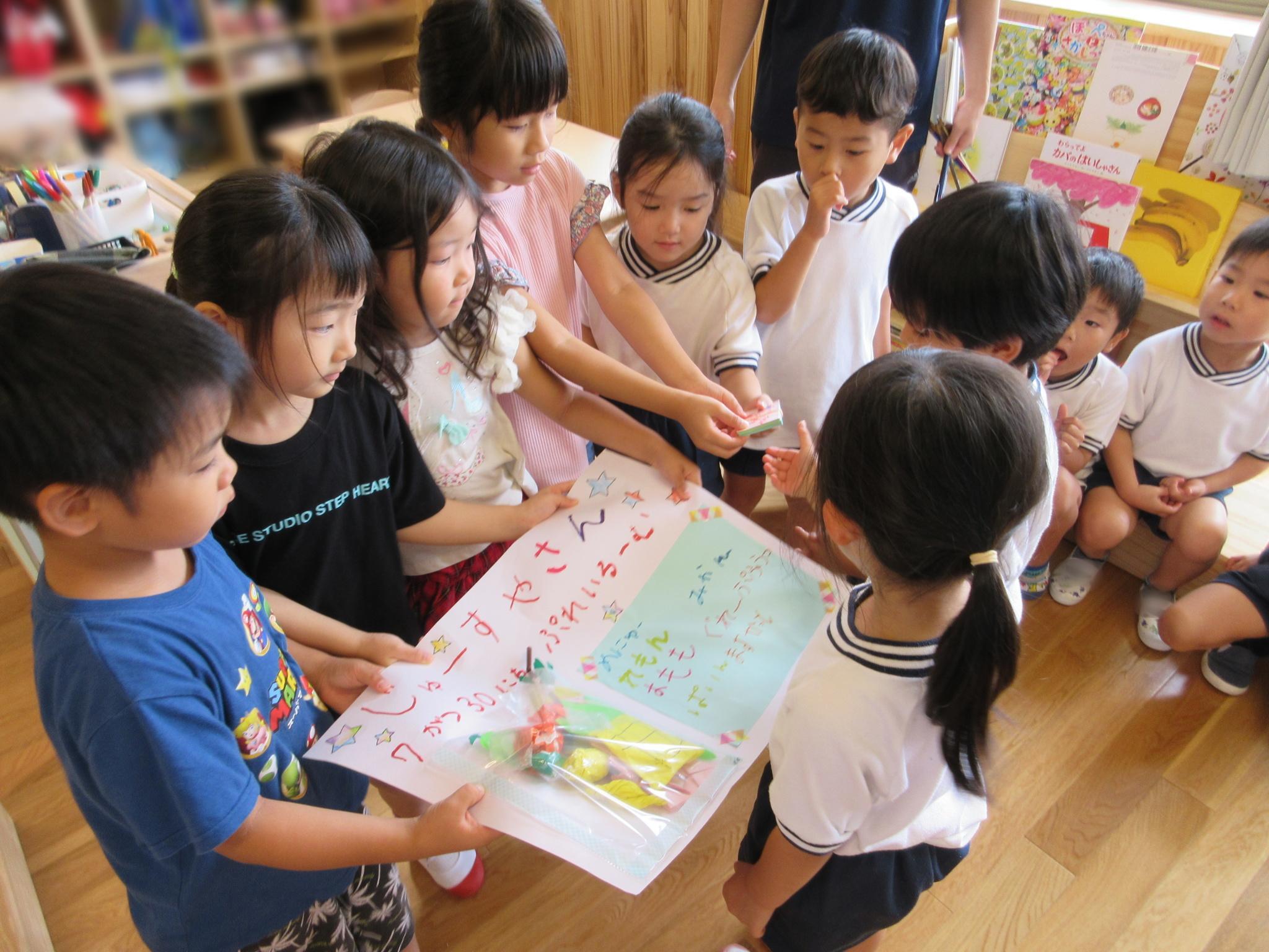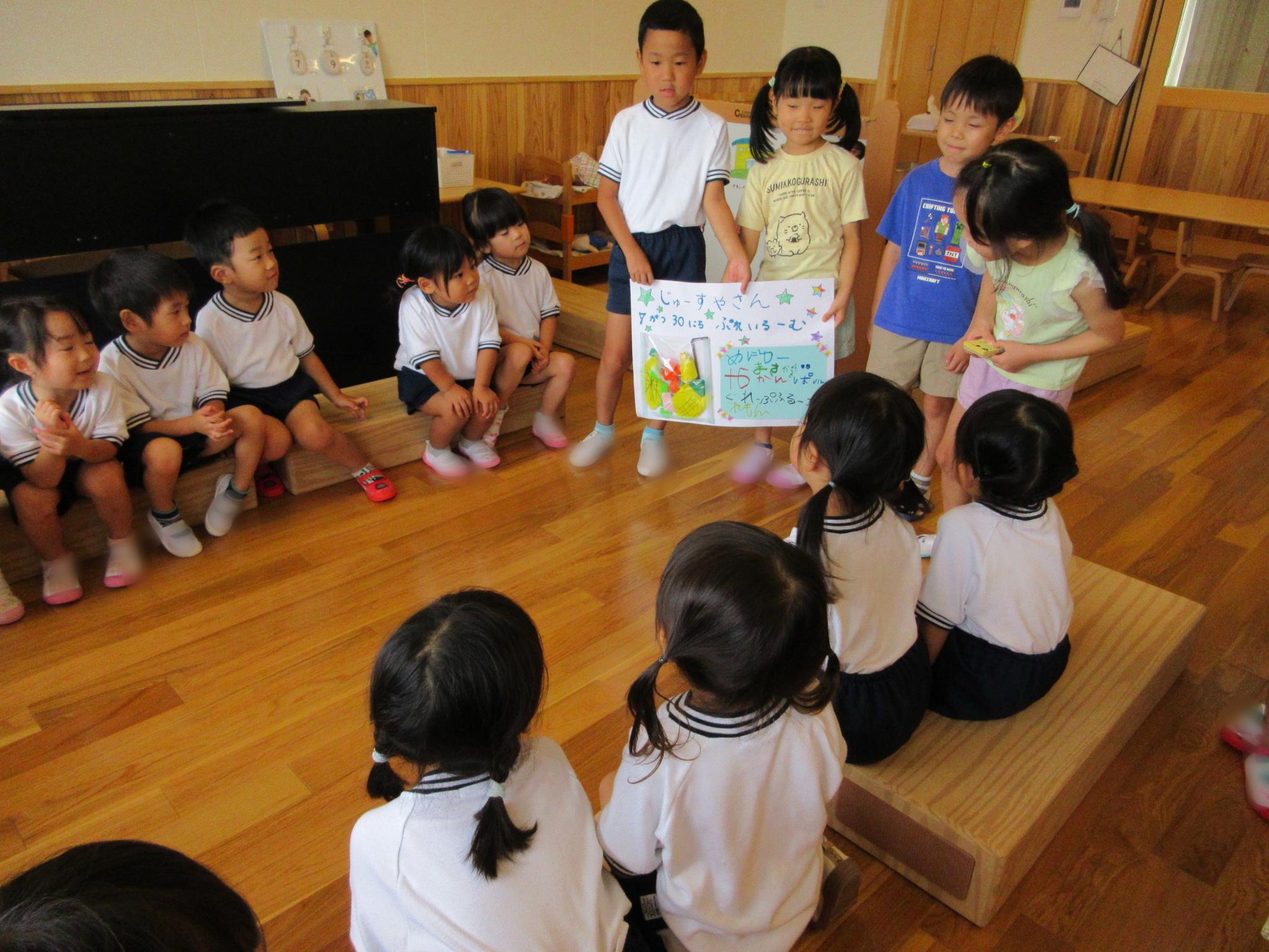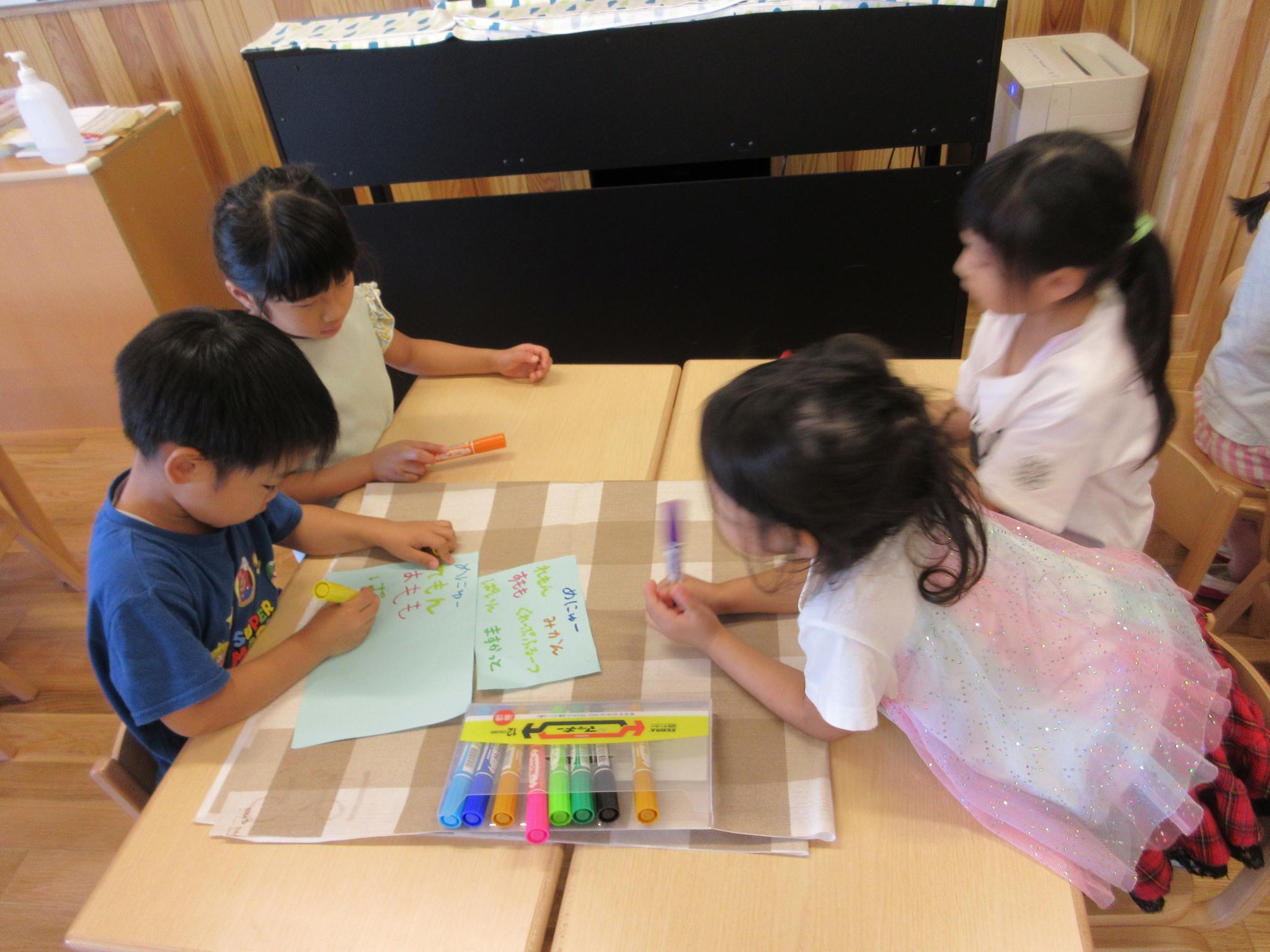 ジュース屋さんに向けてポスターやチケットづくりをみんなで話し合いアイデアを出し合いながら進めています!今日は完成したポスターやチケットを届け「ジュースを飲みに来てください!」「レモンとパインと・・・」と一生懸命説明している子どもたちでした♪