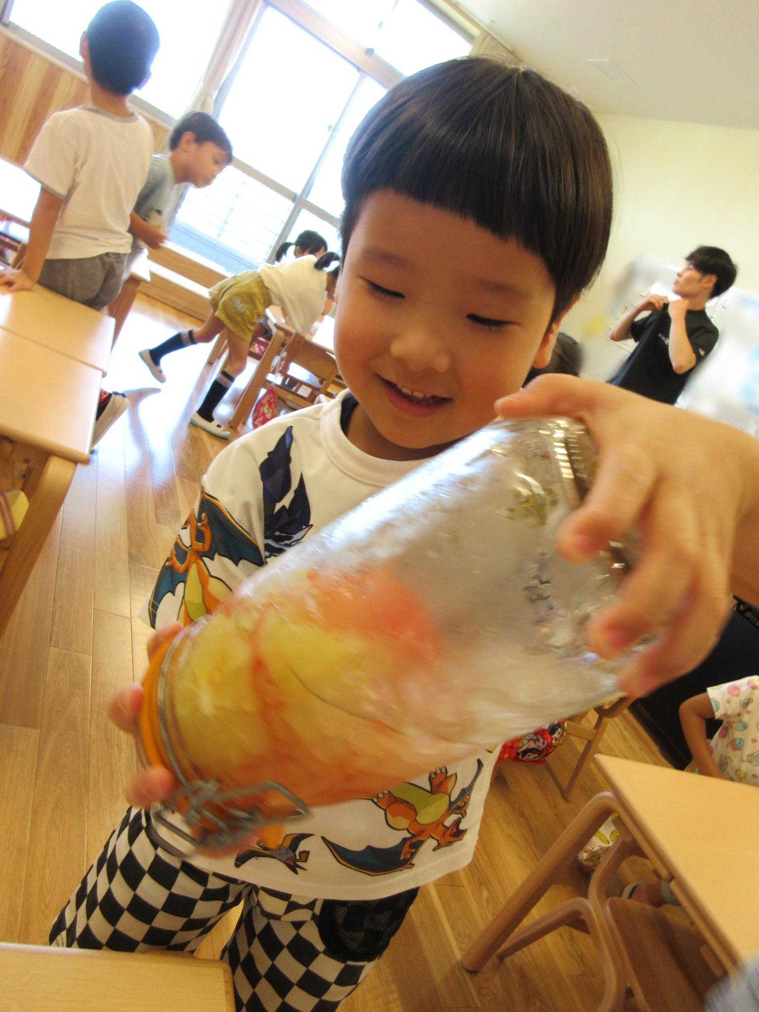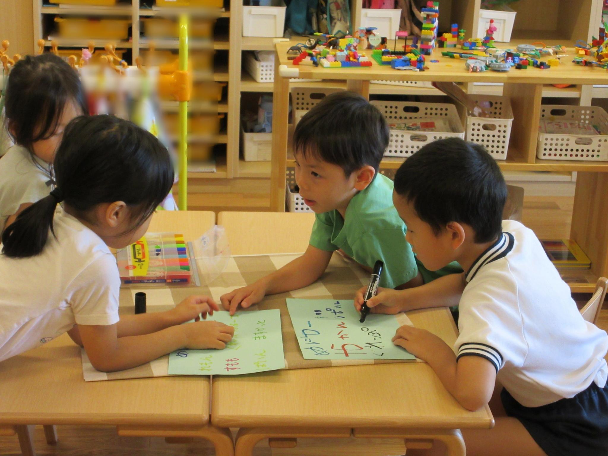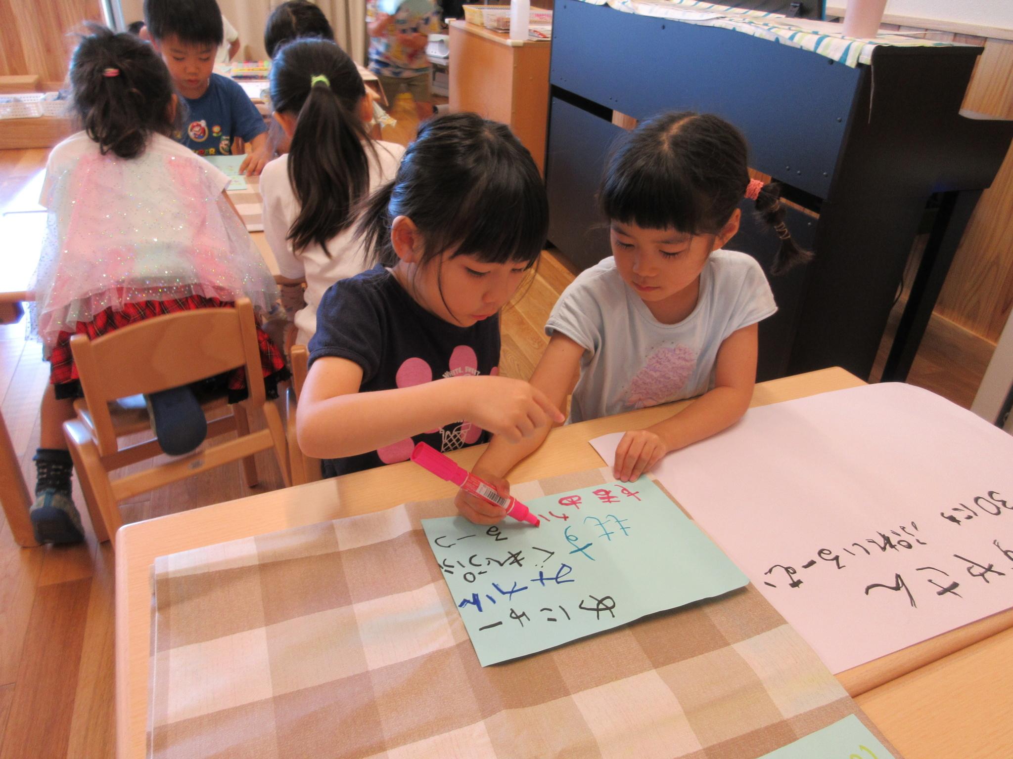 ジュース屋さんに向けてポスターやチケットづくりをみんなで話し合いアイデアを出し合いながら進めています!今日は完成したポスターやチケットを届け「ジュースを飲みに来てください!」「レモンとパインと・・・」と一生懸命説明している子どもたちでした♪