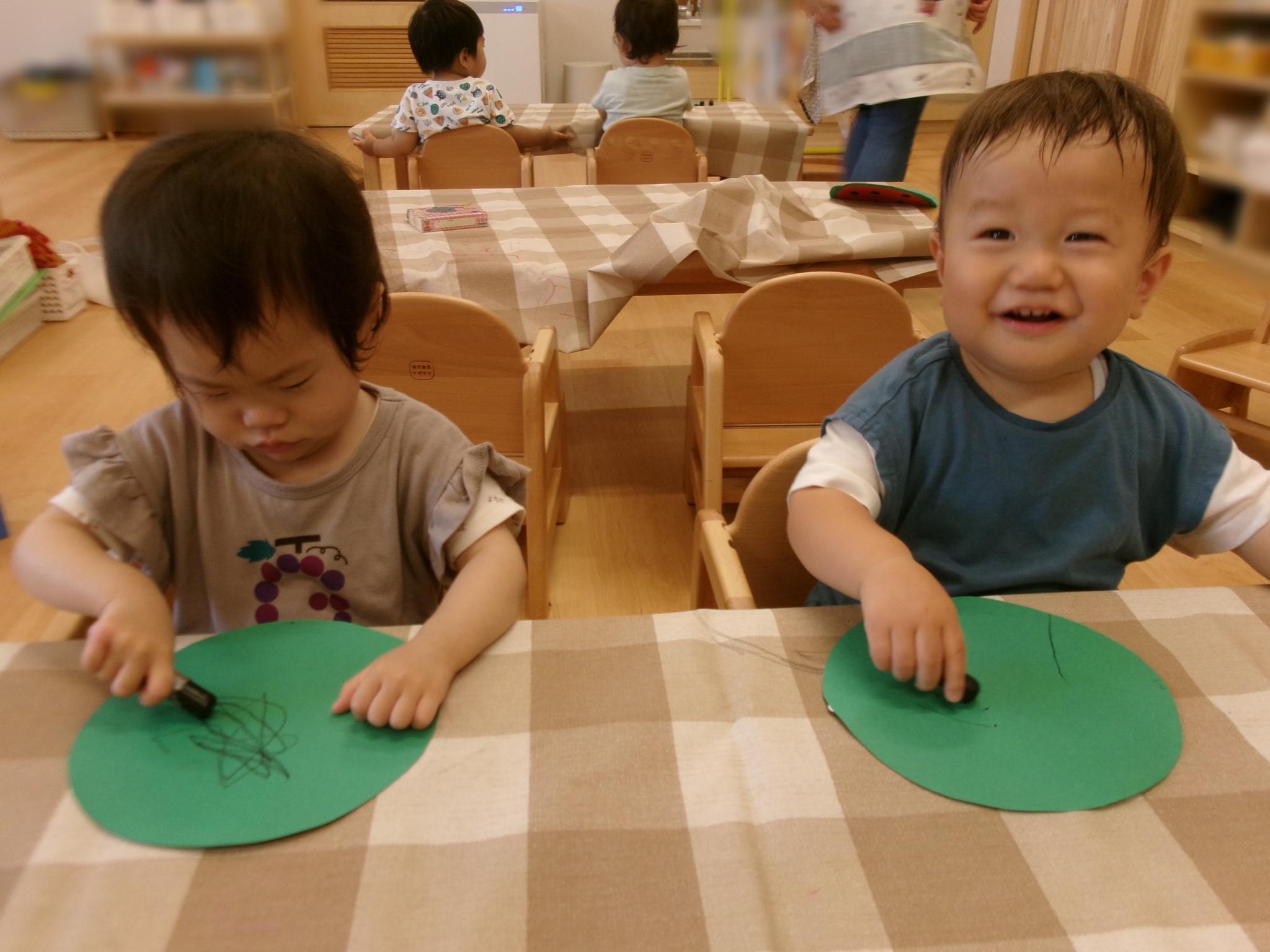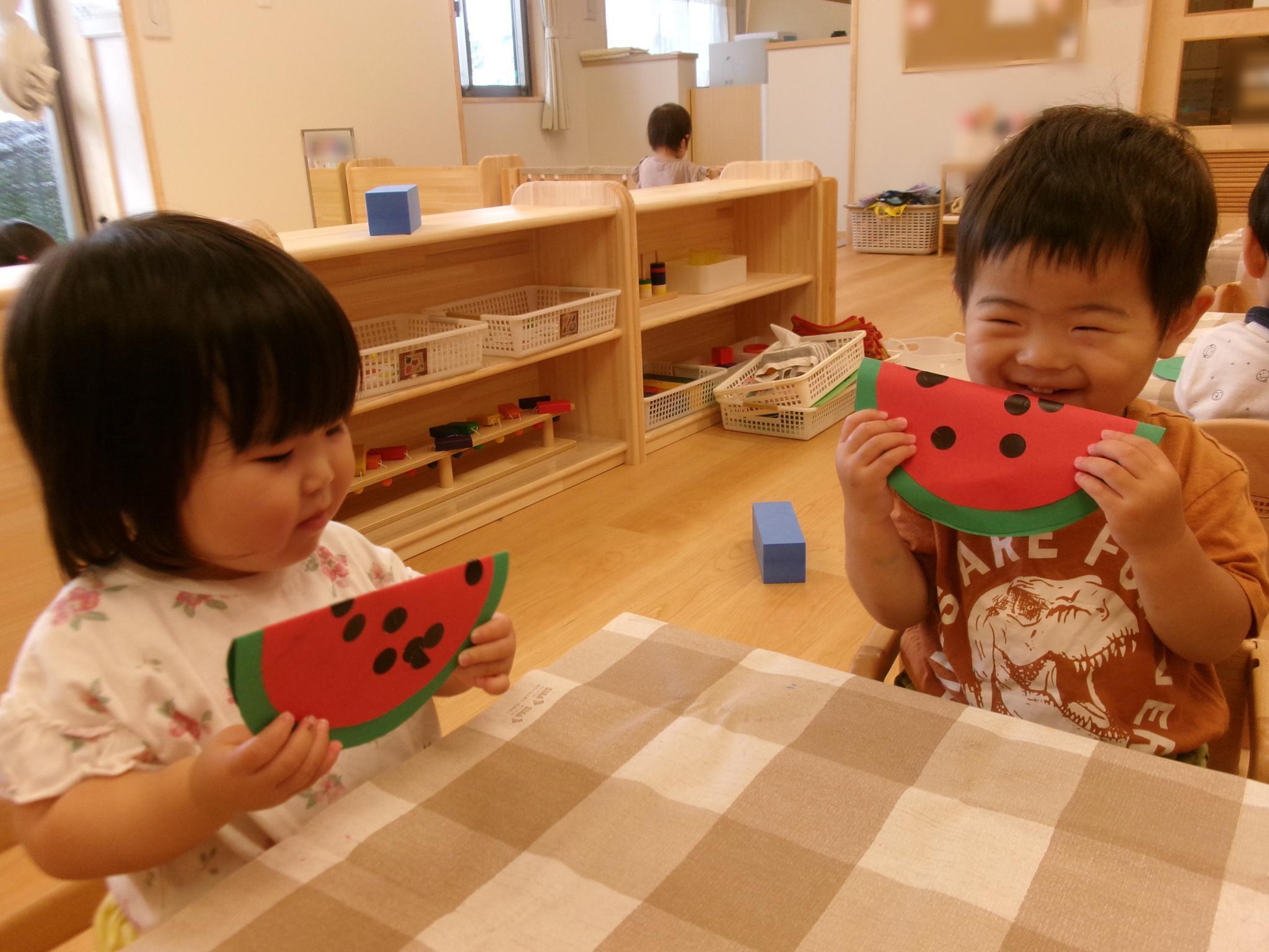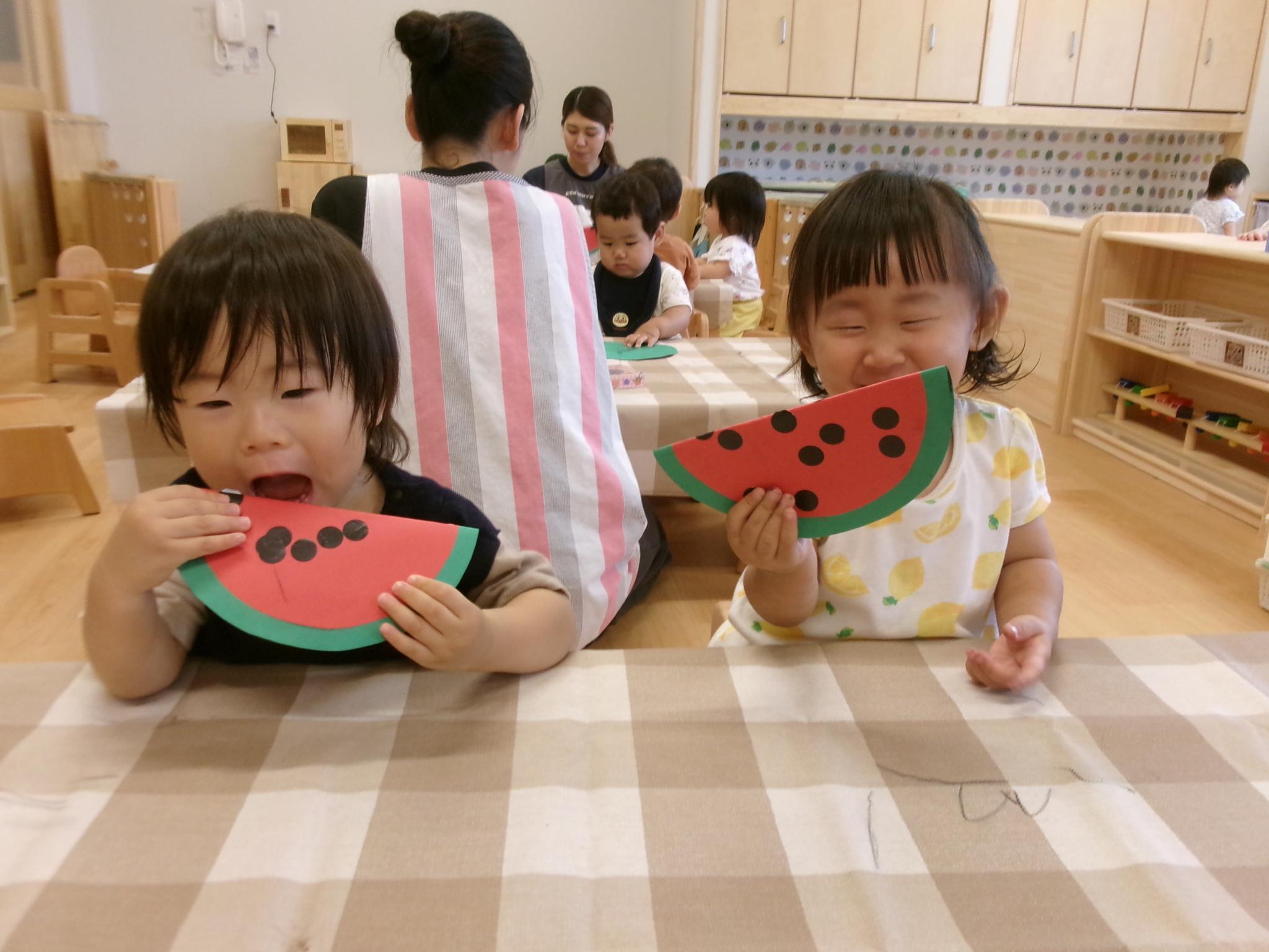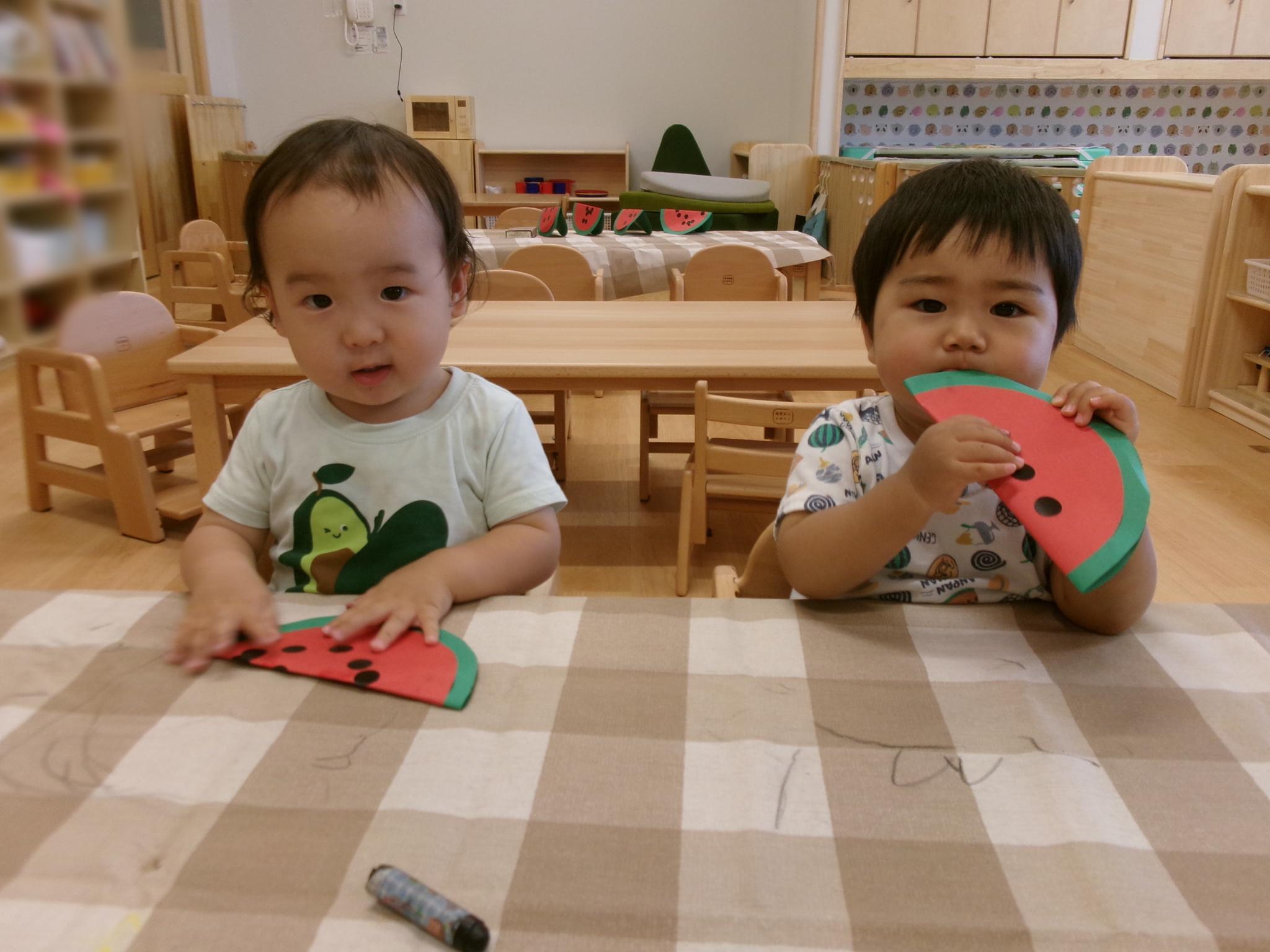 すいかのタネに見立てたシールを貼ったり、クレヨンですいかの模様を描いたりして、すいかを作りました。完成したすいかをパクッと食べる真似をしていてかわいい子どもたちでした!