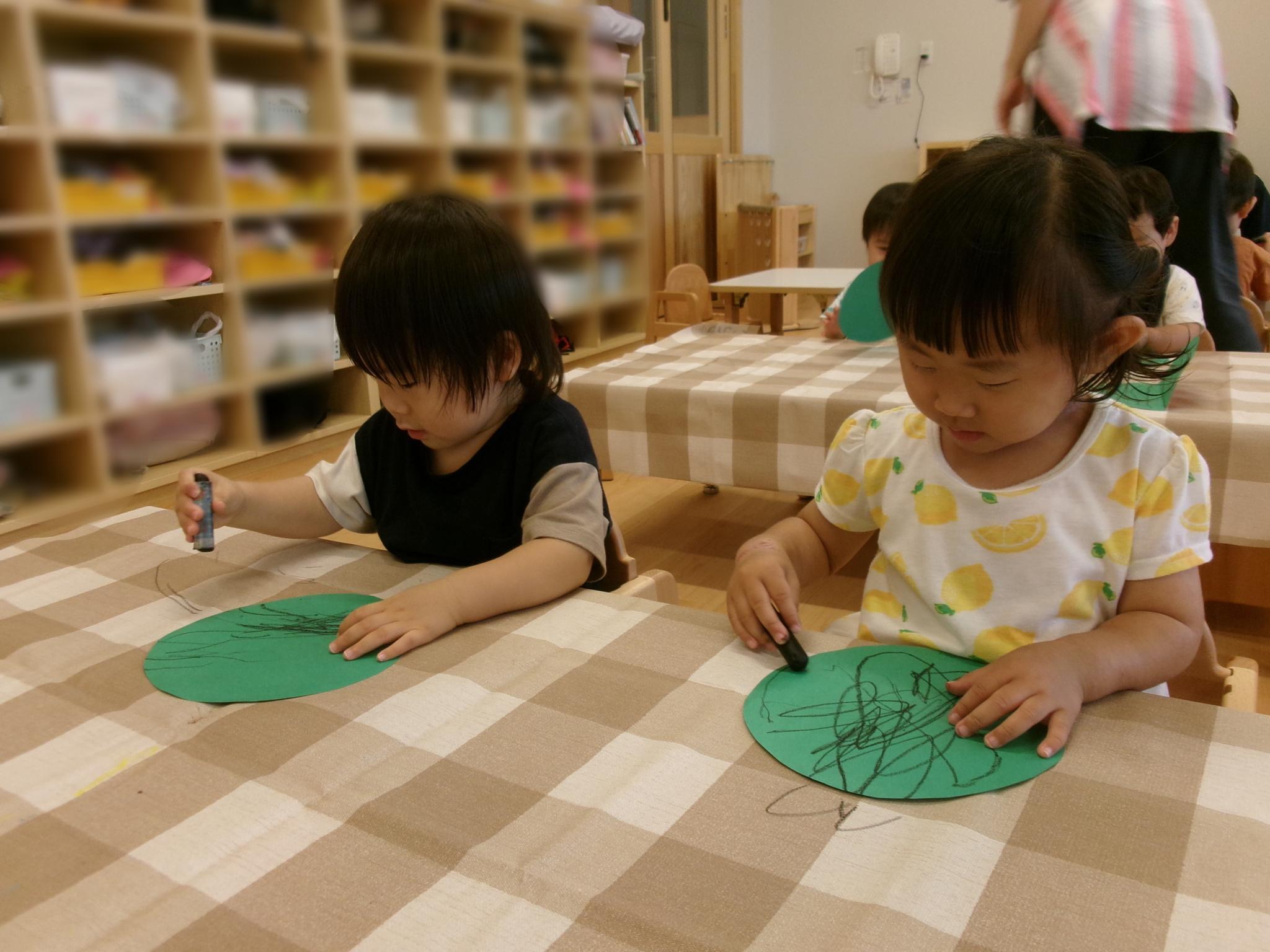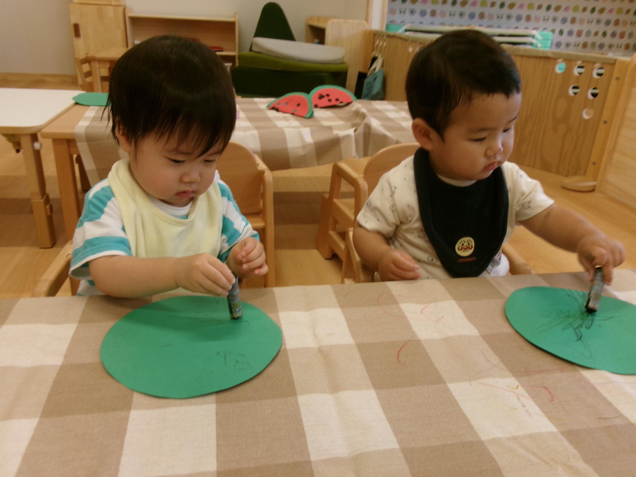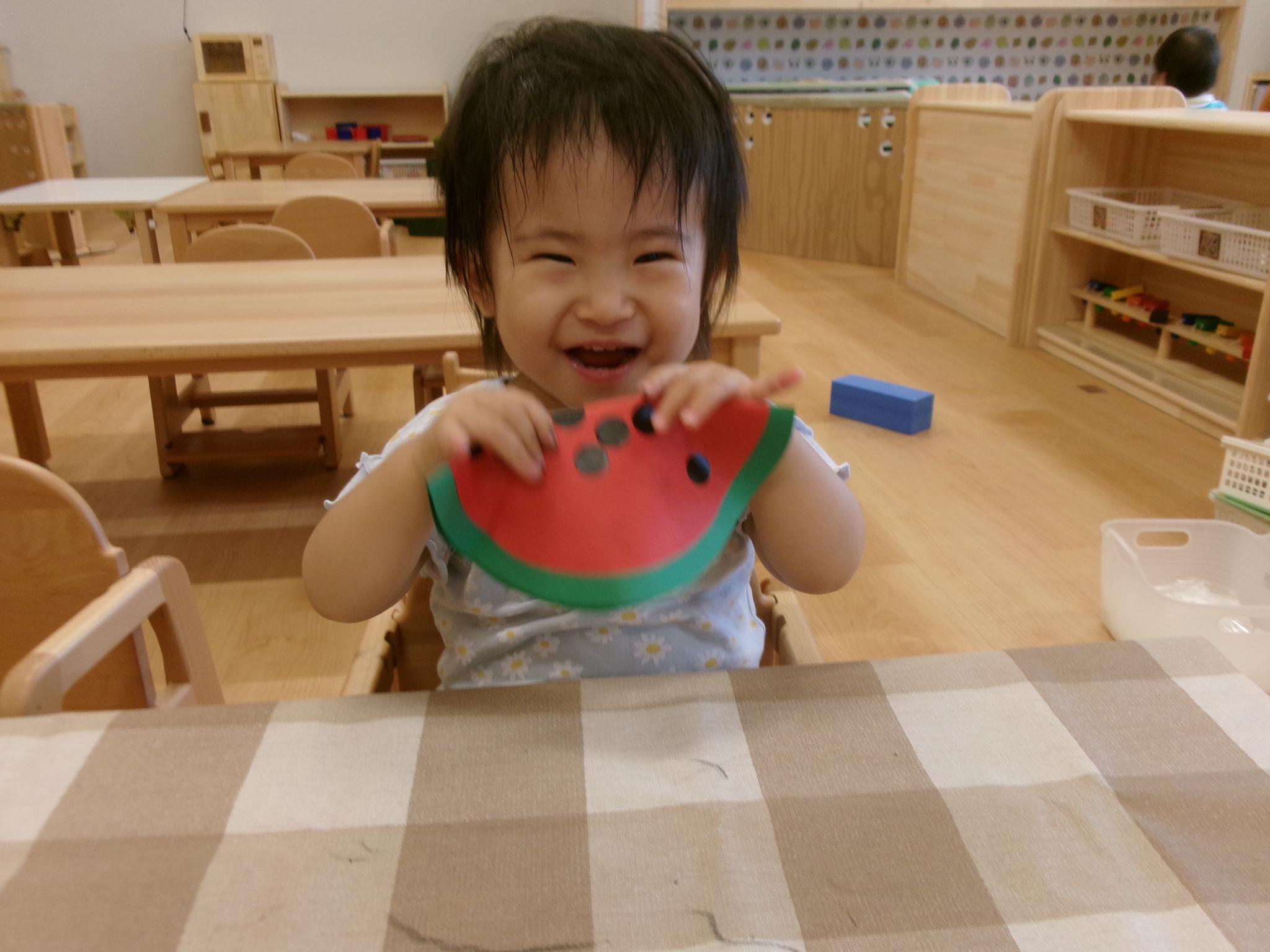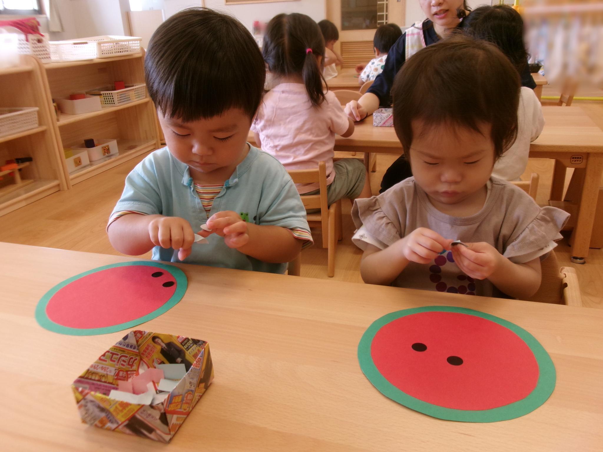 すいかのタネに見立てたシールを貼ったり、クレヨンですいかの模様を描いたりして、すいかを作りました。完成したすいかをパクッと食べる真似をしていてかわいい子どもたちでした!