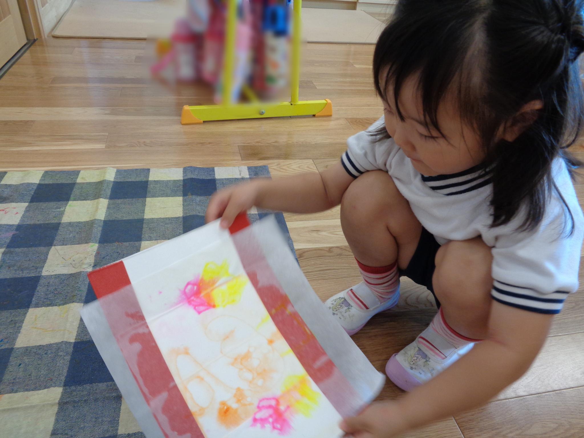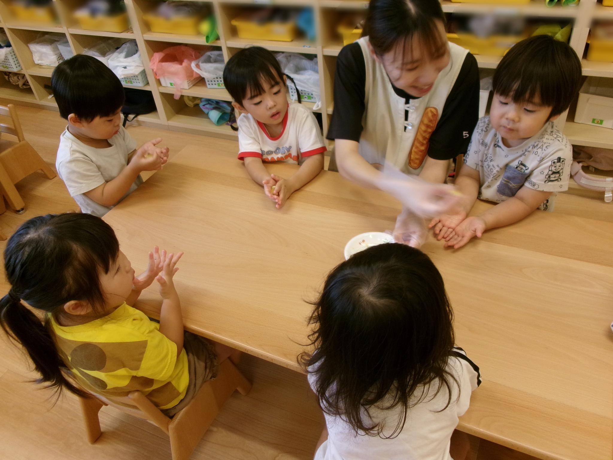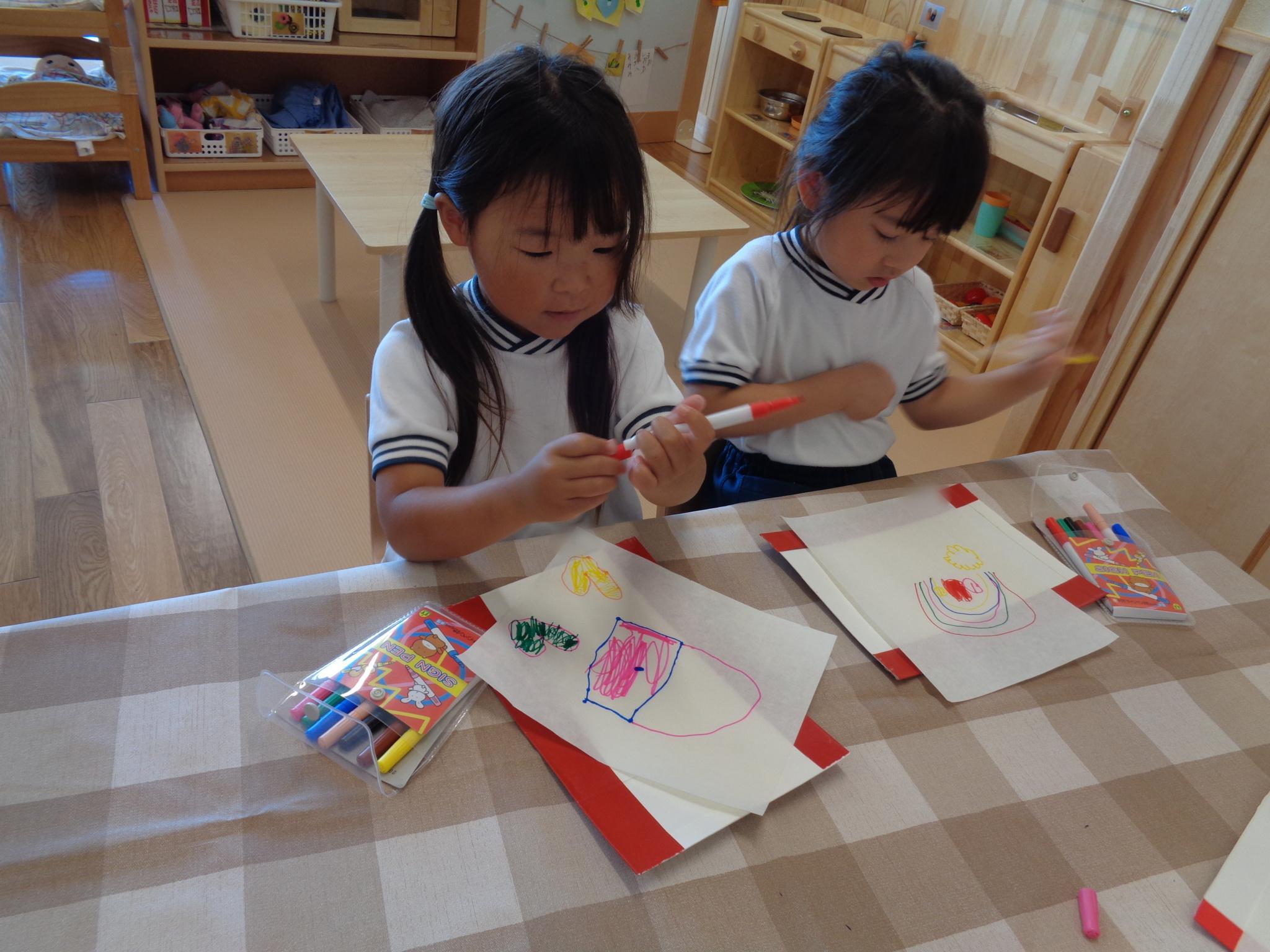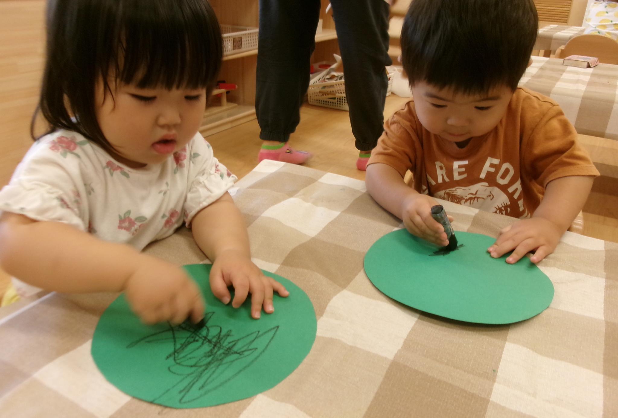 すいかのタネに見立てたシールを貼ったり、クレヨンですいかの模様を描いたりして、すいかを作りました。完成したすいかをパクッと食べる真似をしていてかわいい子どもたちでした!