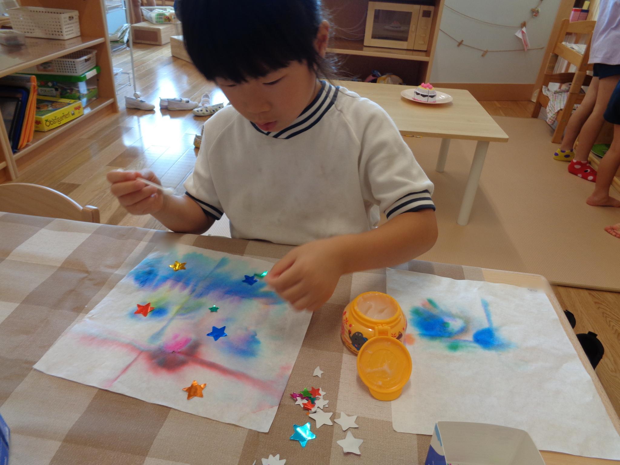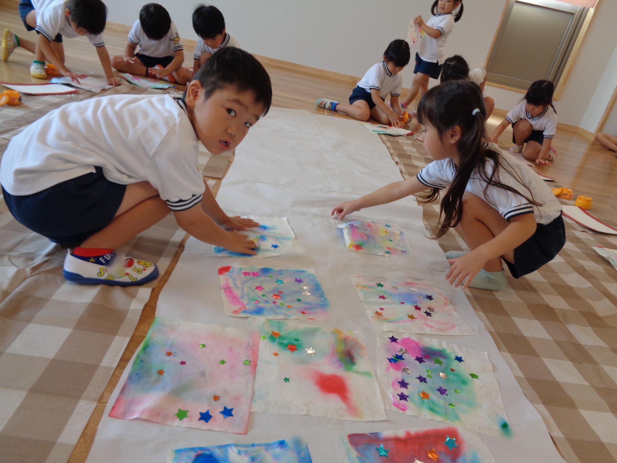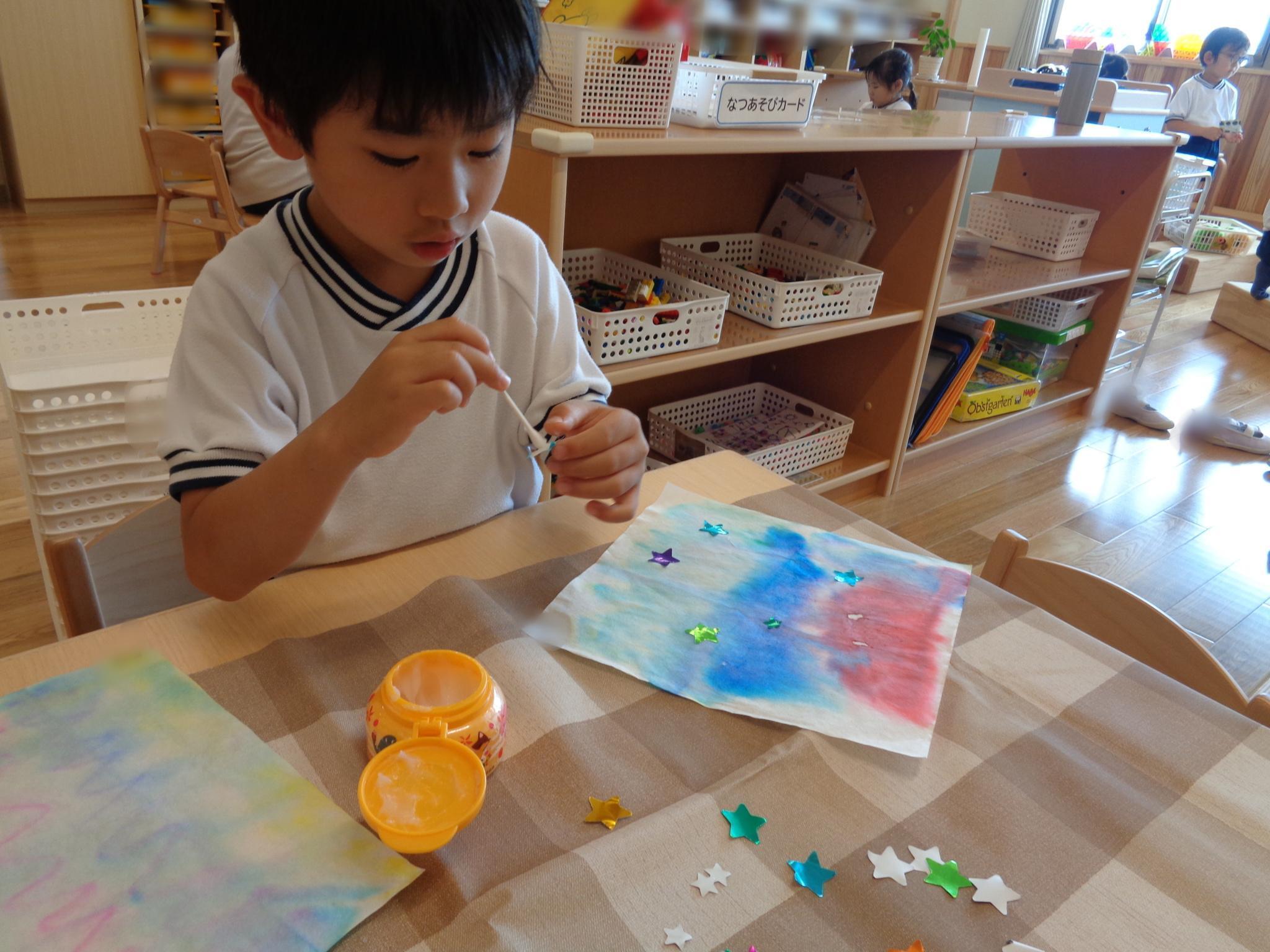にじみ絵をした和紙に星型を貼り、みんなで大きな天の川を作りました。自然と「ささのは~さ~らさら~♪」と歌い出す子もいて、七夕の気分いっぱいでした