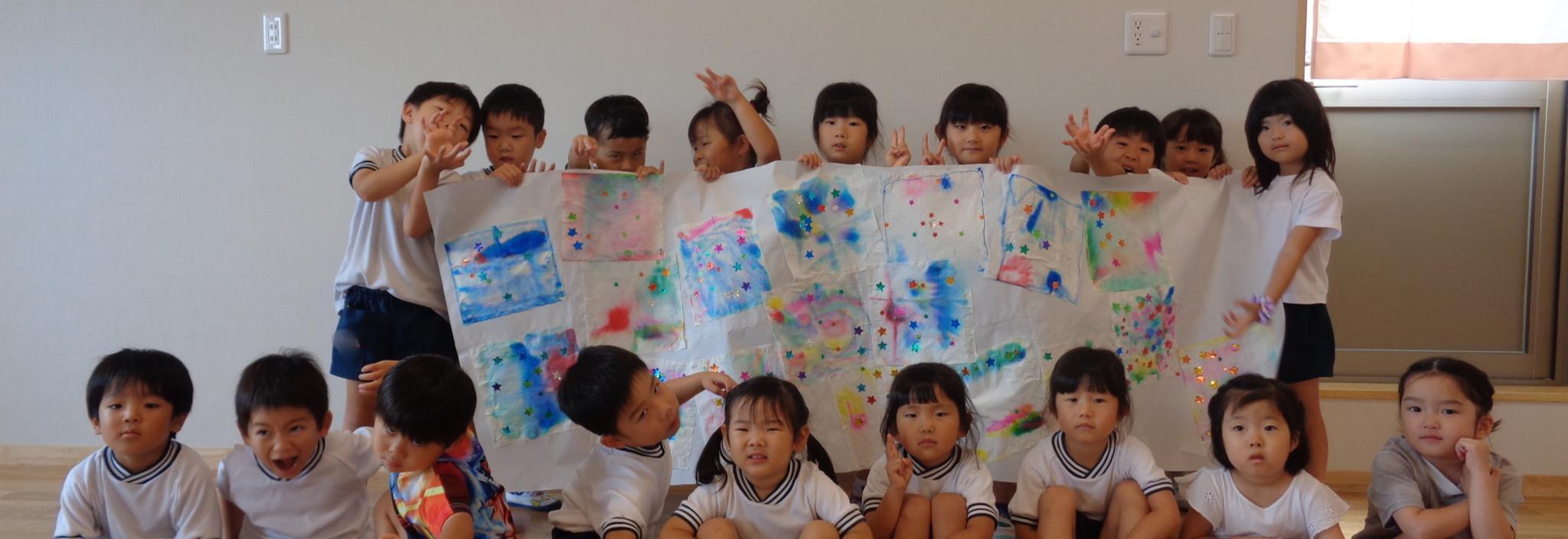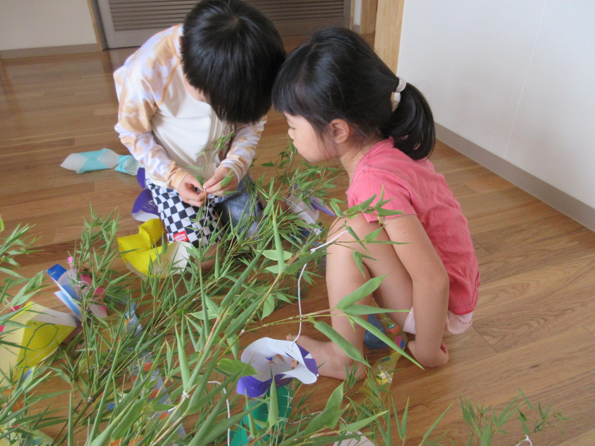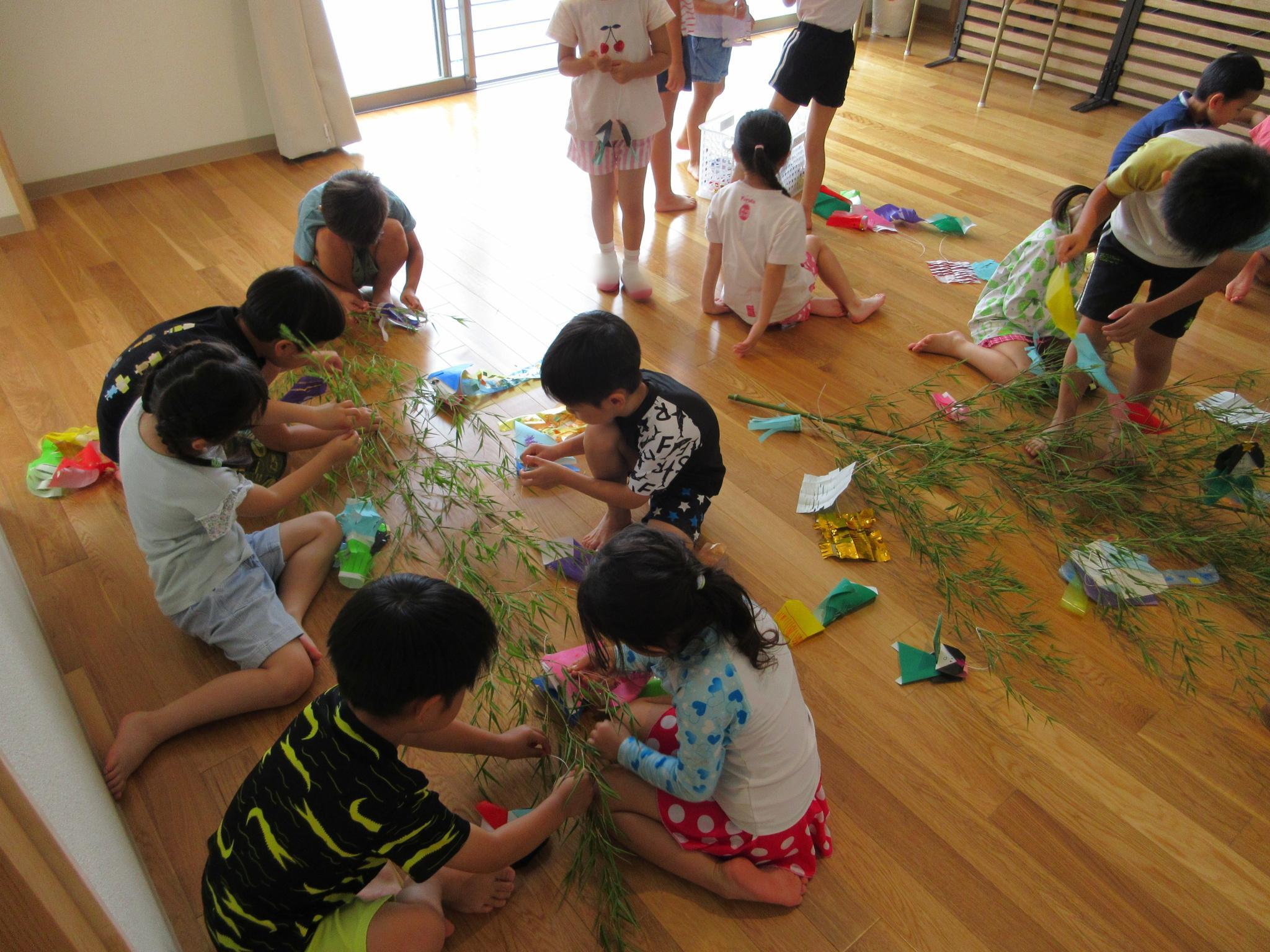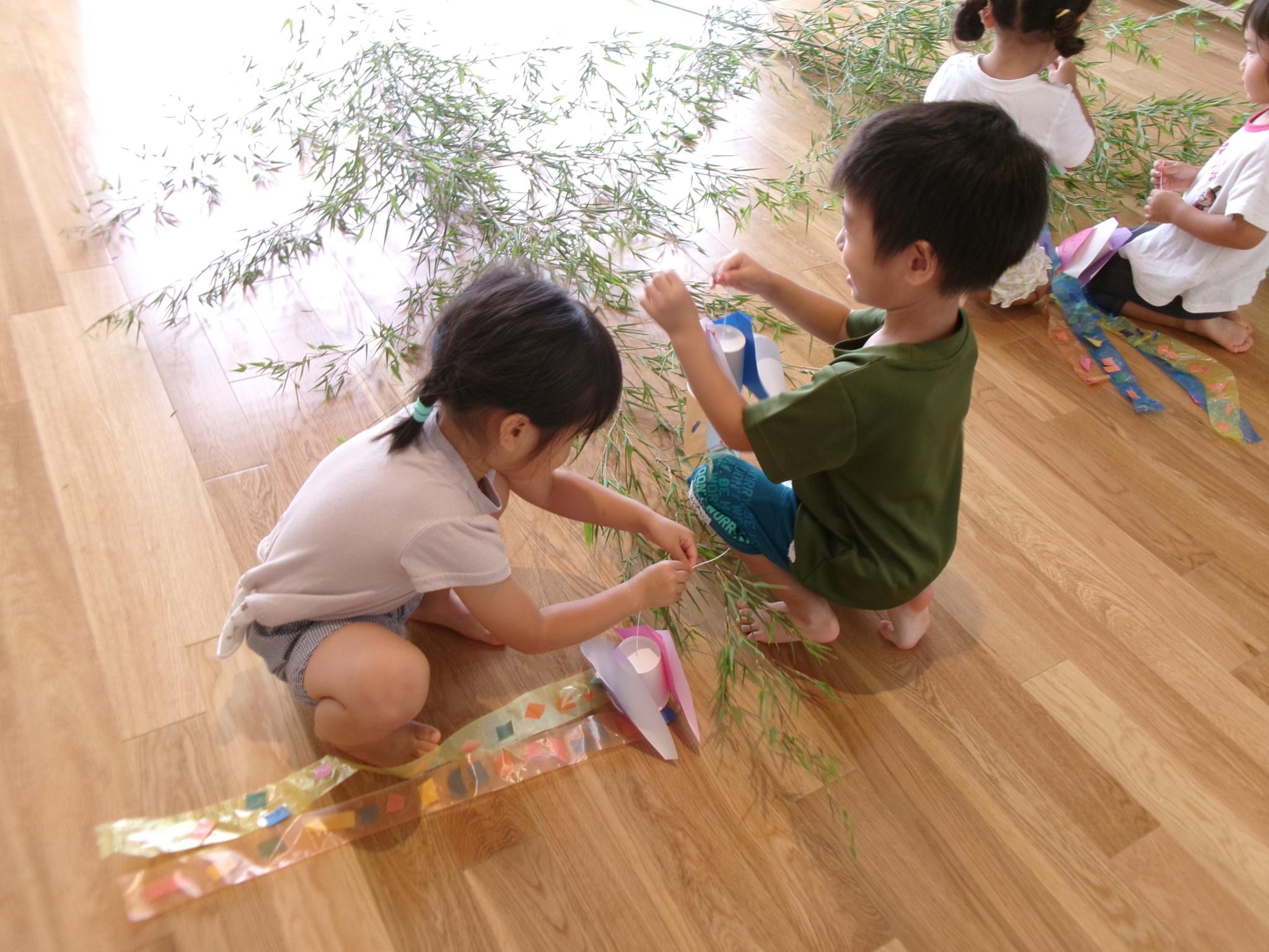 にじみ絵をした和紙に星型を貼り、みんなで大きな天の川を作りました。自然と「ささのは~さ~らさら~♪」と歌い出す子もいて、七夕の気分いっぱいでした