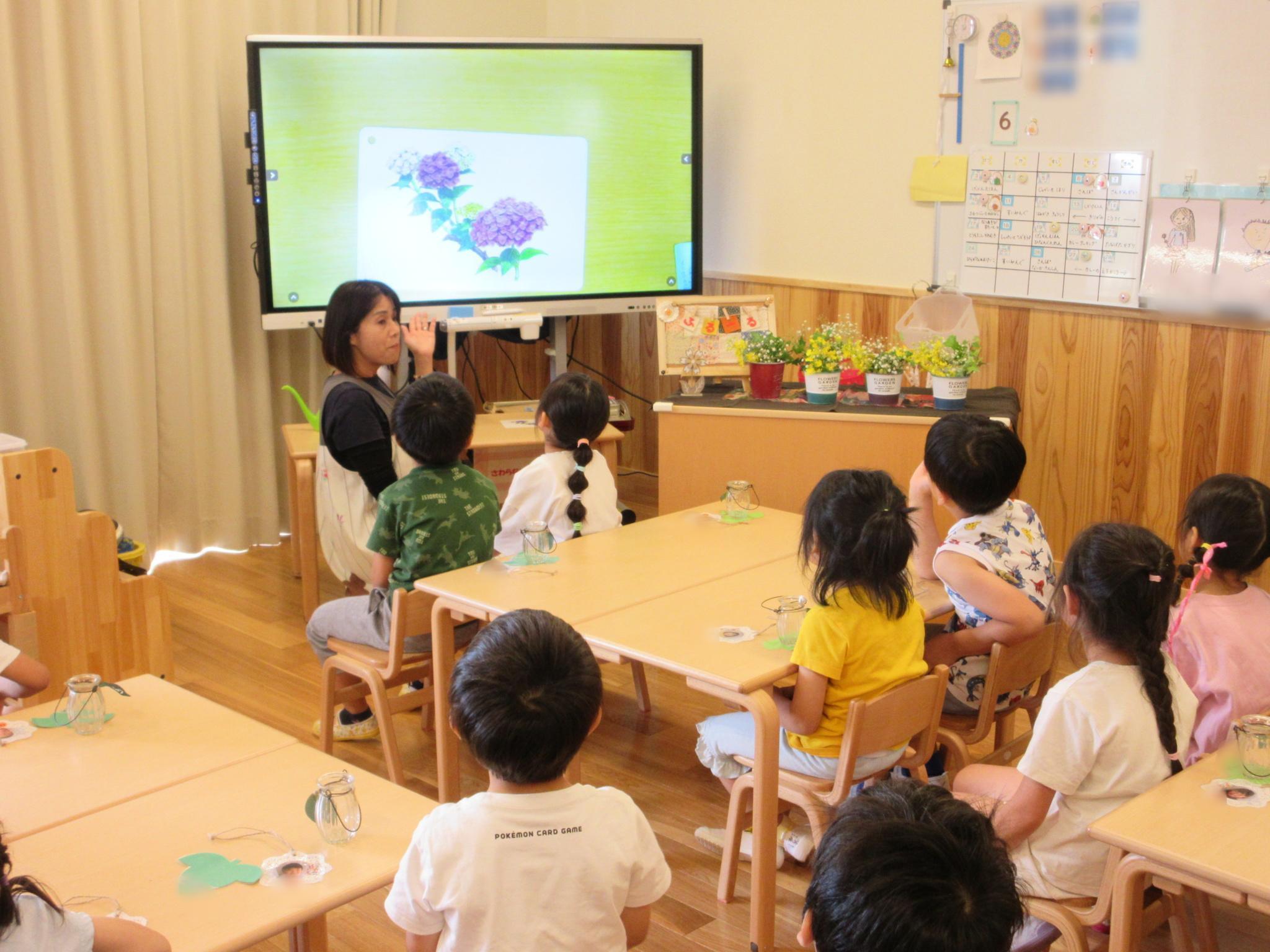 まずは、電子黒板で季節のお花を紹介をすると『あじさい』と大きな声で答えてくれました!