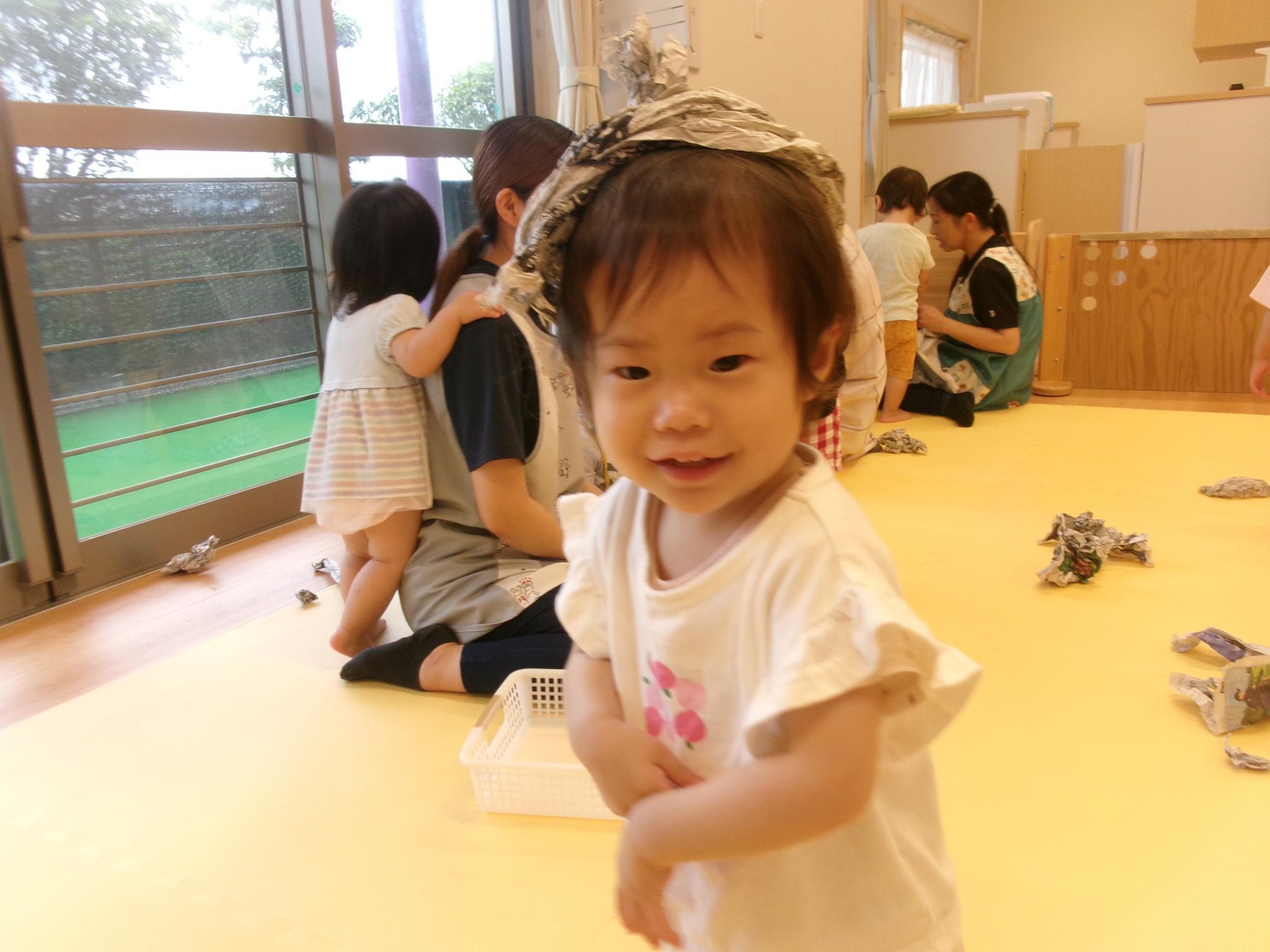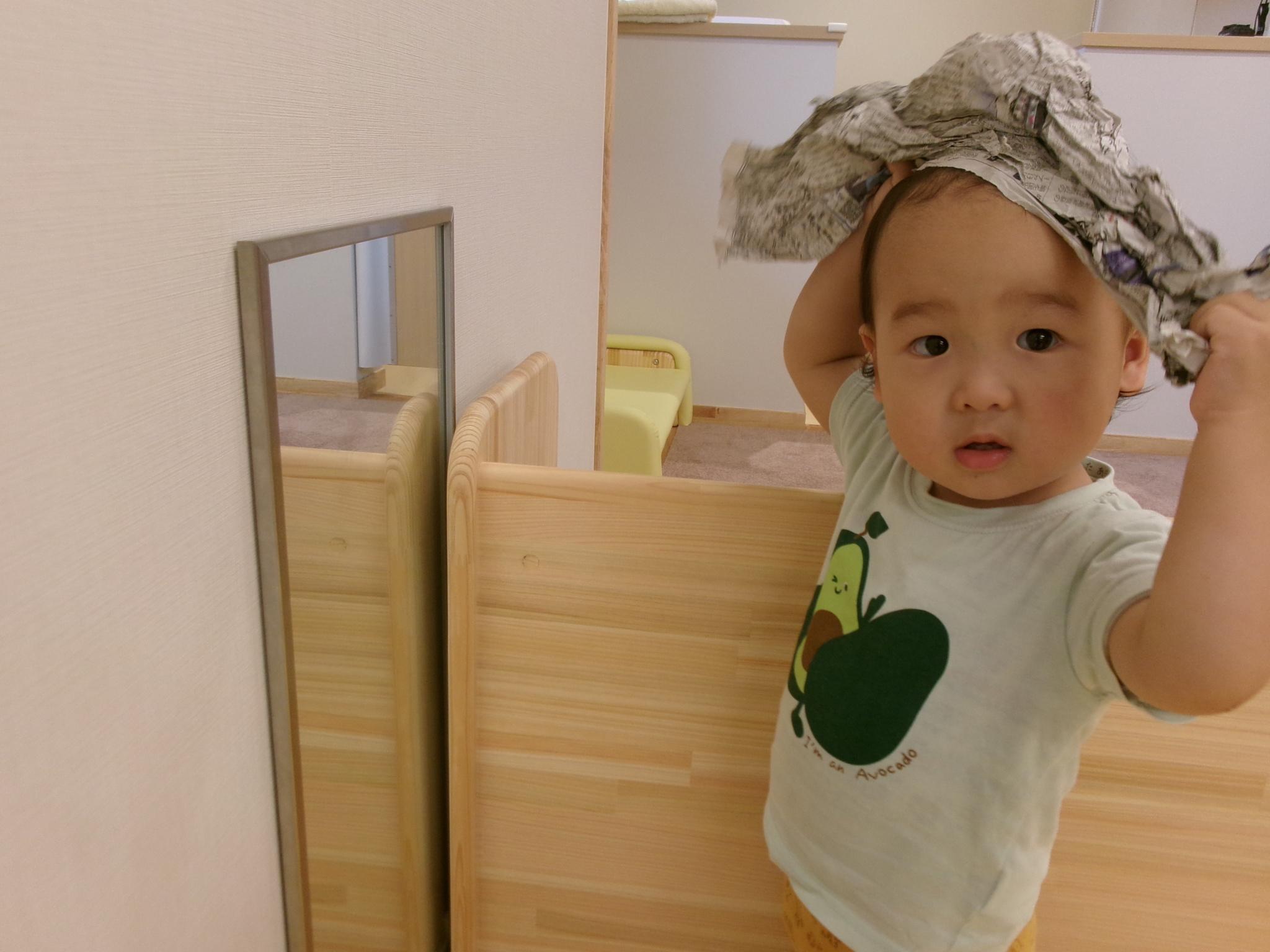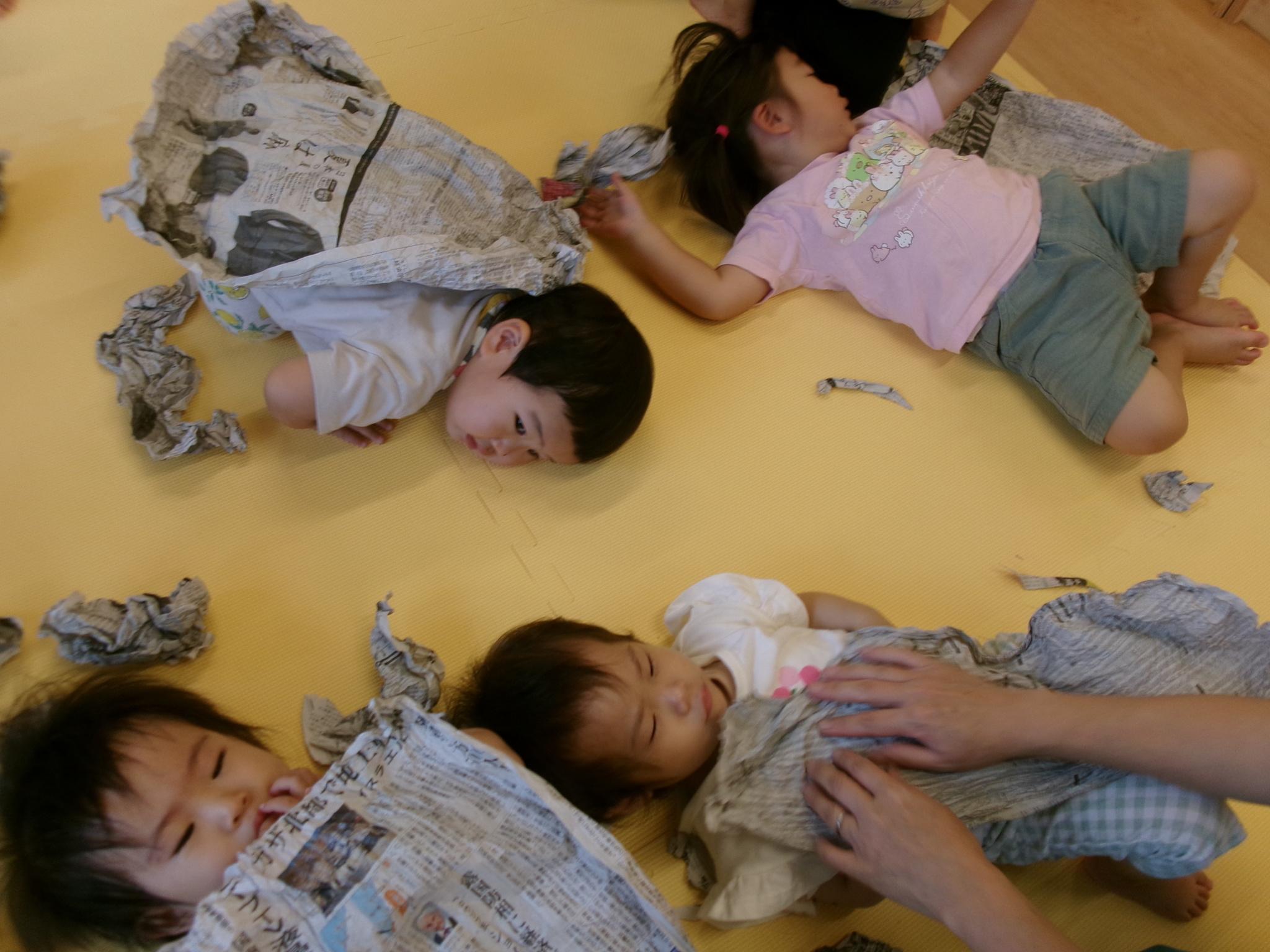 はじめての新聞遊びをしました。丸めてボールにしたり、帽子にしてかぶったり、お布団に変身したり・・・!遊び方いっぱいでたのしそうでした!!
