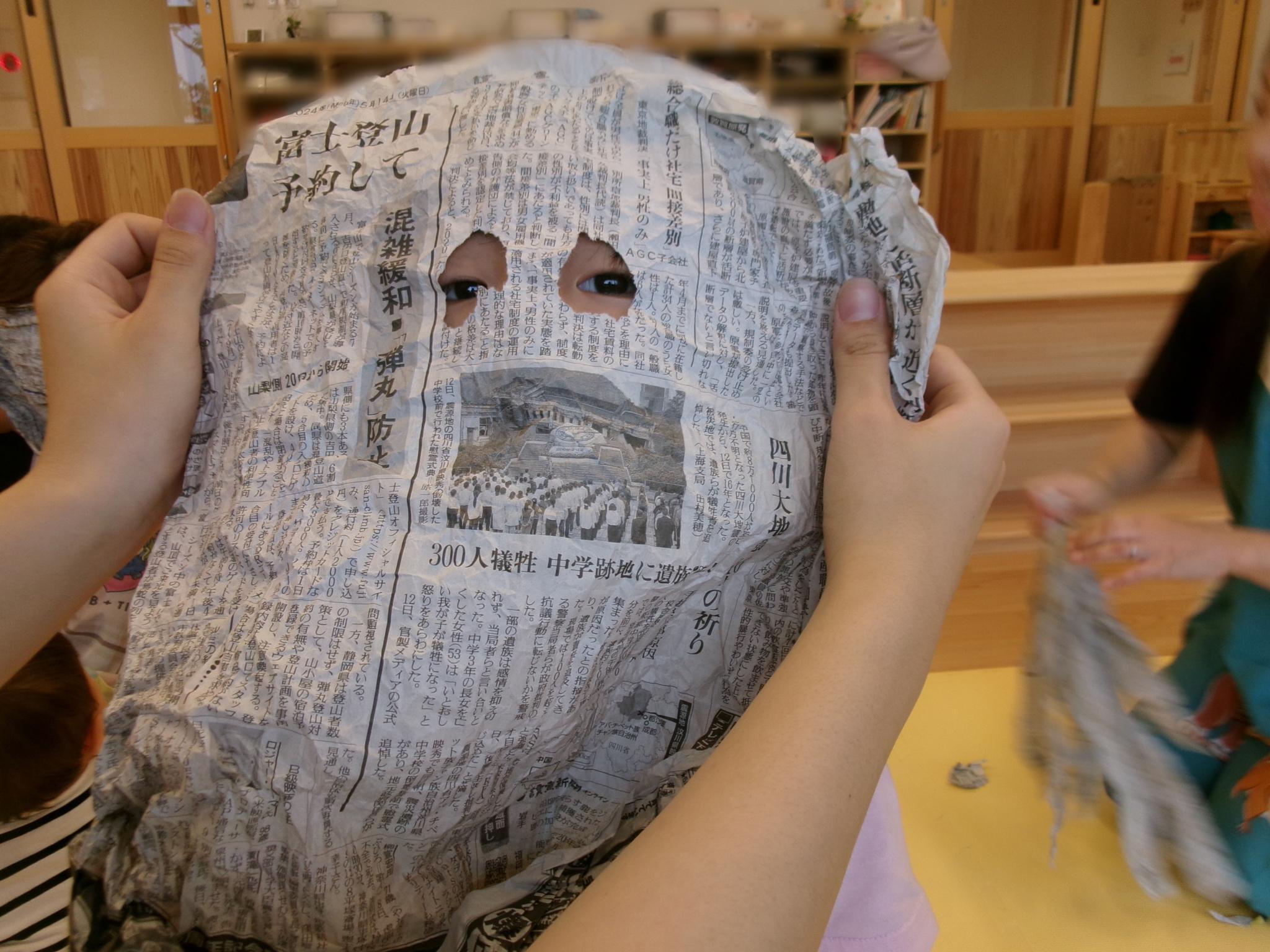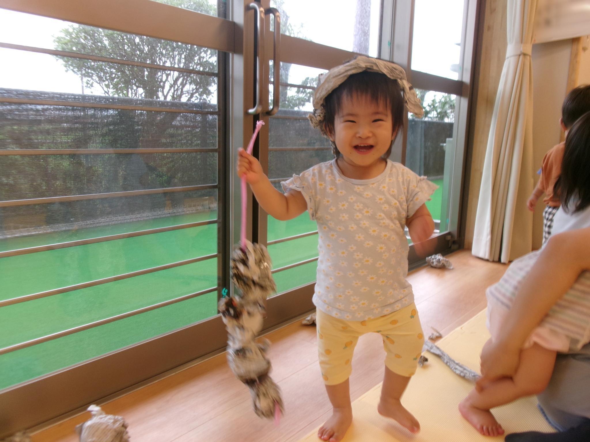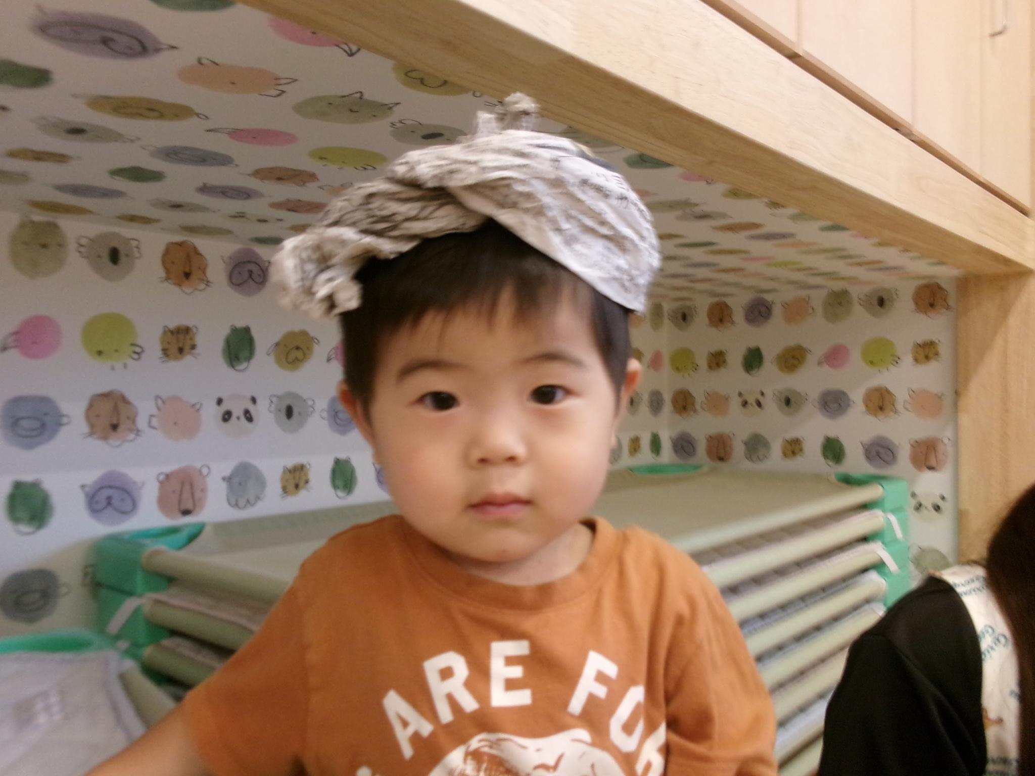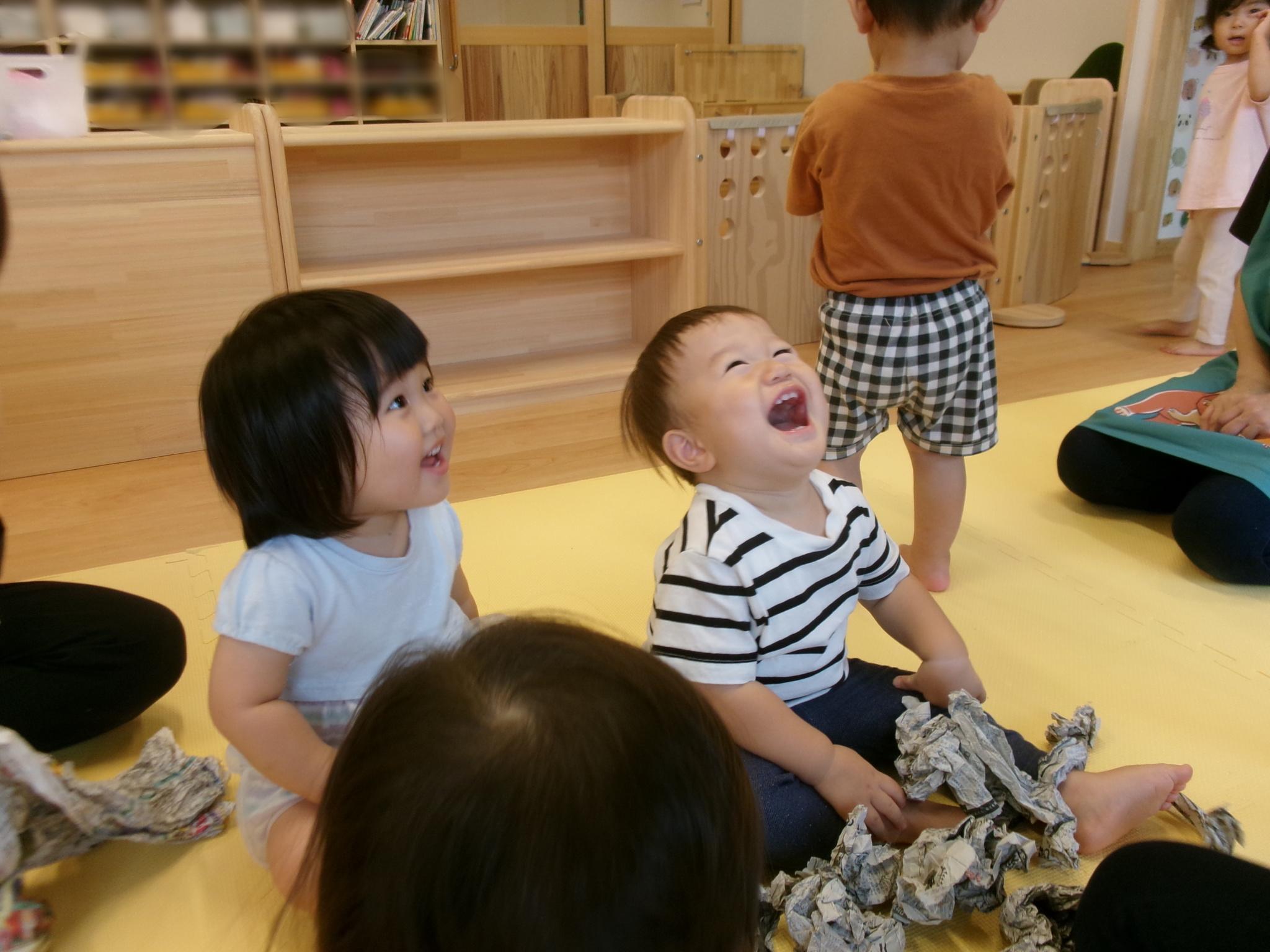 はじめての新聞遊びをしました。丸めてボールにしたり、帽子にしてかぶったり、お布団に変身したり・・・!遊び方いっぱいでたのしそうでした!!