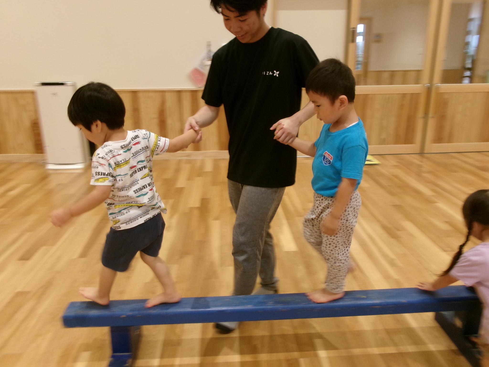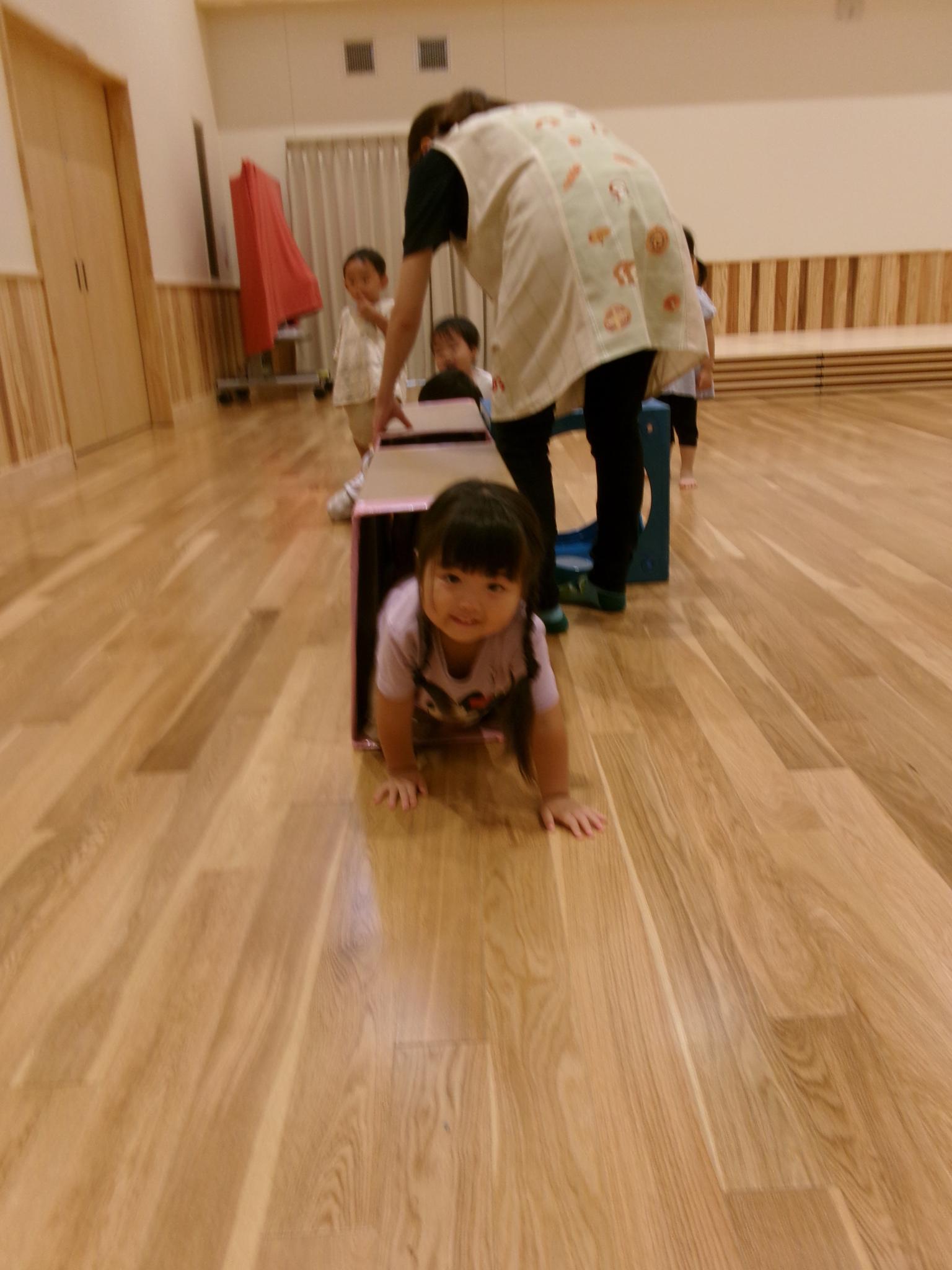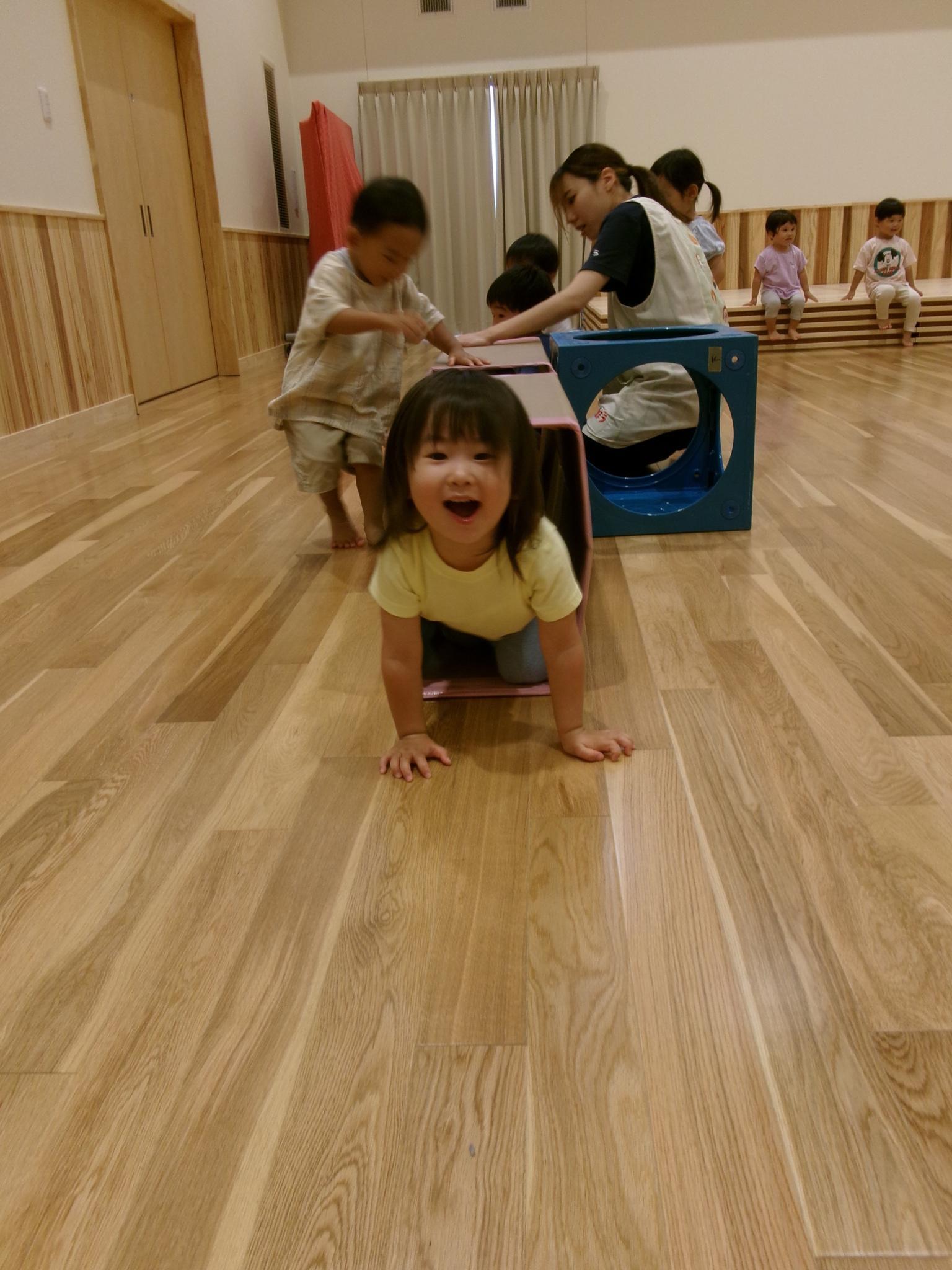 遊戯室で運動遊びをしました。平均台・ジャンプ台・山登り・フープ・ダンボールトンネルでサーキット。少し高い平均台やジャンプ台も保育者と手をつないで挑戦。元気いっぱいの子どもたちでした。