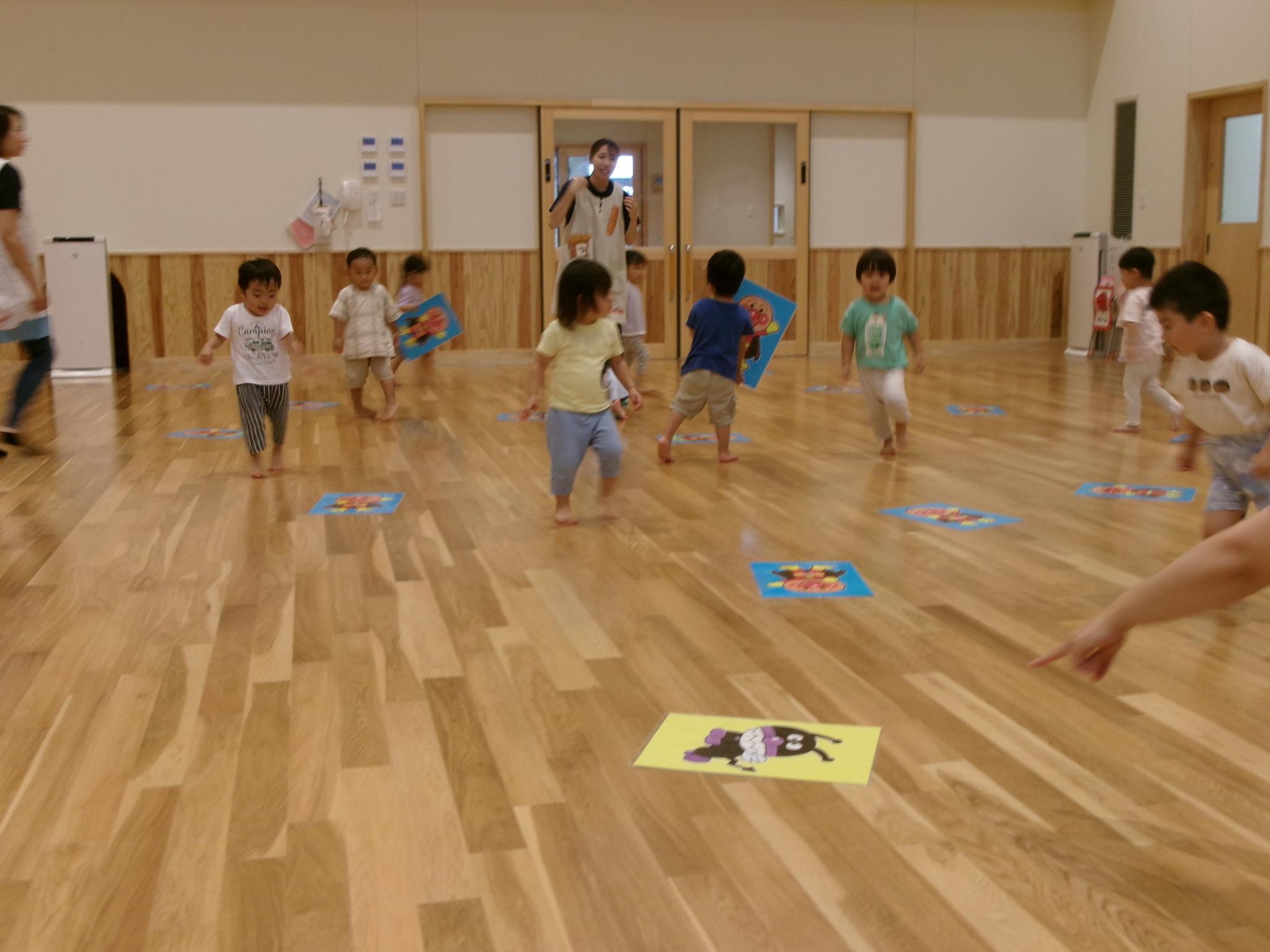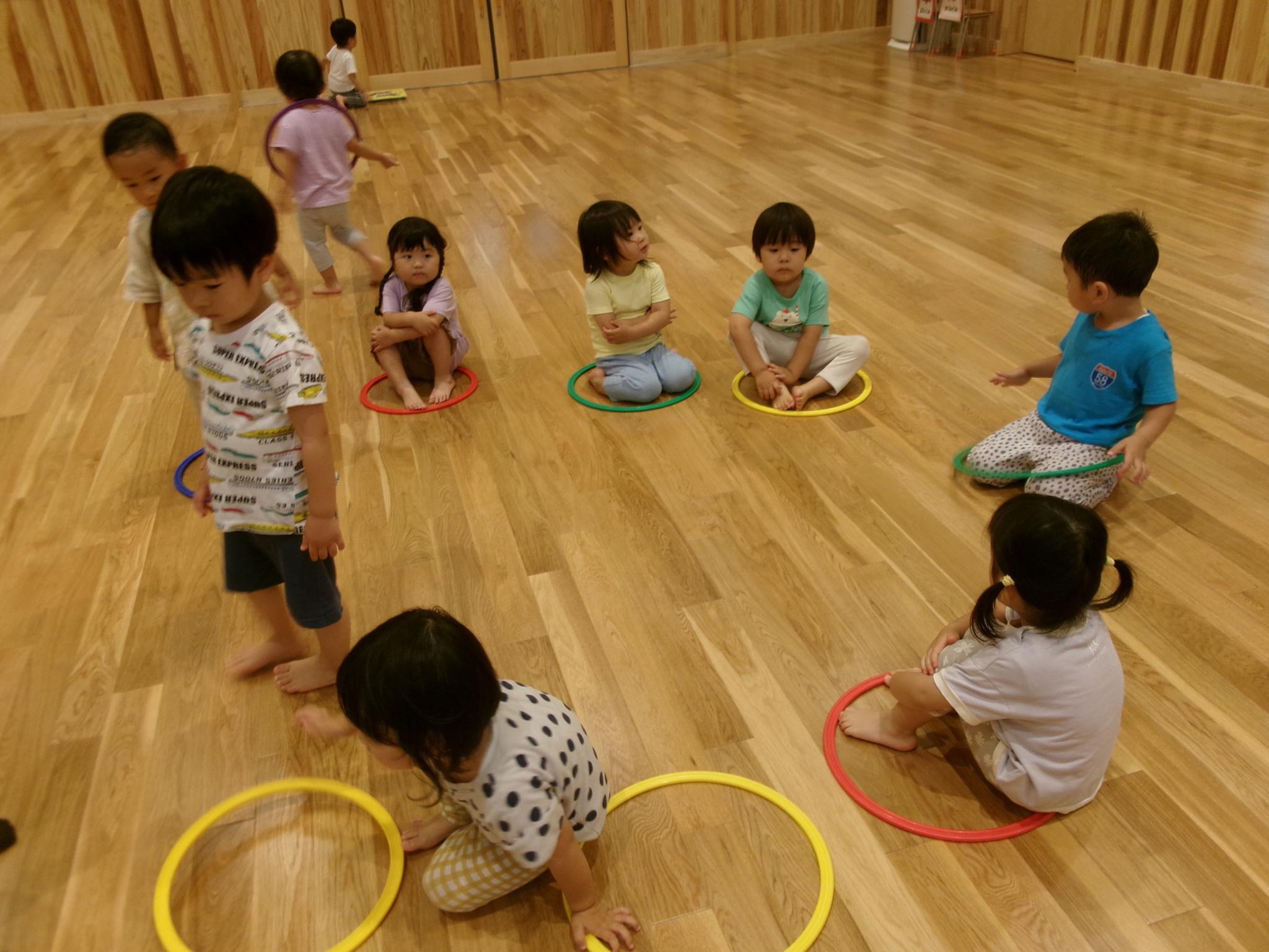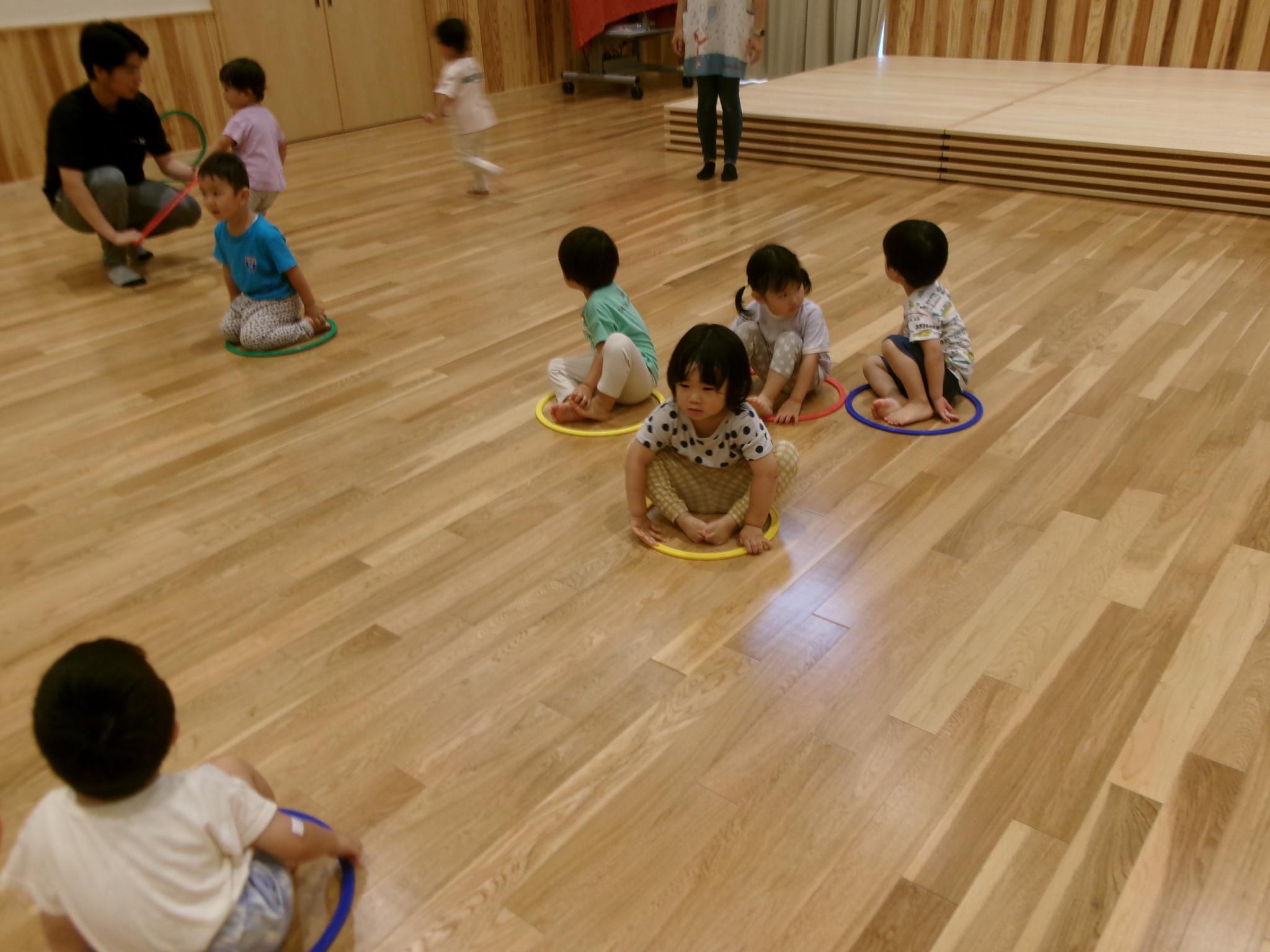 遊戯室で運動遊びをしました。平均台・ジャンプ台・山登り・フープ・ダンボールトンネルでサーキット。少し高い平均台やジャンプ台も保育者と手をつないで挑戦。元気いっぱいの子どもたちでした。