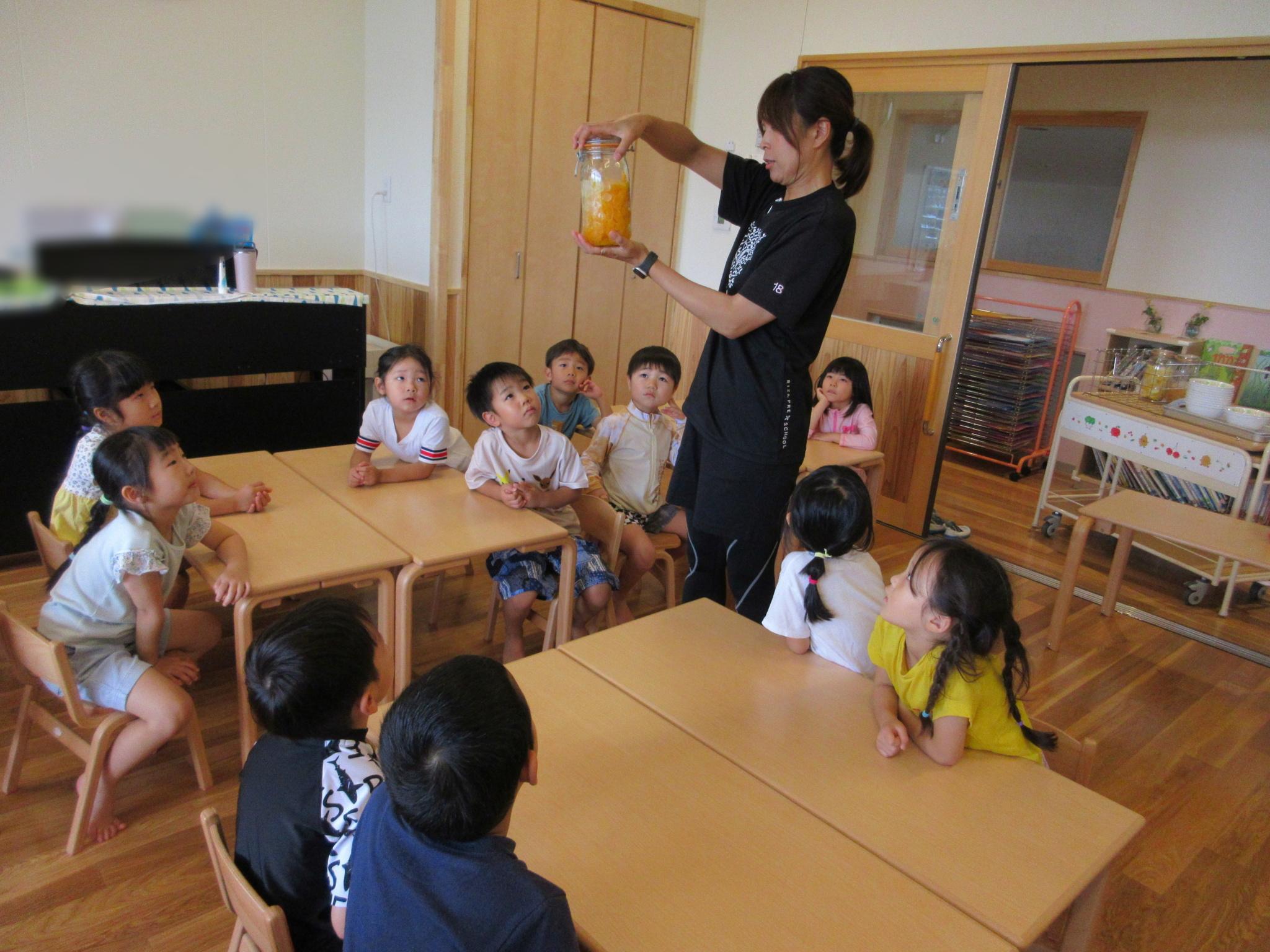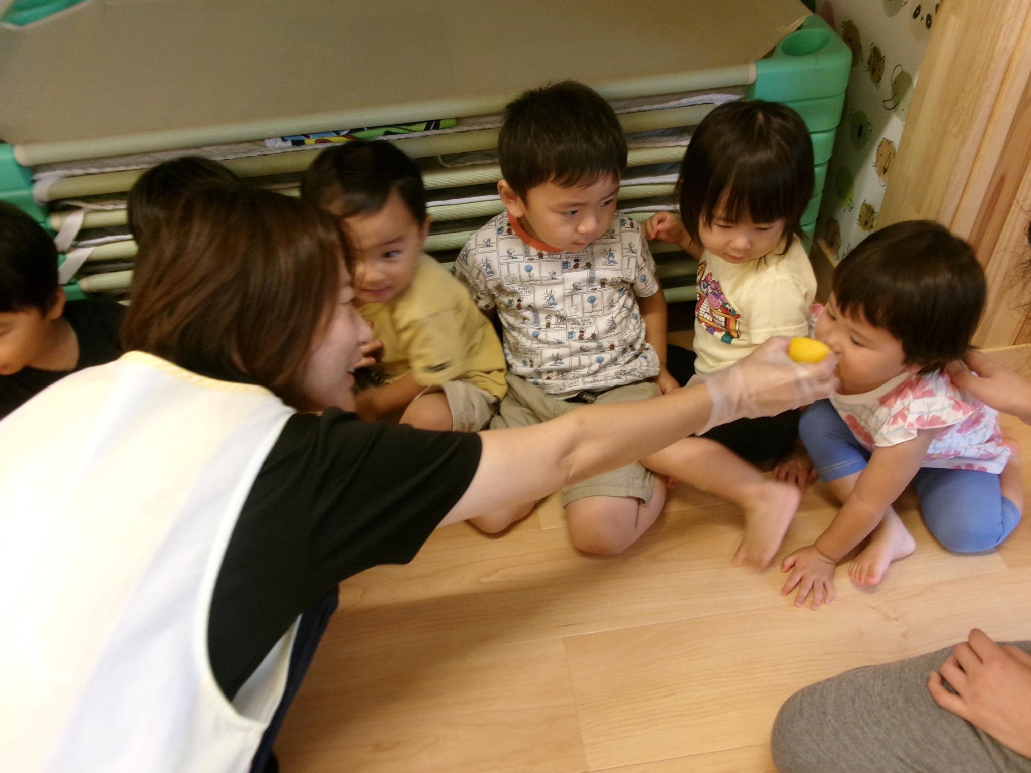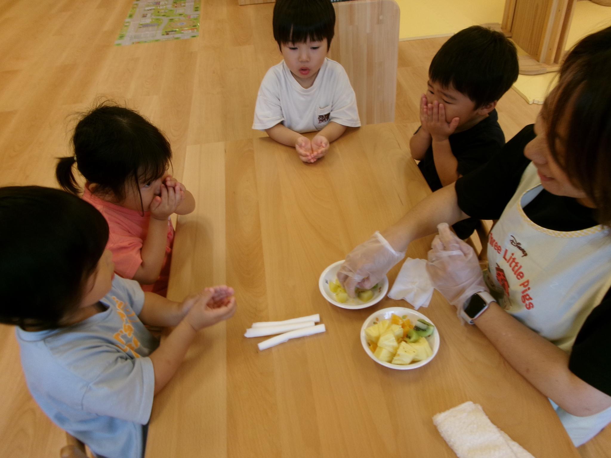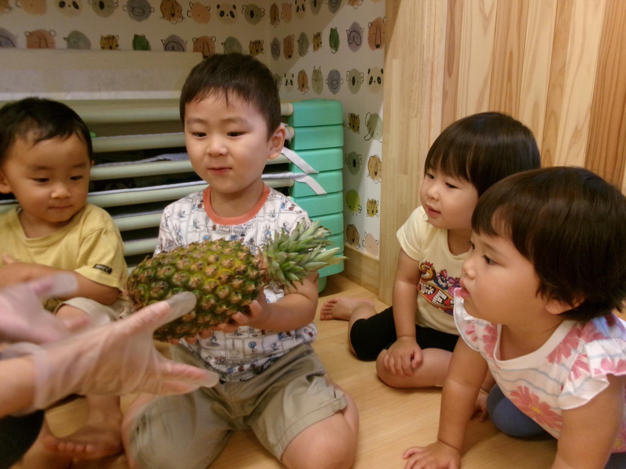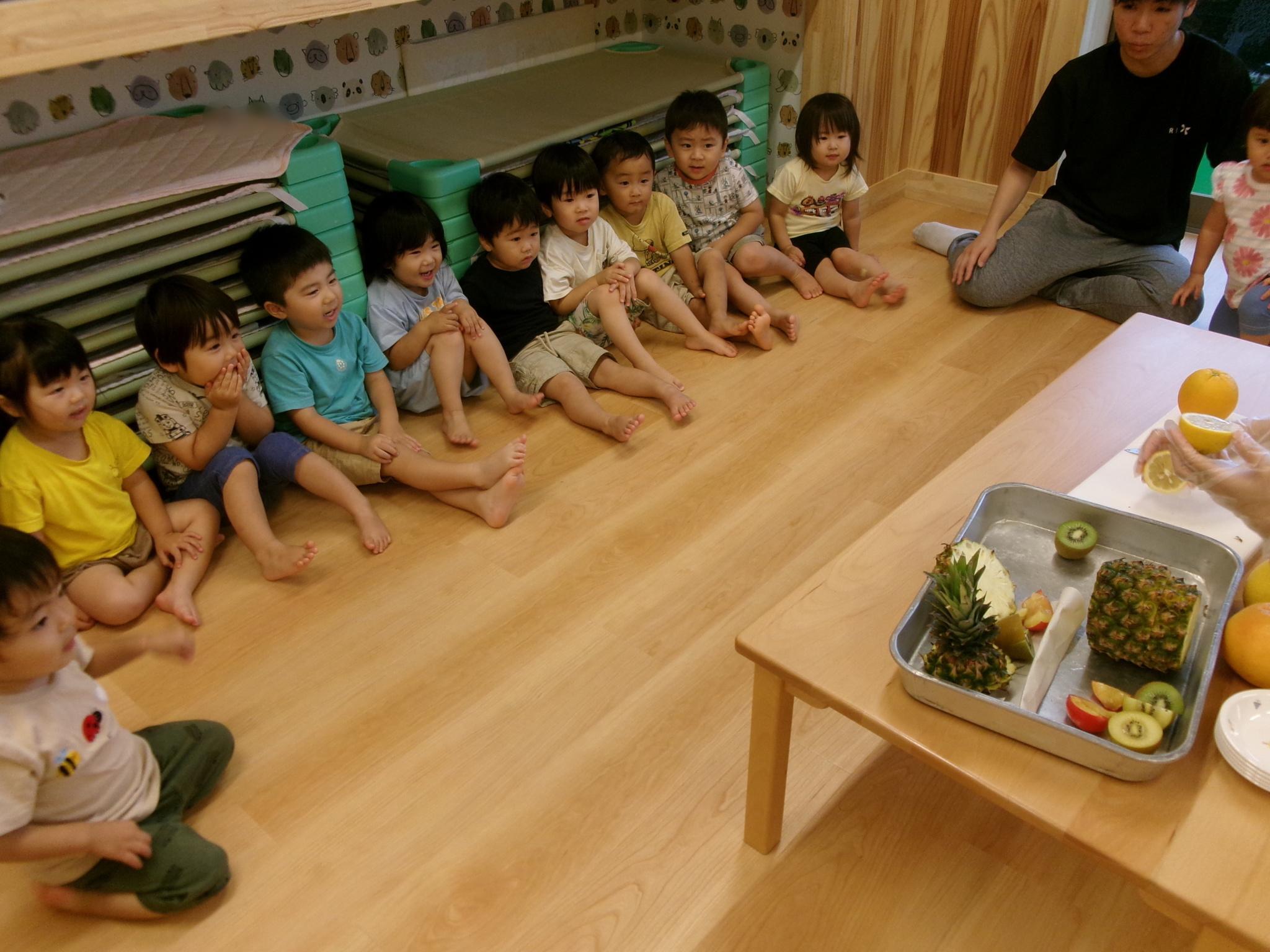 パイナップル・オレンジ・グレープフルーツ・キウイ・すもも・いろいろな果物クイズをしました。中は何色かな?どんな匂いかな?など見たり触ったり、匂いを嗅いだりして楽しみました。その後、一口ずつ食べると、とっても嬉しそうな表情の子どもたち。「甘い。おいしい」と喜んでいました。