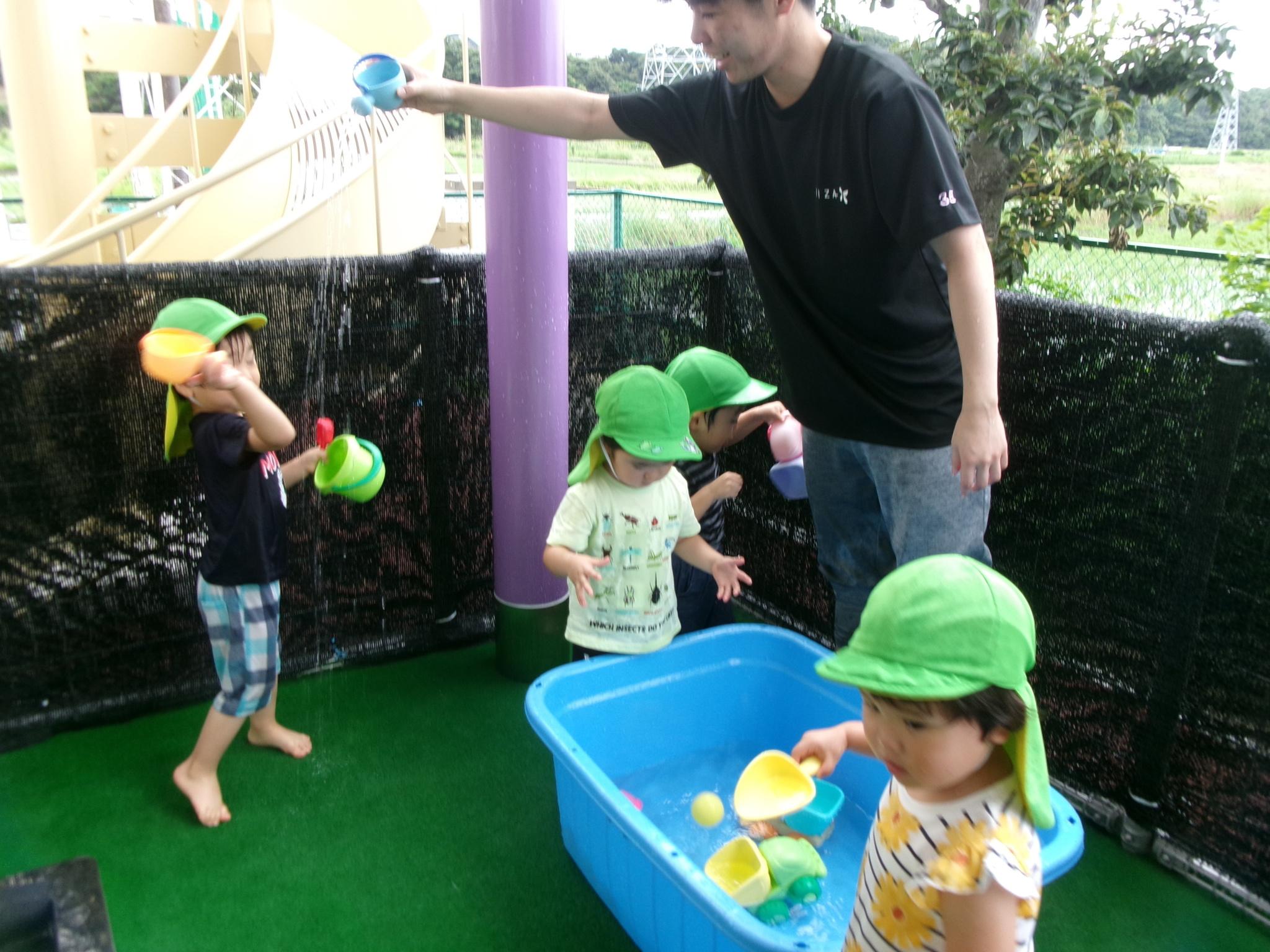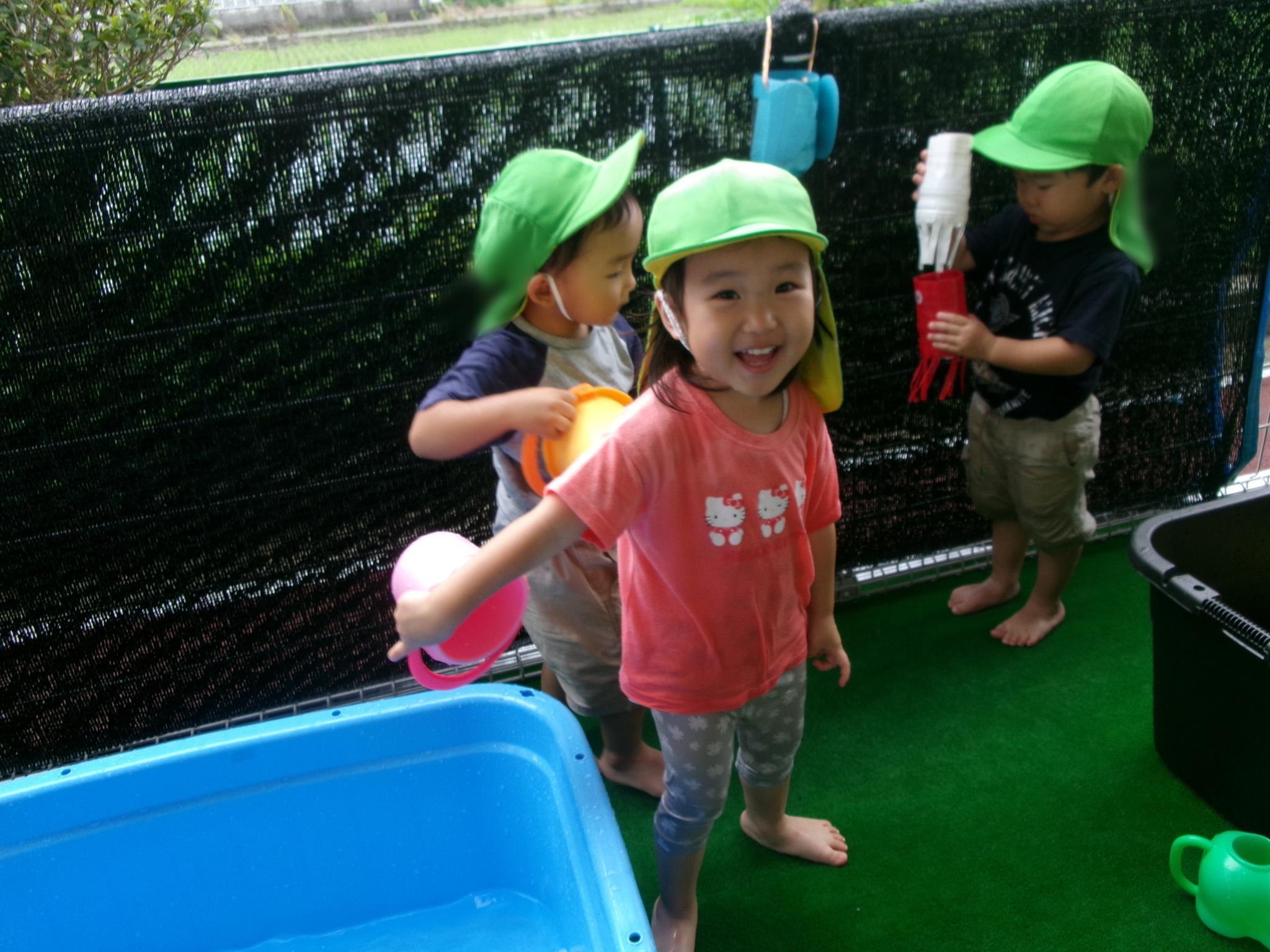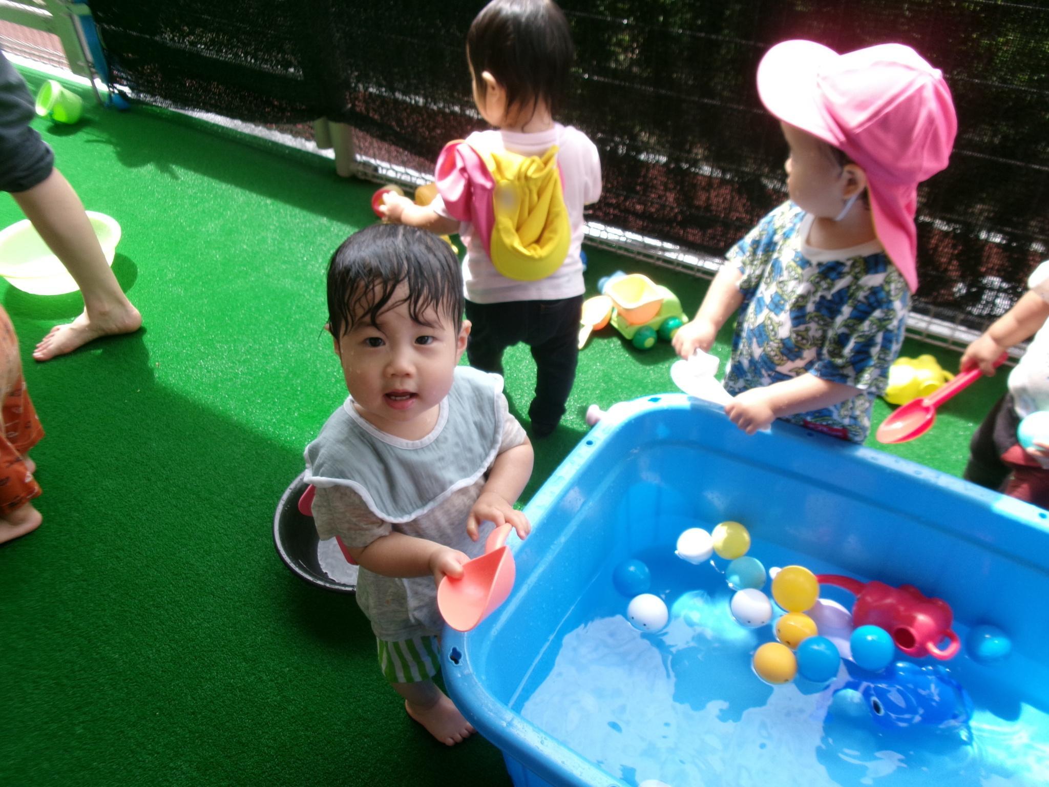 テラスで水遊びをしました。みんな顔にお水がかかってもへっちゃらで夢中になって遊んでいました!とっても気持ちよさそうでした。
