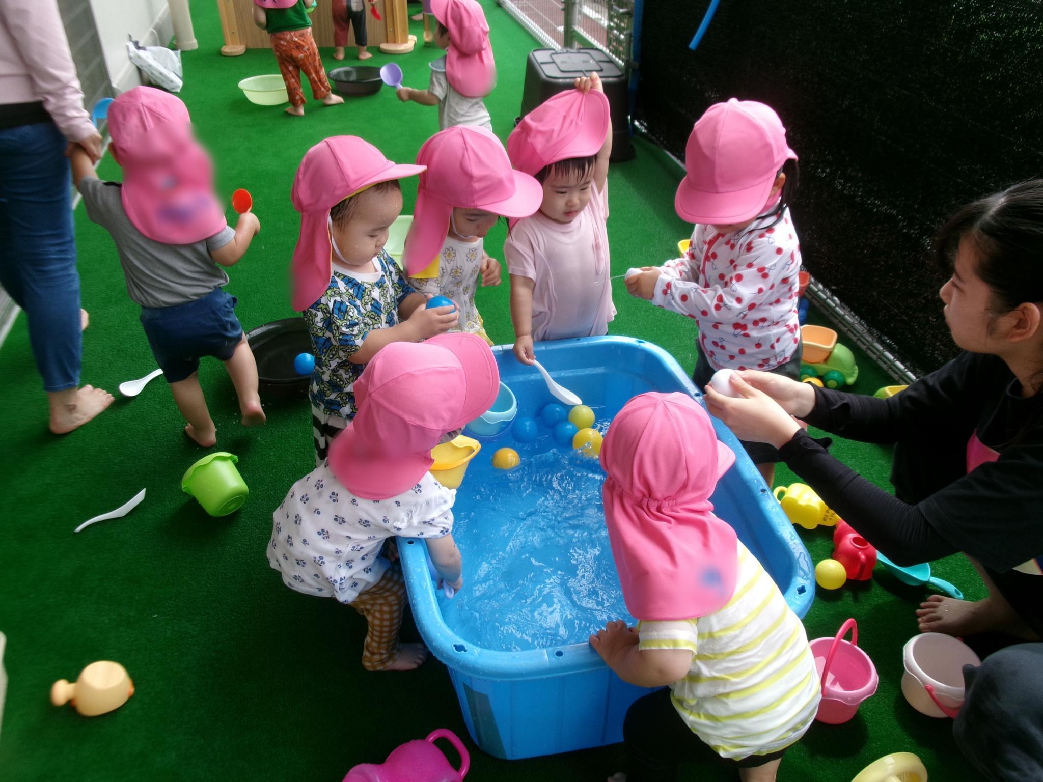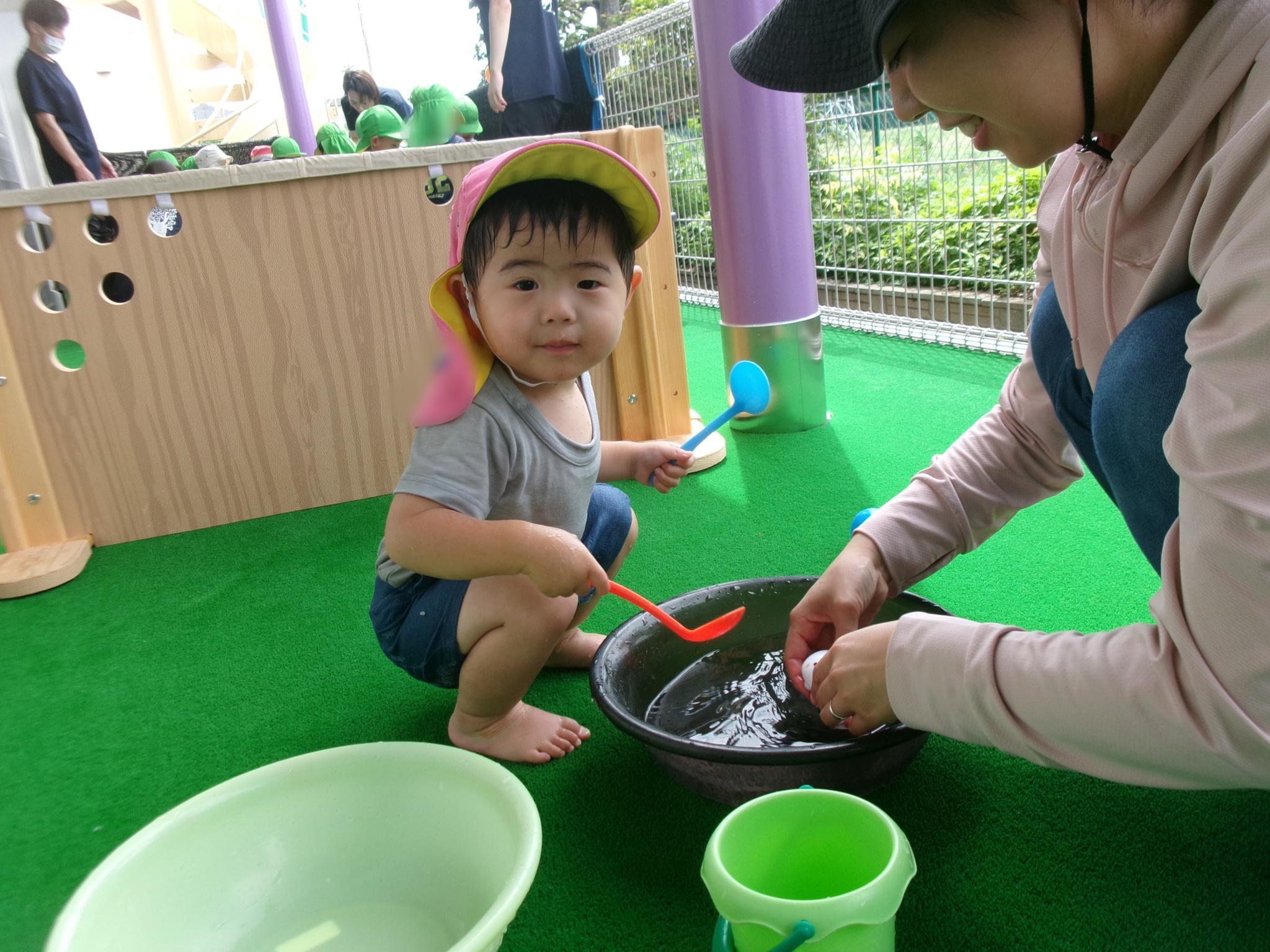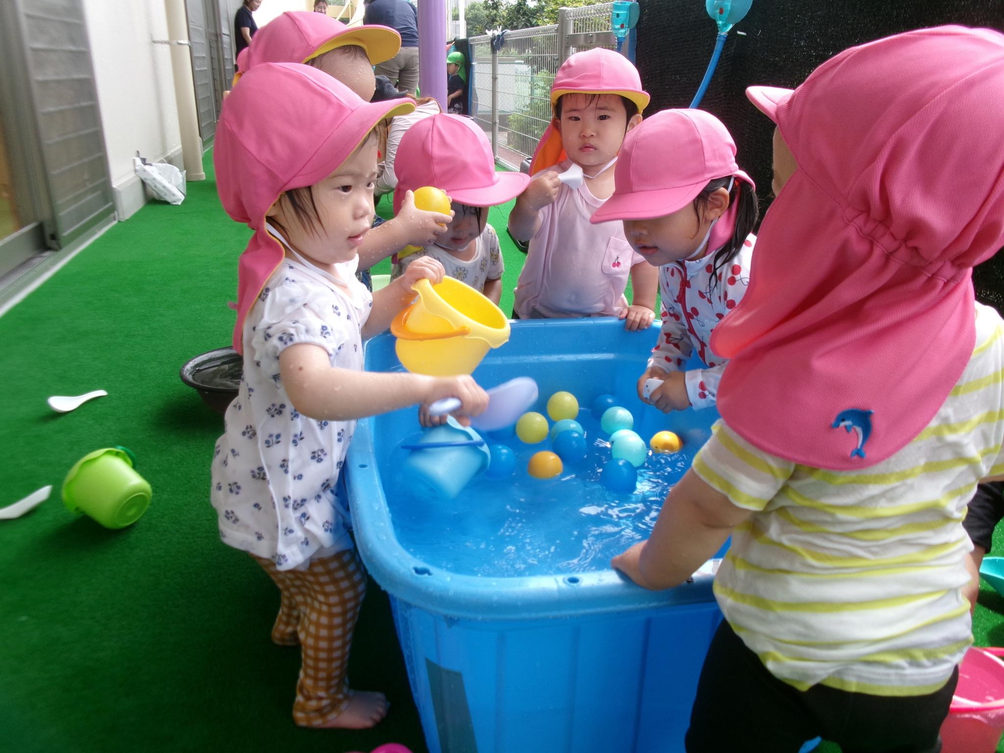 テラスで水遊びをしました。みんな顔にお水がかかってもへっちゃらで夢中になって遊んでいました!とっても気持ちよさそうでした。