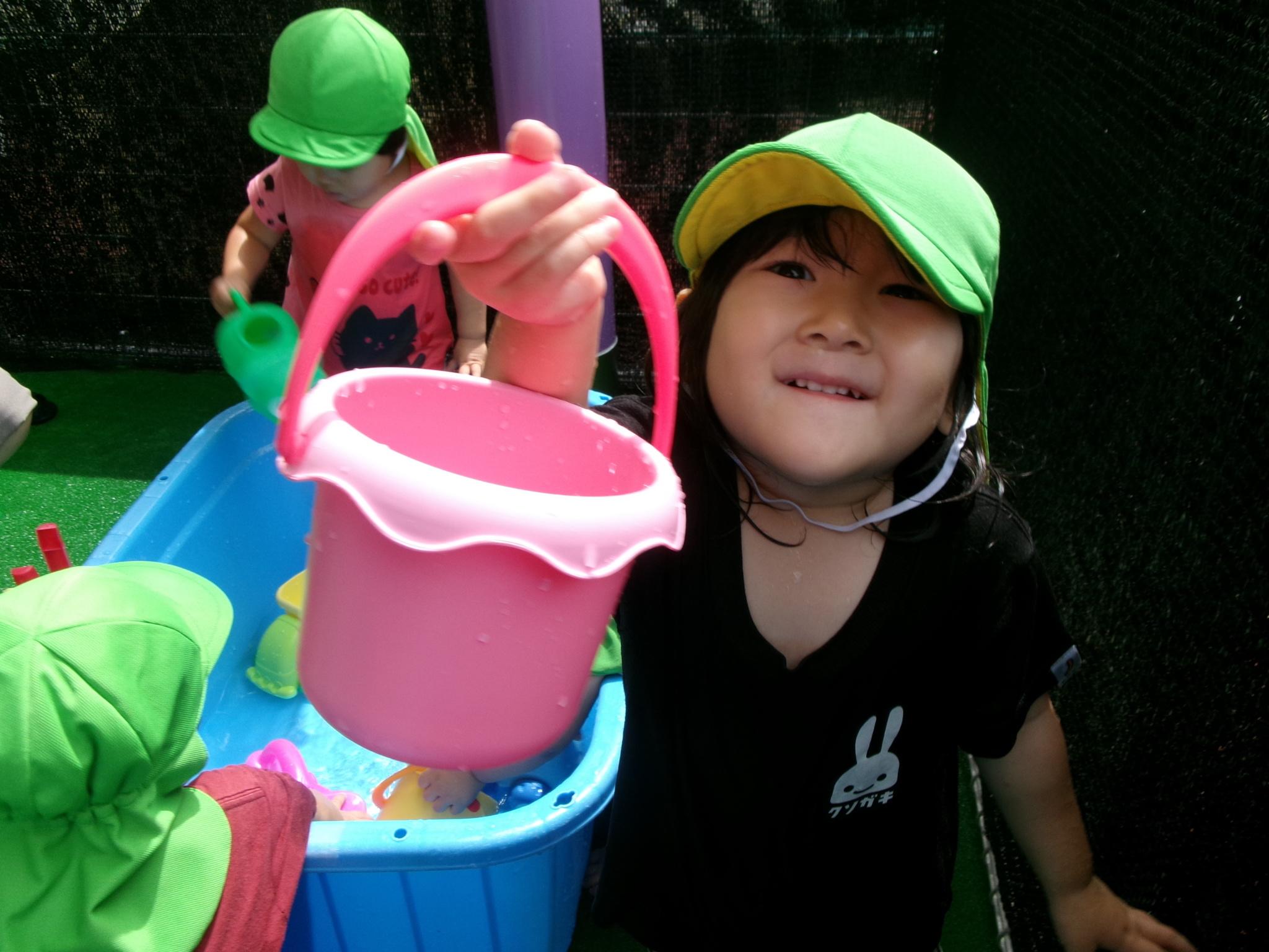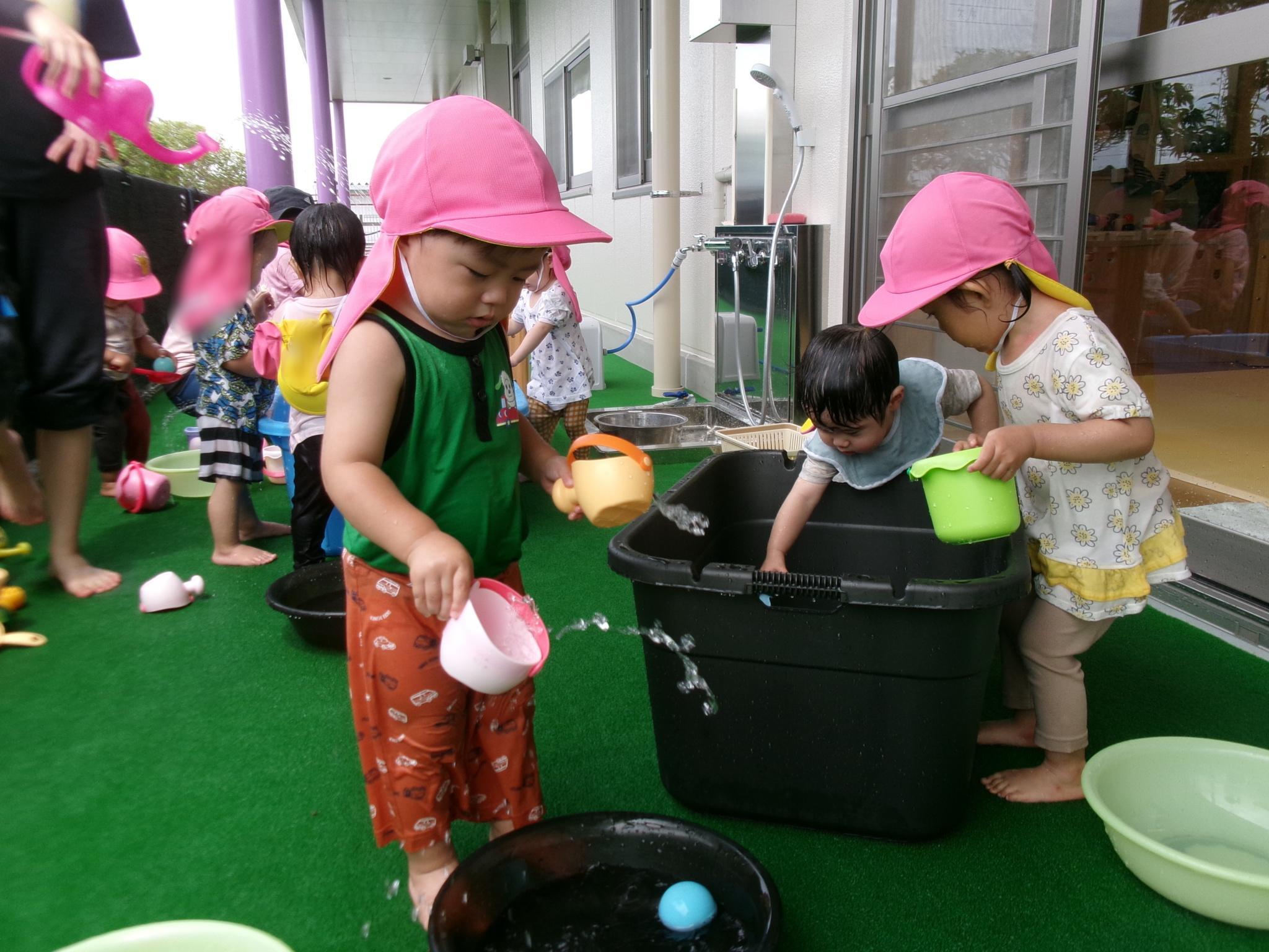 7月に入って水遊びが始まりました。テラスに出ると好きな玩具を手に取り、いっぱい水を汲んだり、トラックの荷台に水を入れ運んだりして遊びました。友だちや保育者と水をかけ合って全身びしょびしょになりながら楽しんでいます♪