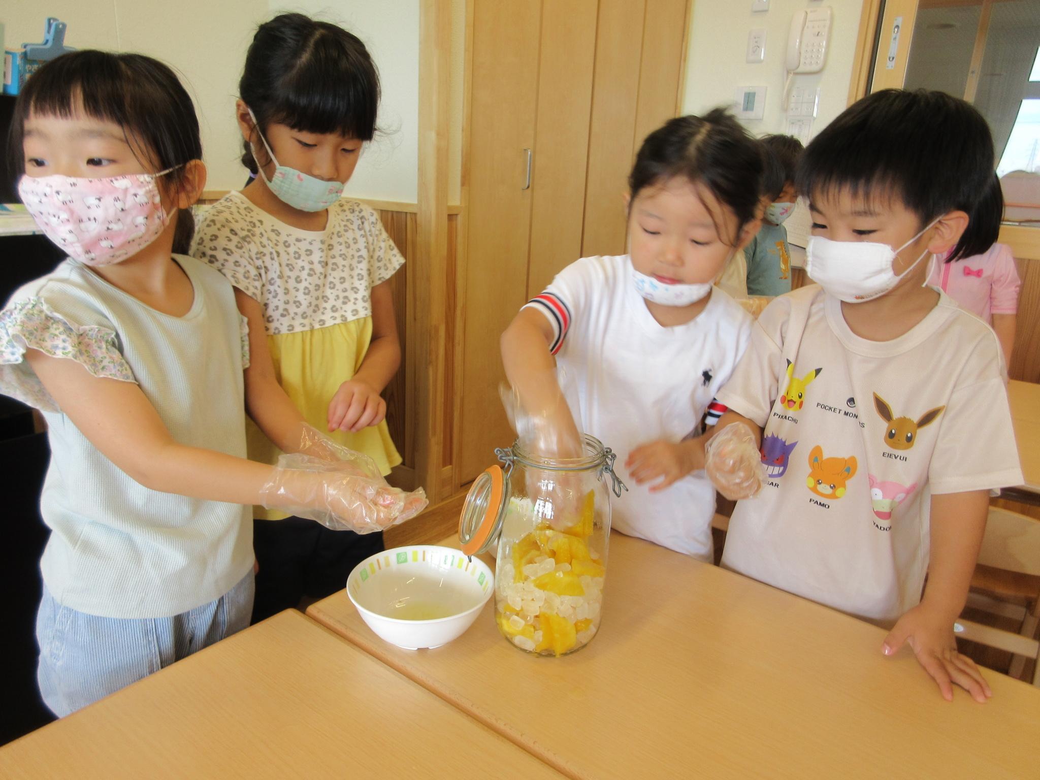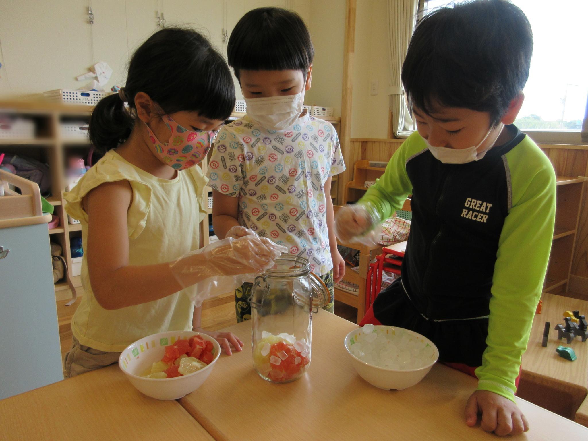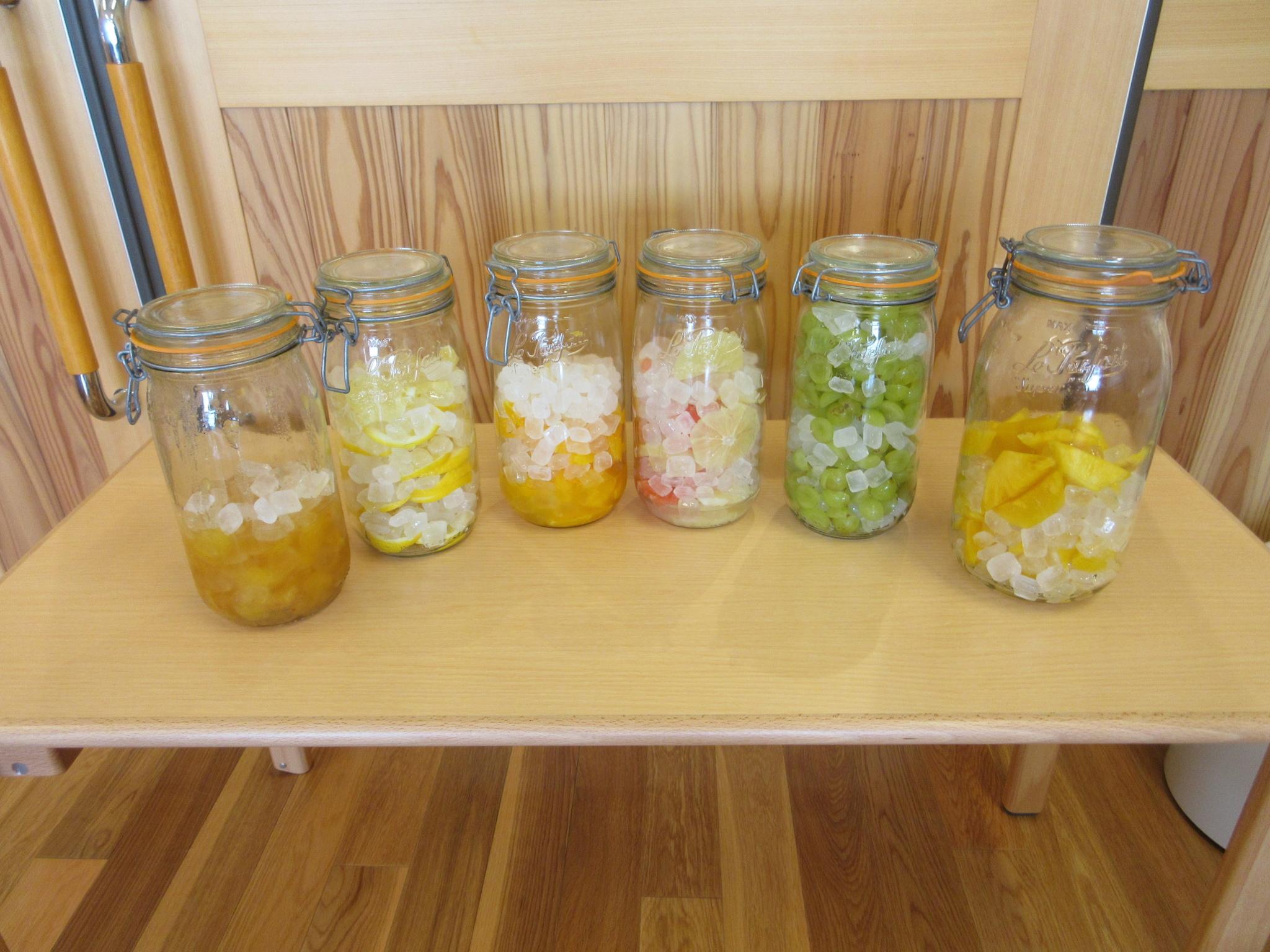 『オレンジ』『すもも』『グレープフルーツ』『レモン』『マスカット』『パイナップル』の6つを使ってジュースの仕込みをしました。フルーツと氷砂糖を交互に入れ、宝石みたいなきれいなジュースの素が出来上がりました。これからばら組で準備していきたいと思います♪