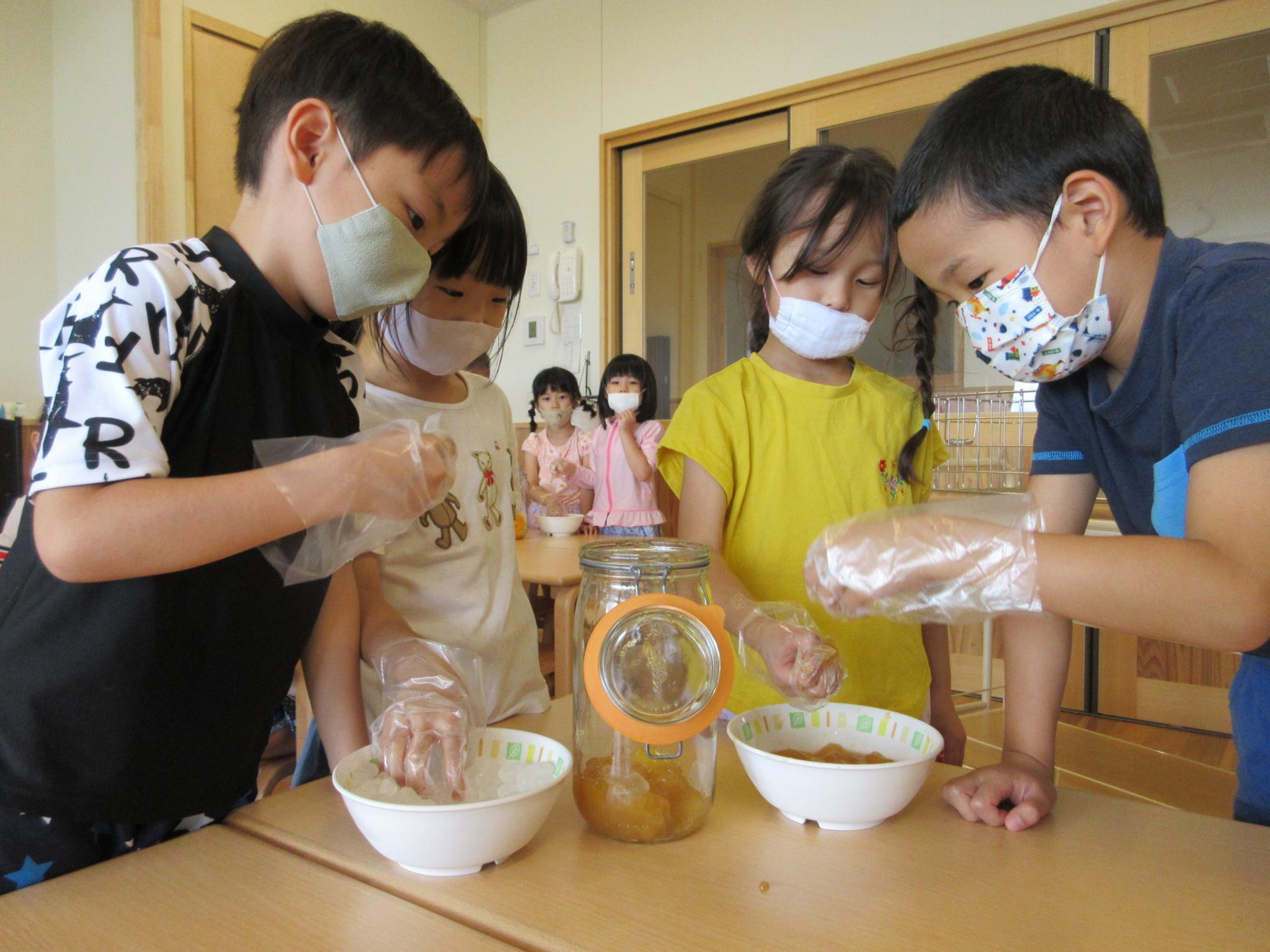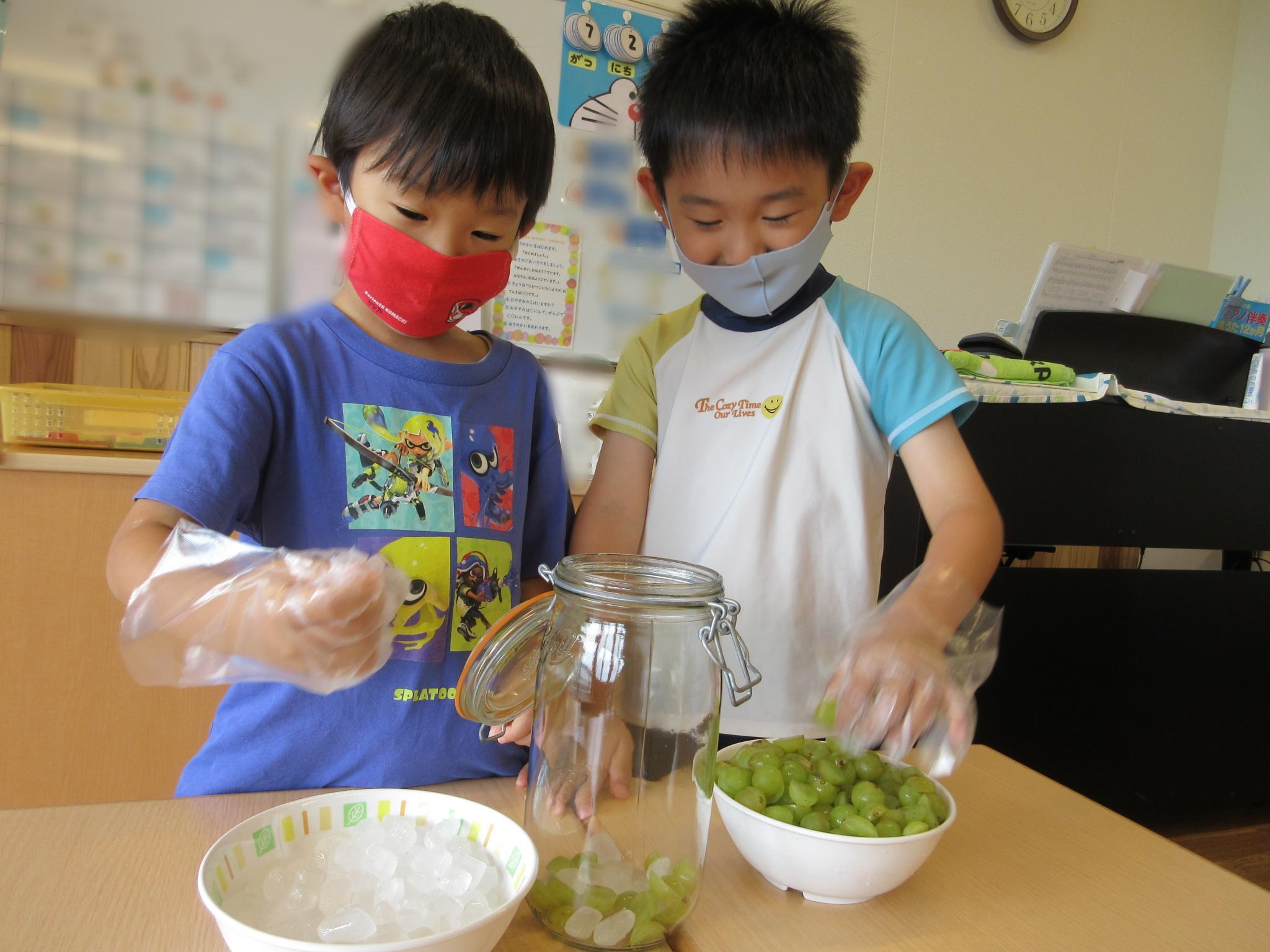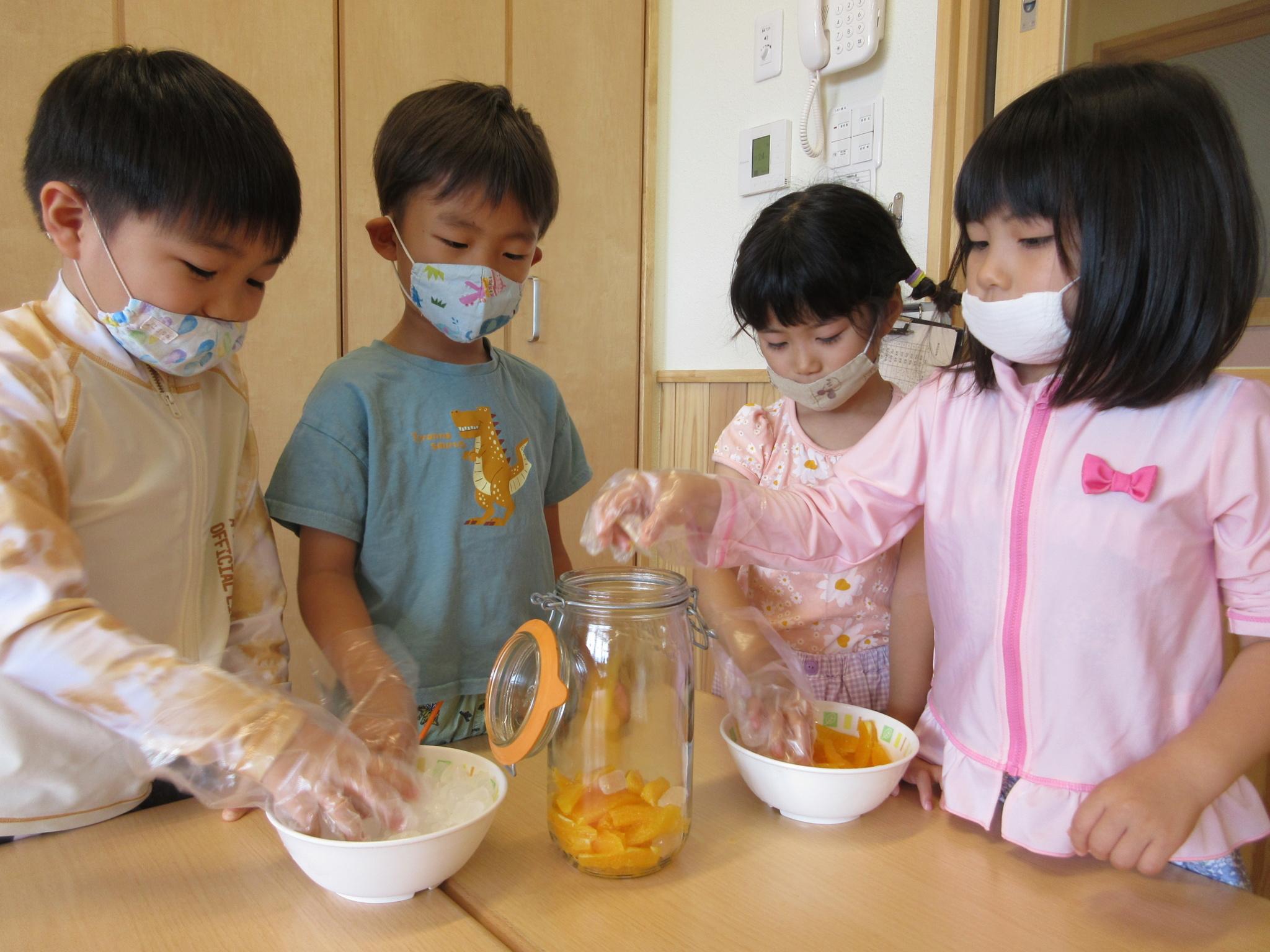 『オレンジ』『すもも』『グレープフルーツ』『レモン』『マスカット』『パイナップル』の6つを使ってジュースの仕込みをしました。フルーツと氷砂糖を交互に入れ、宝石みたいなきれいなジュースの素が出来上がりました。これからばら組で準備していきたいと思います♪